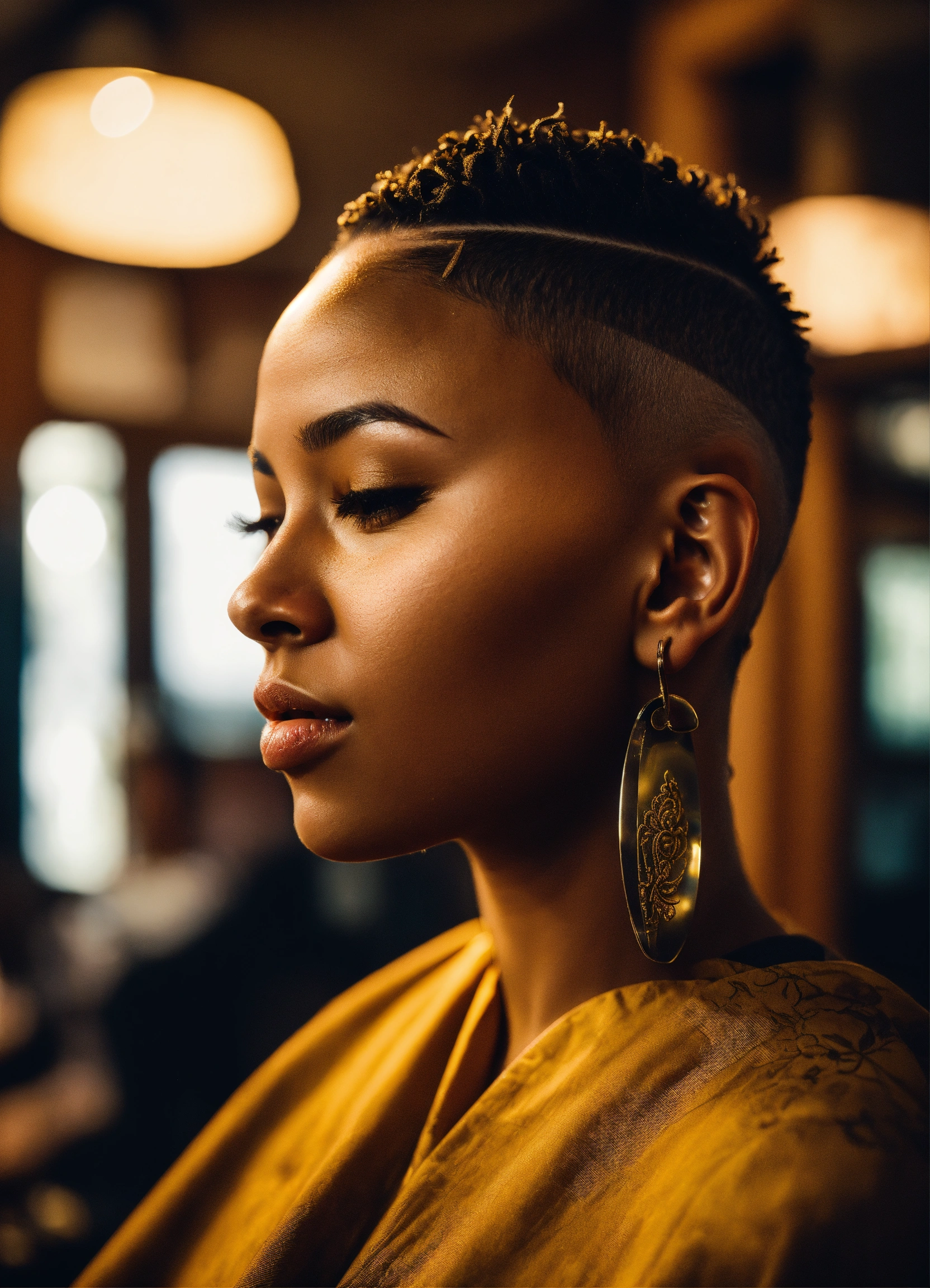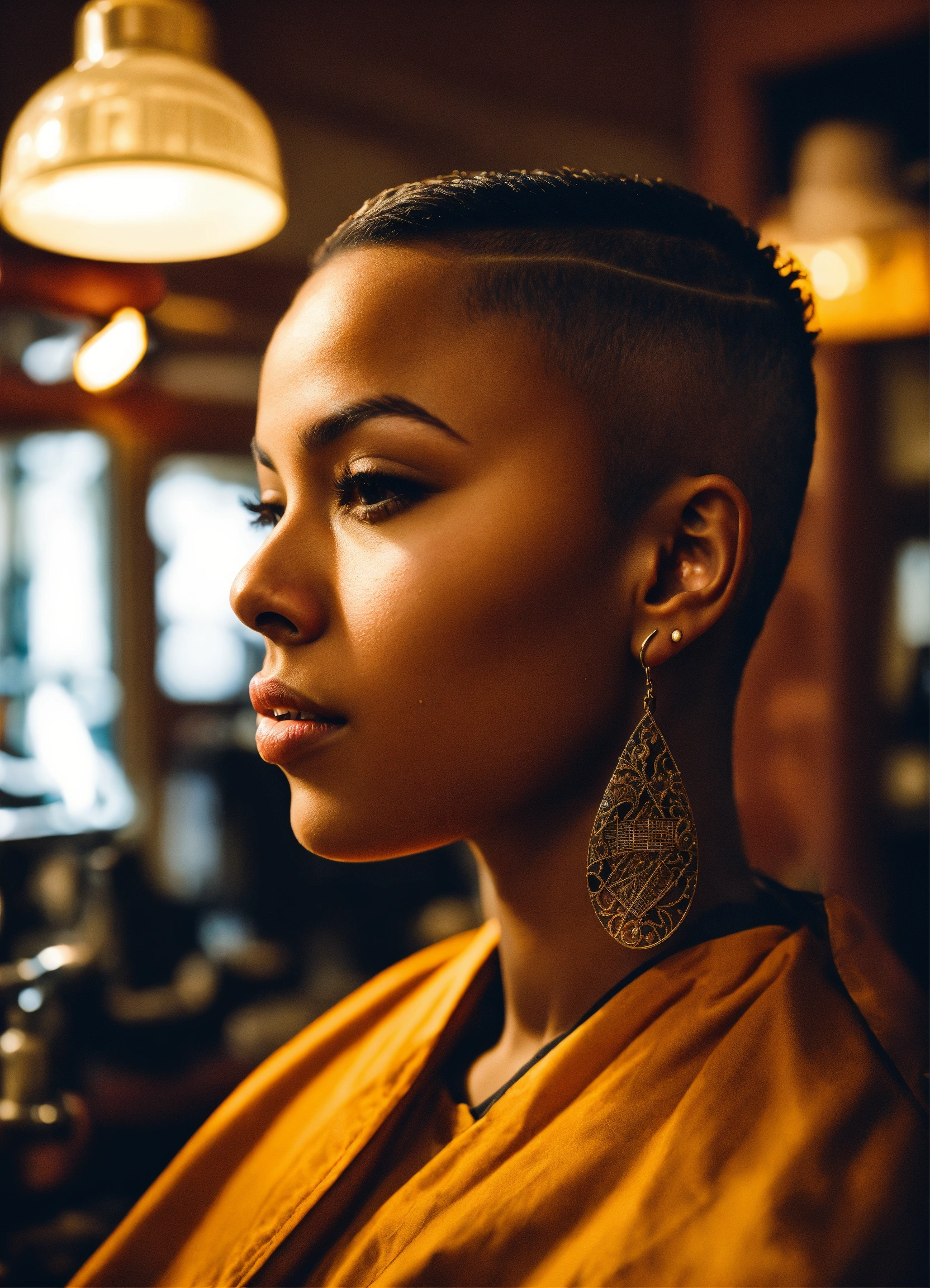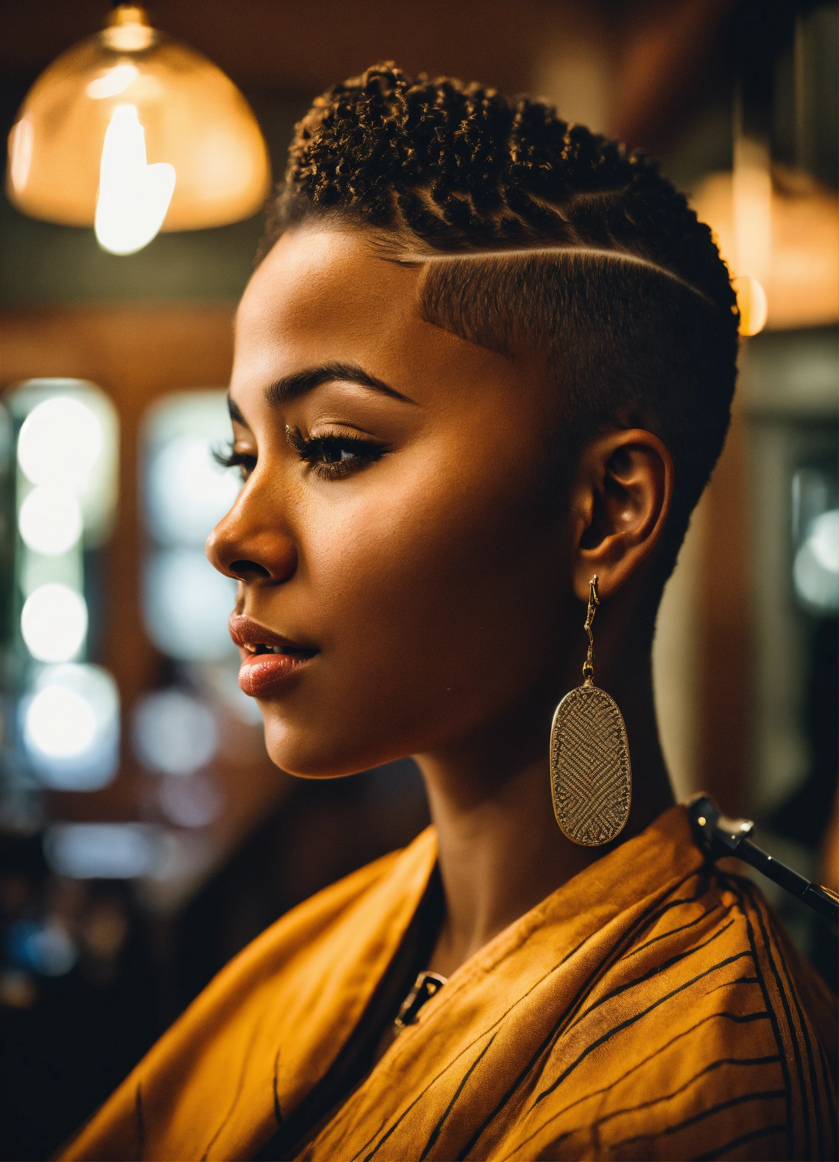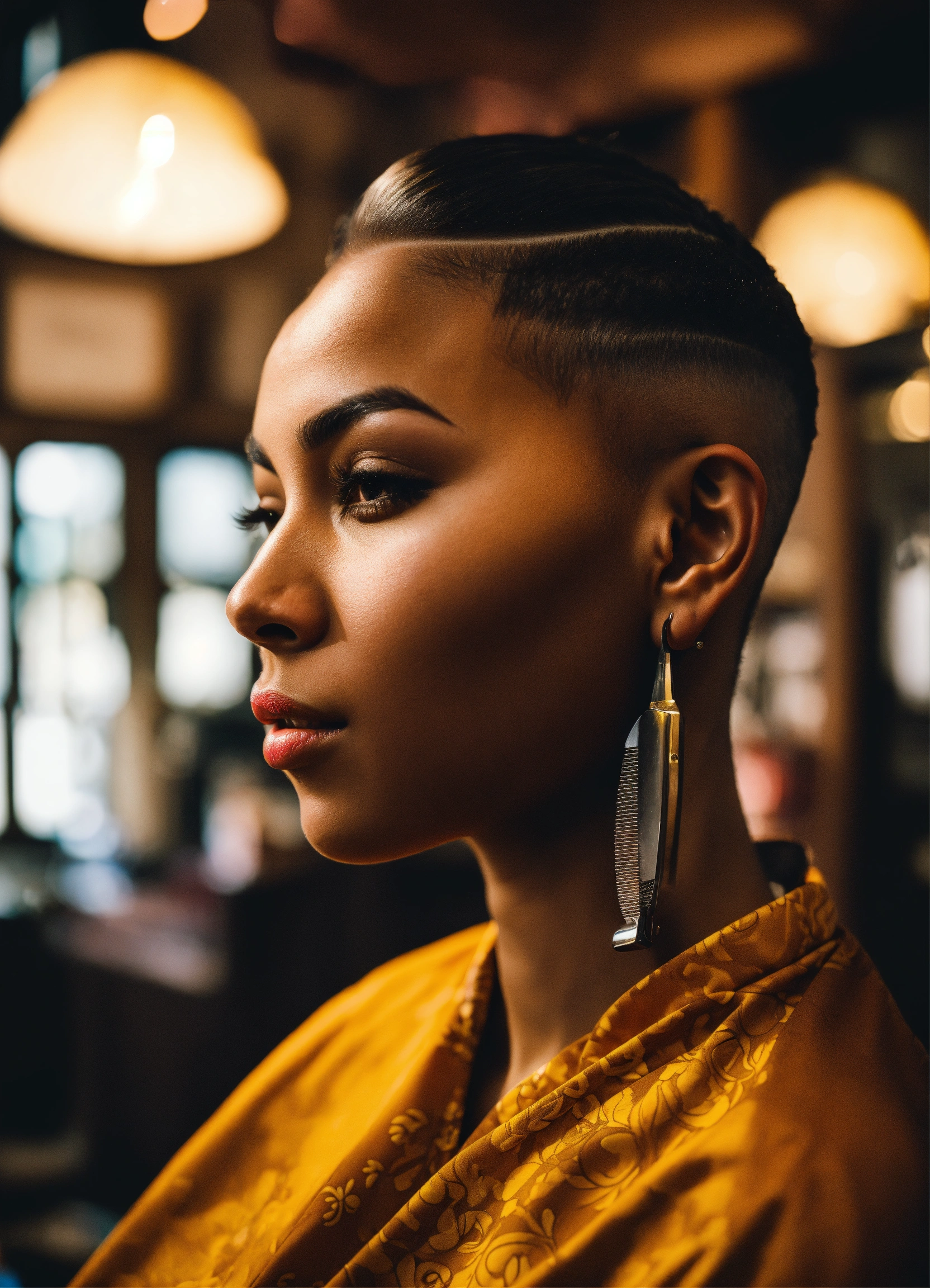 /imagine prompt a skilled brown-skinned professional female barber working in an urban barbershop, surrounded by other barbers, is cutting skin fades and creating fantasy haircuts. bright sunlight streams through large windows, capturing the barber's essence, creativity and expression of passion for his skill. intricate clipper work, attention to detail, photography, dslr with a 66mm prime lens, f/2.8 aperture, --ar 45 --v 5
