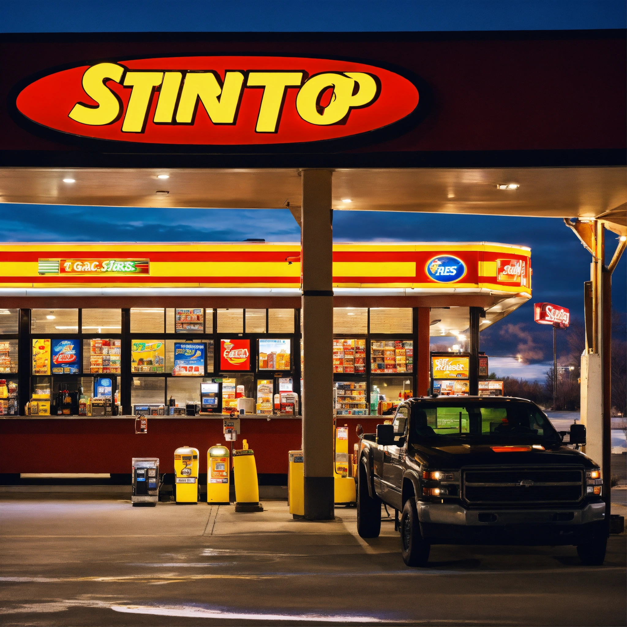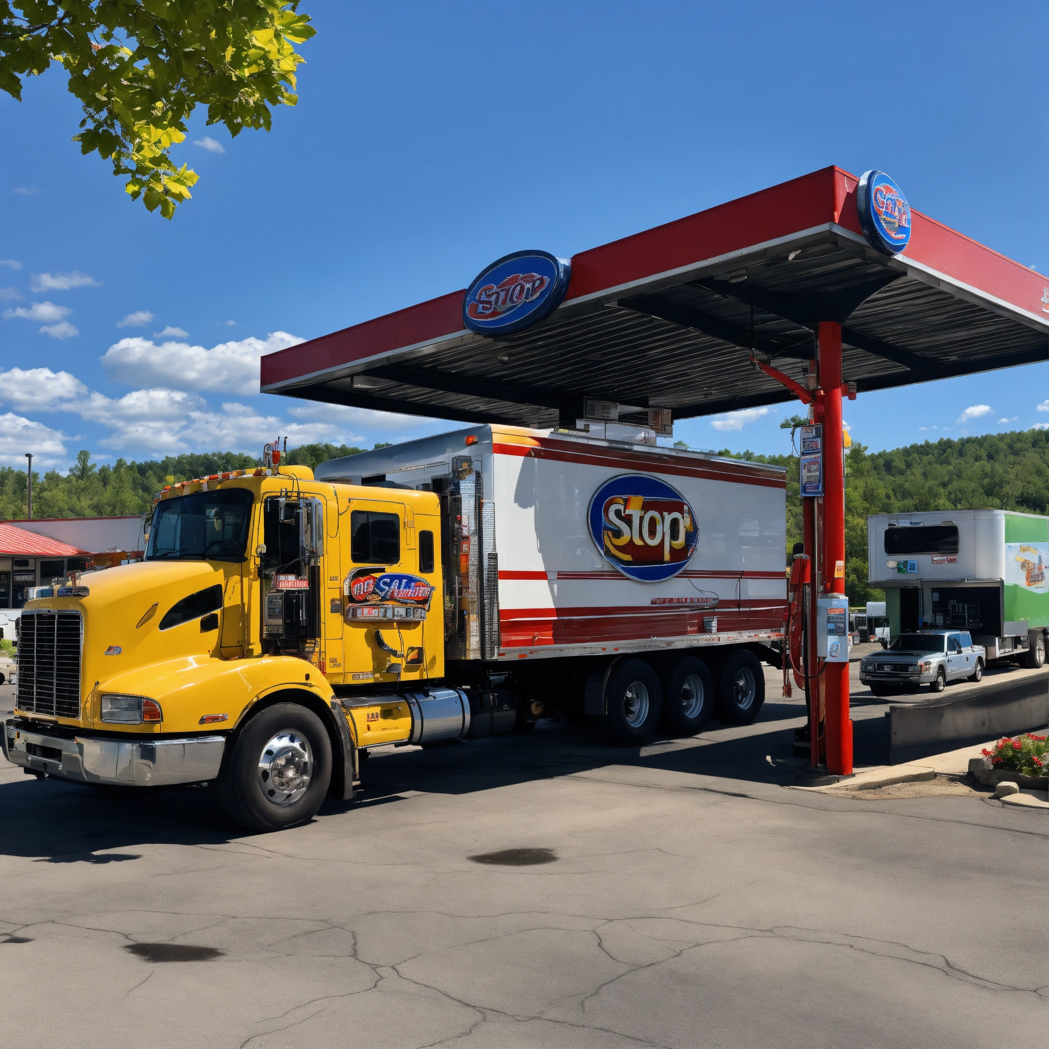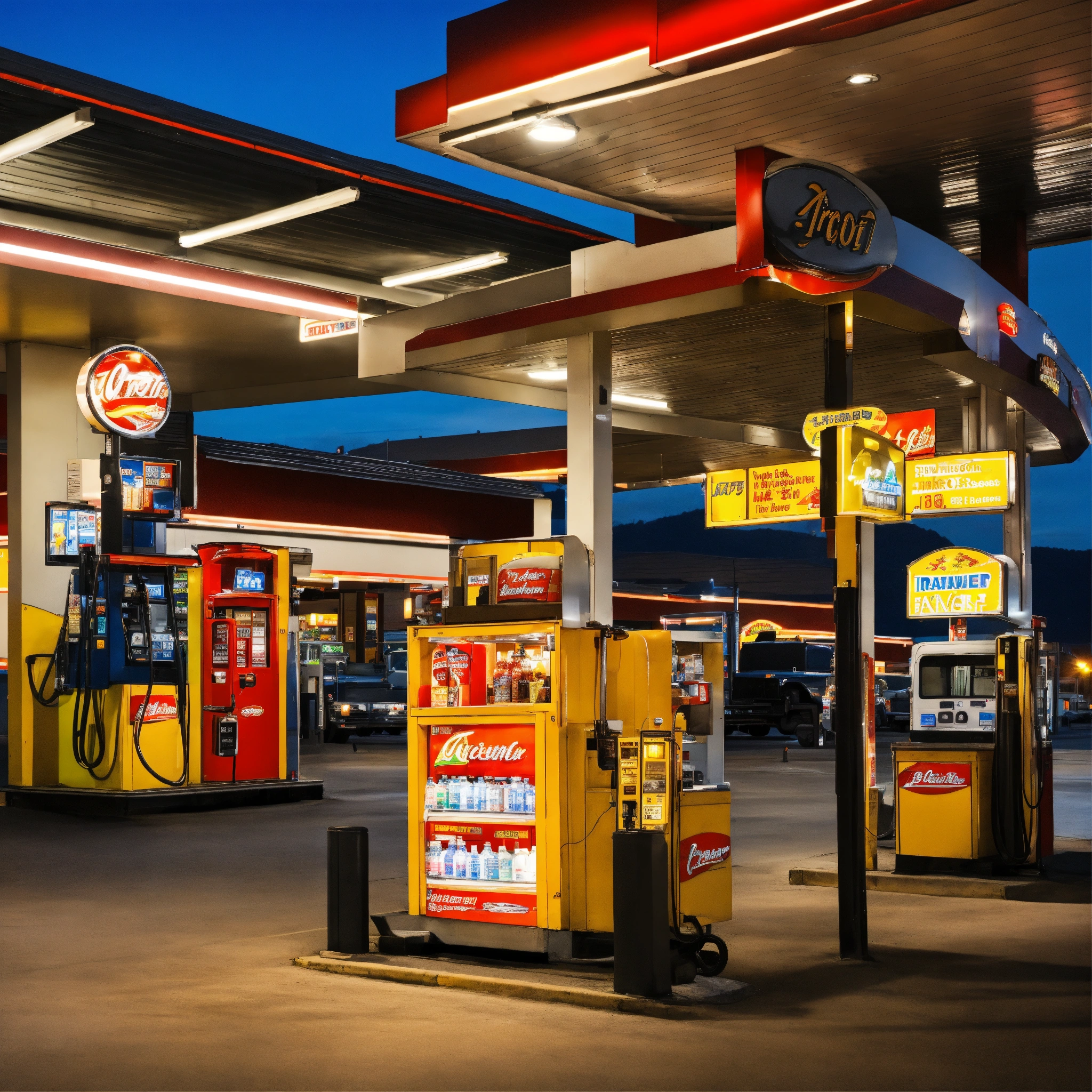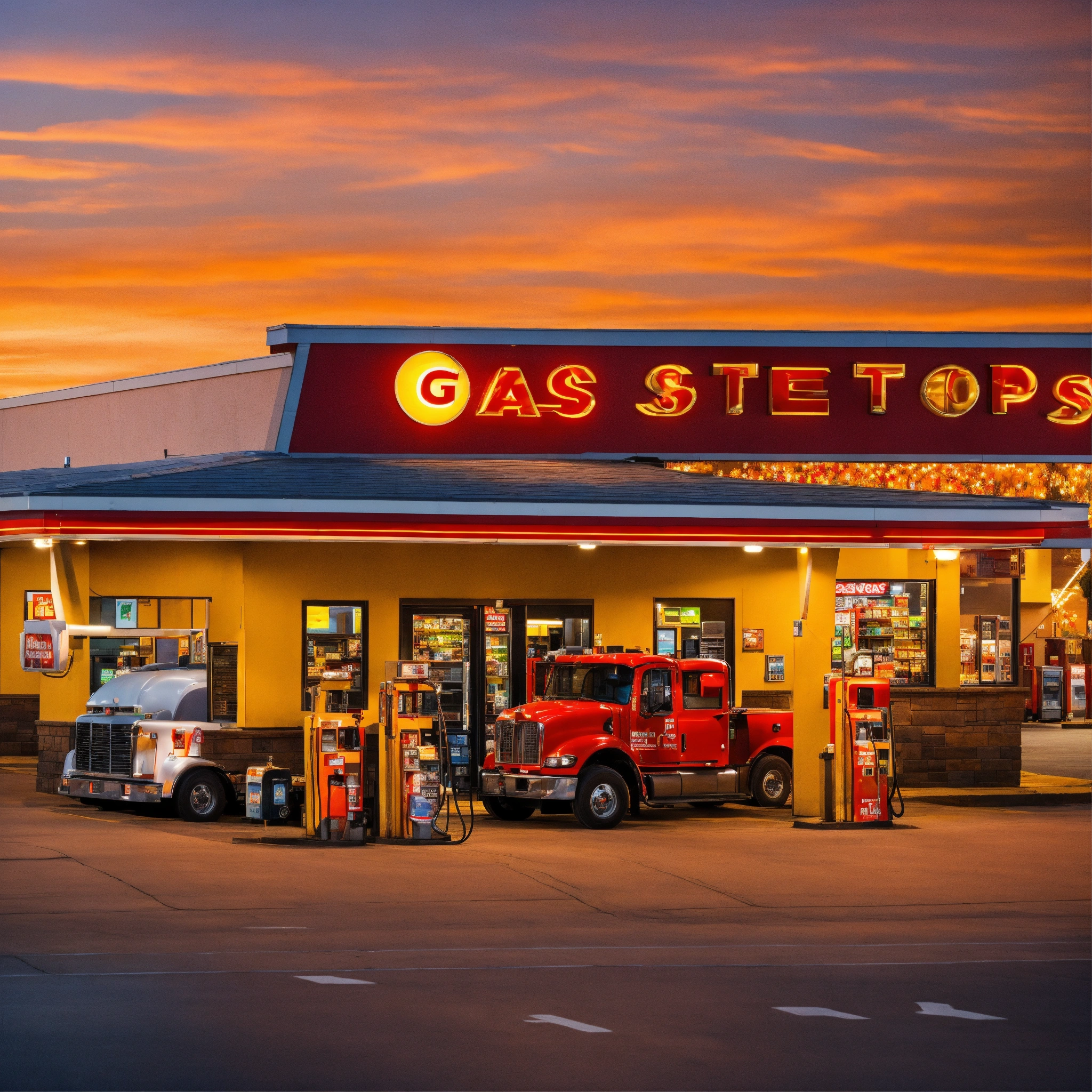 A photo of a truck stop with a variety of services. the truck stop has a gas station, a restaurant, and a convenience store.