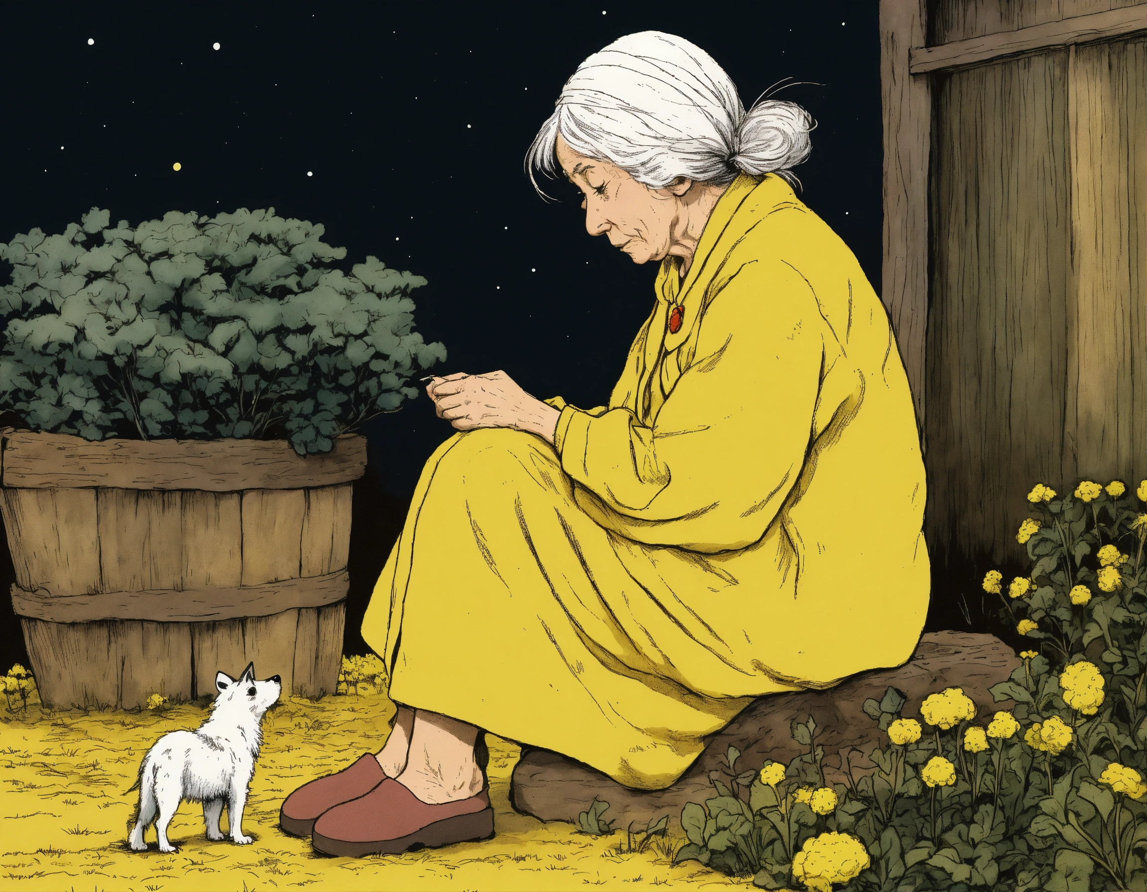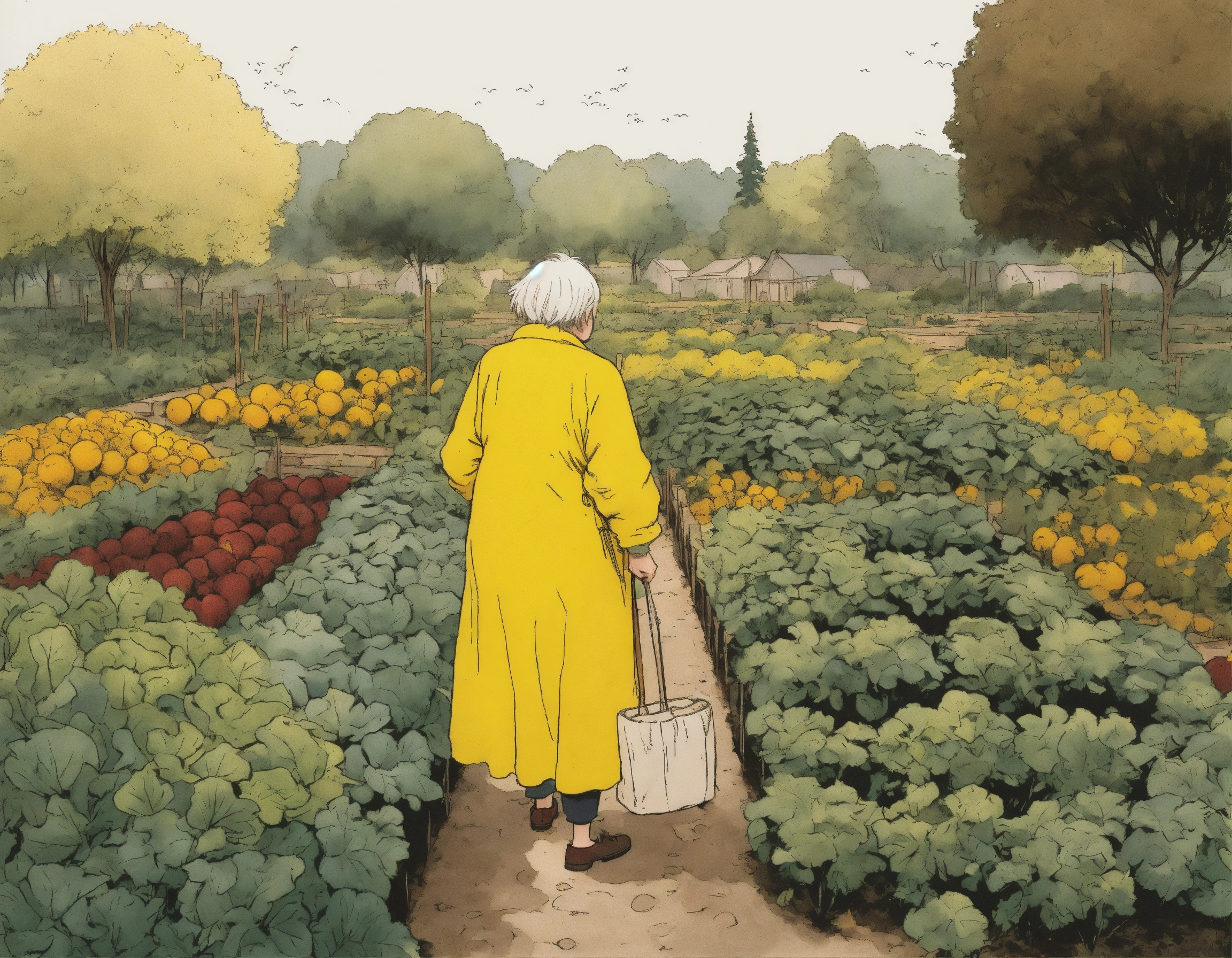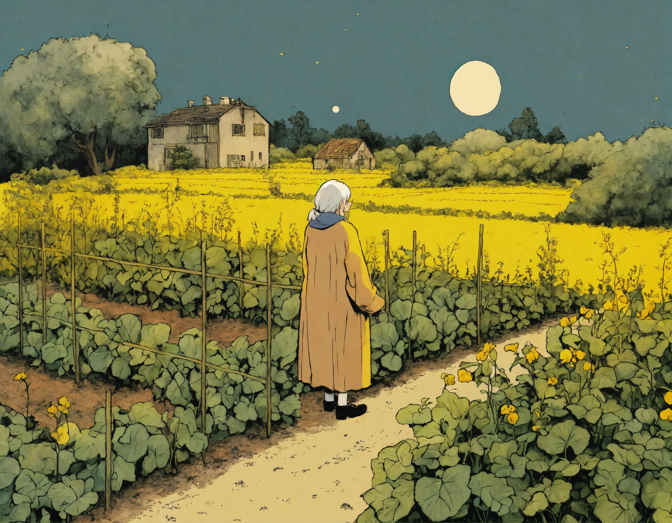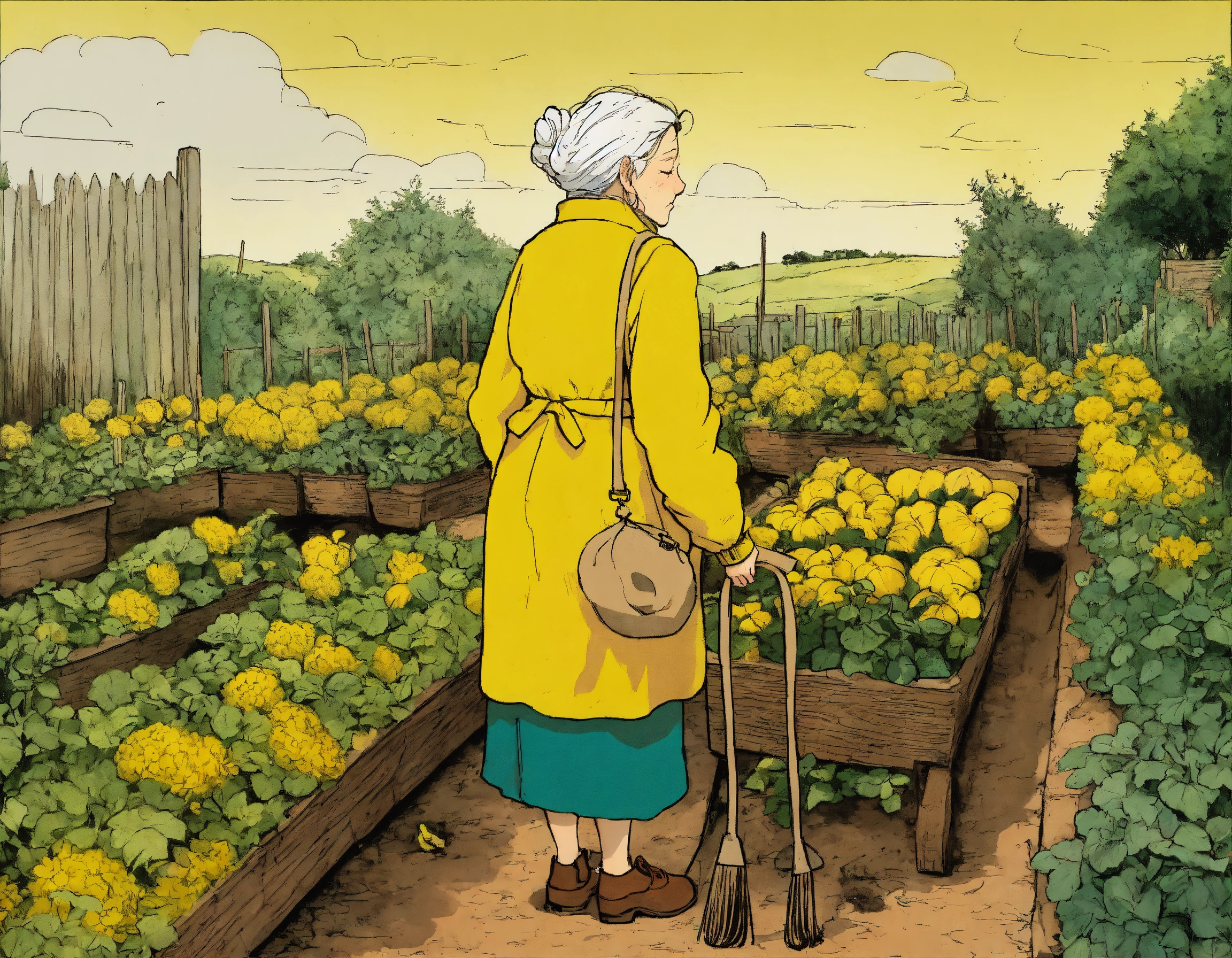 Illustration of a lonely old woman. gloomy, magic, by hergé, ink and pen, dark yellow scheme color, past colors, masterpiece. whole body. vegetable garden. studio ghibli.