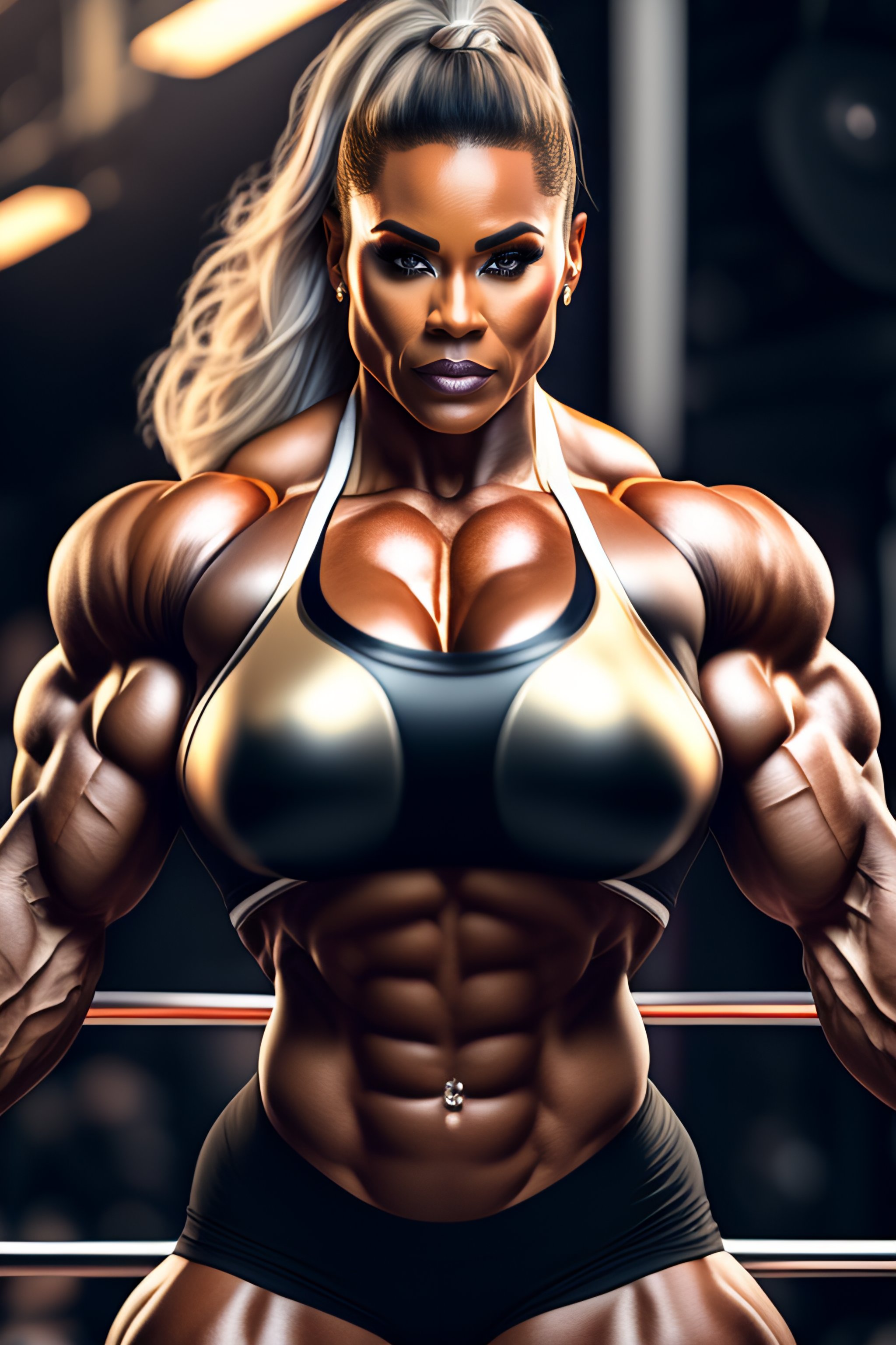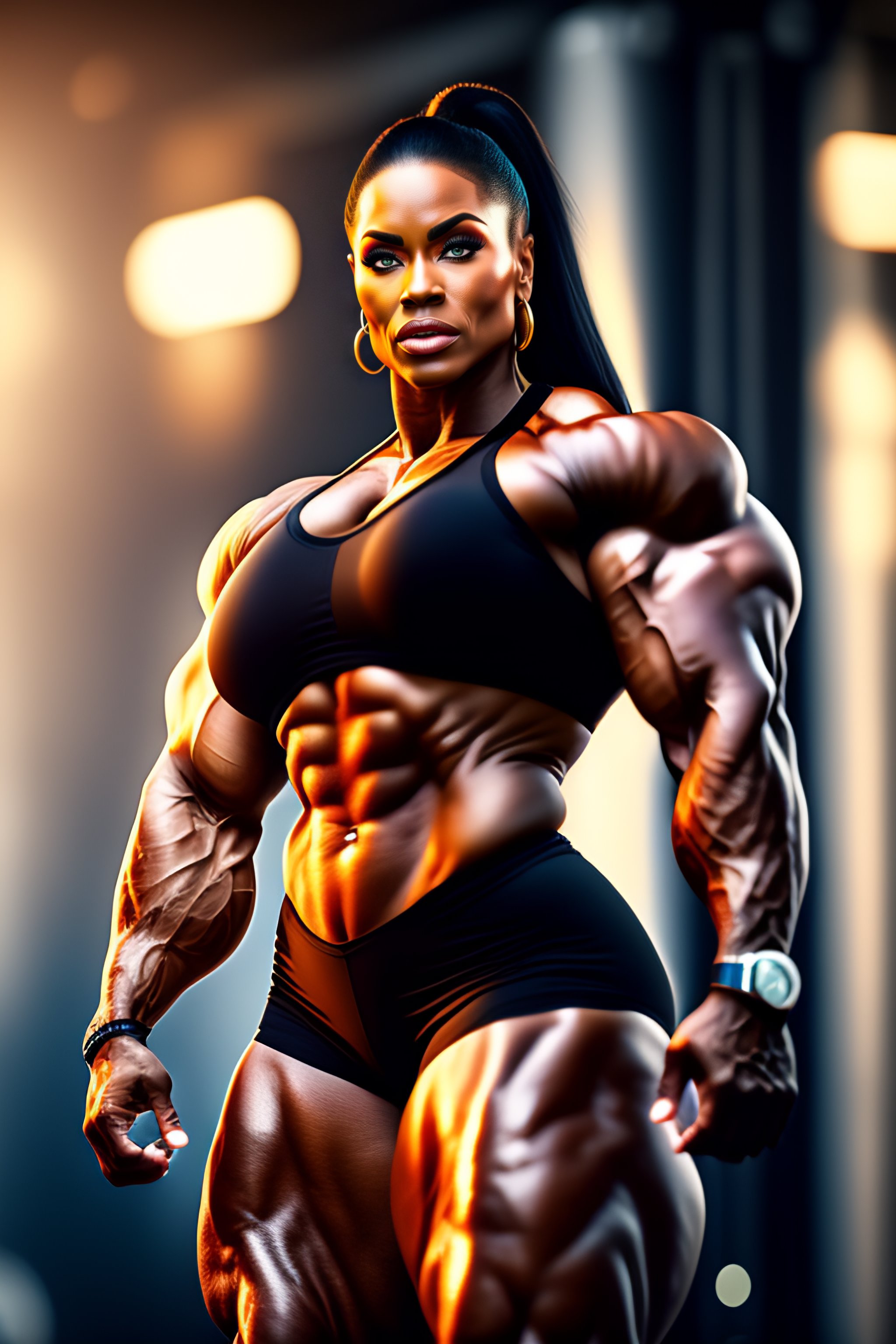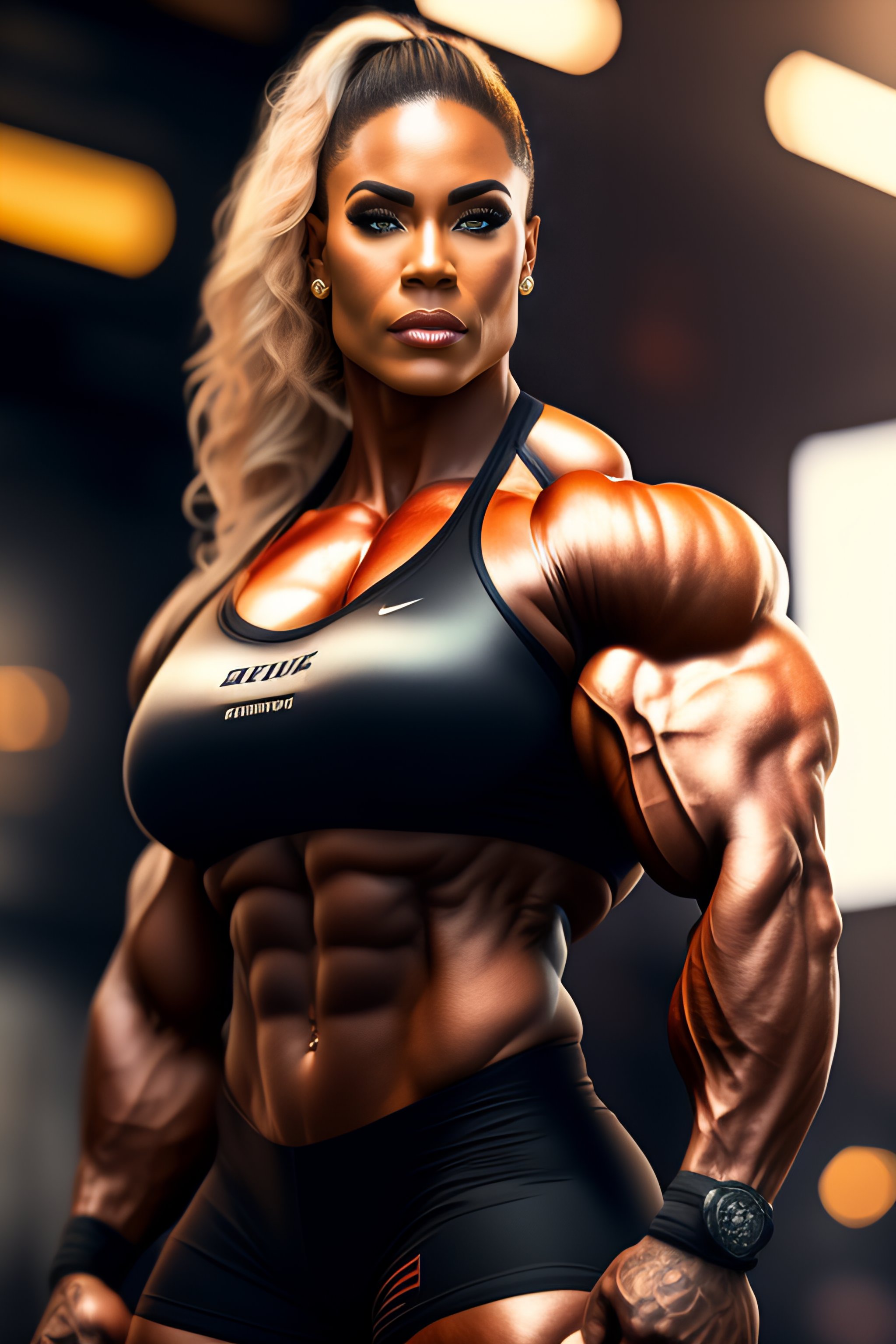 ((big)) muscle woman, perfectly-centered-photograph, sweaty, dynamic action pose, insane detail, intricate, highly detailed, zeiss lens, dslr photography, artstation, realism, smooth, sharp focus, unreal engine 5, octane render, redshift, 8k, highly detailed, beautiful woman bodybuilder
