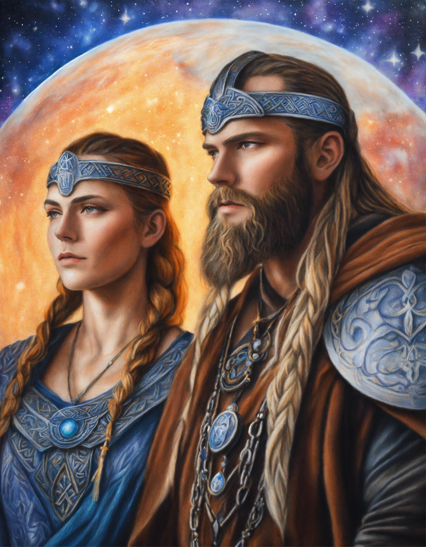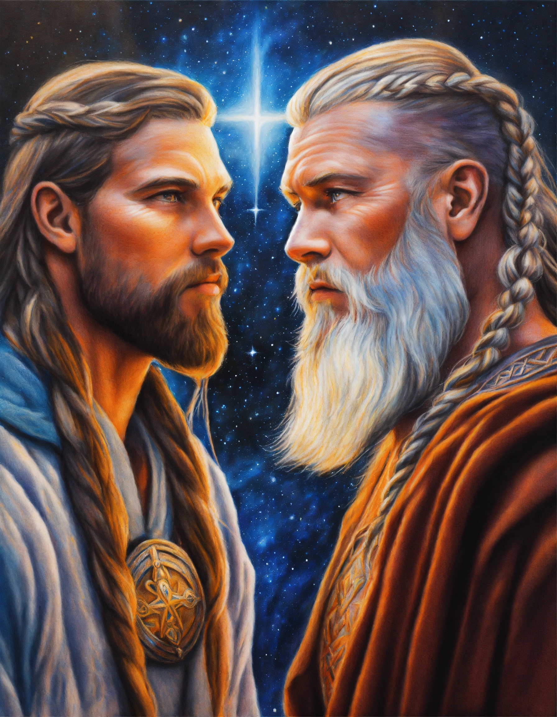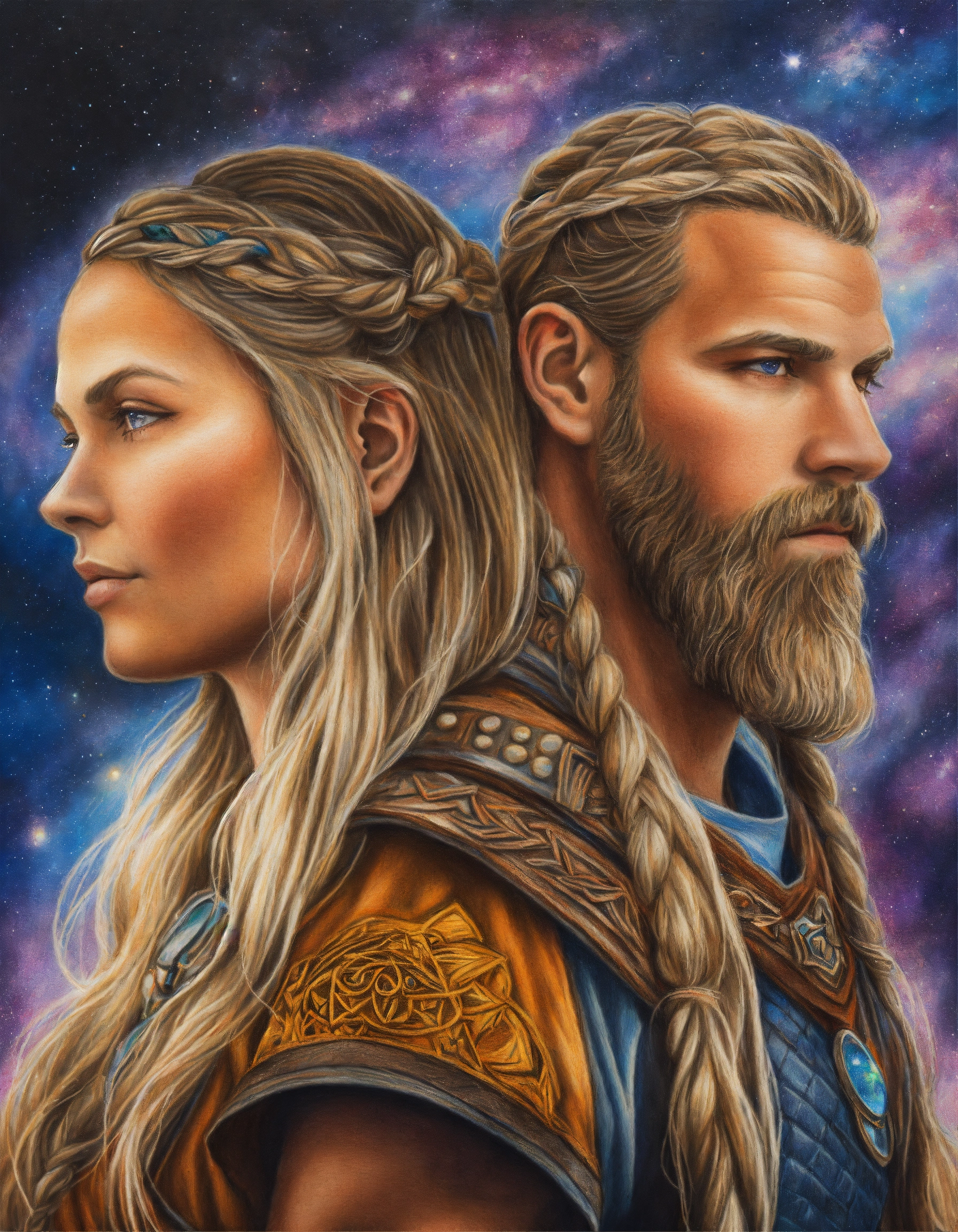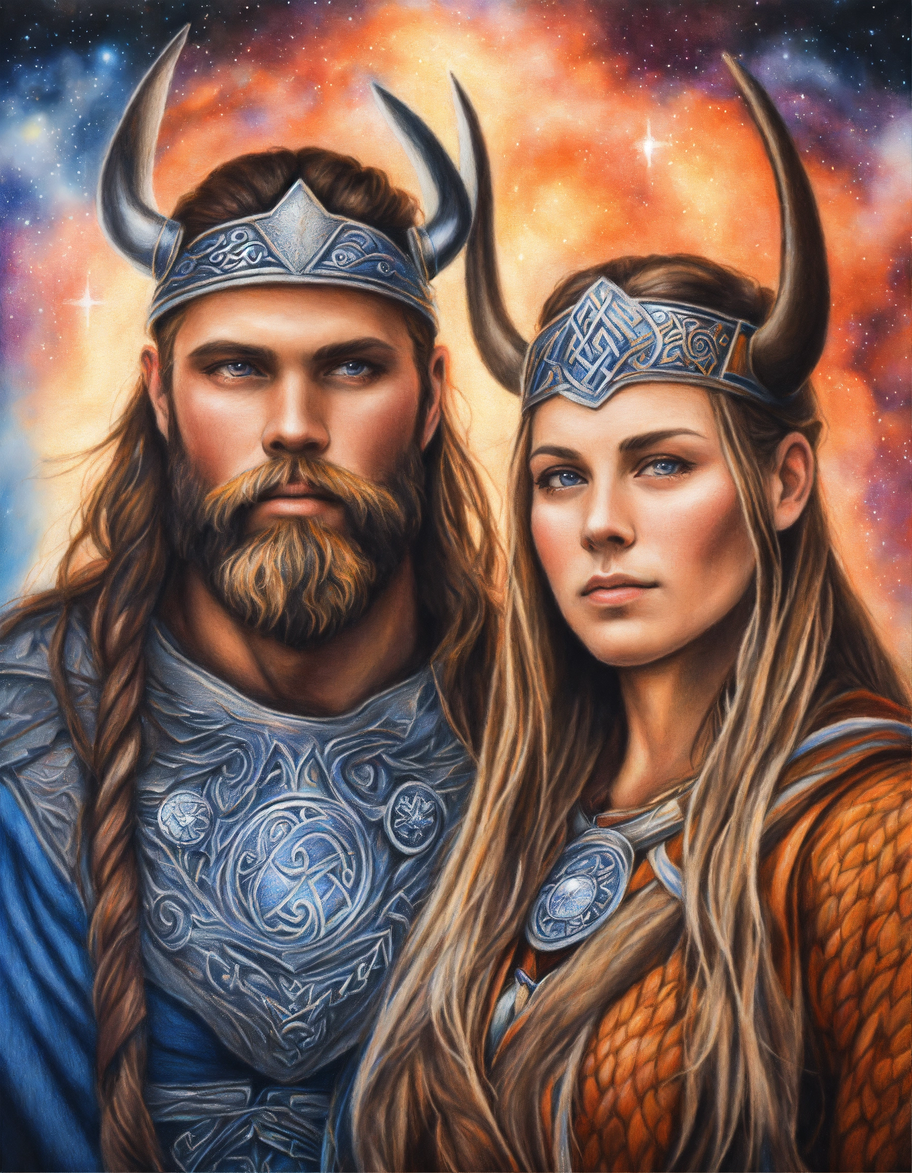 Realistic colored pencil drawing of spiritual mentors portrait of a couple of viking spiritual mentors, galaxy background
