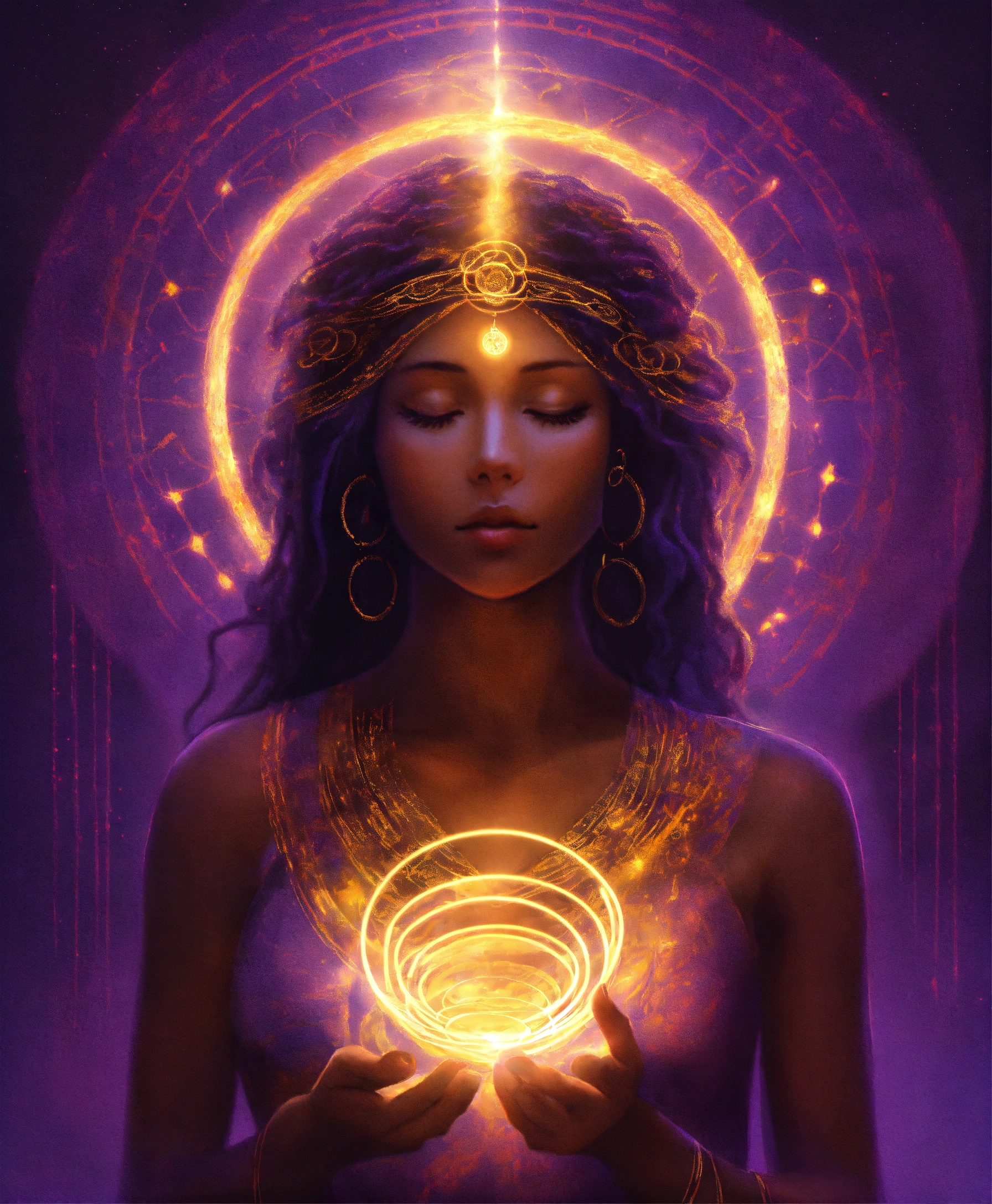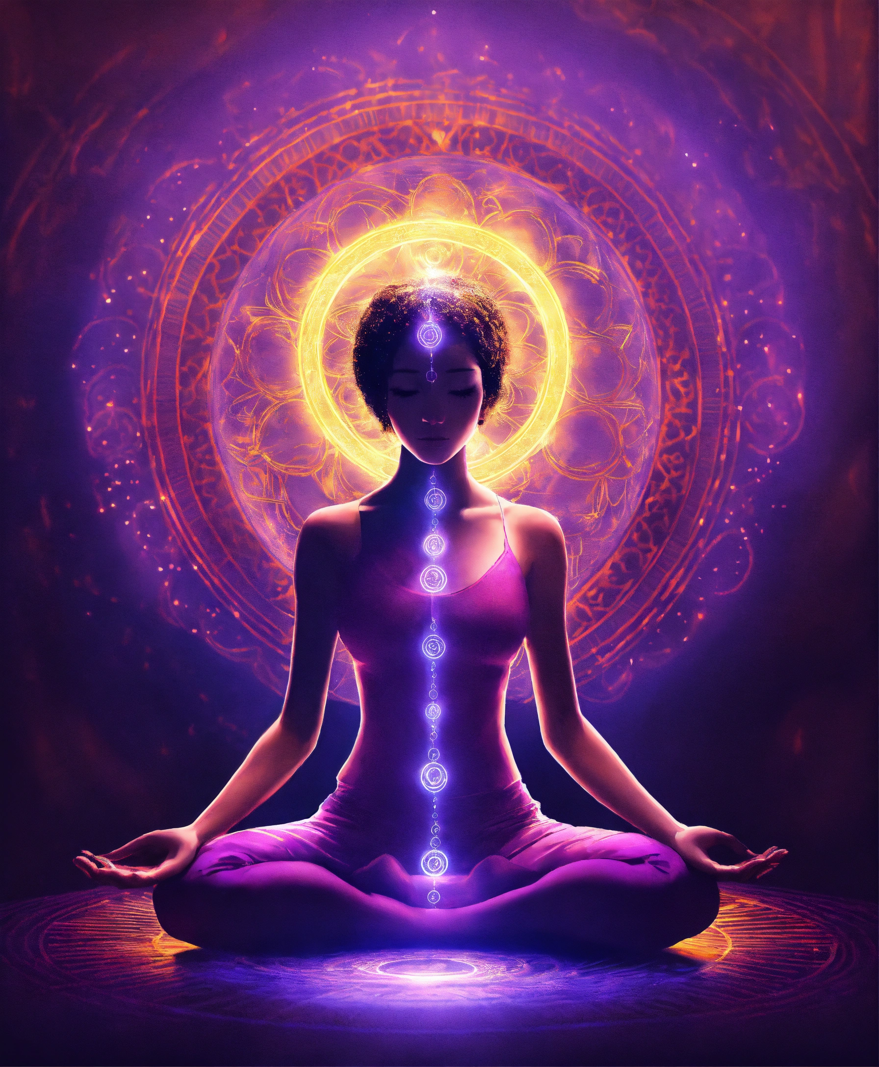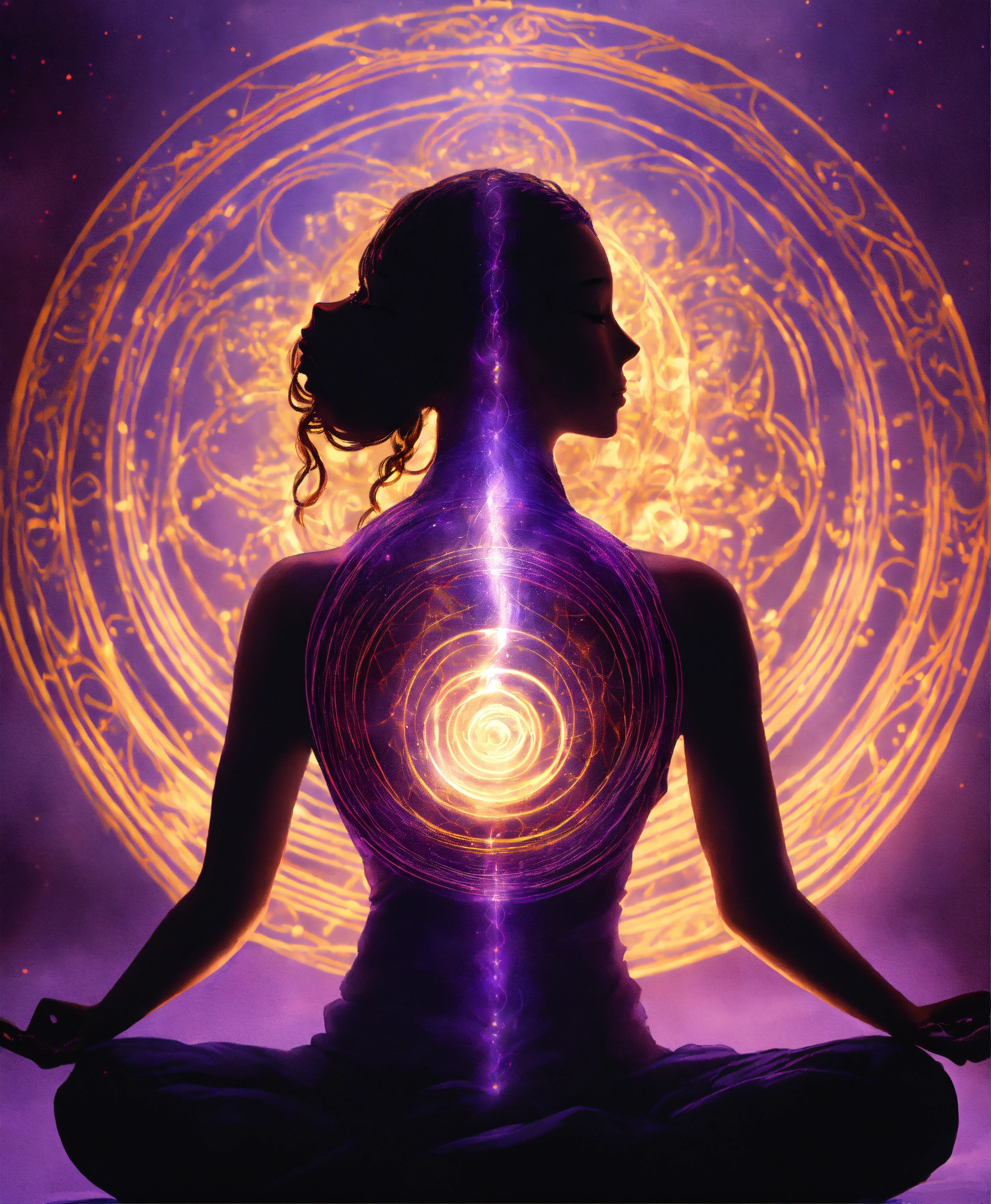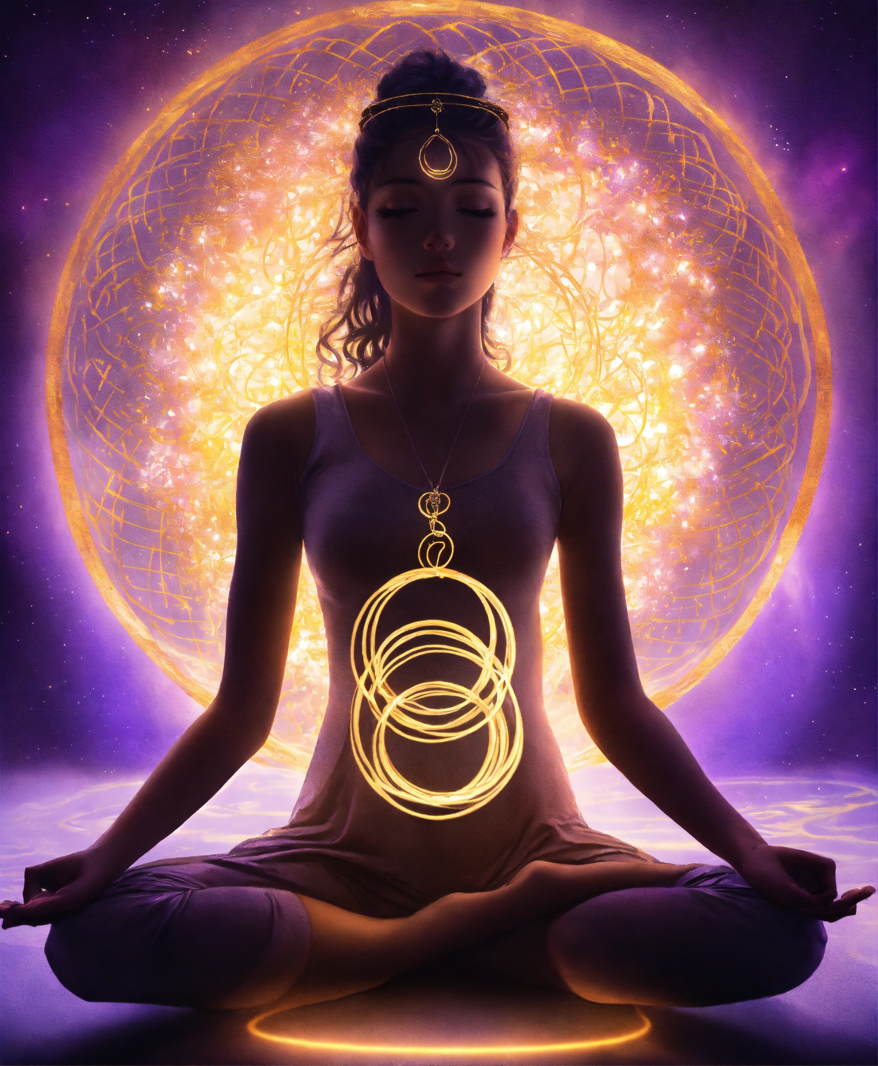 Realistic draw of a female illuminated silhouette in a meditation position, above her head is a vortex surrounded by 4 golden rings, a thread of violet light comes out of this vortex and enters through the top of the head, spiritual art