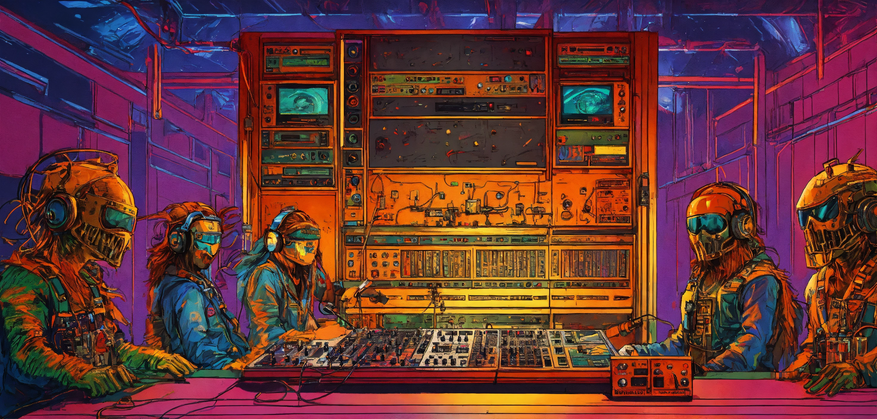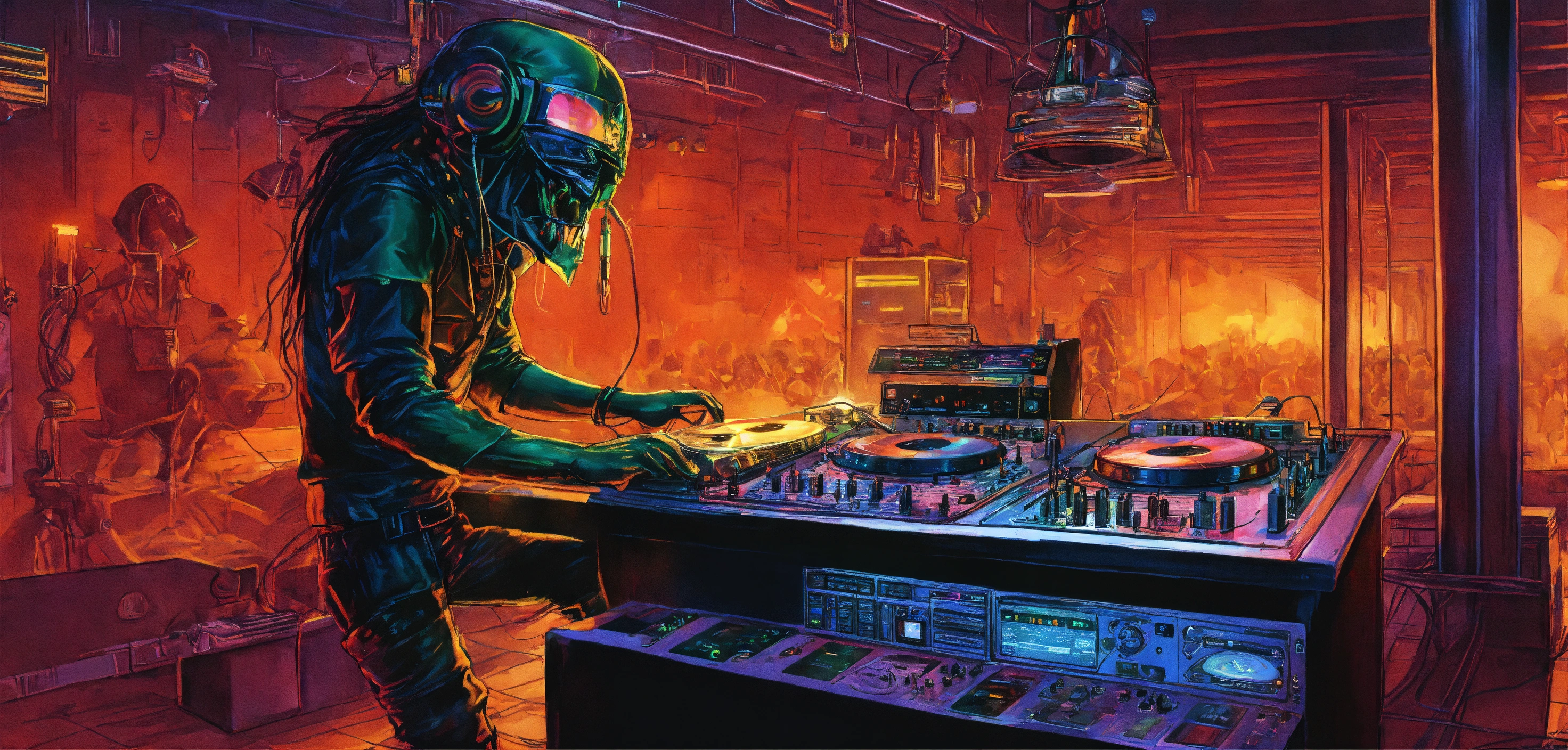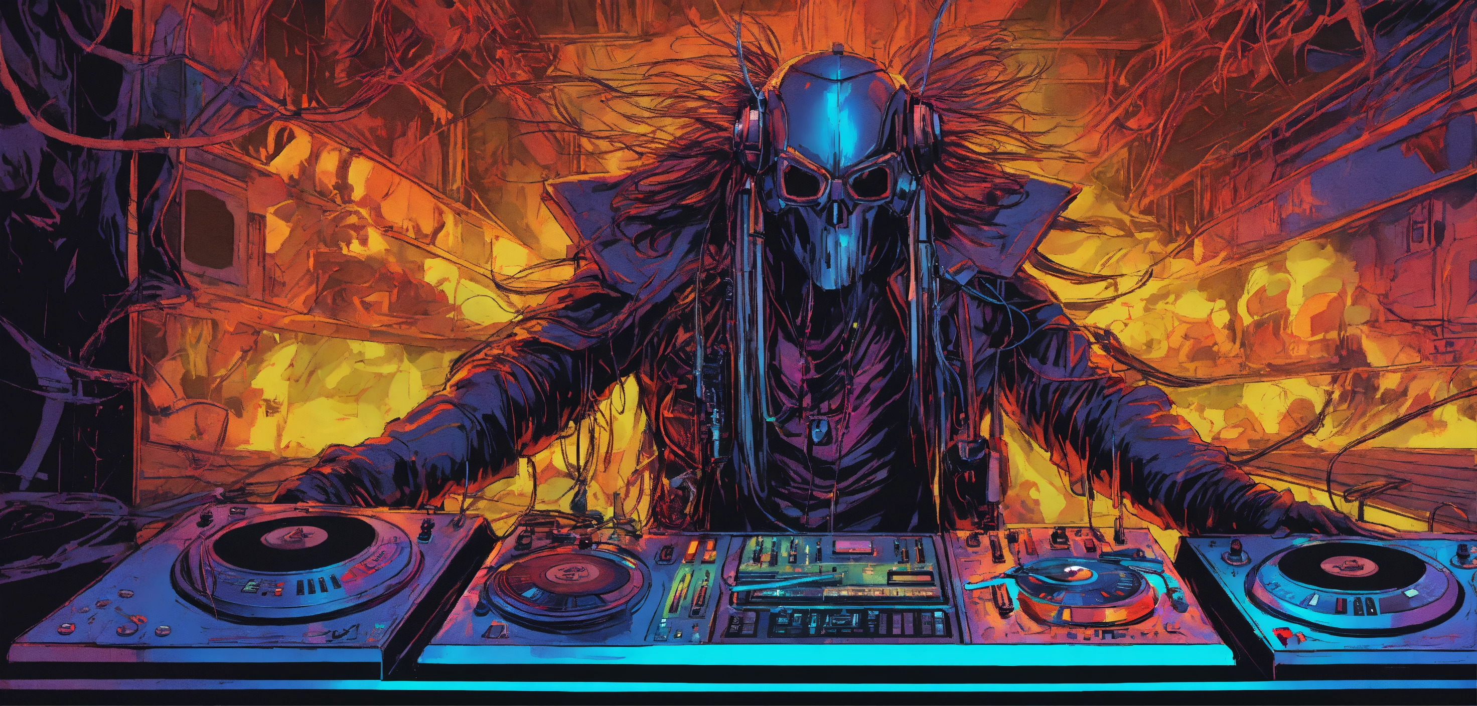 Dj mixing, terrible art, terrible drug addict, no text, mk ultra, pablo eskobar, 80s illustration of futuristic heavymetal band, monster, cybernetic prison, metal art