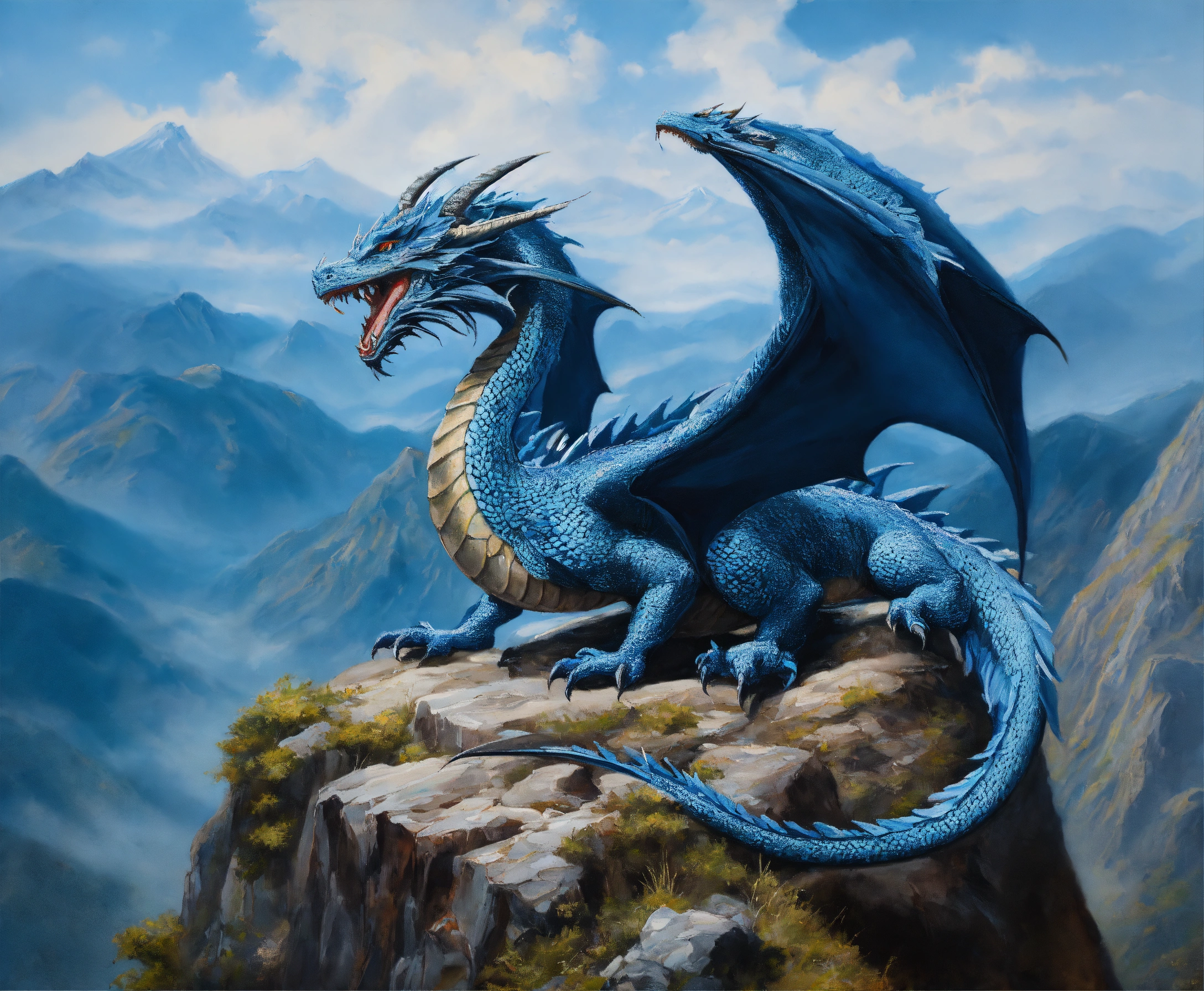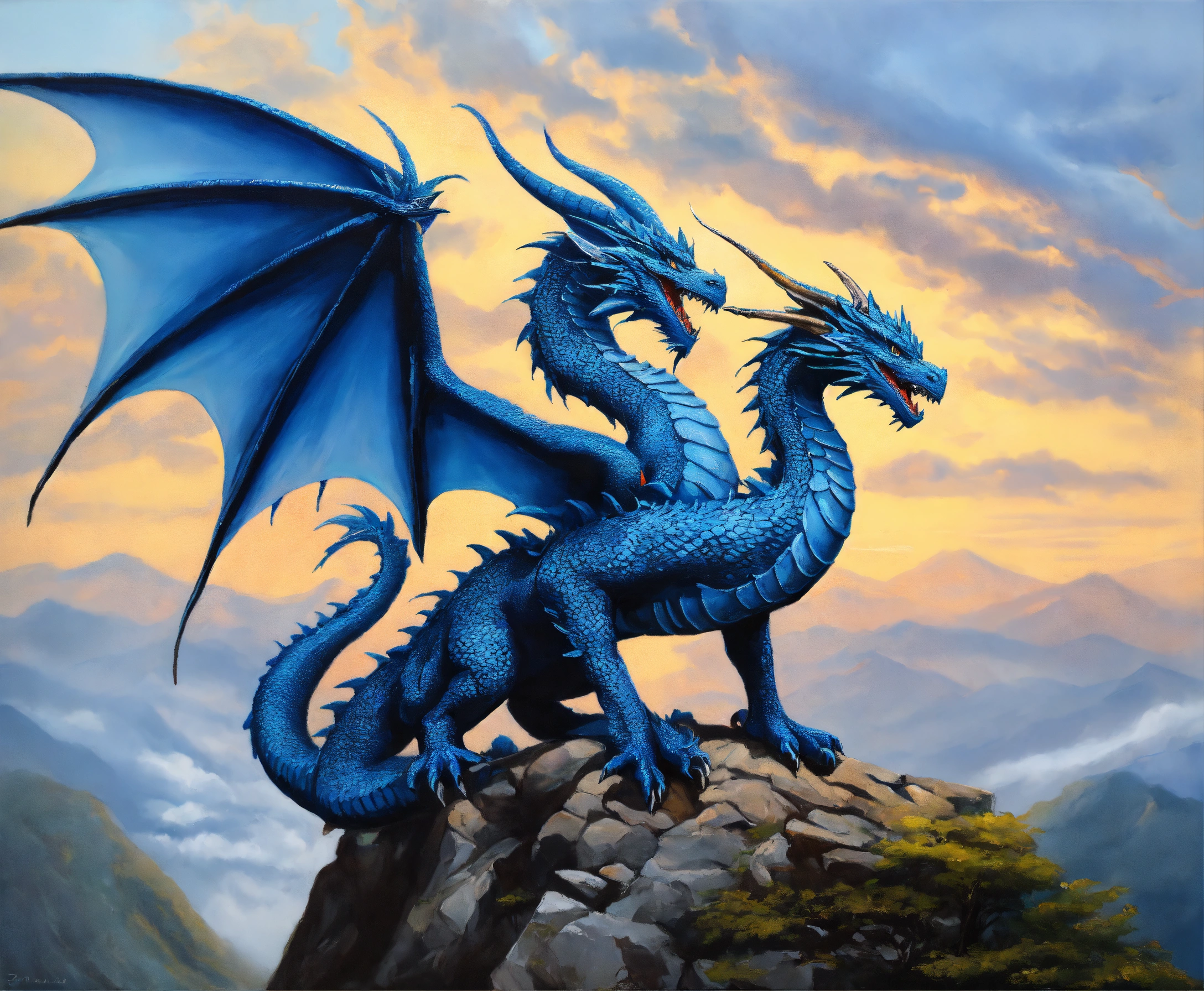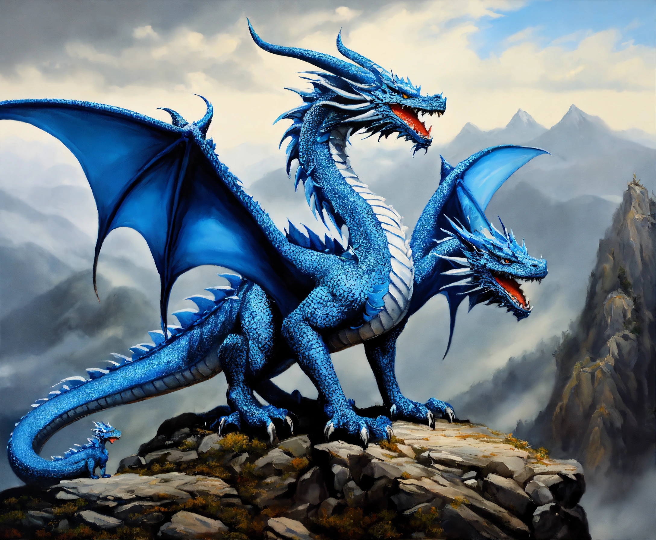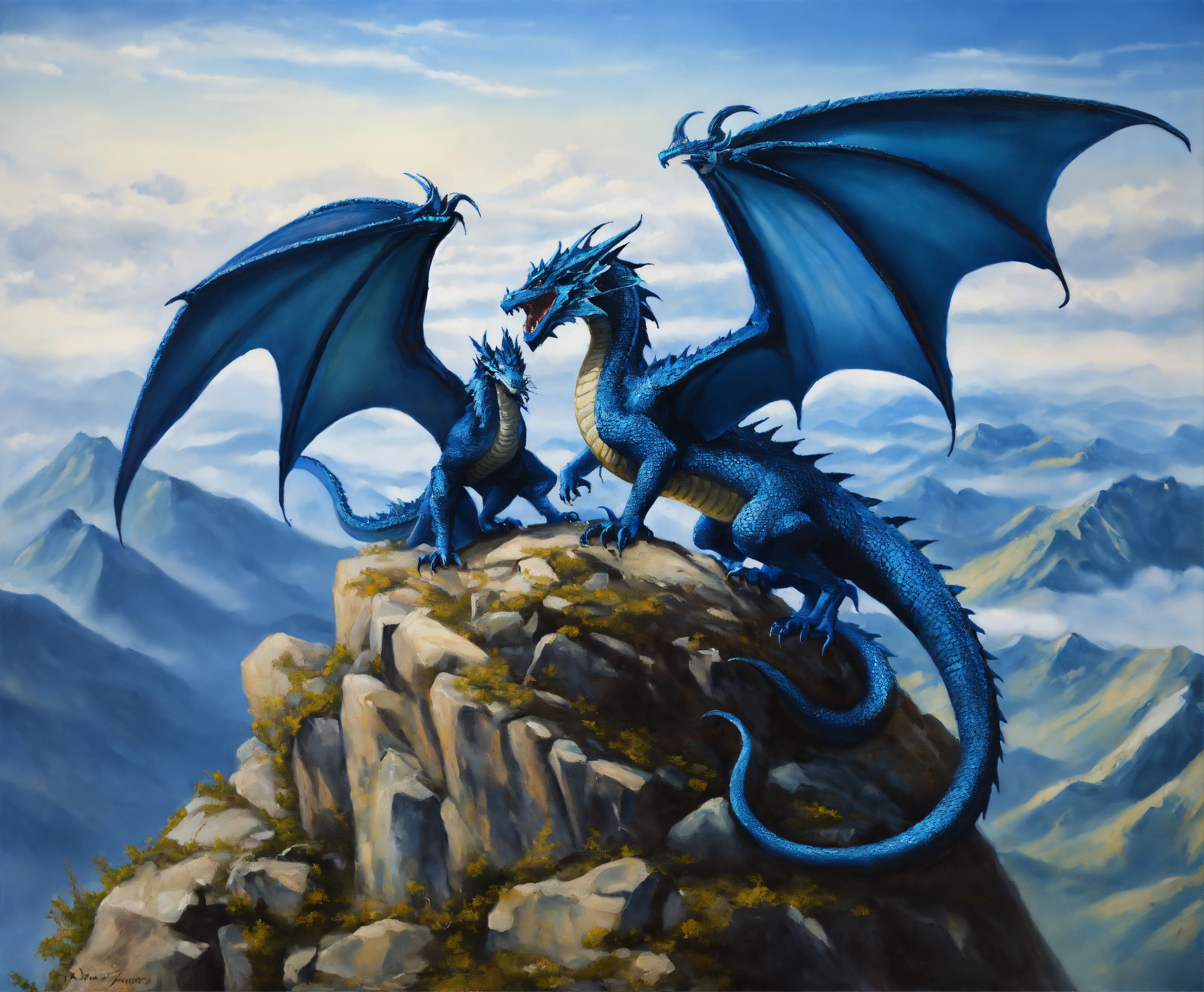 Oil painting of two blue dragons, one dragon is much bigger than the other one, on top of a high mountain, ultra detailled, ultra realistic