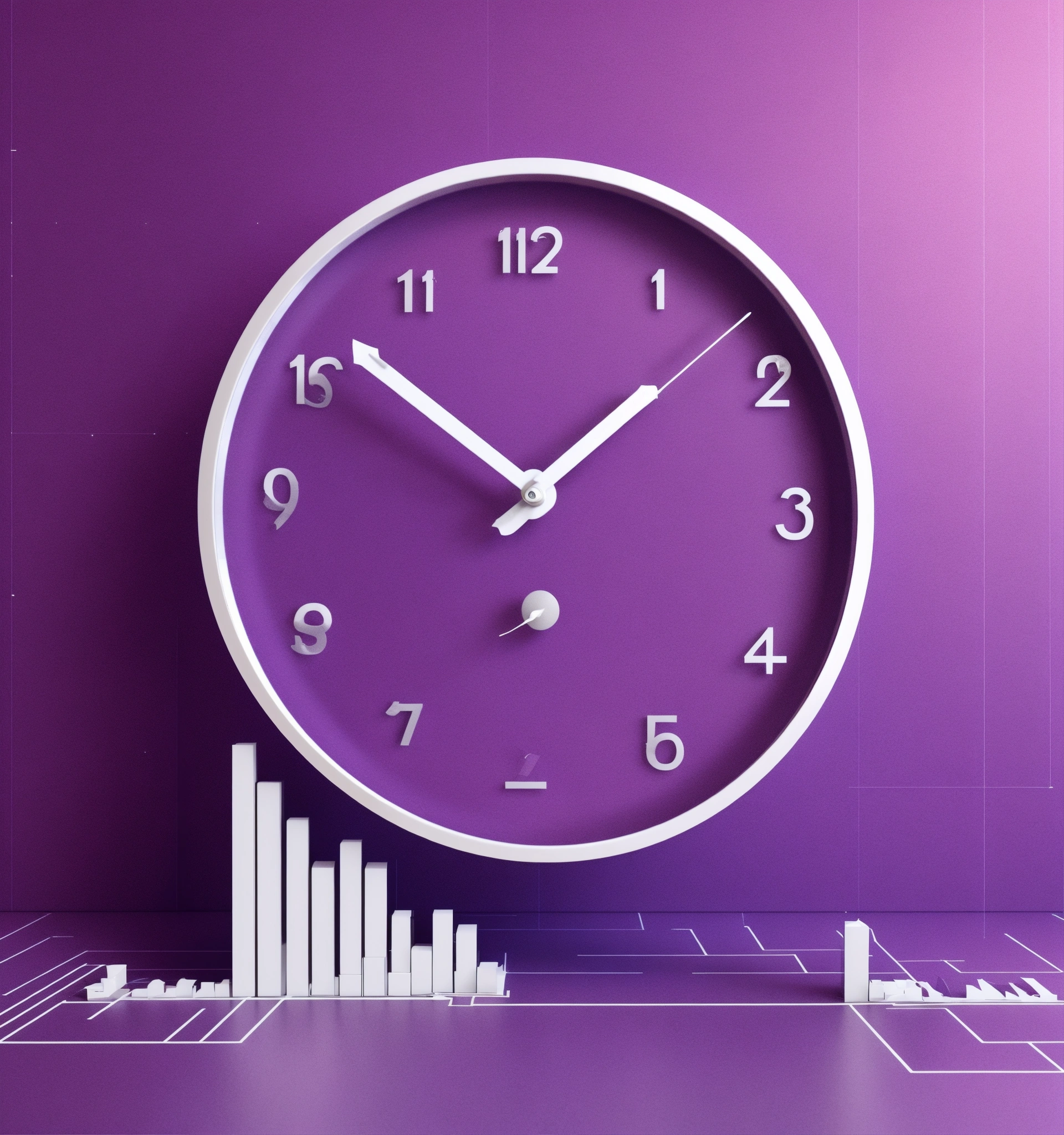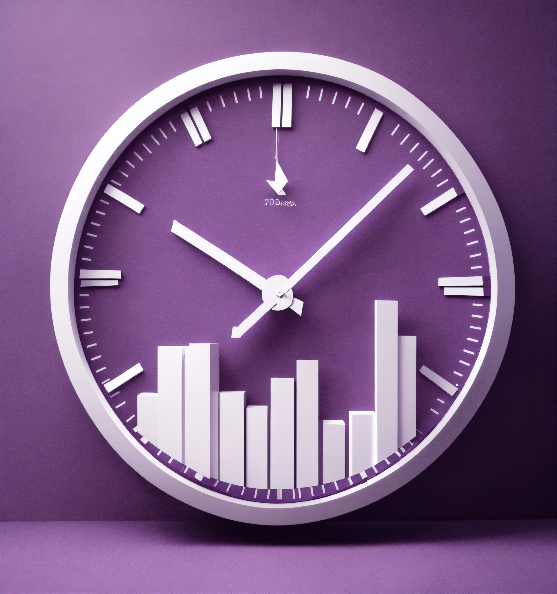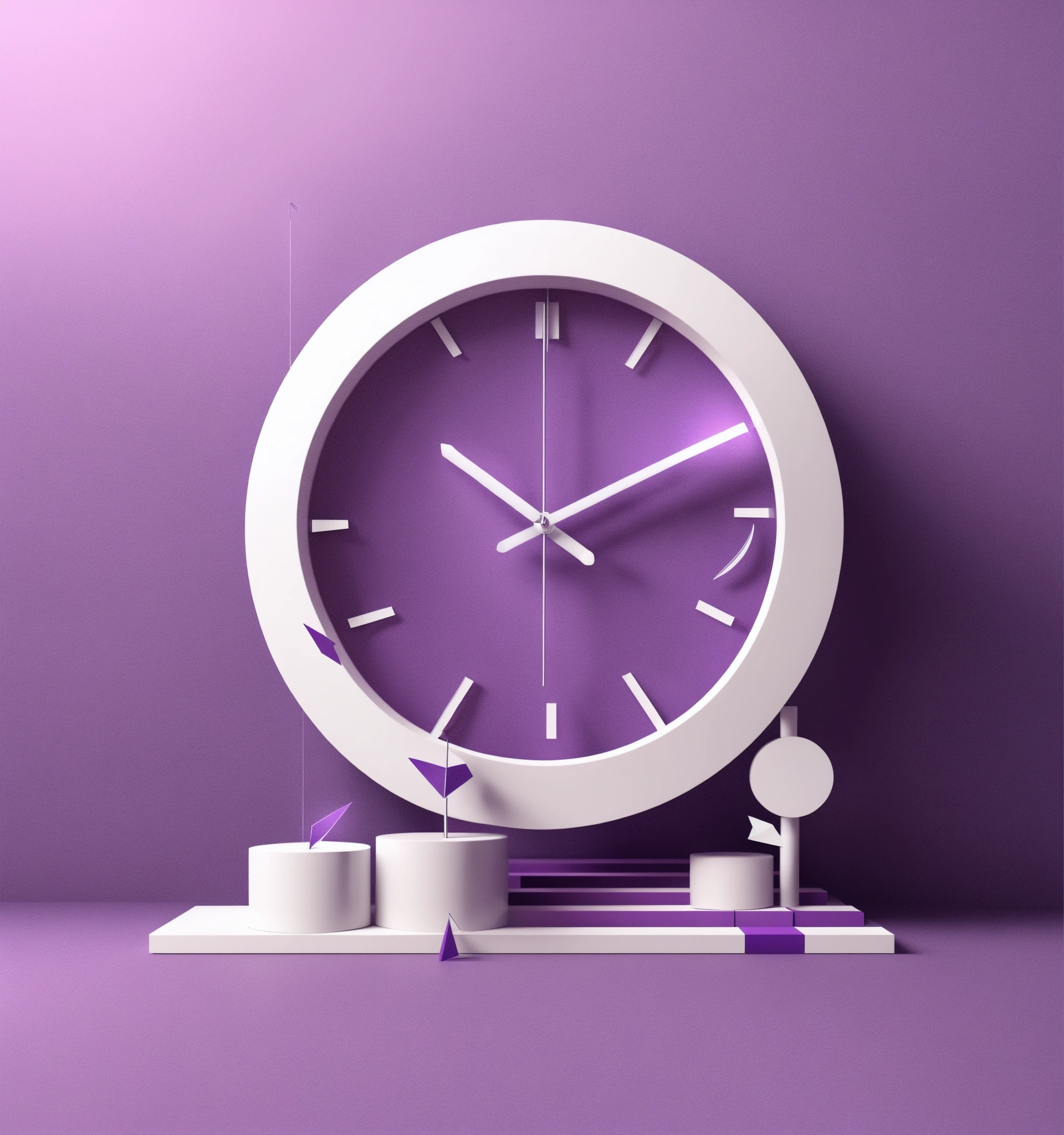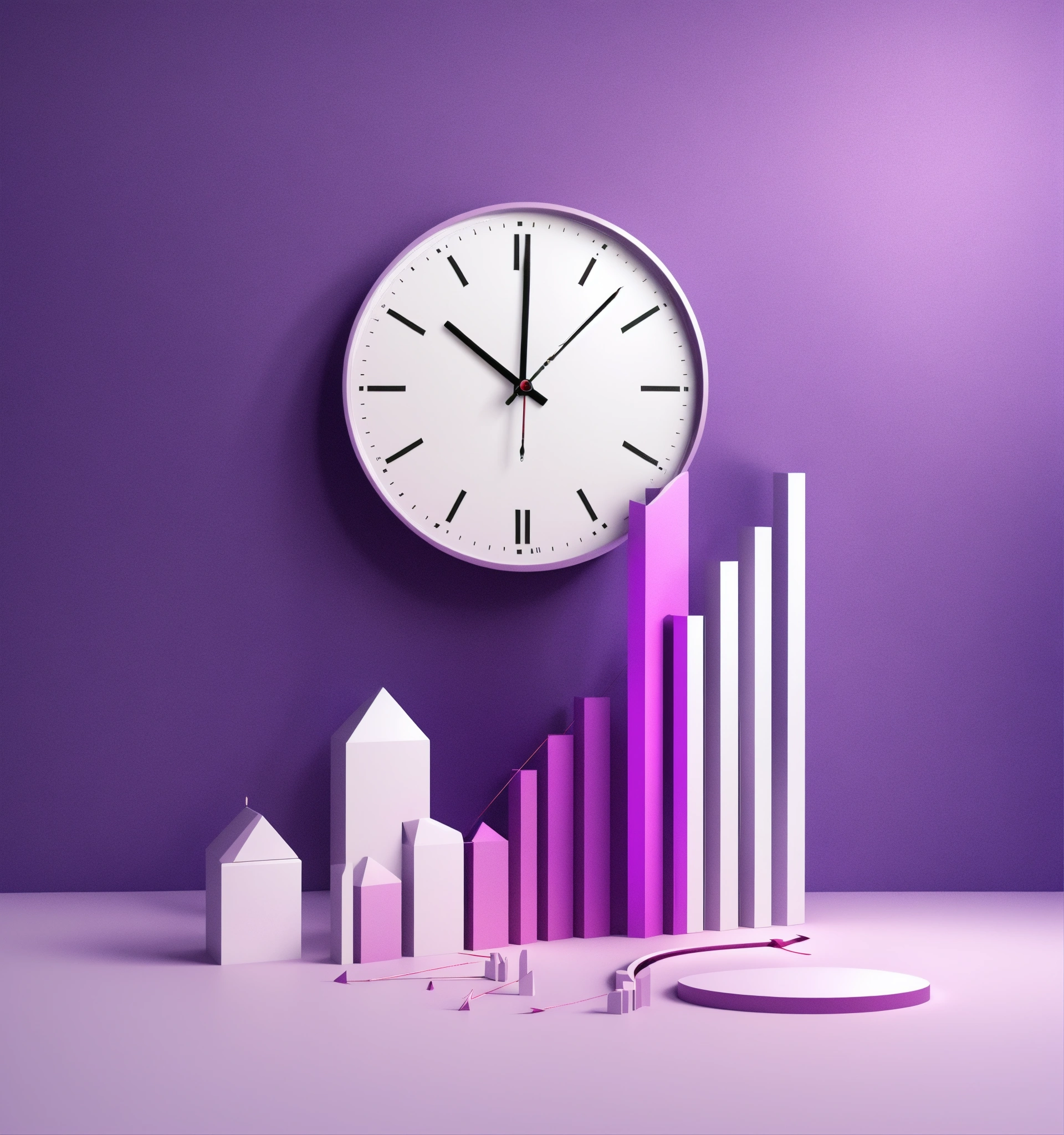 3d illustration of an arrow going up, increasing graph, and a round clock, minimalist elegant, purple and white tones