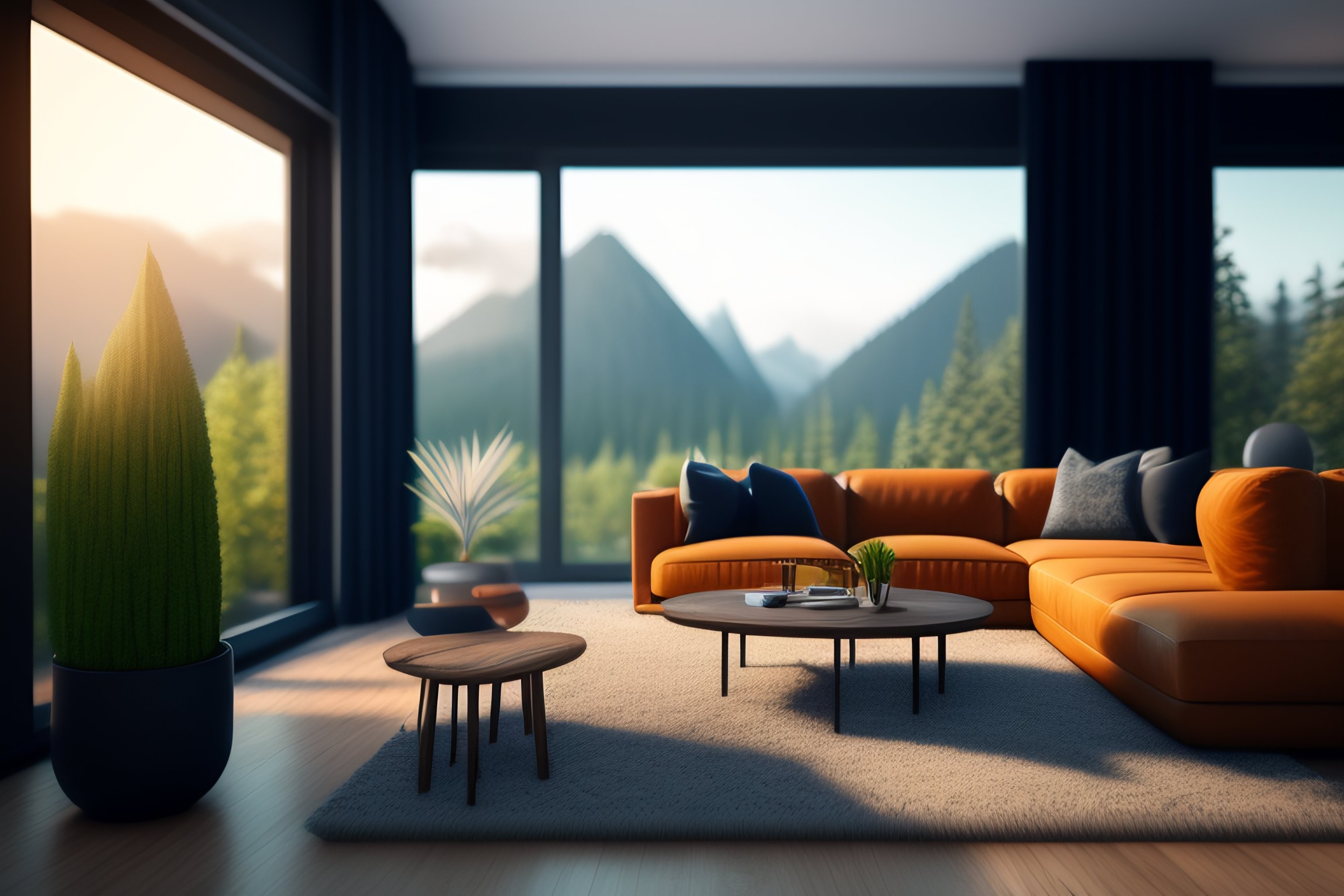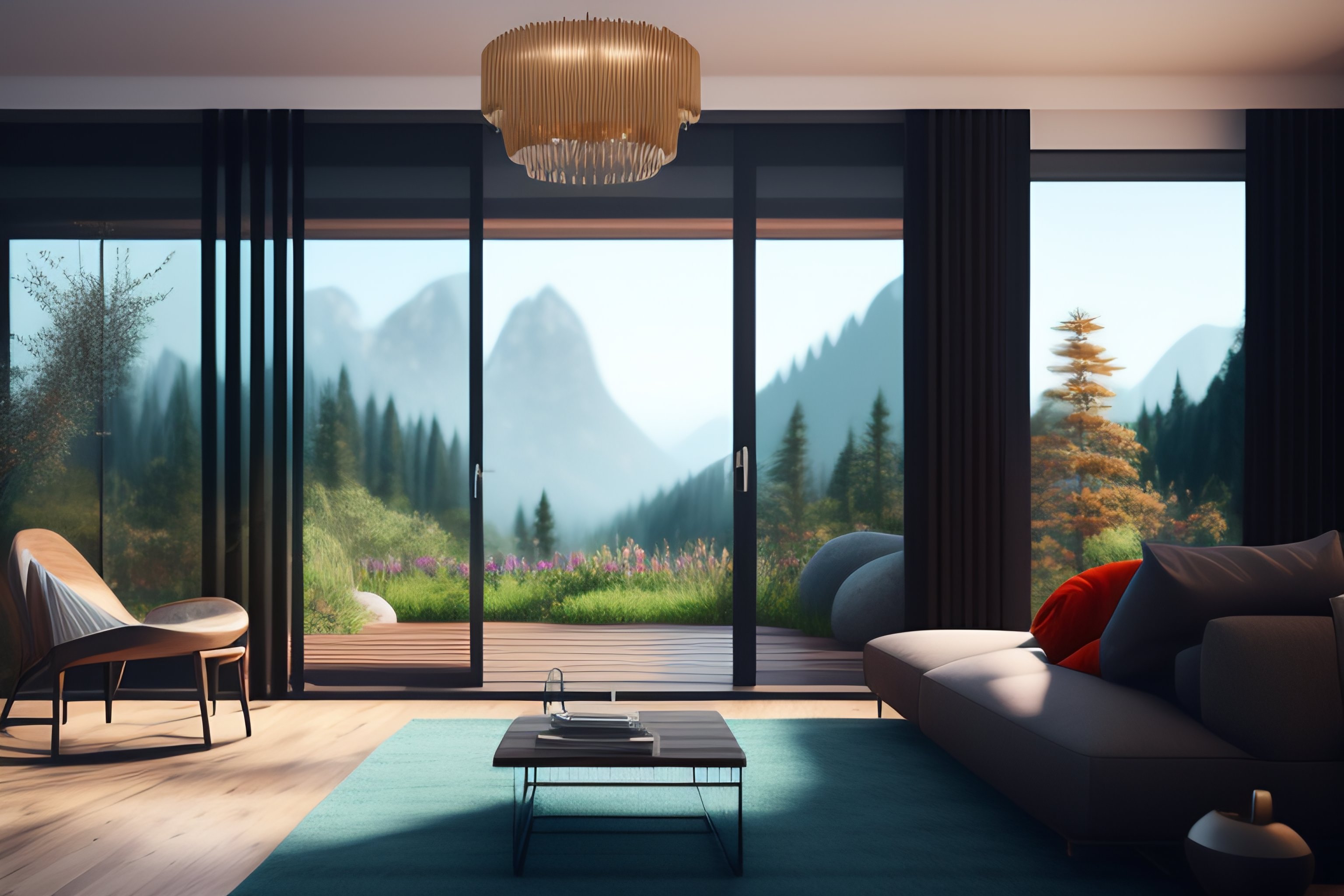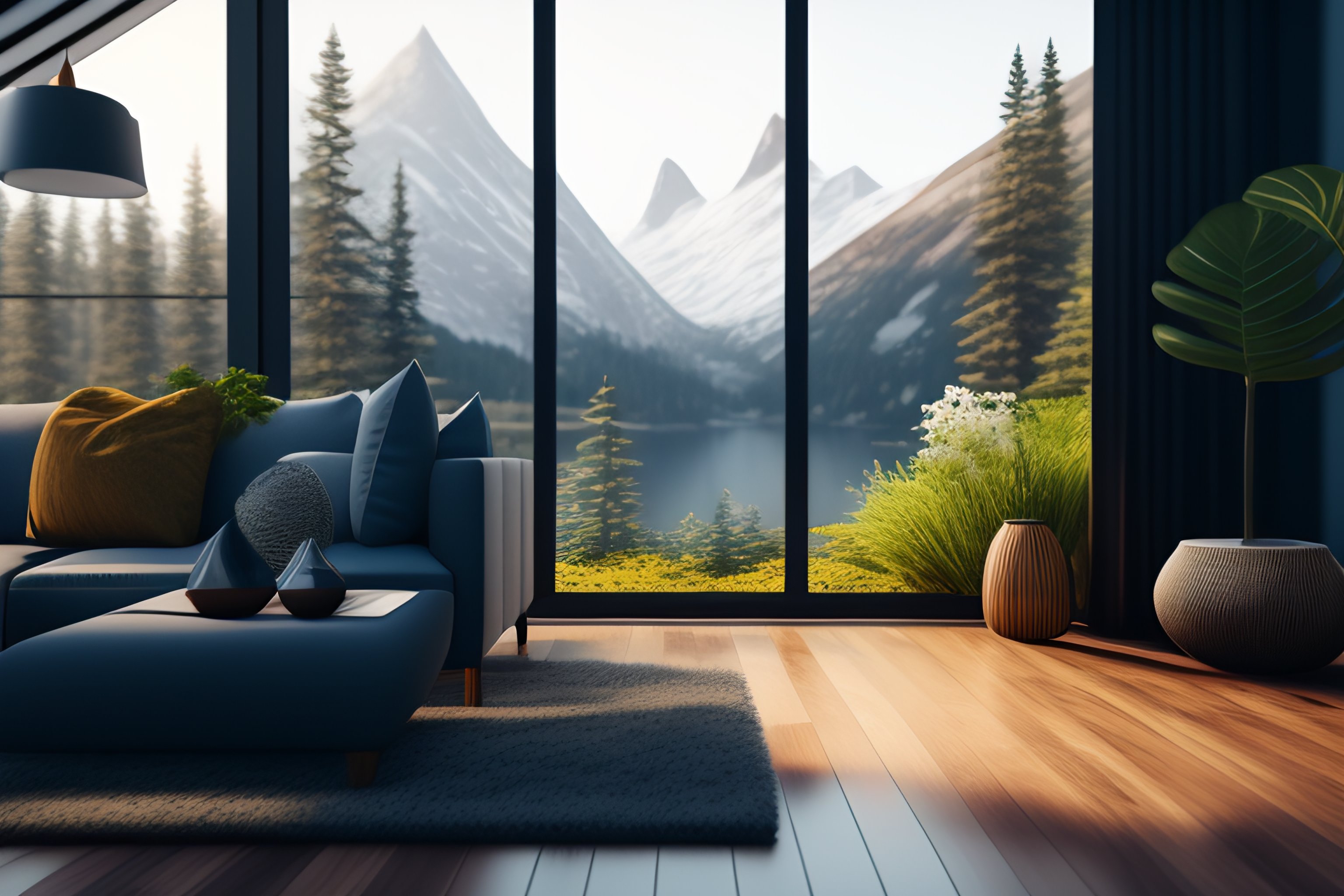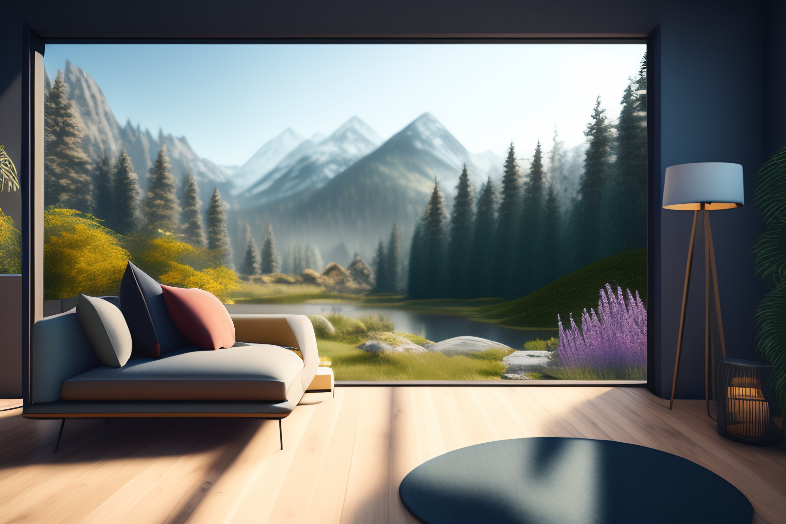 A beautiful modern living room with wood floors, large windows with a beautiful view, an area rug, plants, forest, mountains, spring, realistic, hd, 8 k, digital rendering, unreal engine, blender, octane, maya