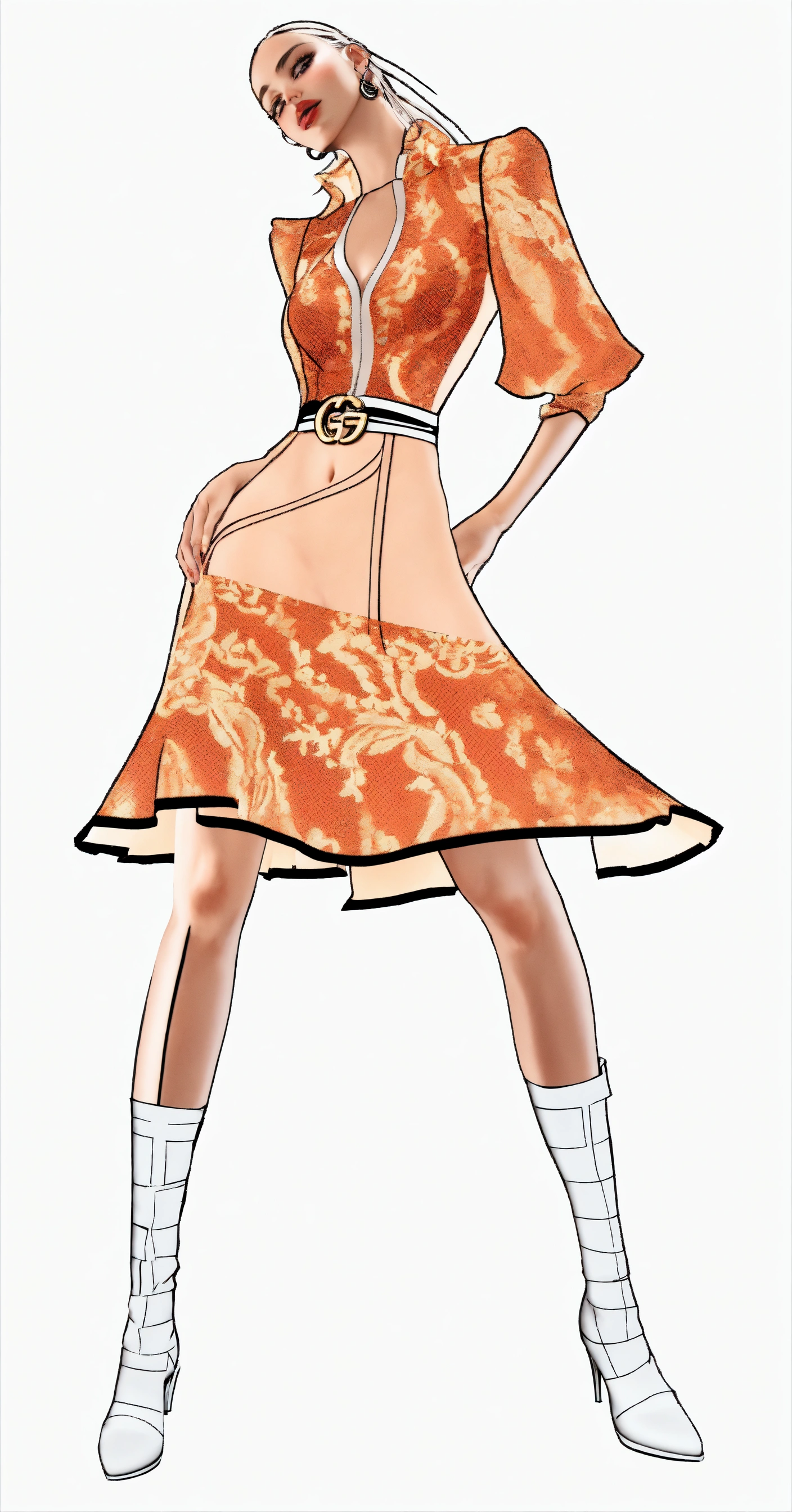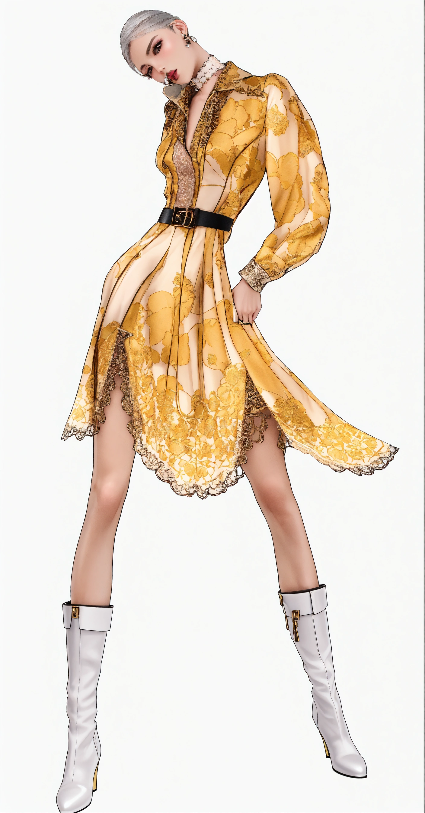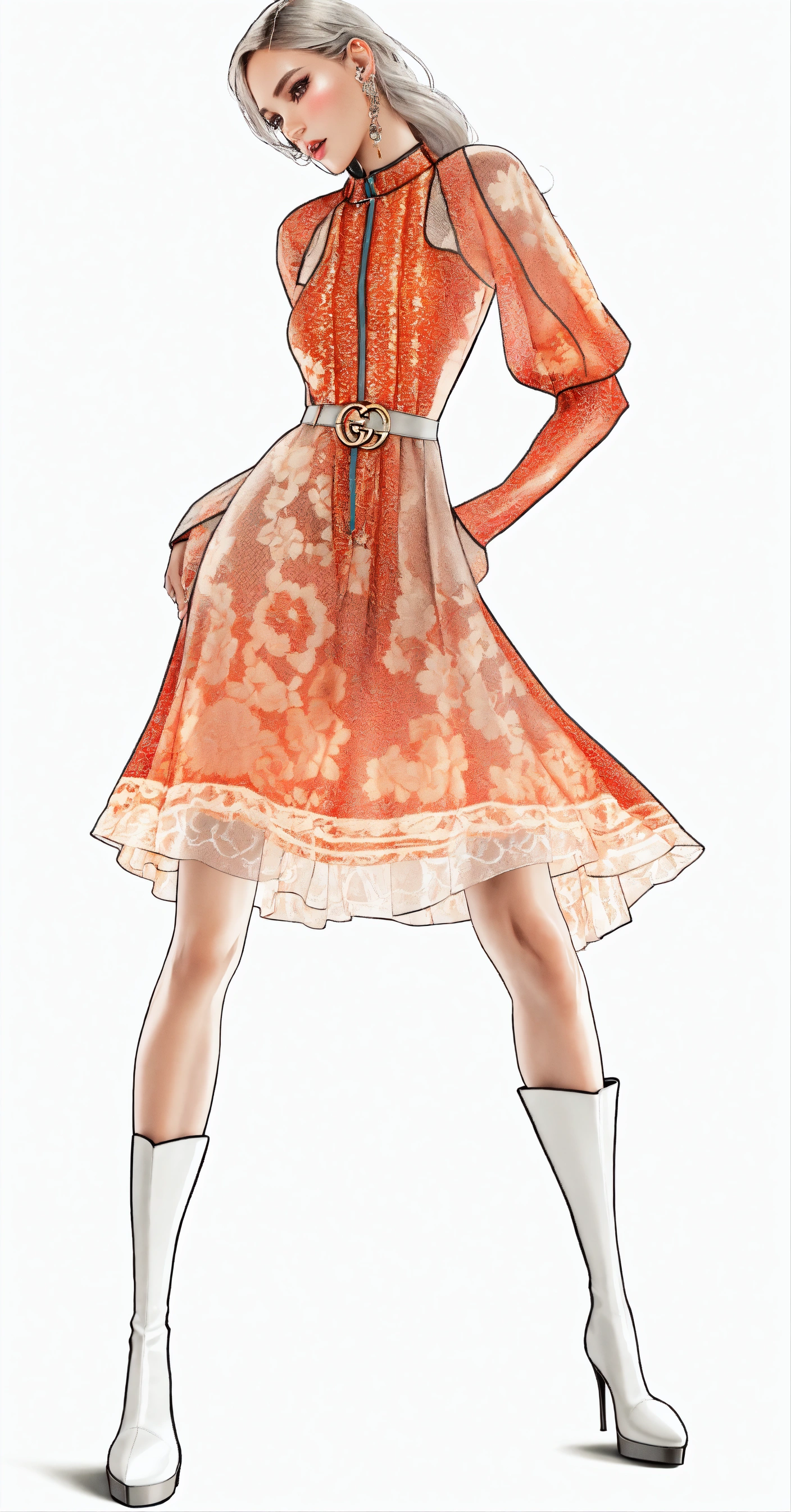 Significant surreal photo, amateur gucci fashion photoshoot of a beautiful charismatic latino woman in 3d, hyperrealistic model in modern lace silk withe color dress, the soft grey leather boots in cityscape in background.