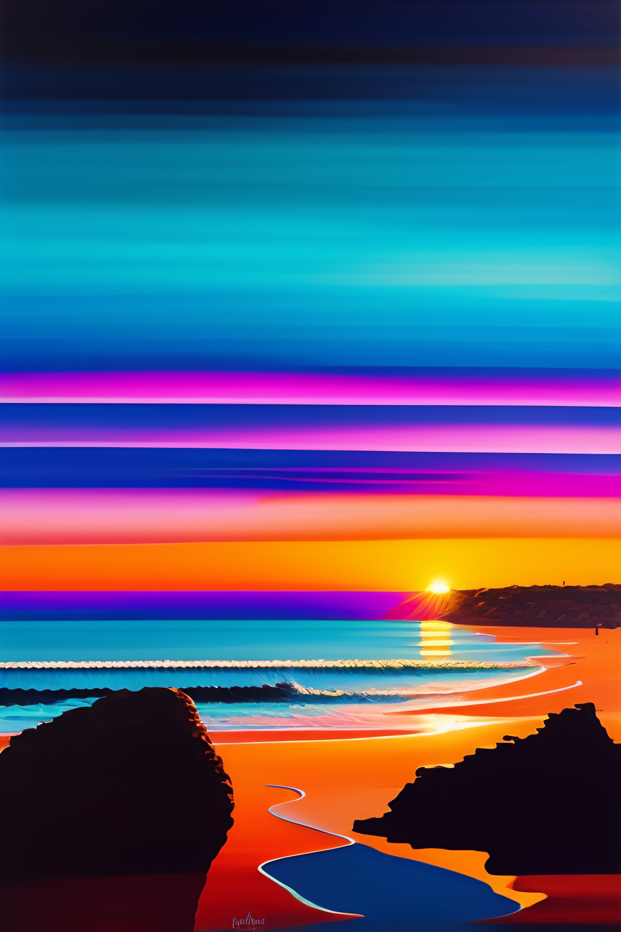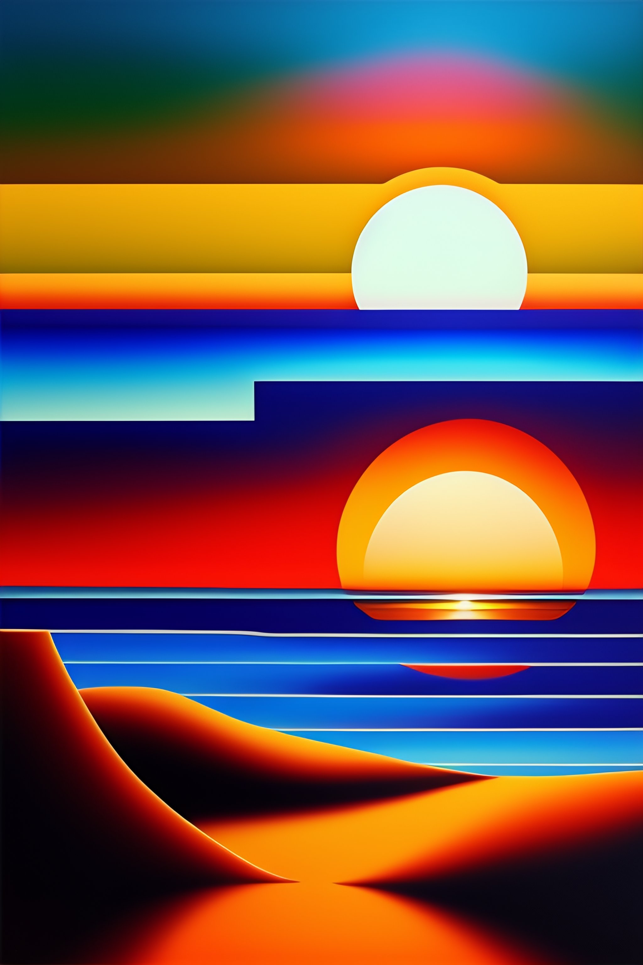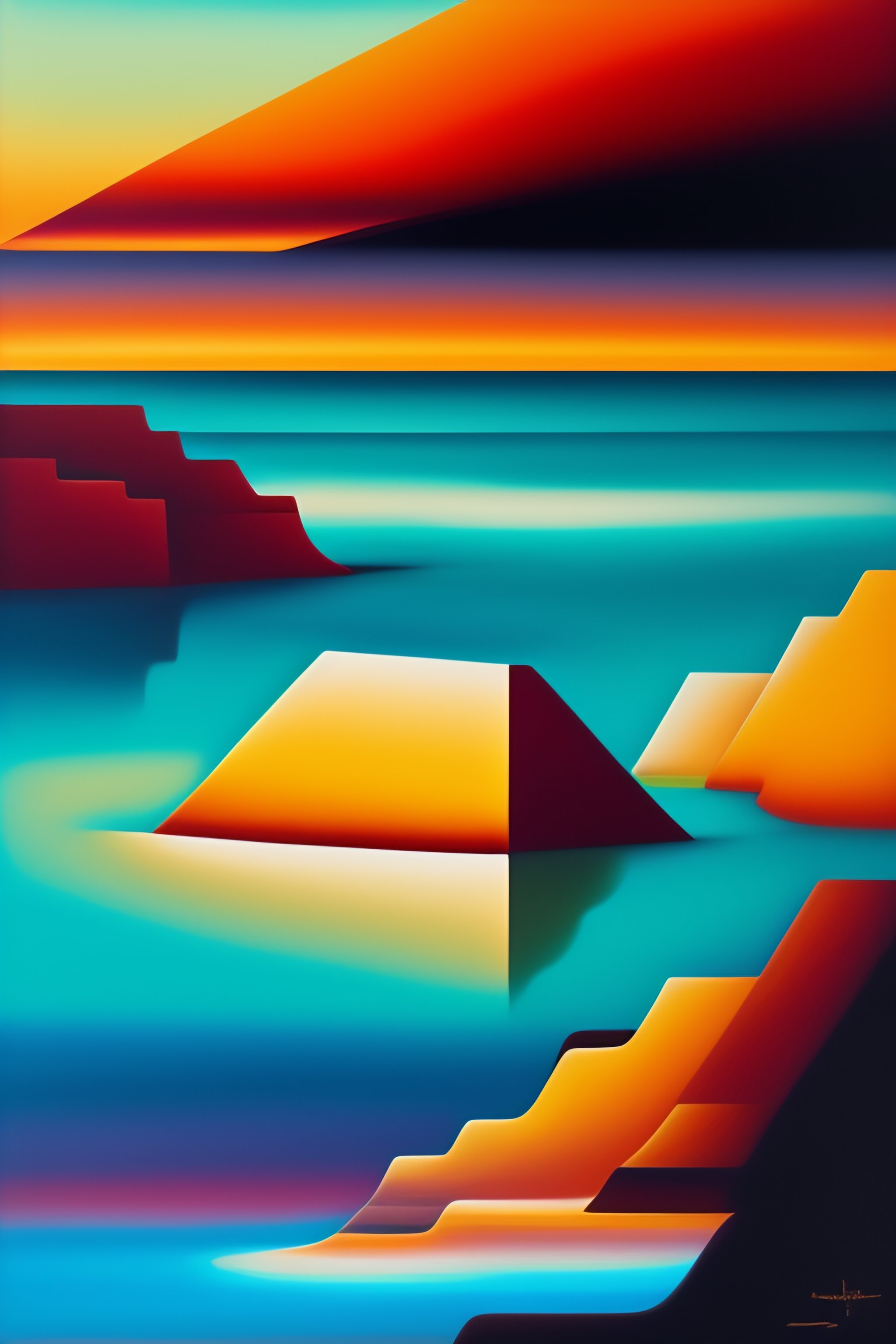 Imagen cubista abstracta y surrealista en forma de paisaje en el mar con lancha al atardecer