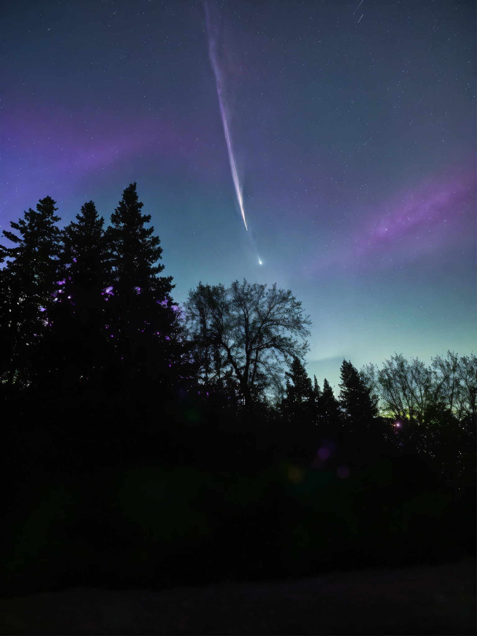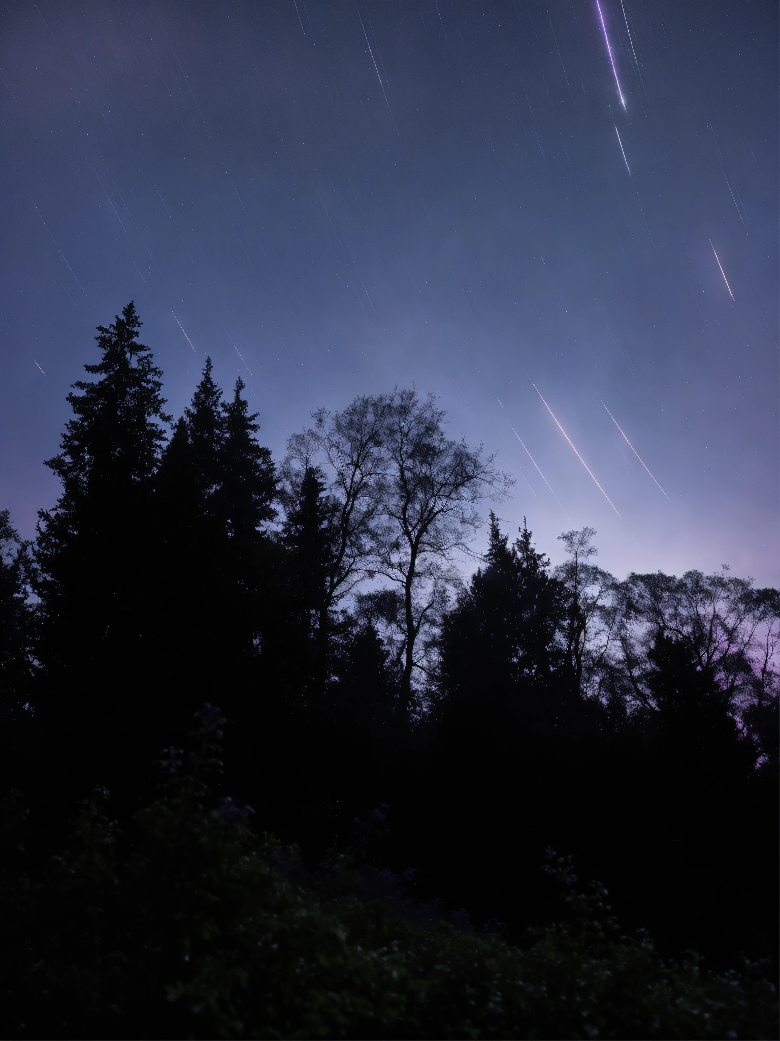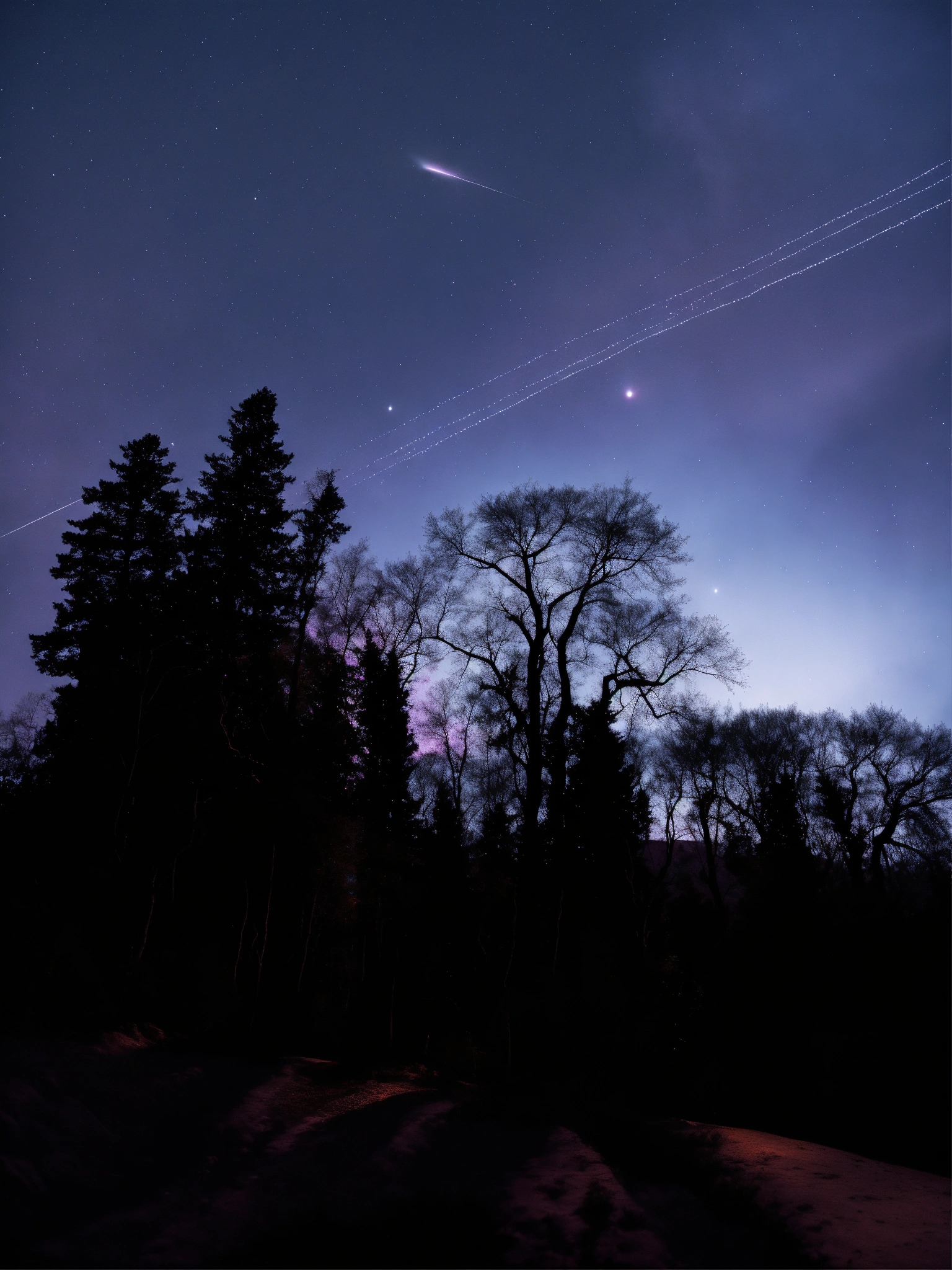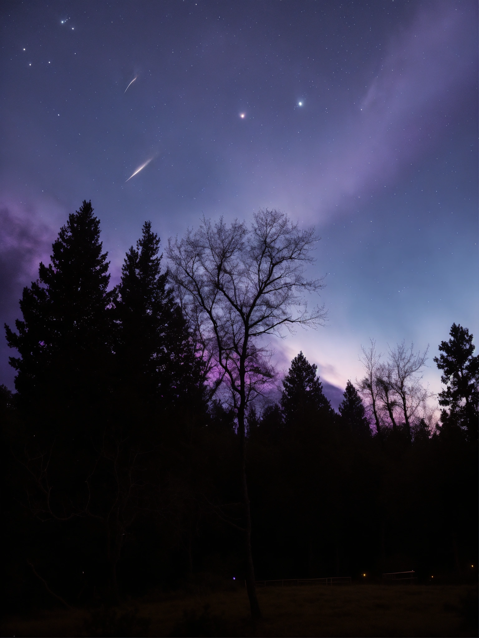 Deep purple night skies with comets in the sky and silhouettes of close-range trees