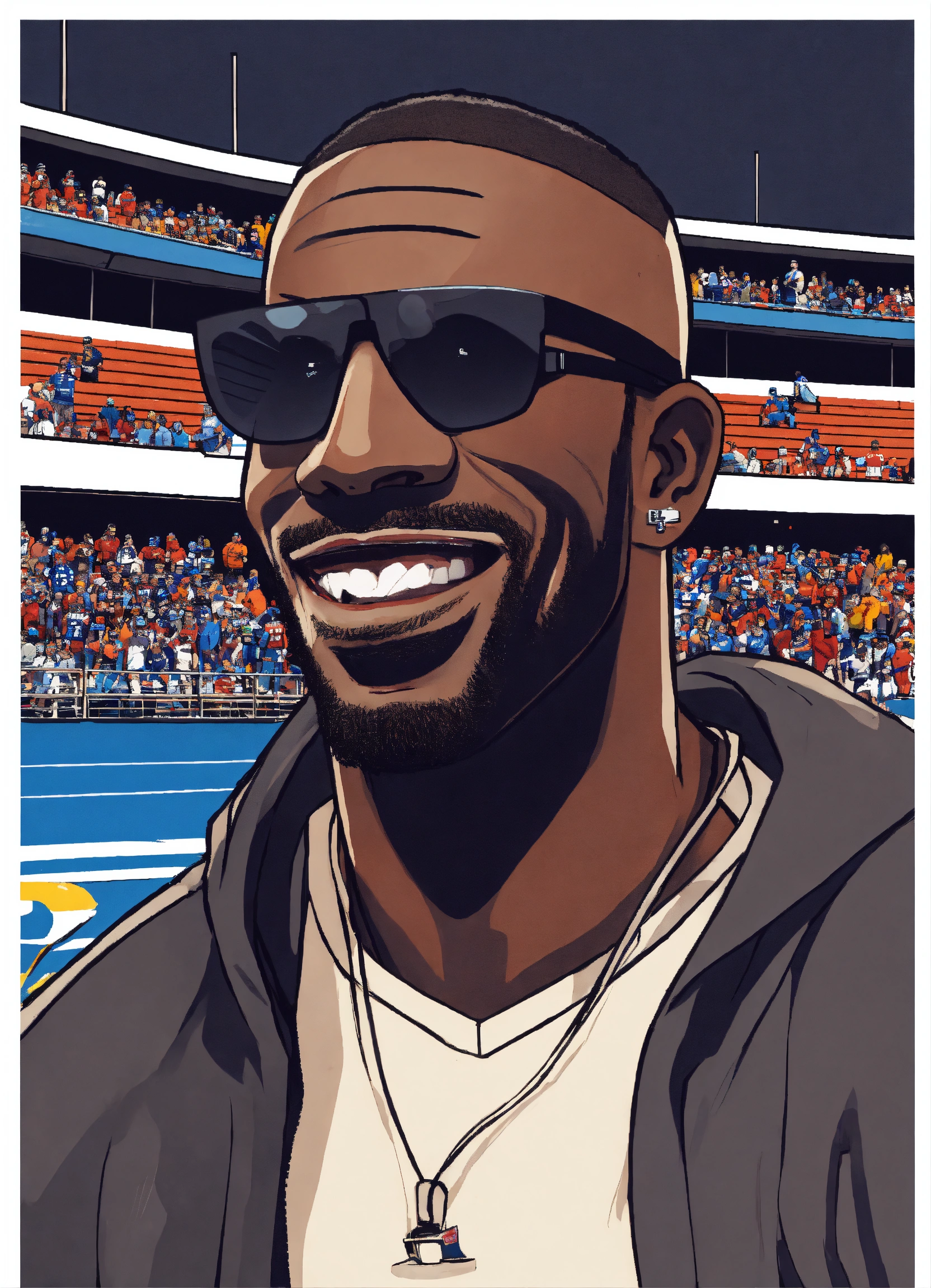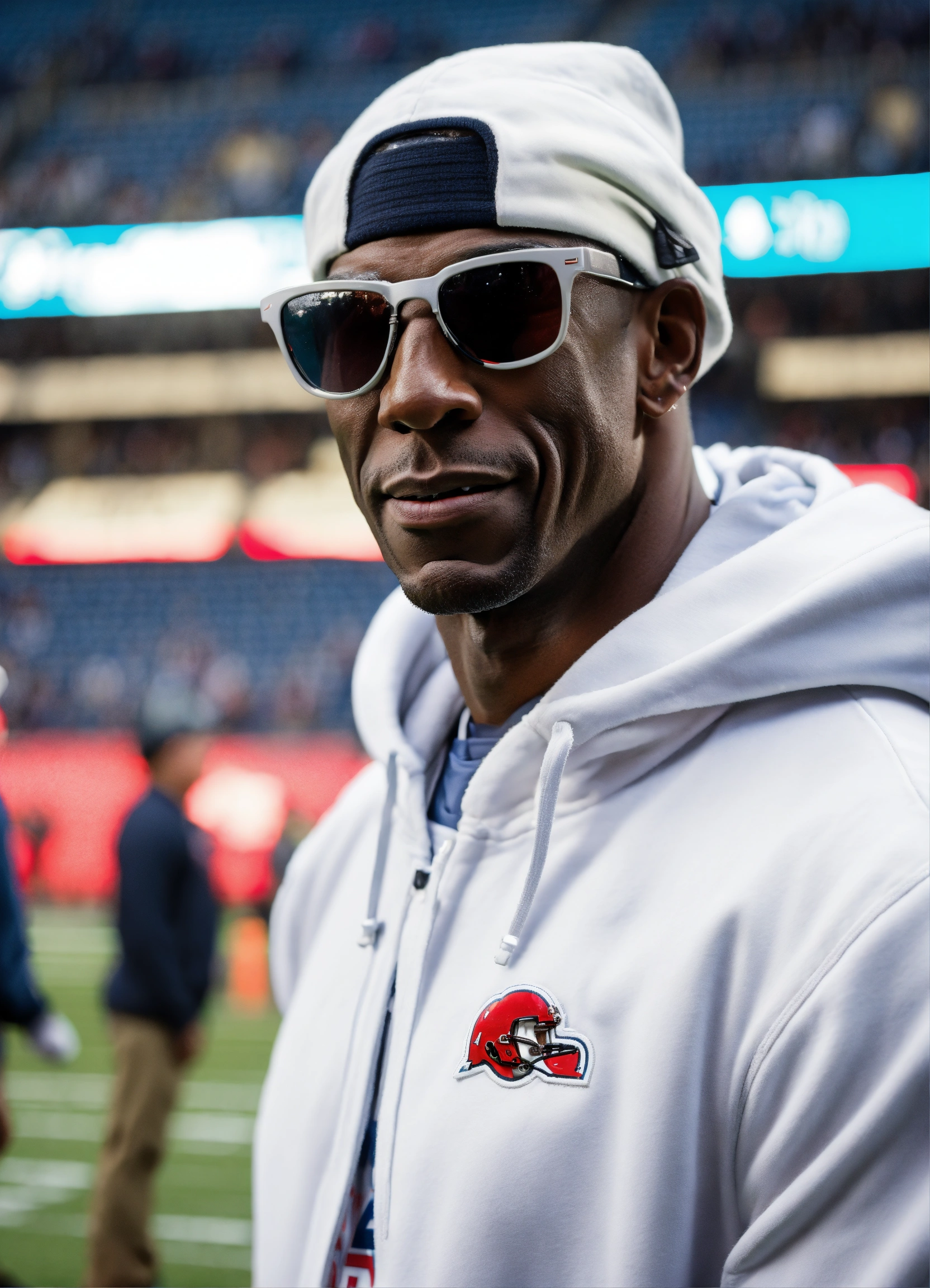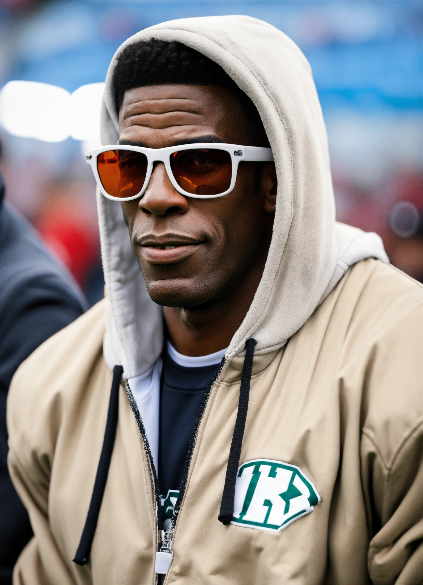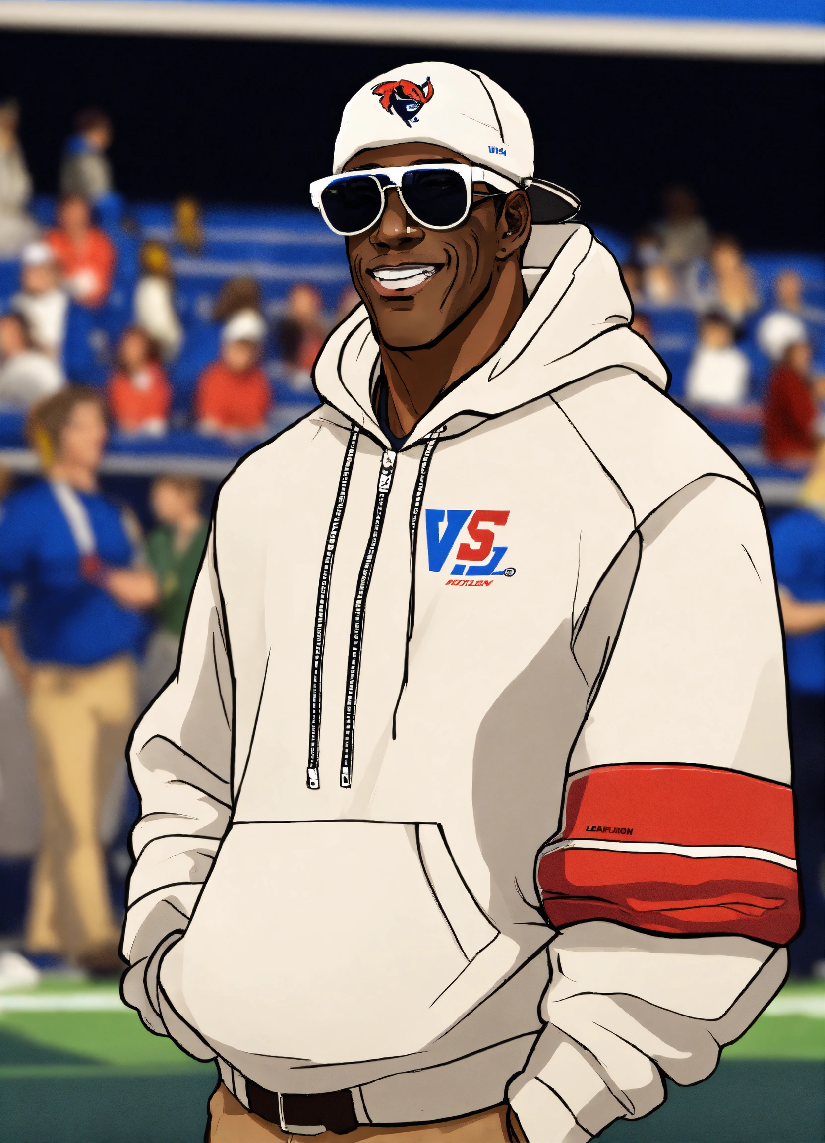 Handsome cartooned deion sanders in a white hoodie and sunglasses, on the sideline at a college football game--v 5.0