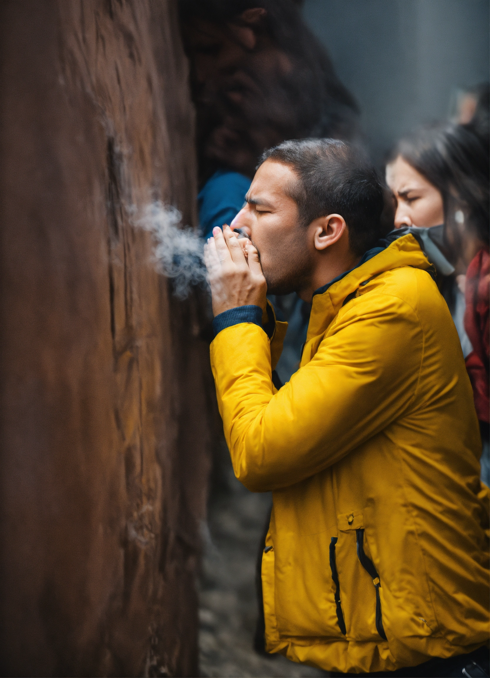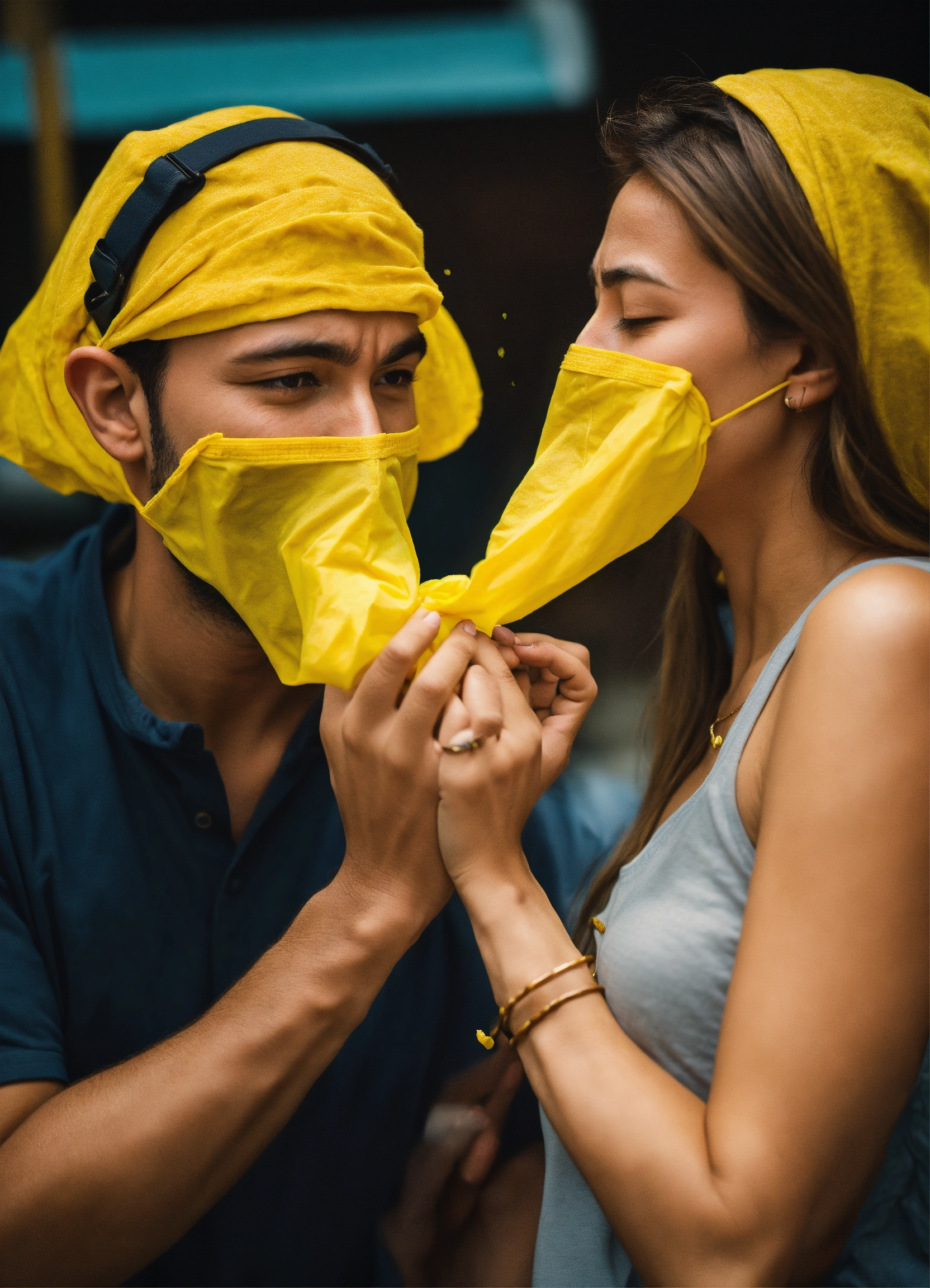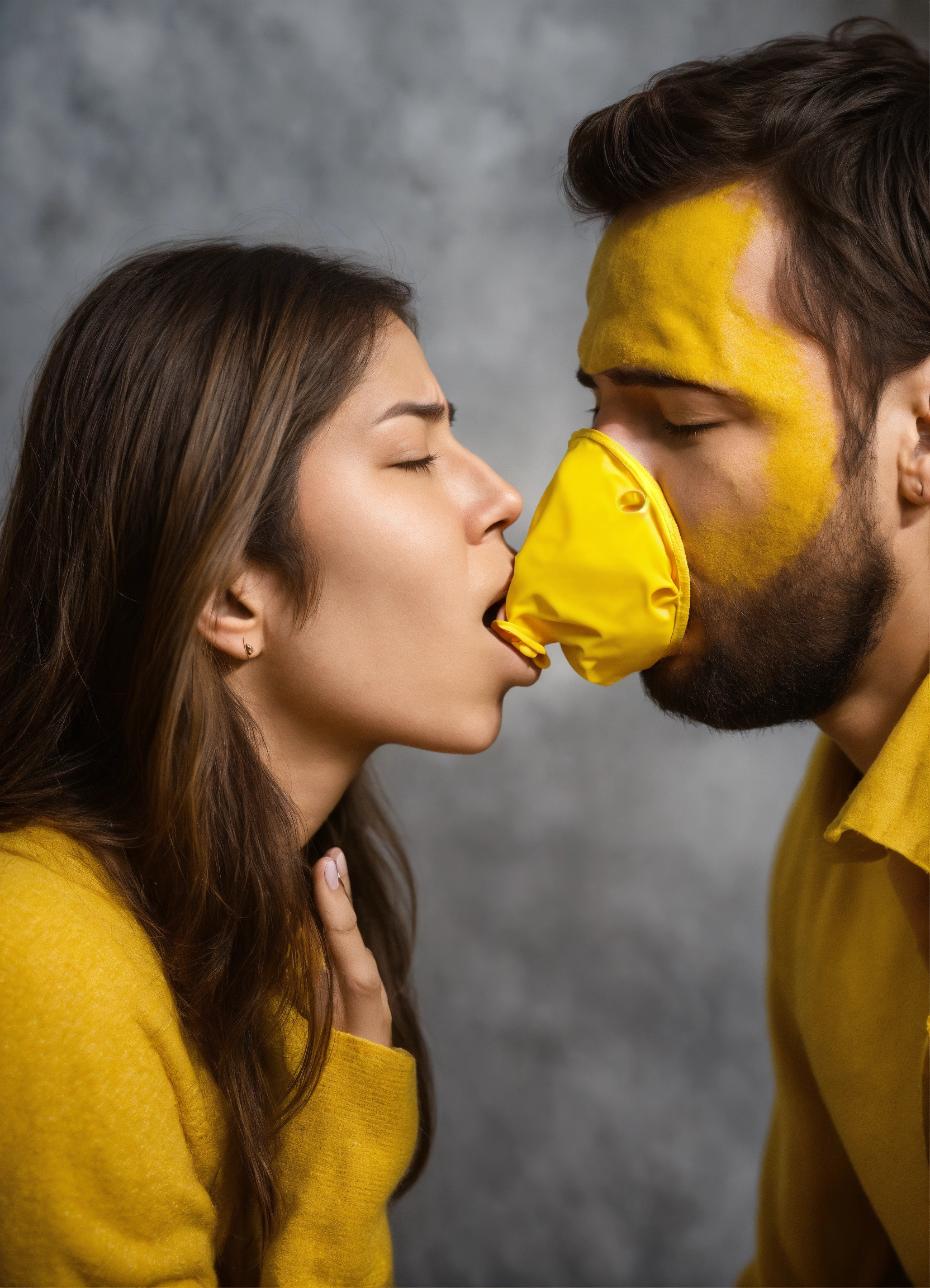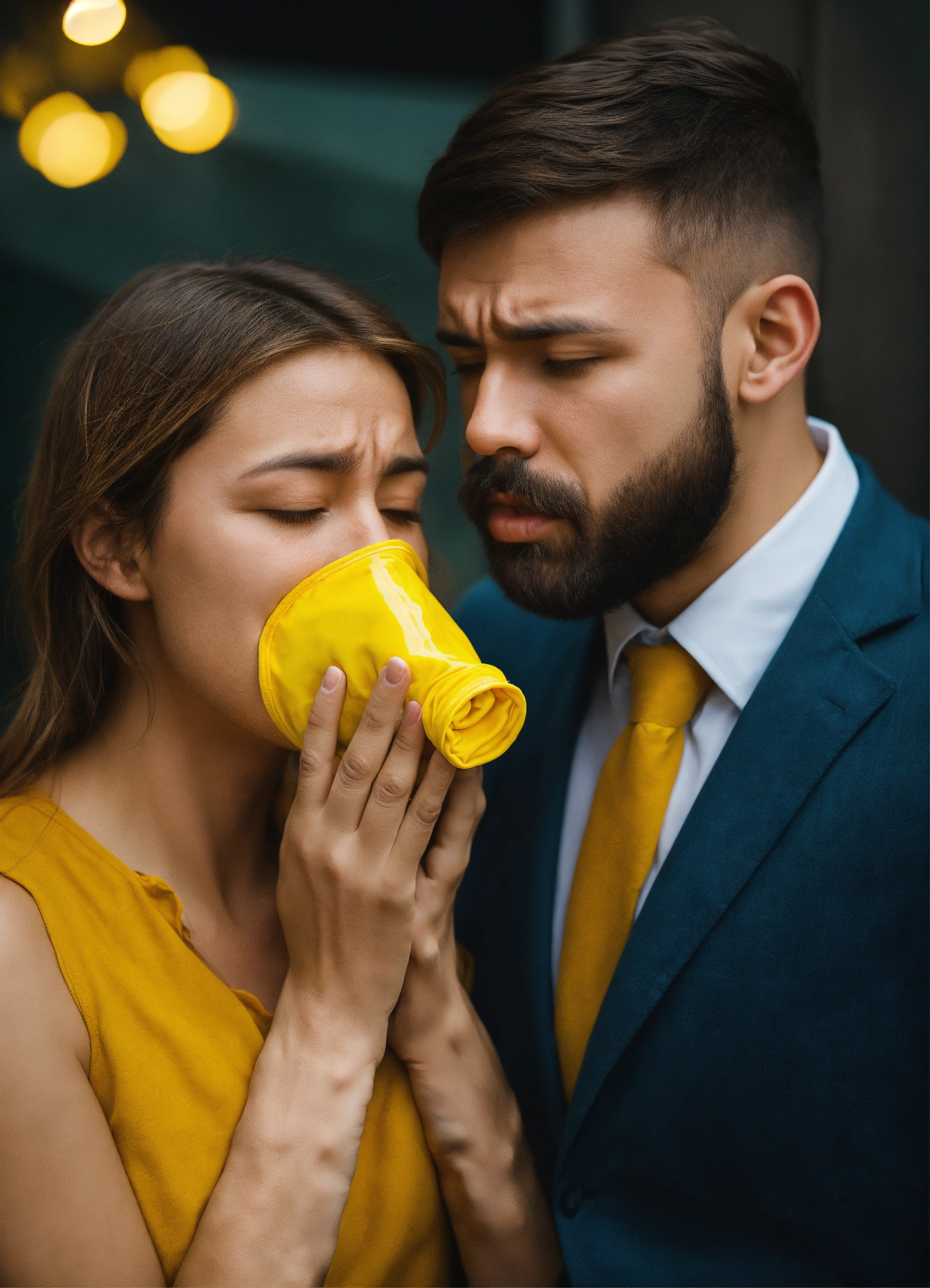 Realistic photo of a man breathing out yellow foul air from his mouth and a woman covering her nose with her hands against the foul odor and looking questioningly