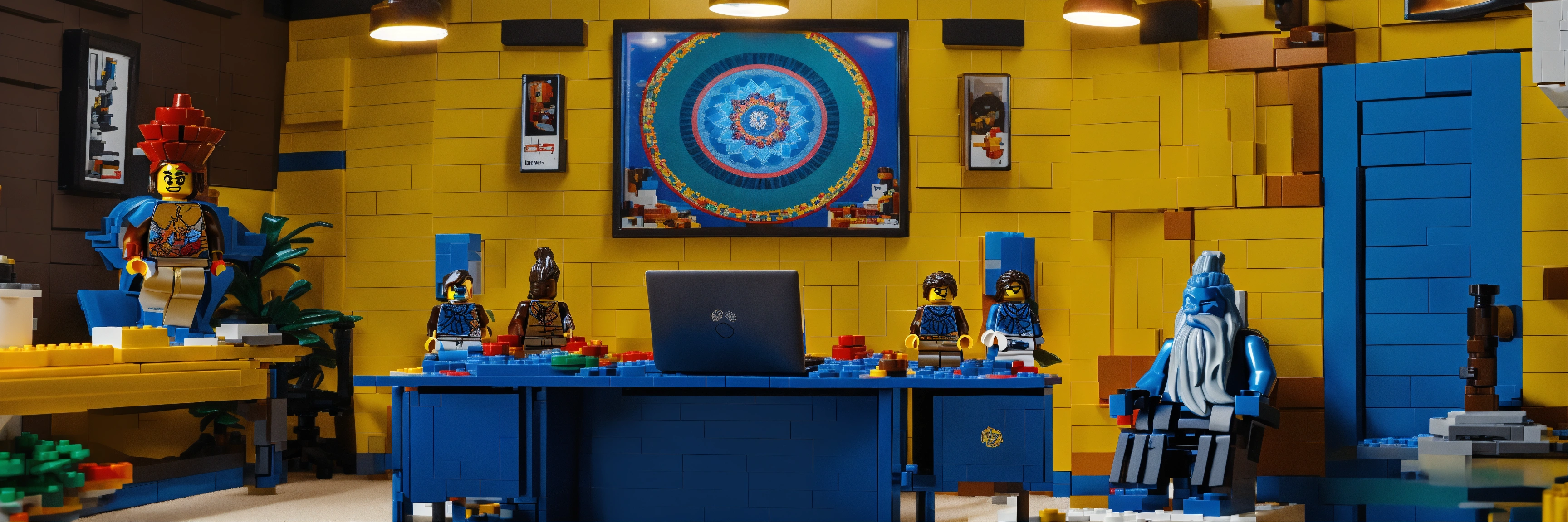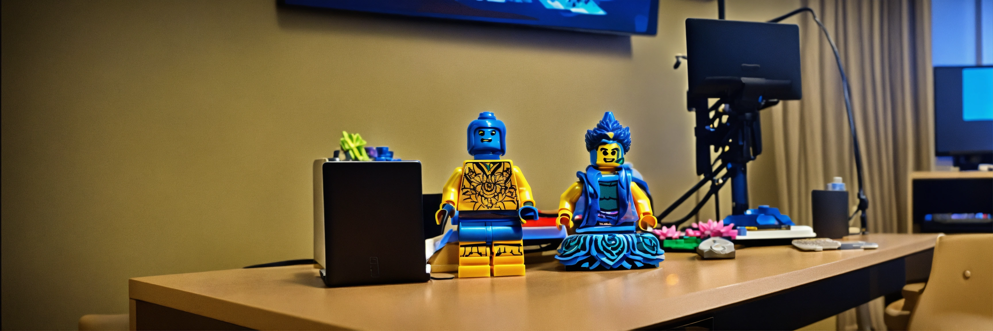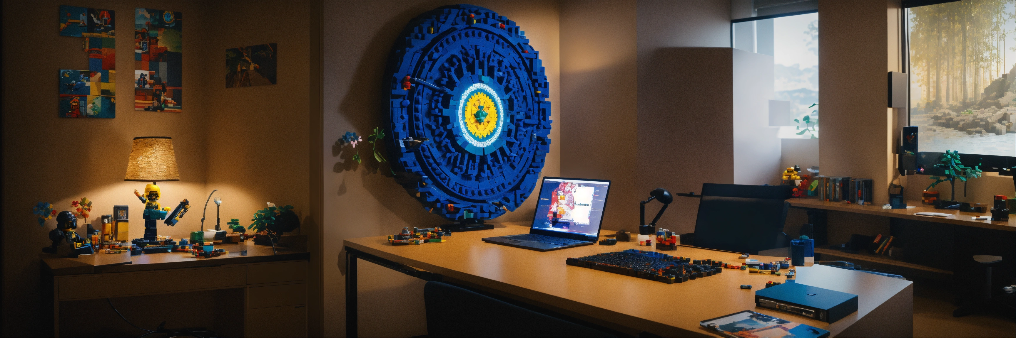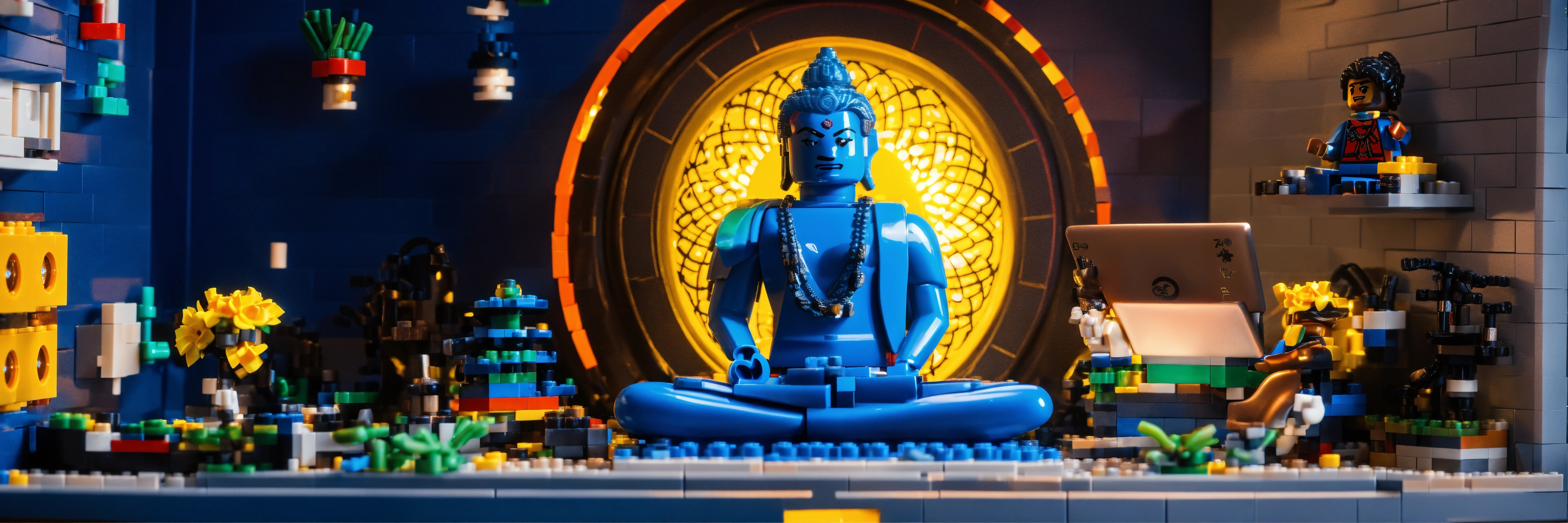 (a lego shiva statue on an office table. shiva is meditating in 'full-lotus' posture and he's dark blue. there's a laptop beside it. in the scene, there's a gamer-style chair. and a lego mandala on the wall.) is part of a wider scene where you can see the lego mandala on the wall. - now, zoom a little out, because this is for notion page cover.