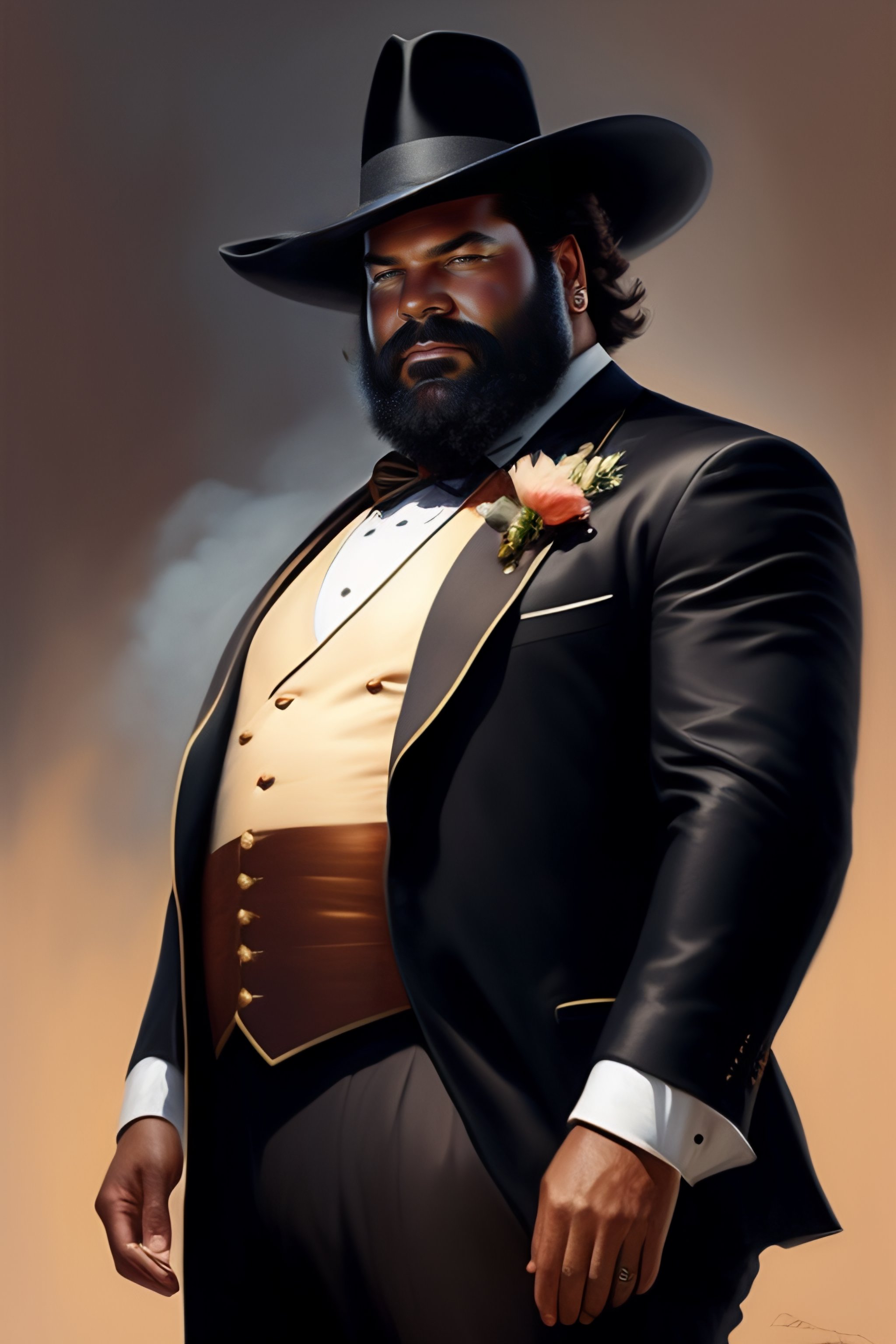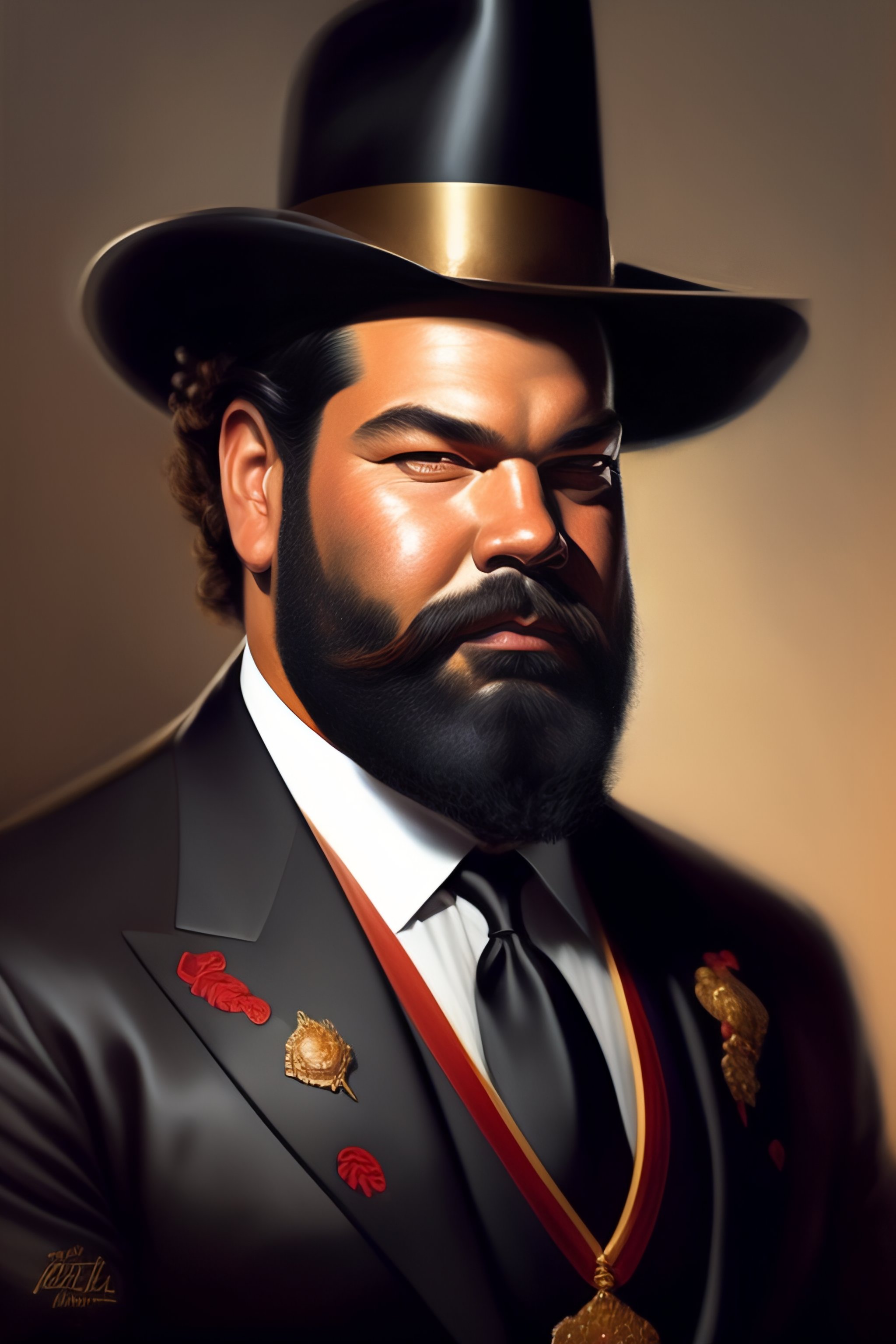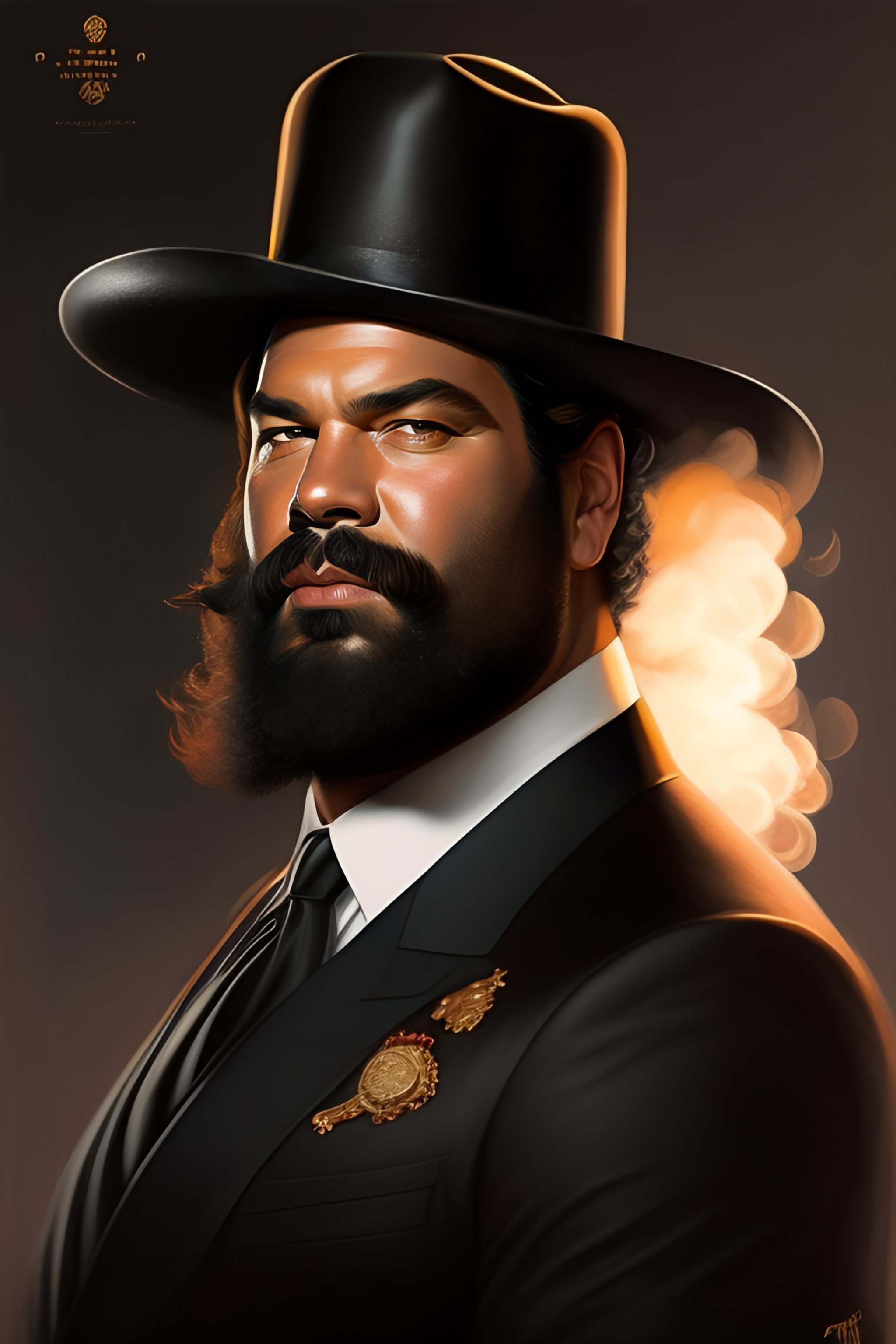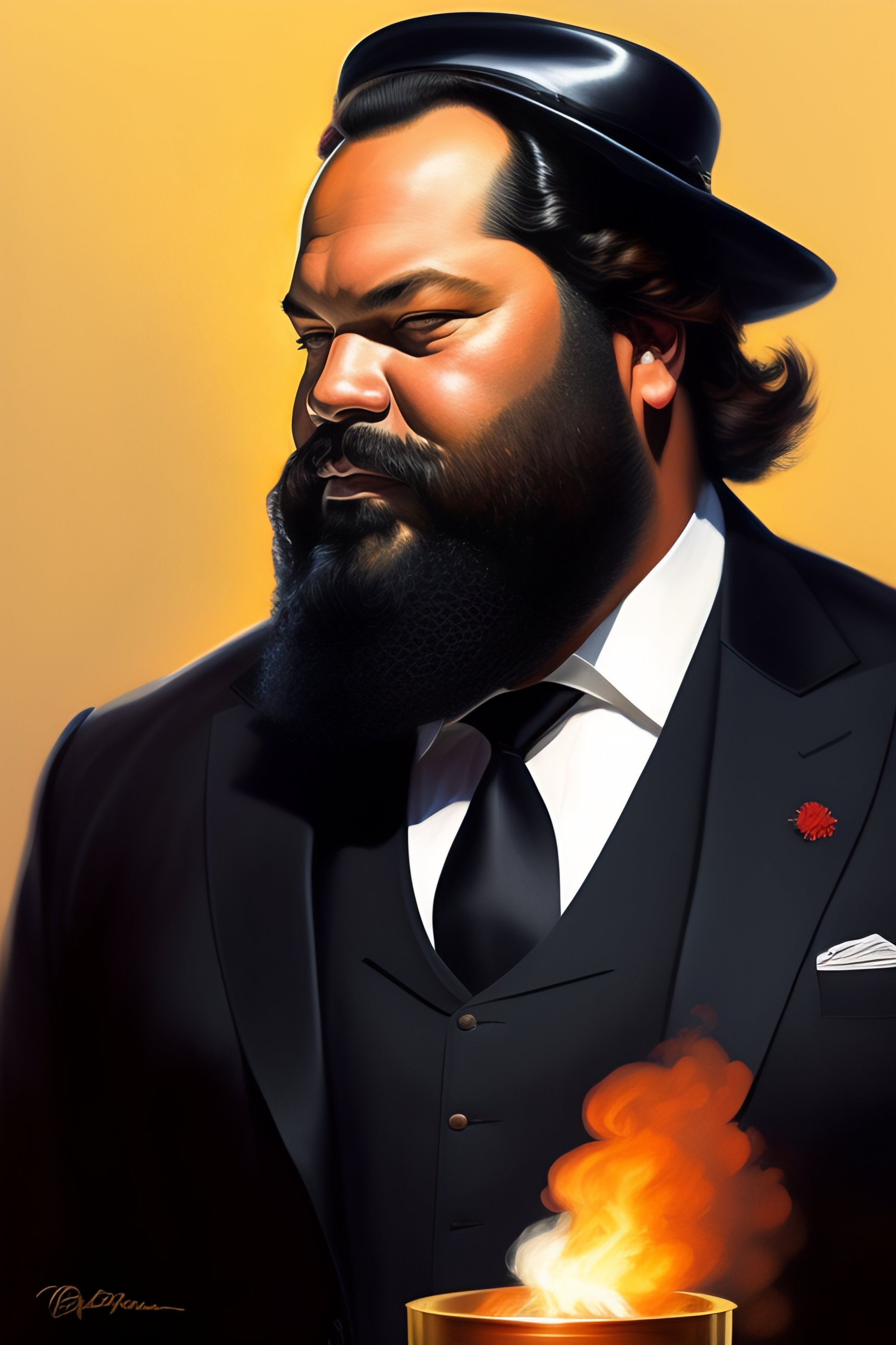 Retrato de bud spencer gordo con traje negro y sombrero, fumando, arte digital, con mucho detalle, dibujada por greg rutkowski