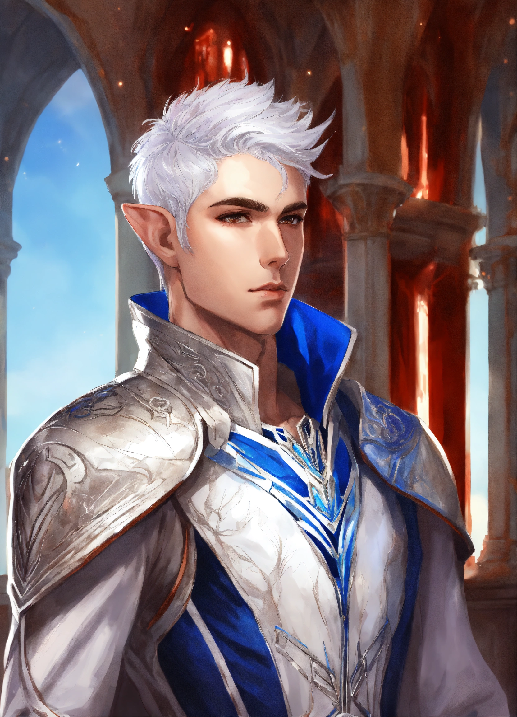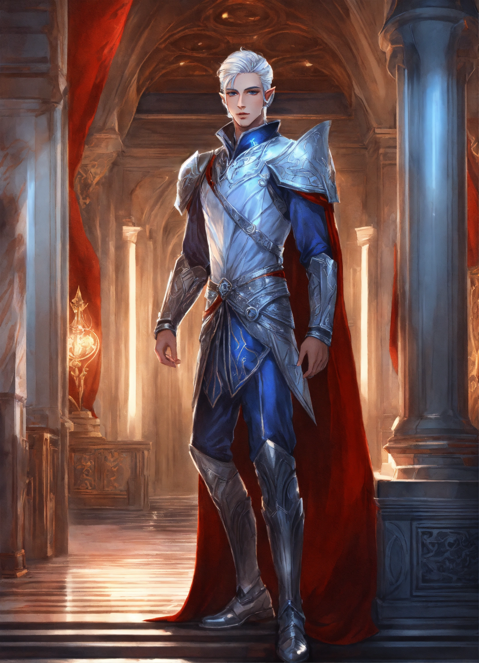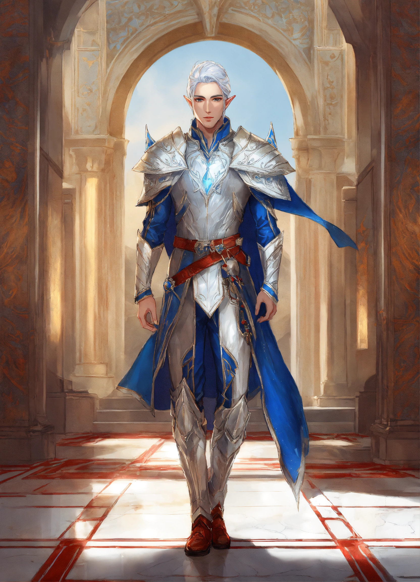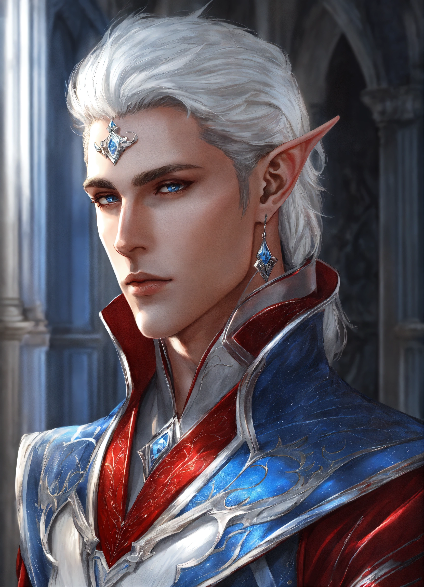 Drawing of an elf, royalty, sci fi, cybernetic, white and red and blue royal sci fi outfit, silver hair, standing in an elegant marble elven palace, handsome, male high elf, 24 years old, elf ear