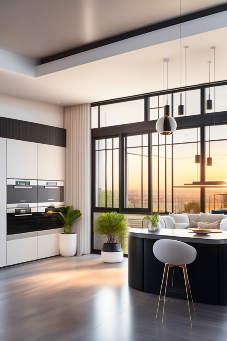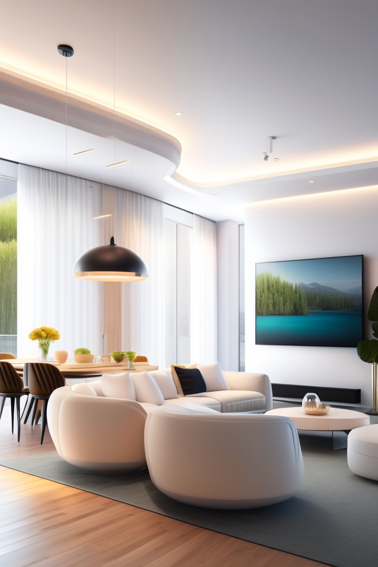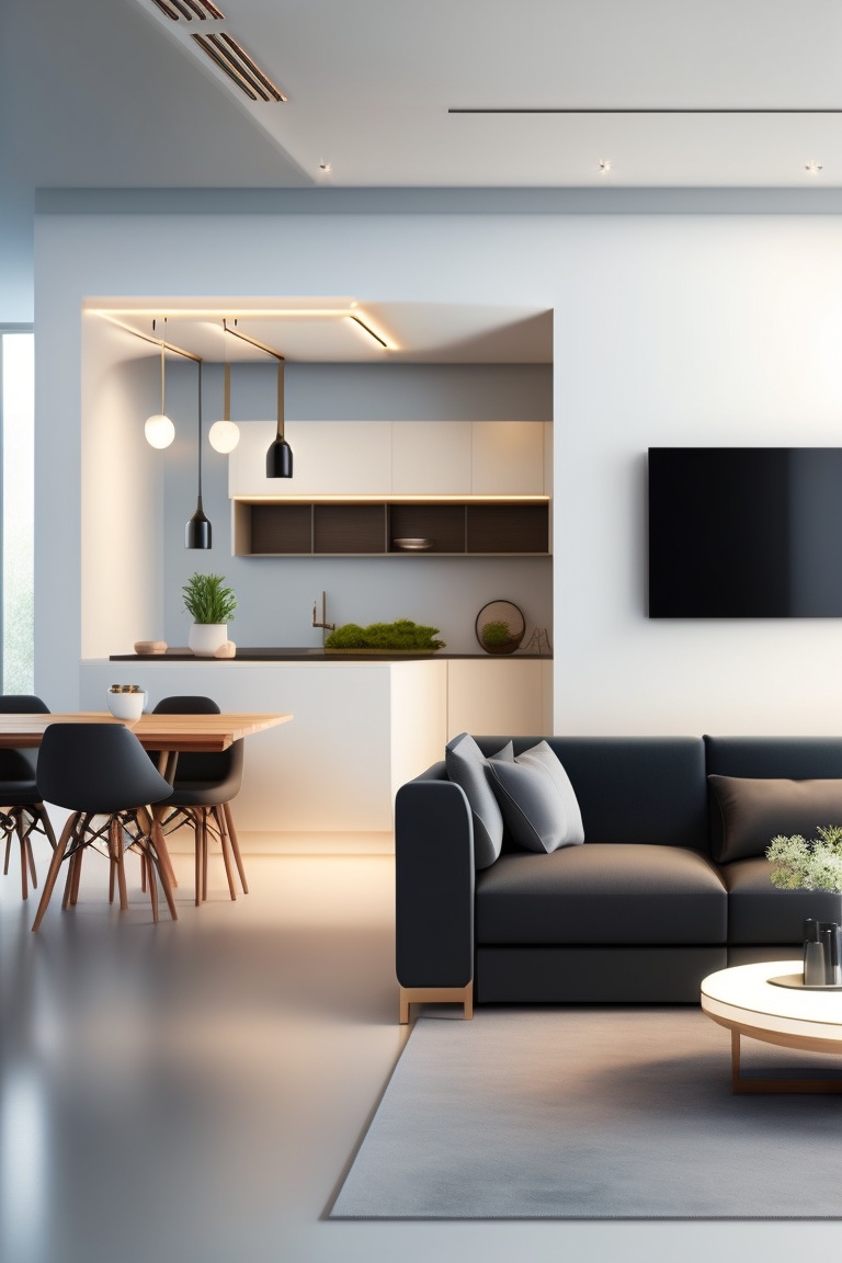 A normal, whitewashed and clean apartment, modernly designed, with a luxurious living room seating system and an adjoining kitchen with a small island and black bar stools, modern and advanced lighting