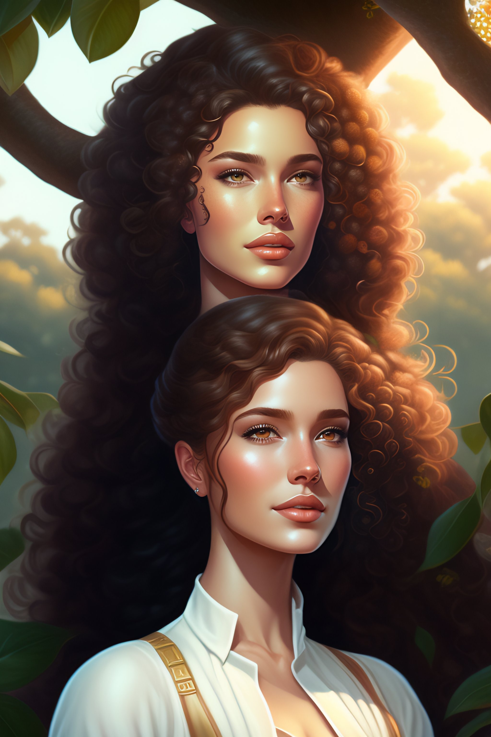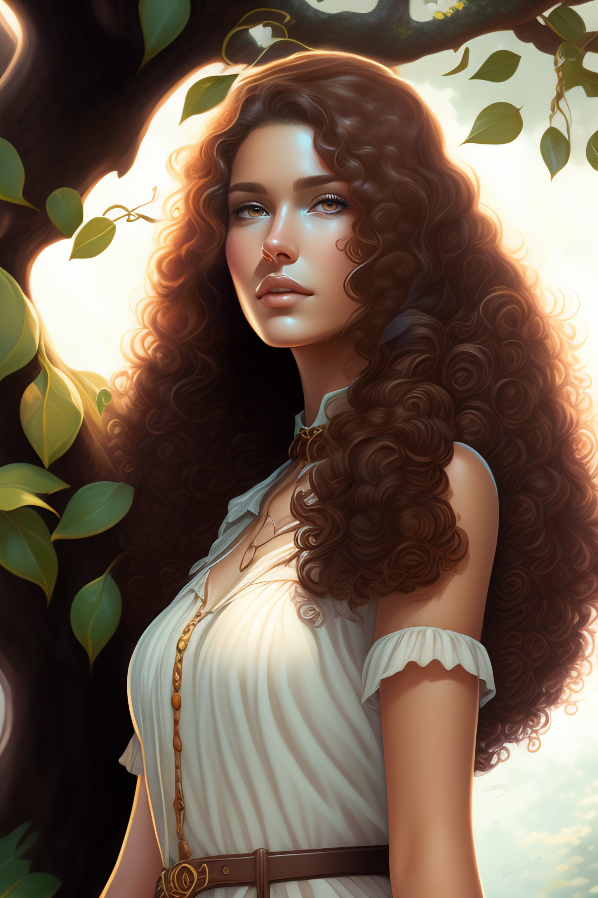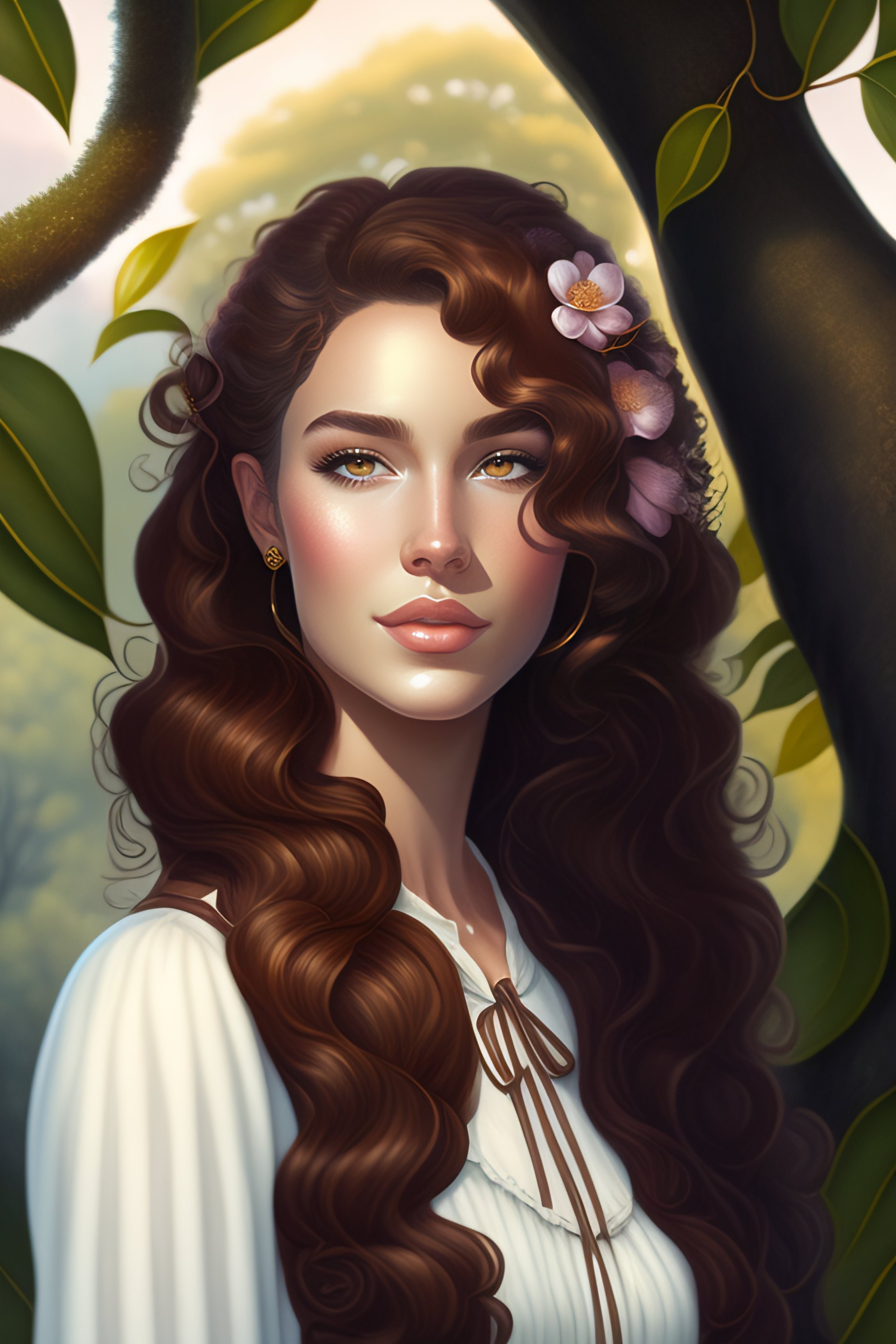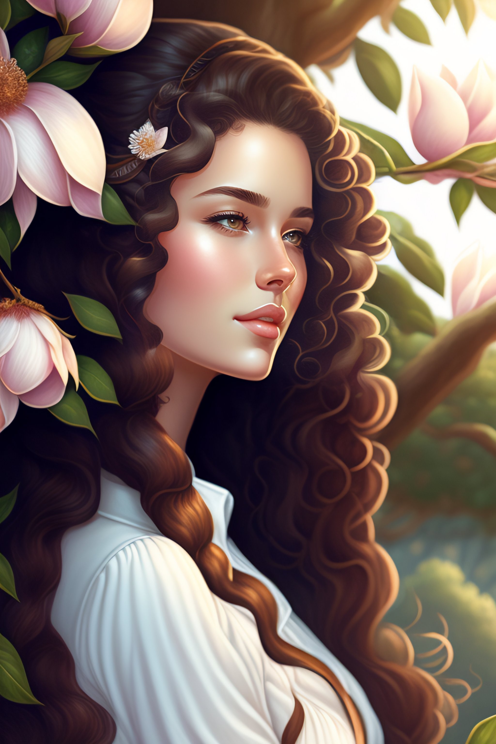Curly-haired girl with brown hair stands near a magnolia tree, full height, dnd, high fantasy digital illustration, by jenny frison and sana takeda, intricate details, stunning inking lines, flat colors, 4 k, hd, artstation