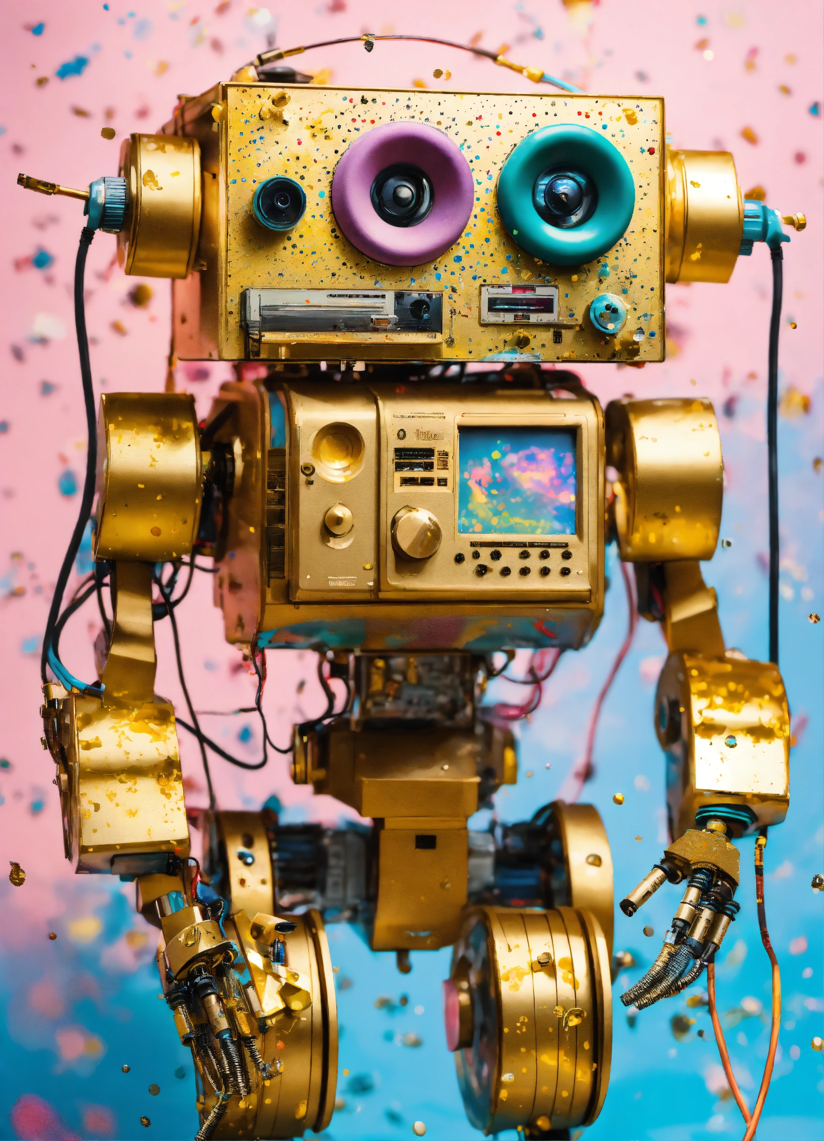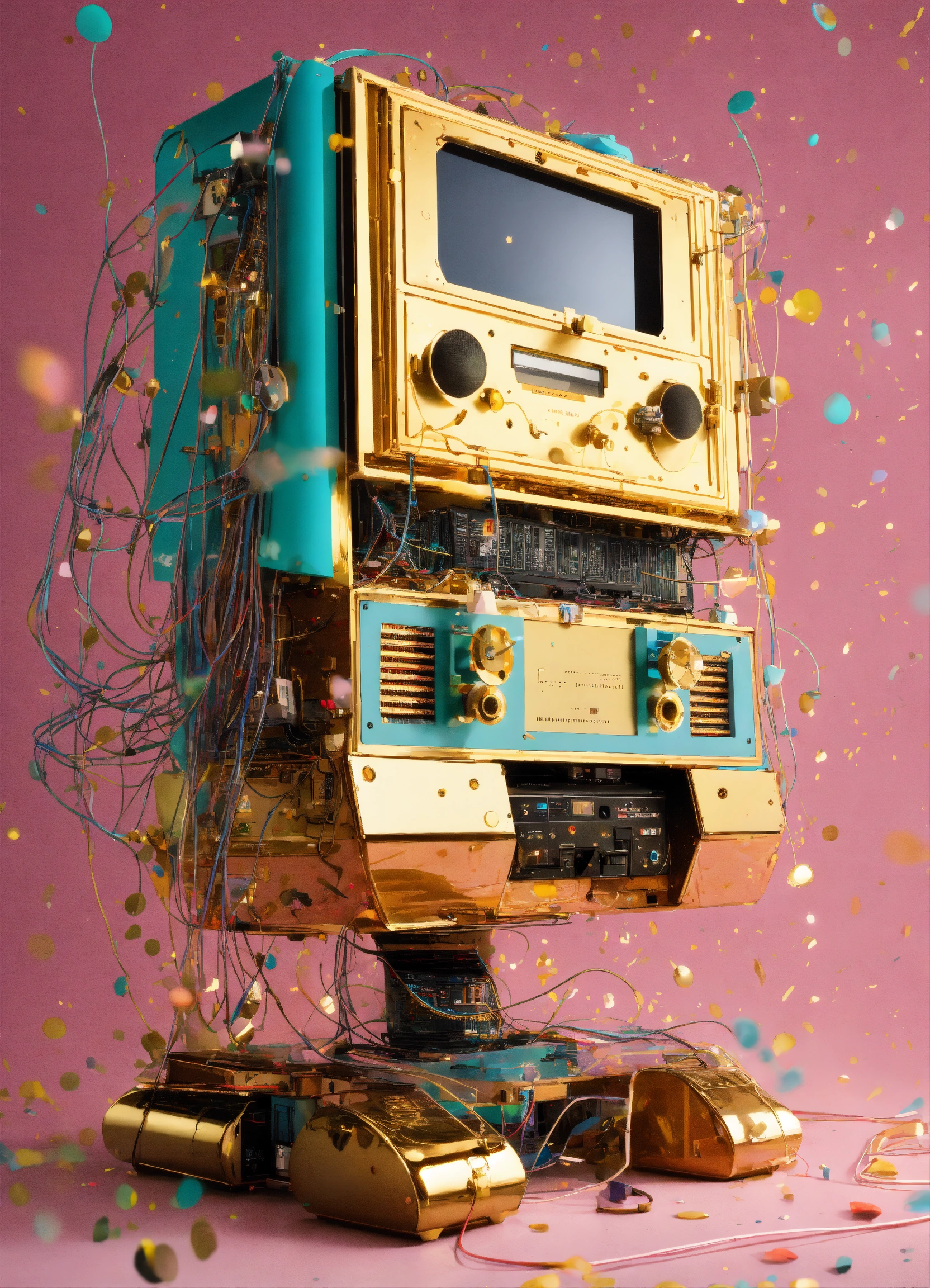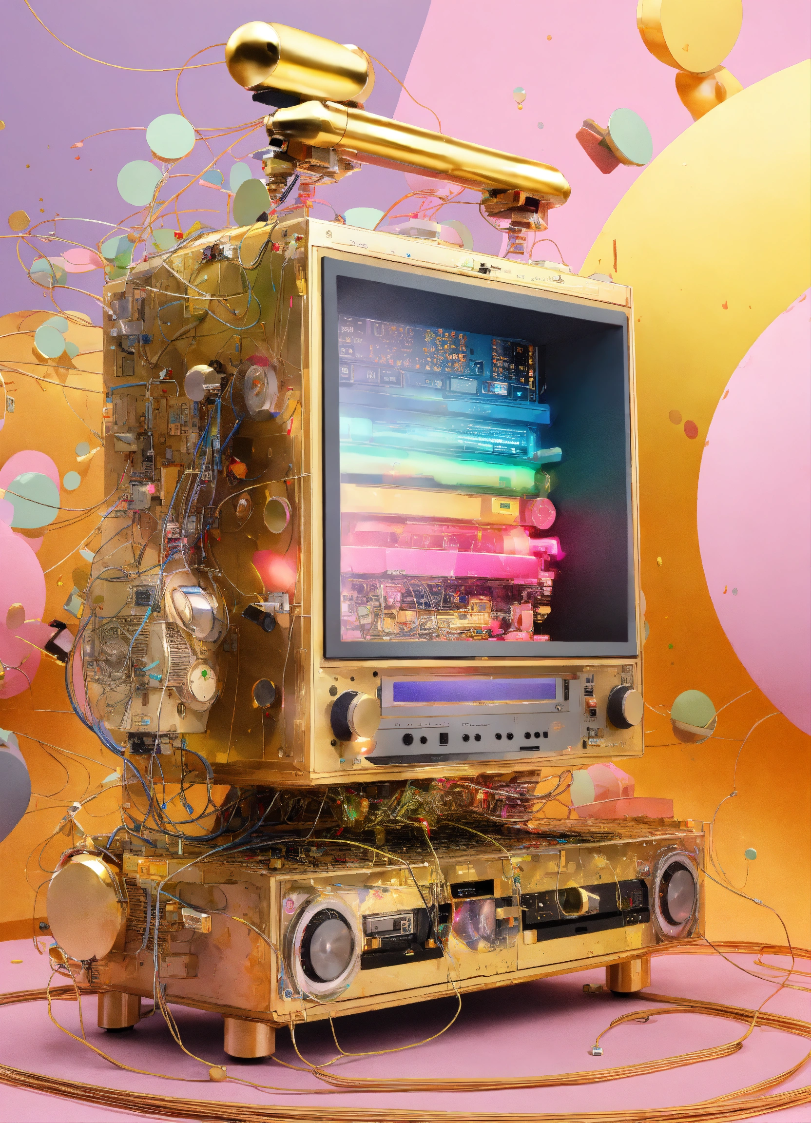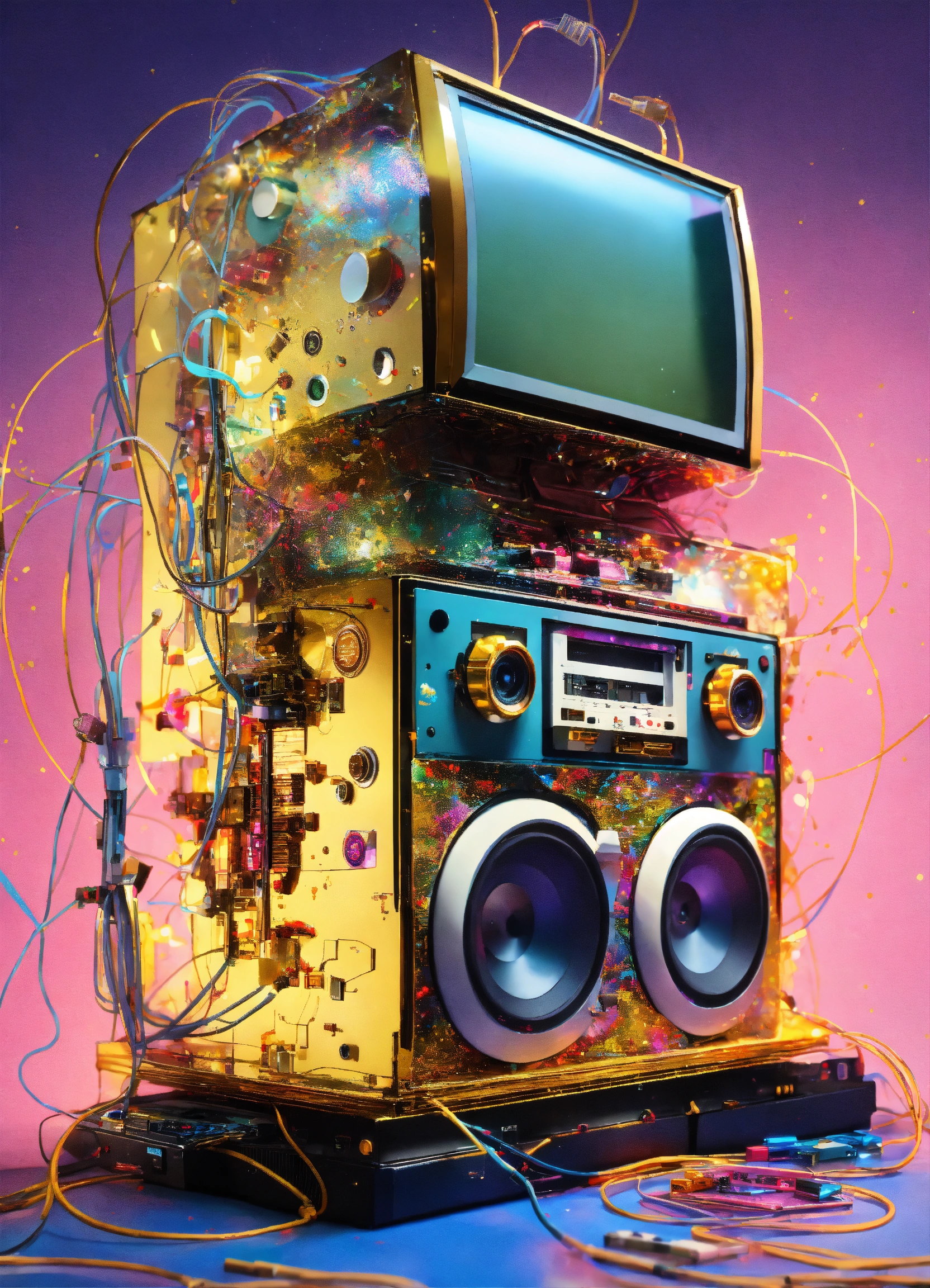 Pastel colors low-angle view shot photography of a robot body emerged from spiral gold ink dots splatters, flying huge 3d plexiglass multi cassette ghetto blaster, play station, screeen computer, full of cables and wires, with big boomers, 80 degree view