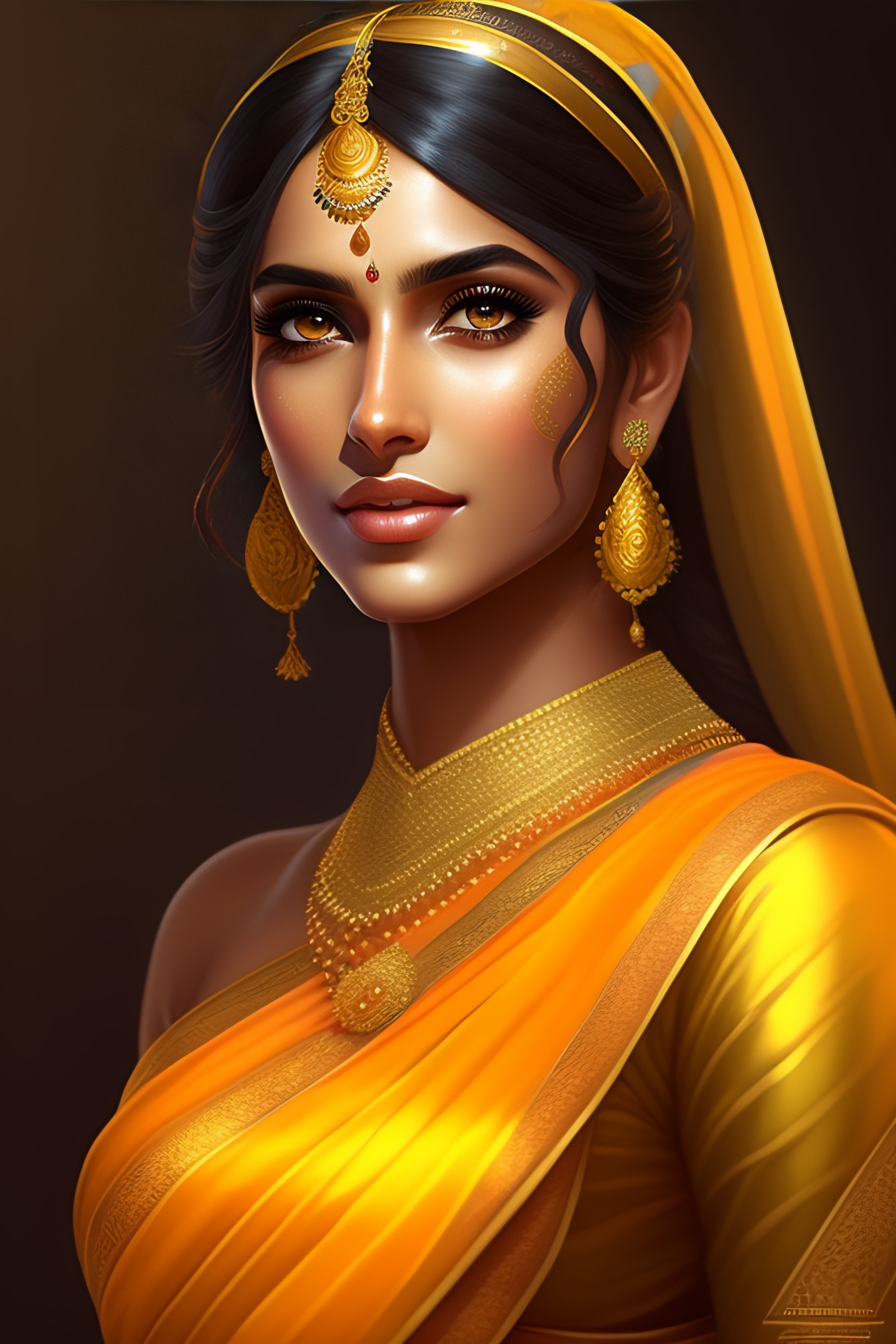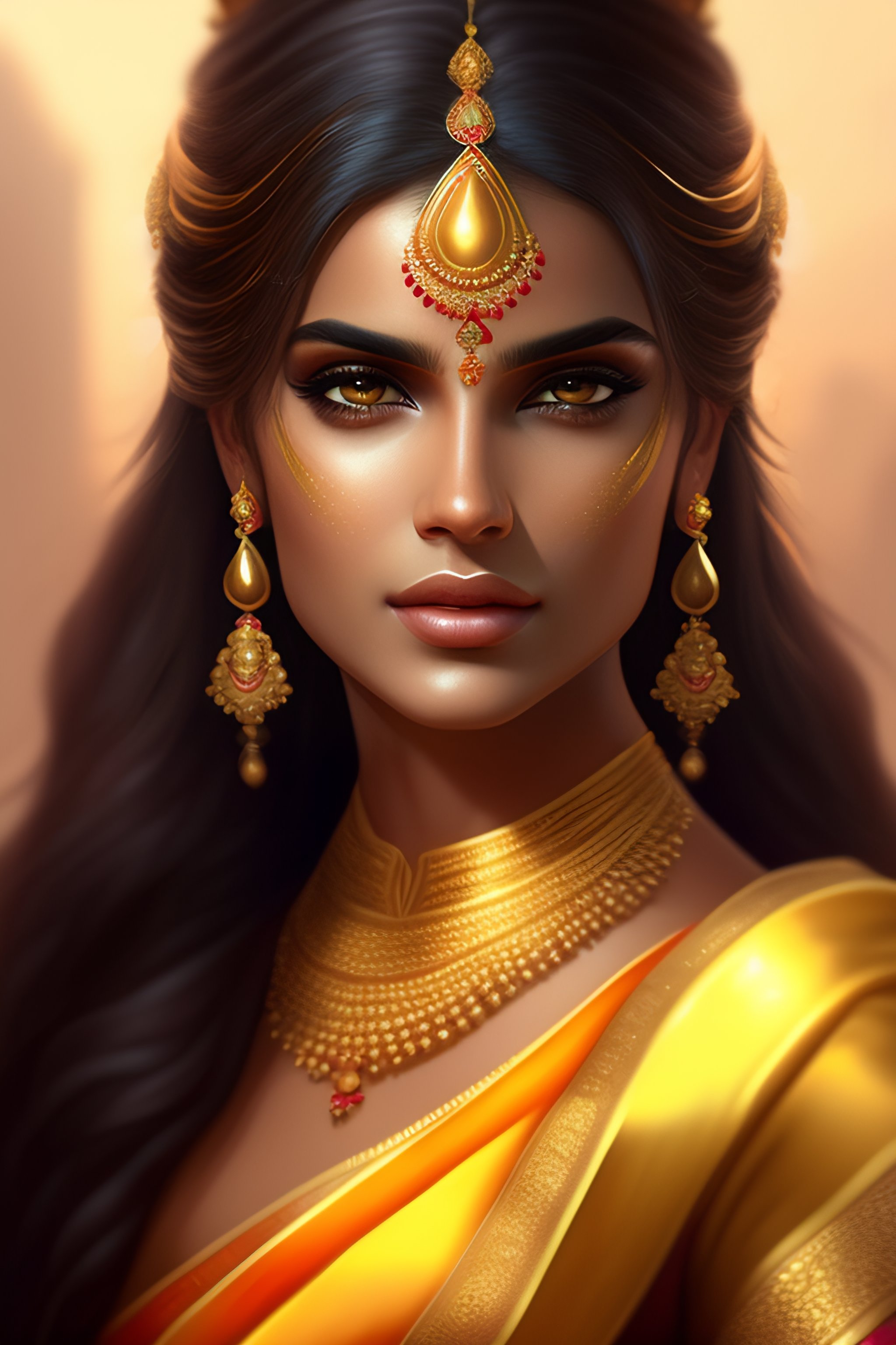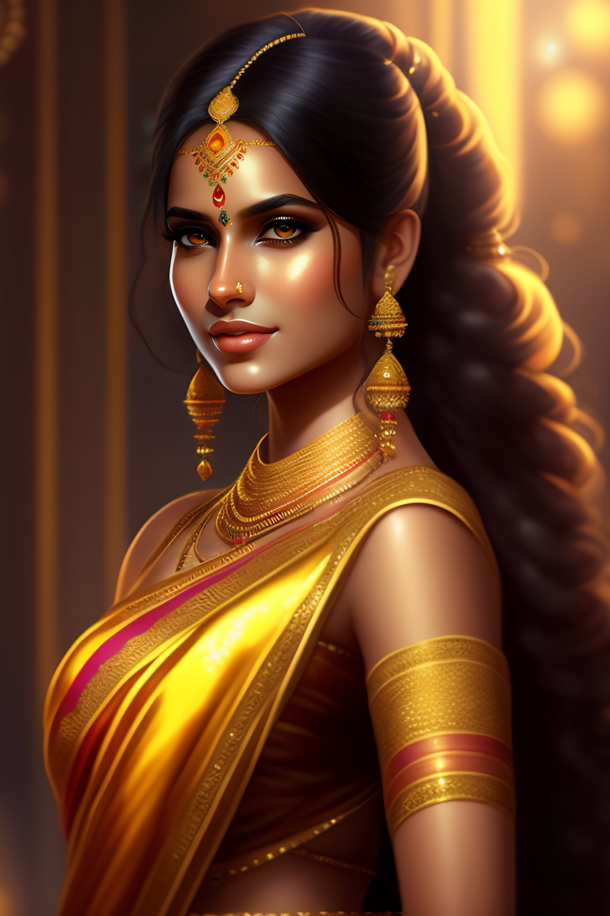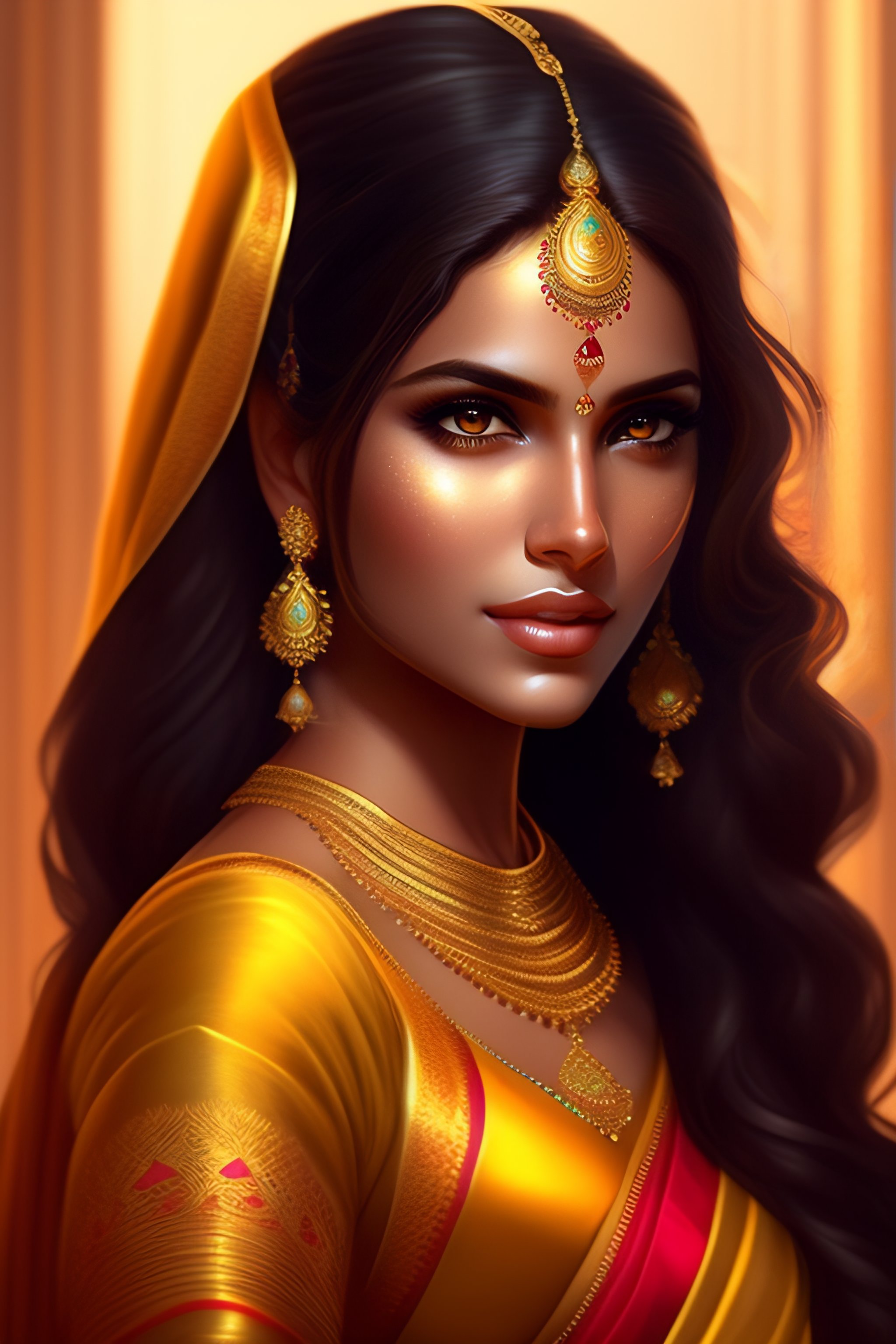 Beautiful adorable indian princess, youthful attractive, golden reflective saree dress, grace, flowing hair, symmetrical face portrait, artstation, cgsociety, character concept art, highly detailed ”