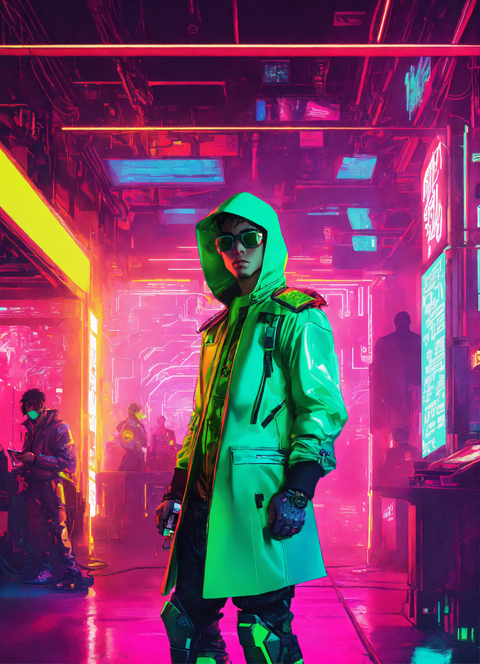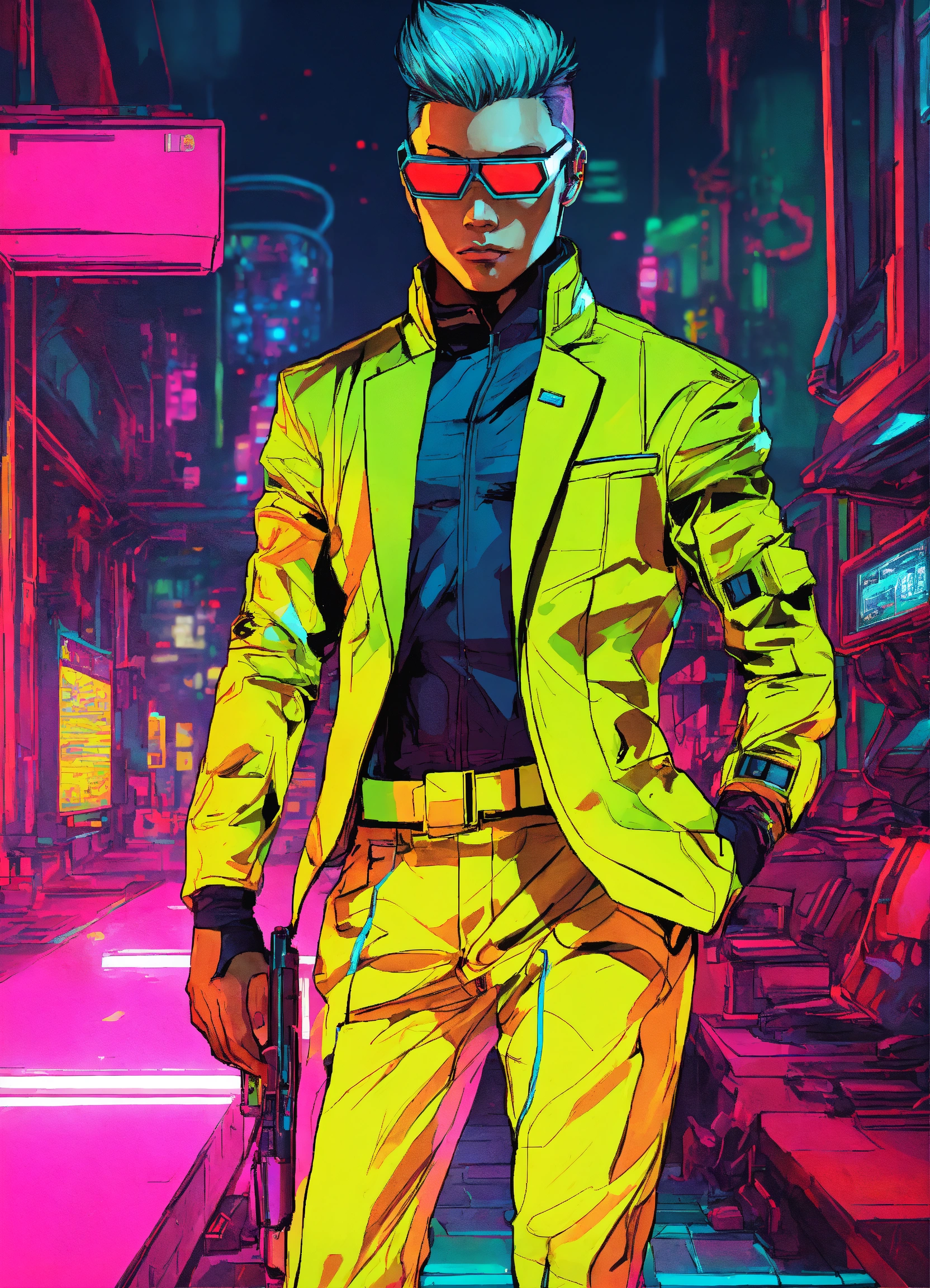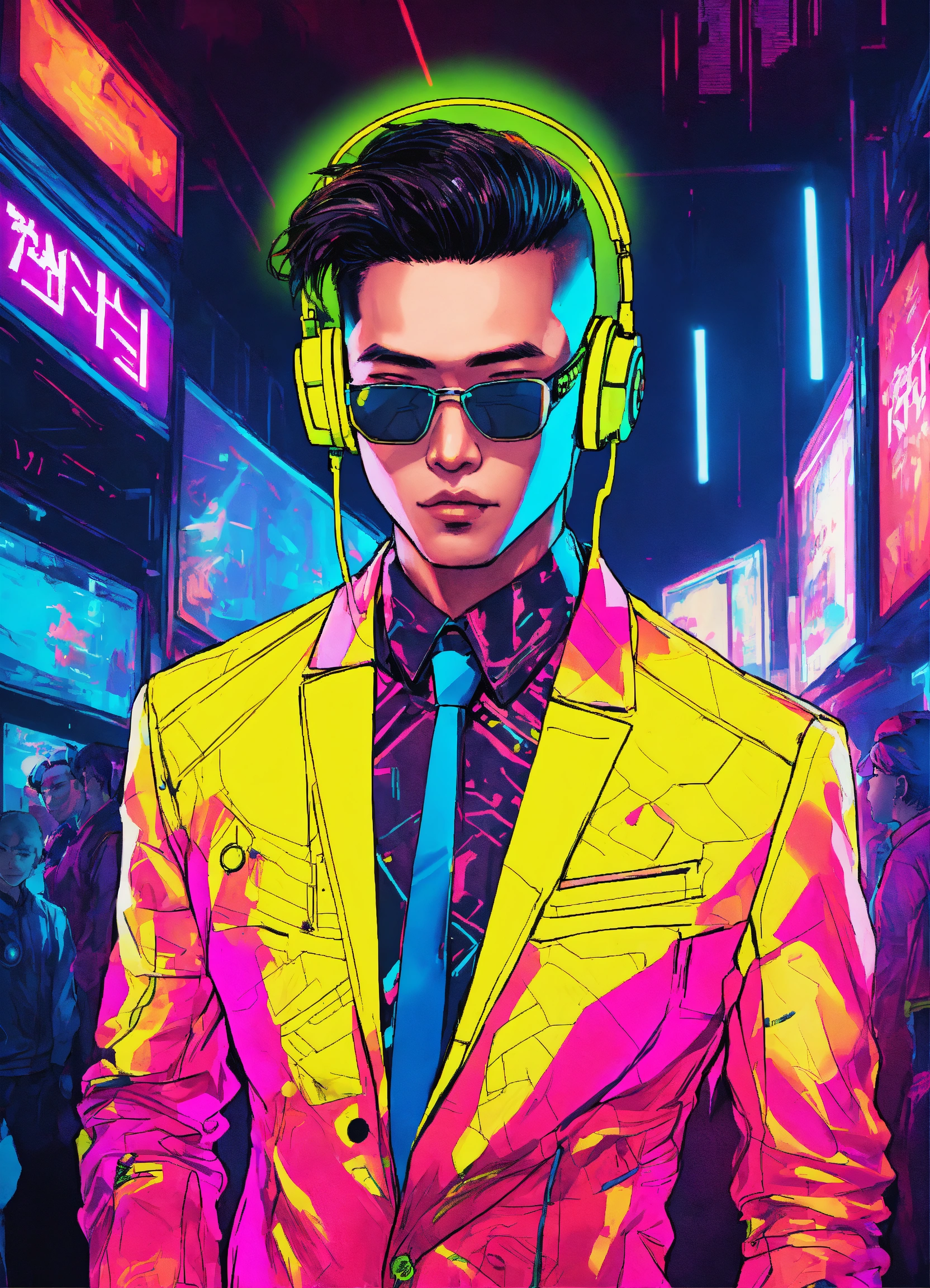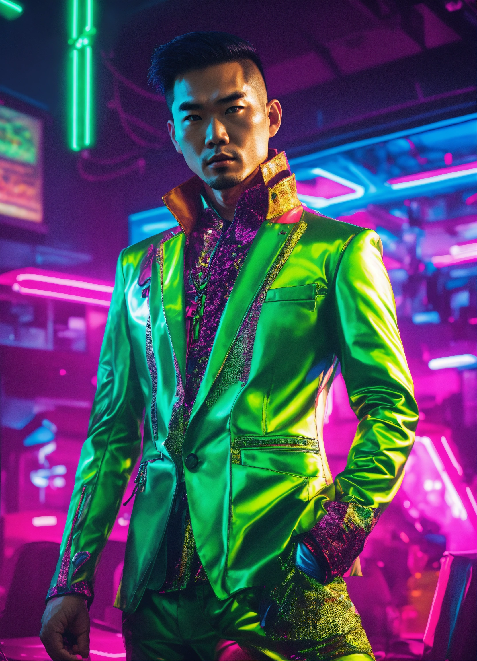 Cyberpunk gang asian man at a high tech club in neon fancy suit a comic book art style