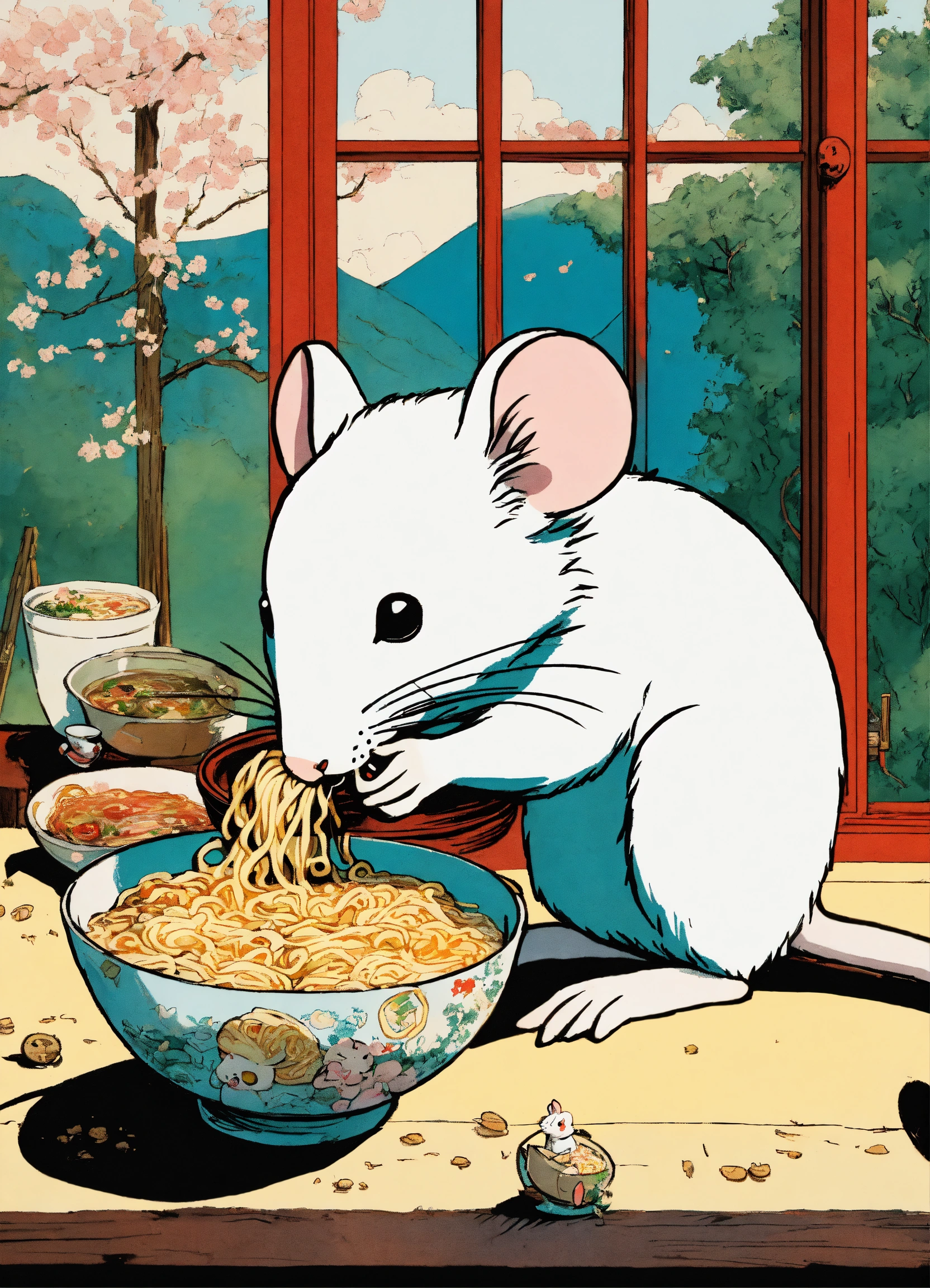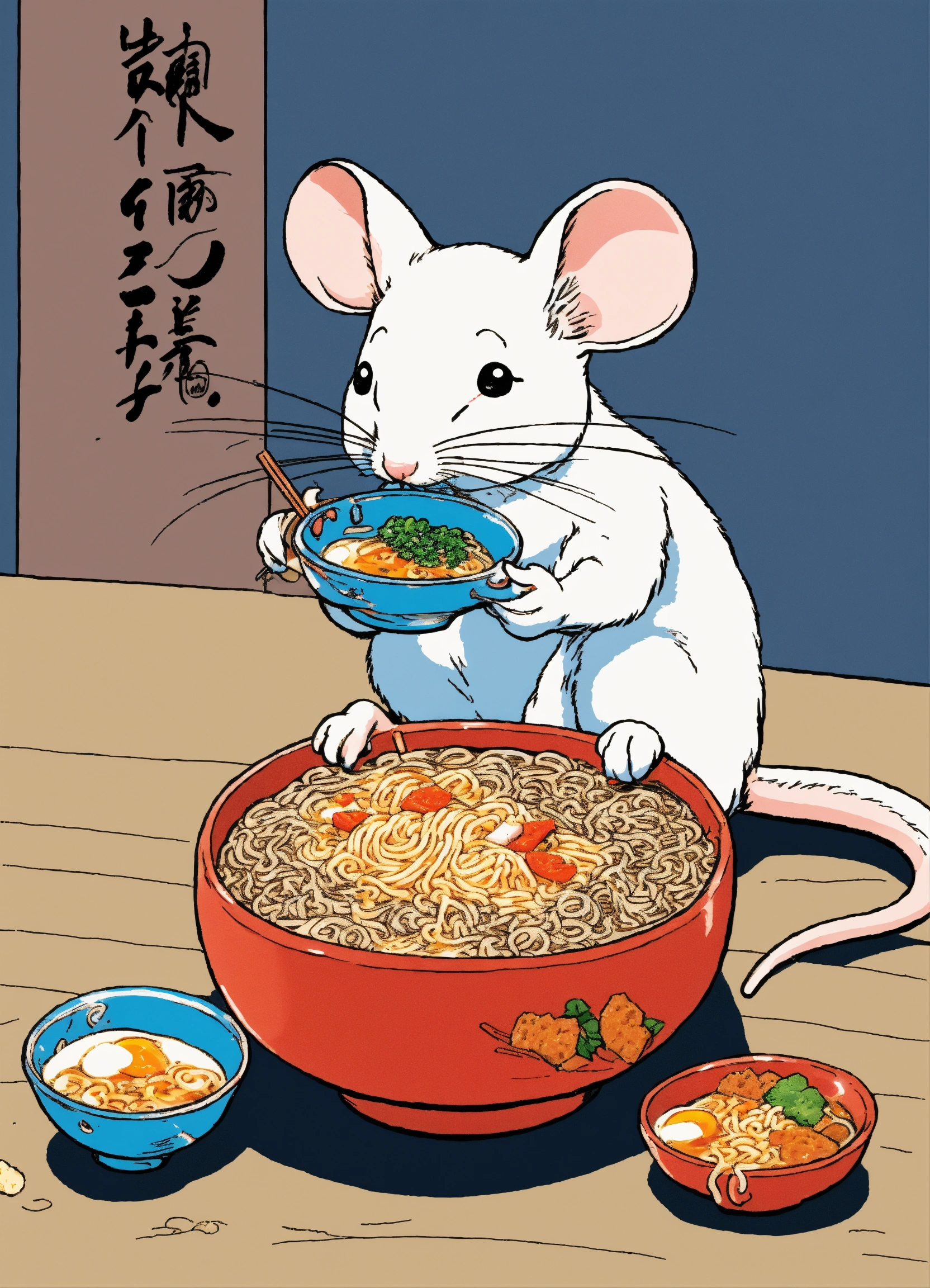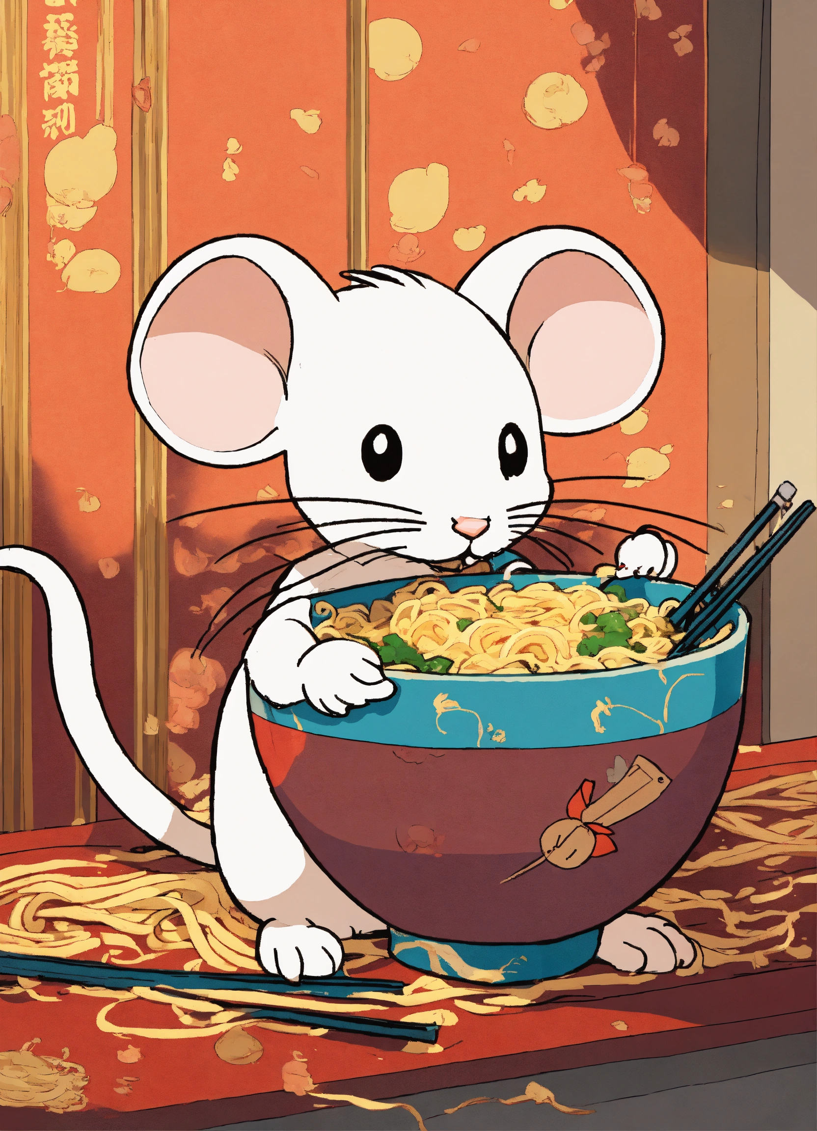 A cute white mouse eating a delicious bowl of ramen, illustration by hergé, stunning color scheme, masterpiece, manga style