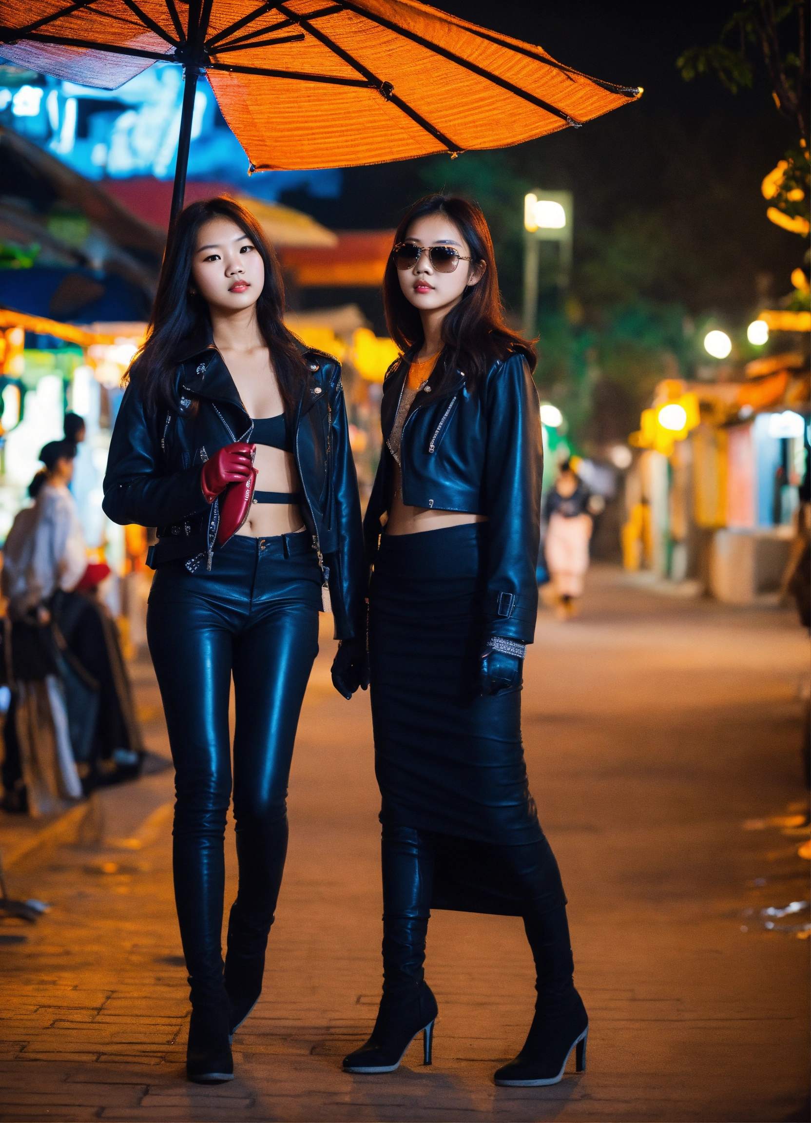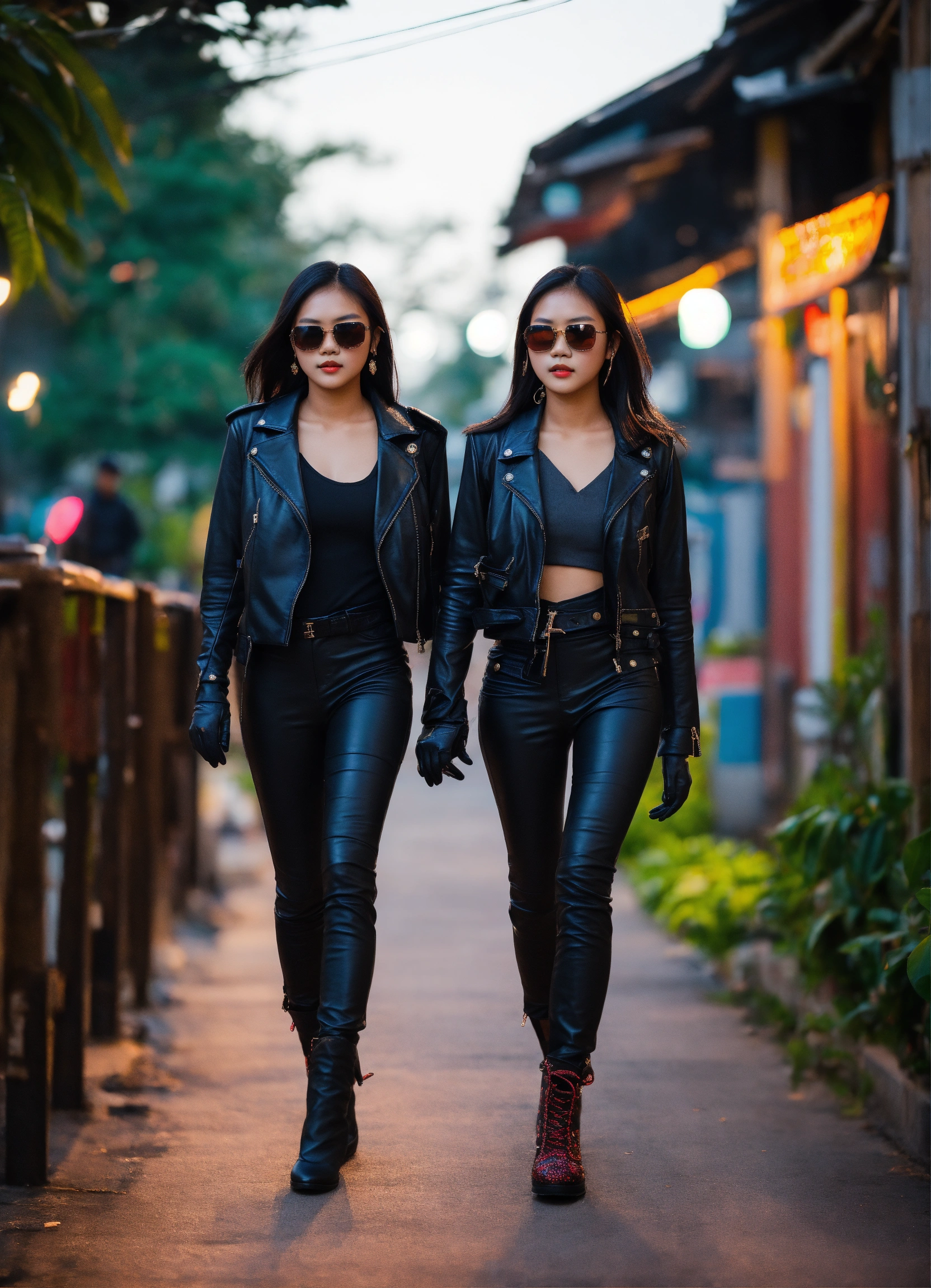 Two 20 year old thai girls wearing a black leather jacket and gloves and traditional dress, juwelry, urban enviroment full body walking at night sunglasses