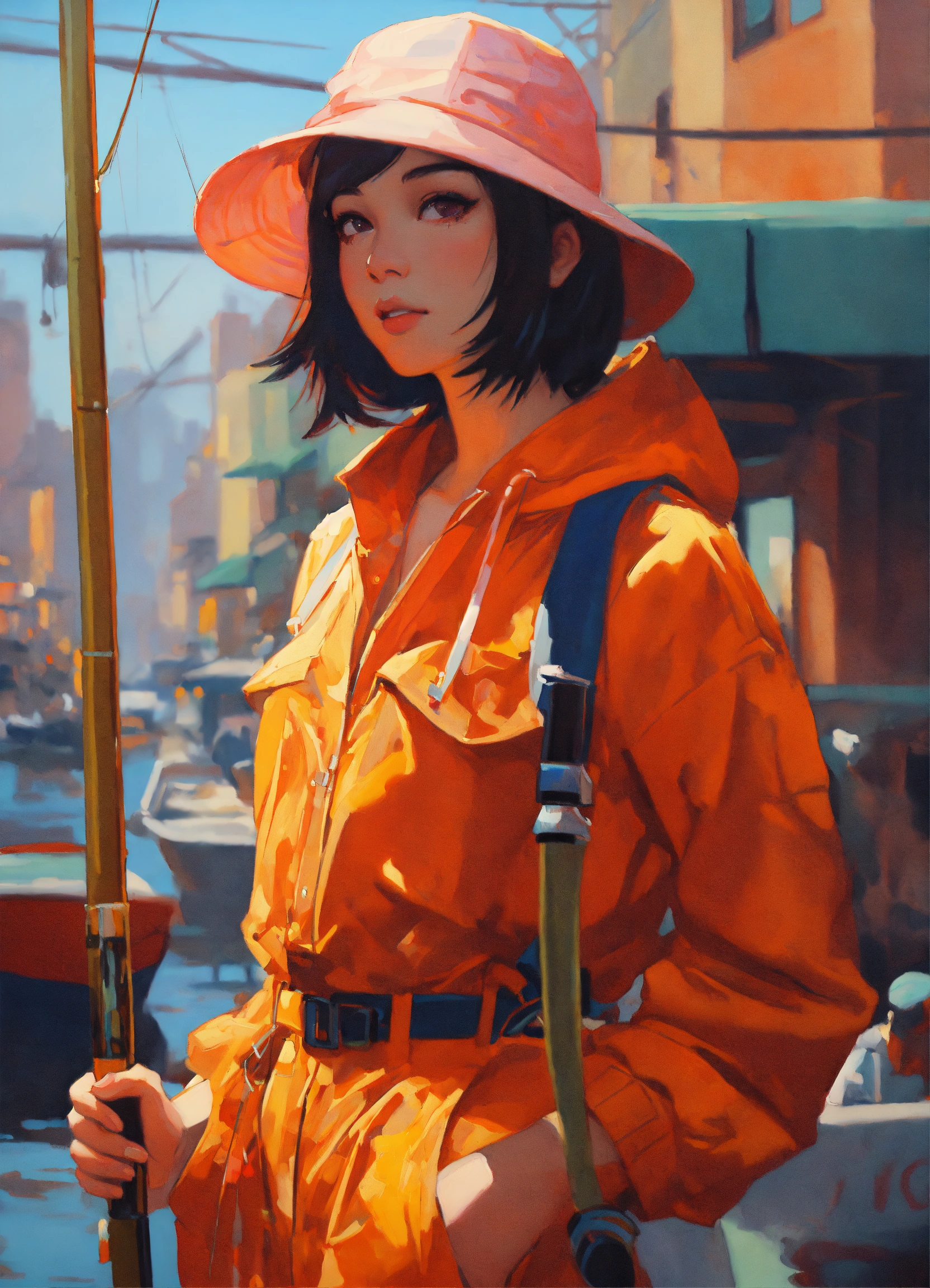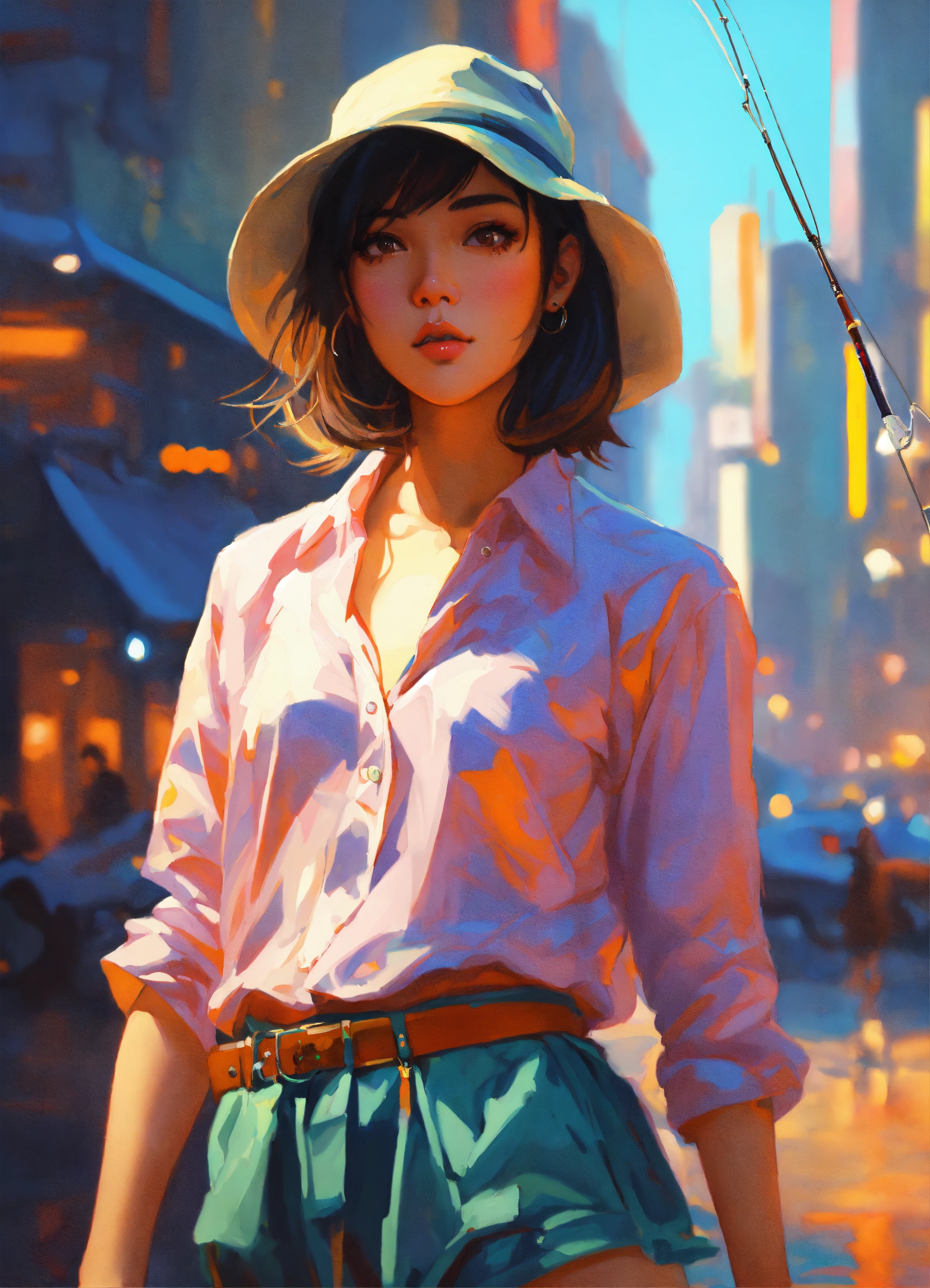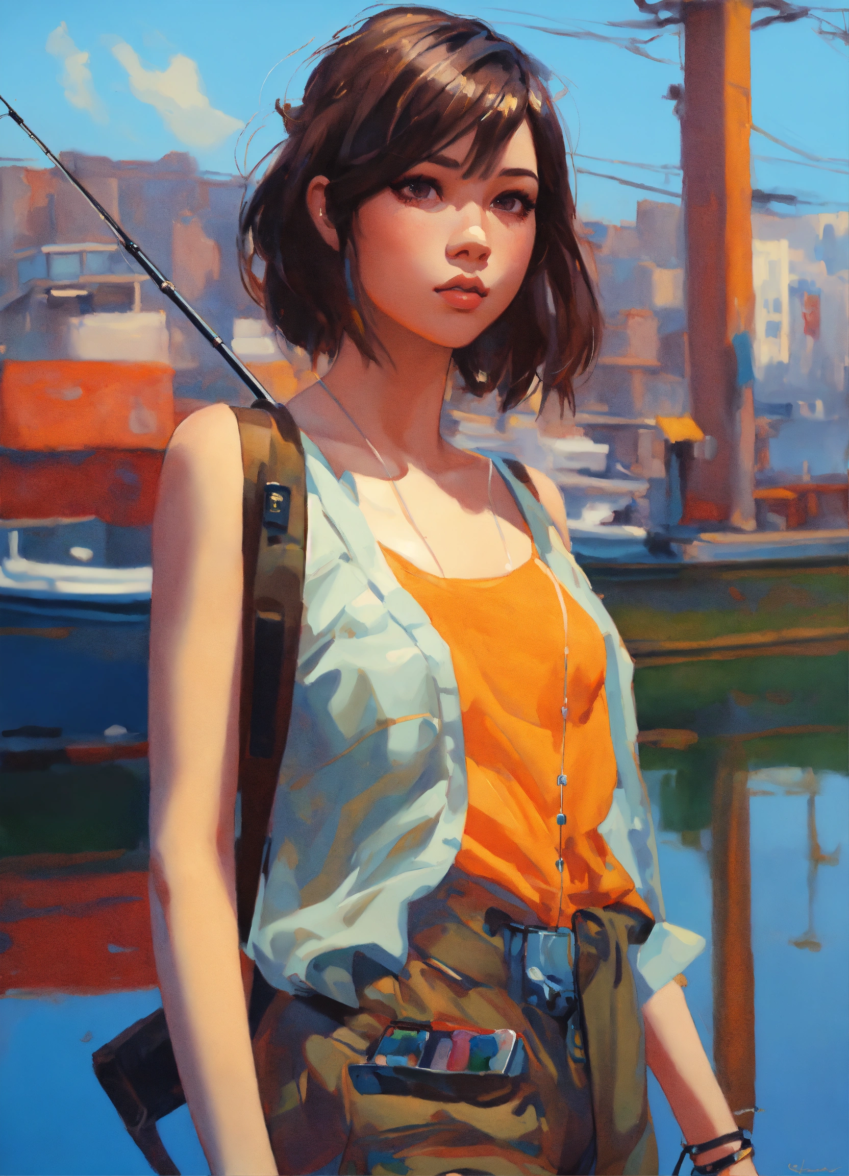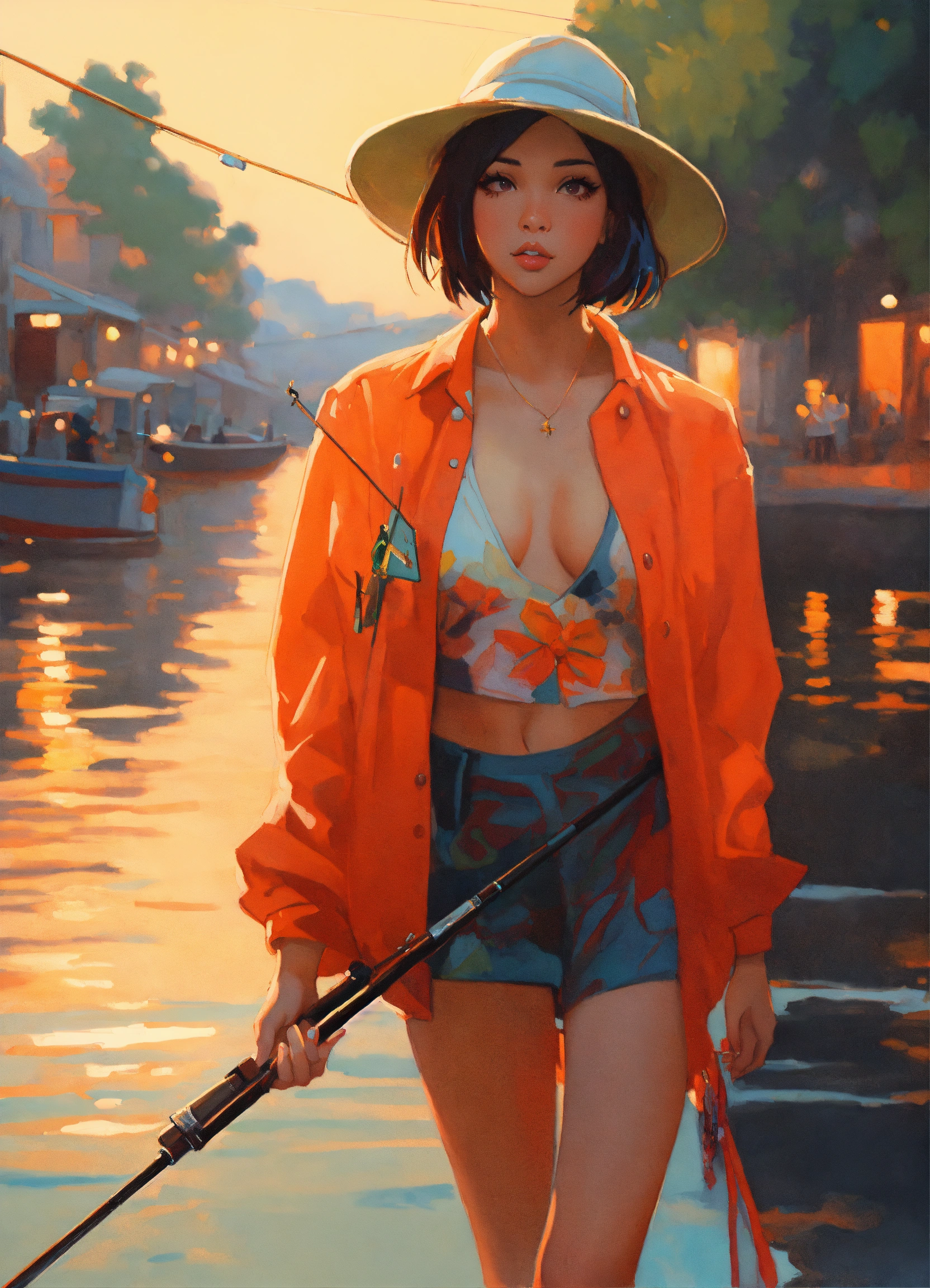 Ultra detailed beautiful painting of a stylish girl in extravagant street clothes ultra-detailed beautiful painting of a stylish girl in extravagant street clothes, fishing with a fishing rod, oil painting, by ilya kuvshinov, greg rutkowski and makoto shinkai, heavenly beauty, very barely dressed
