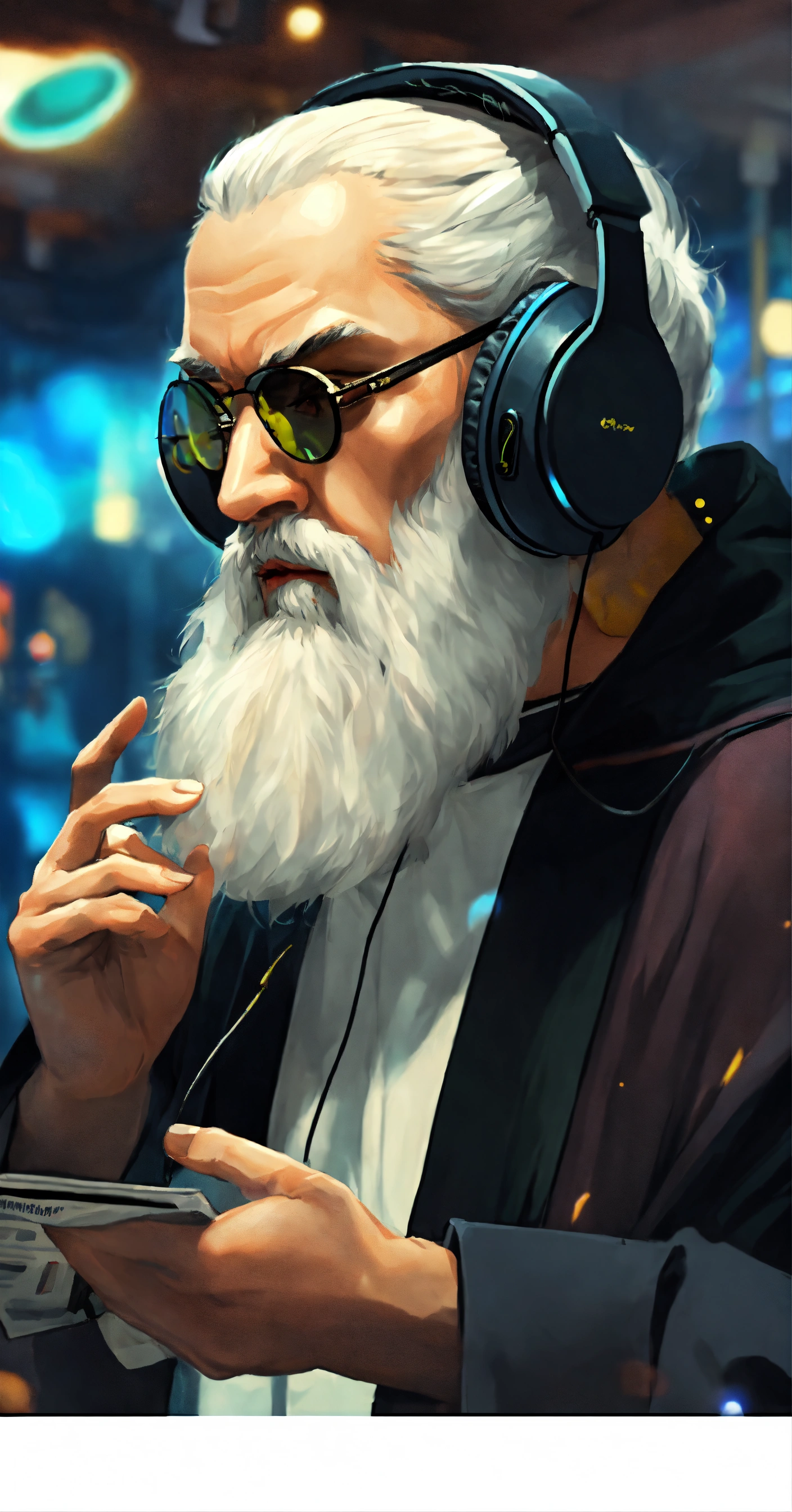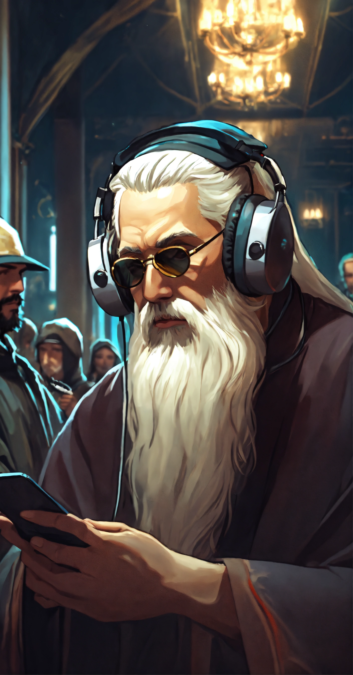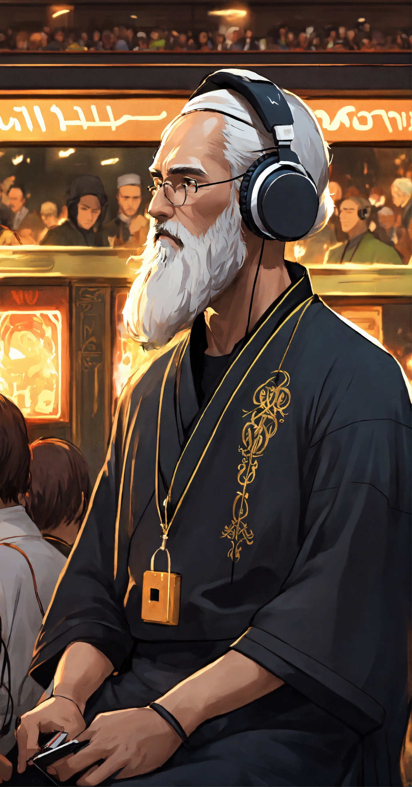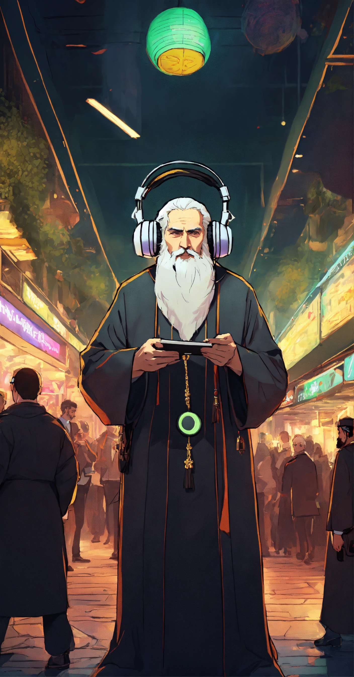 Orthodox priest with white beard listening to music with headphones and wearing sport tennis surrounded by a crowd atheist minding their own bussines at the mall, in dark fantasy anime style