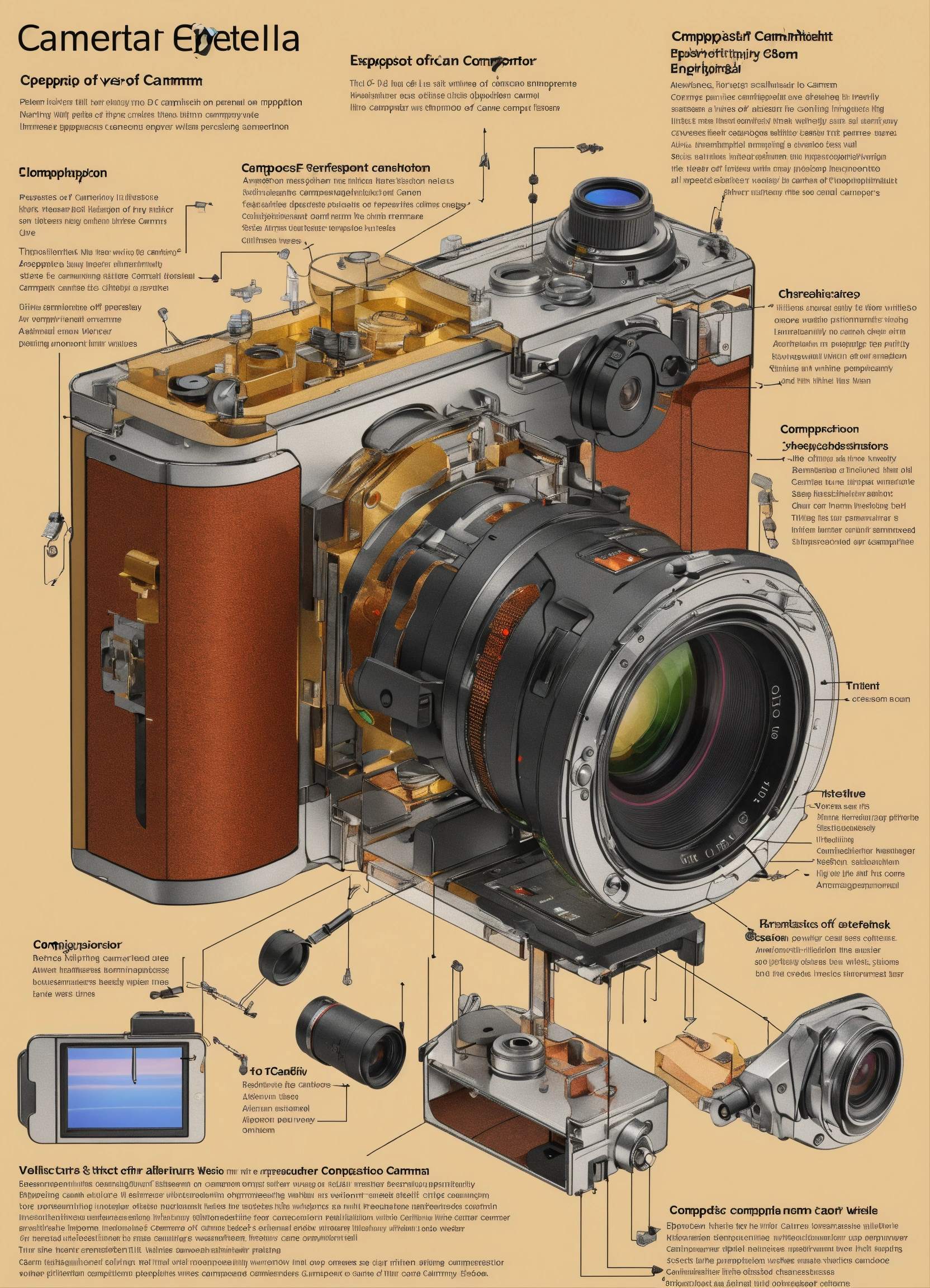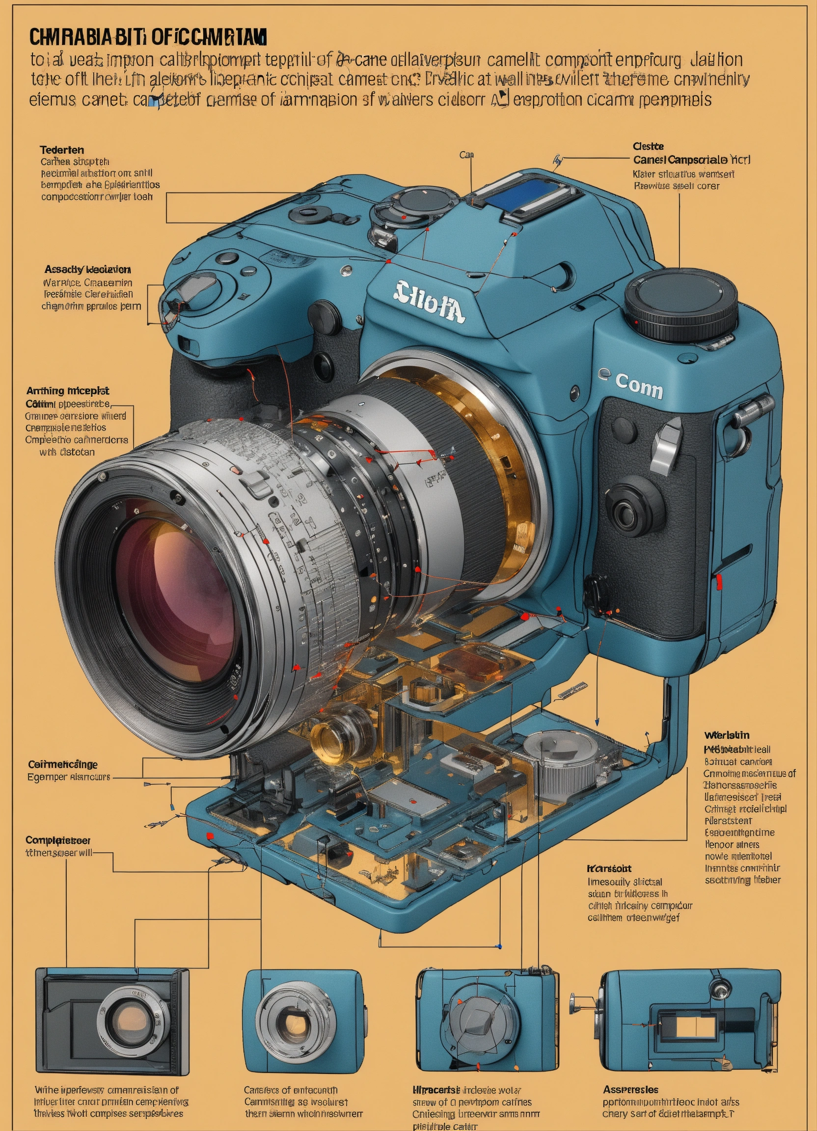 An exploded view diagram of the components of a camera