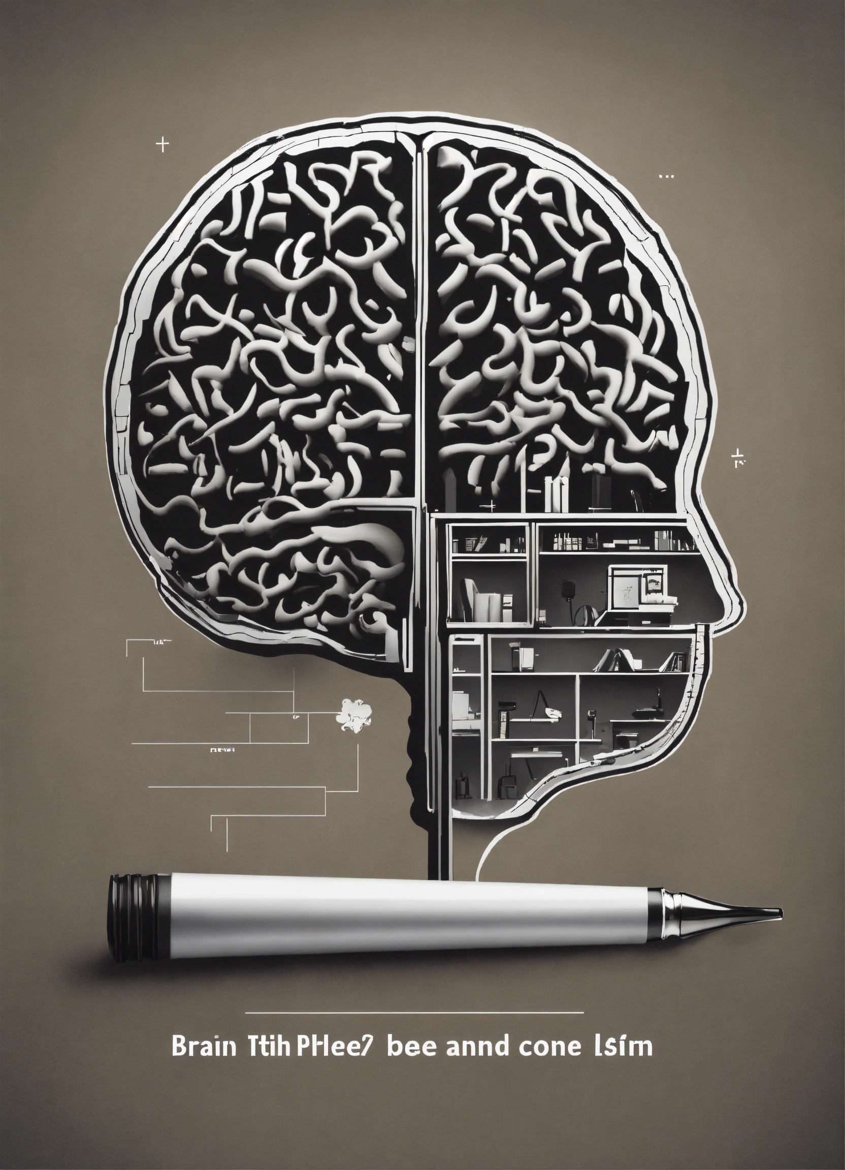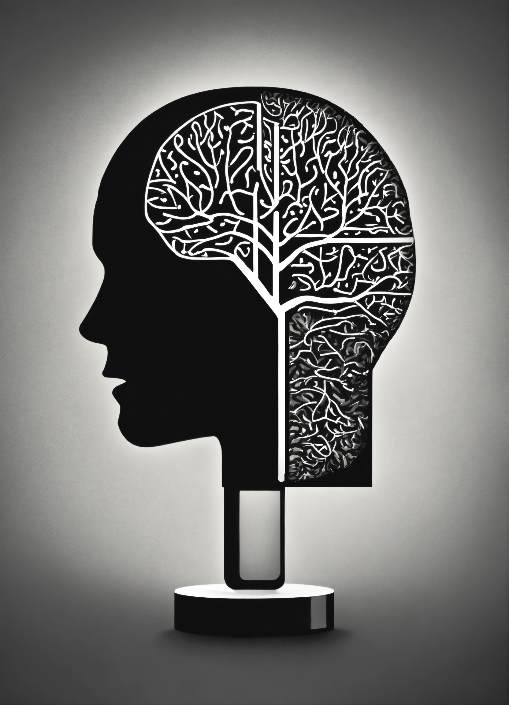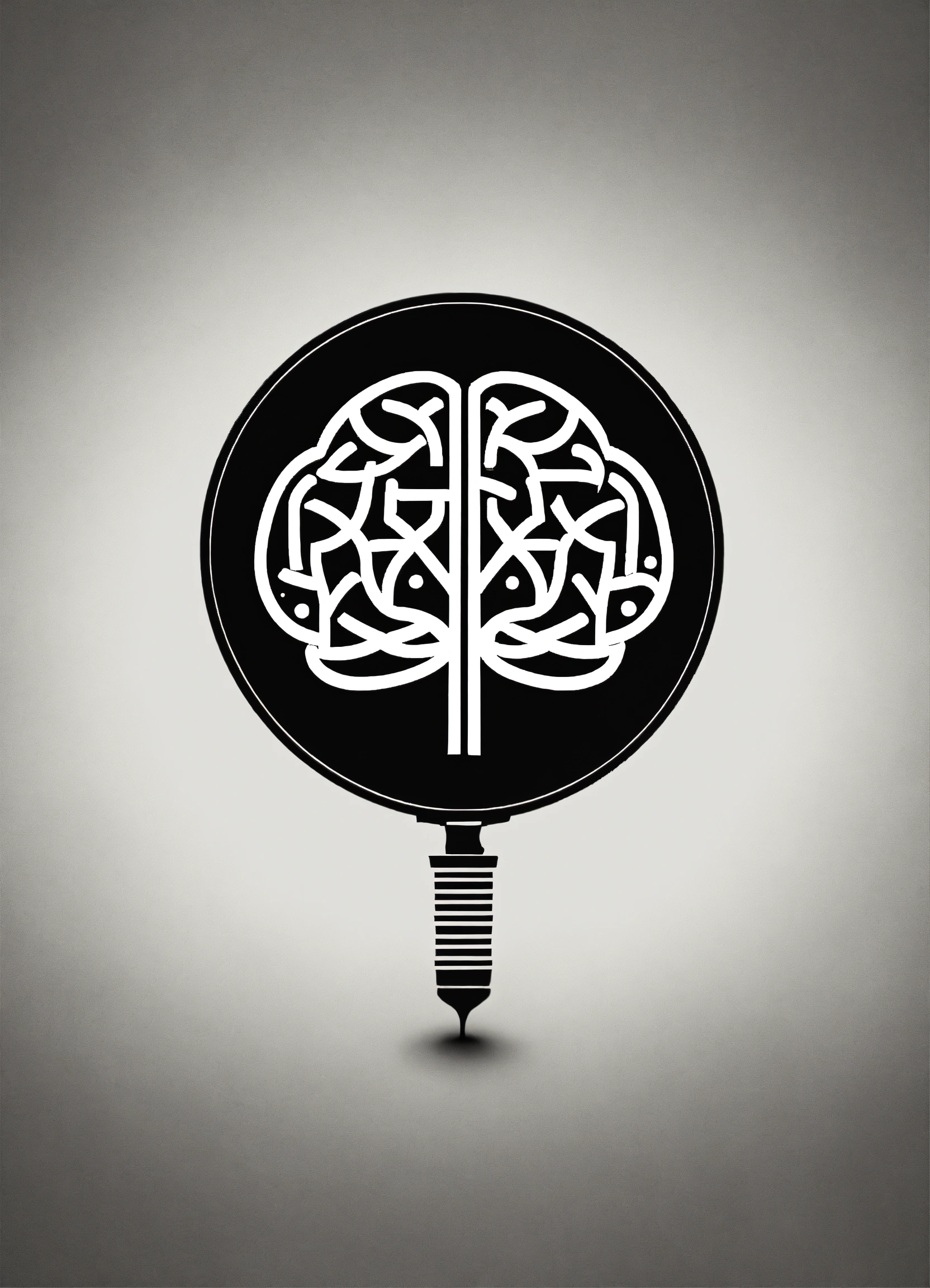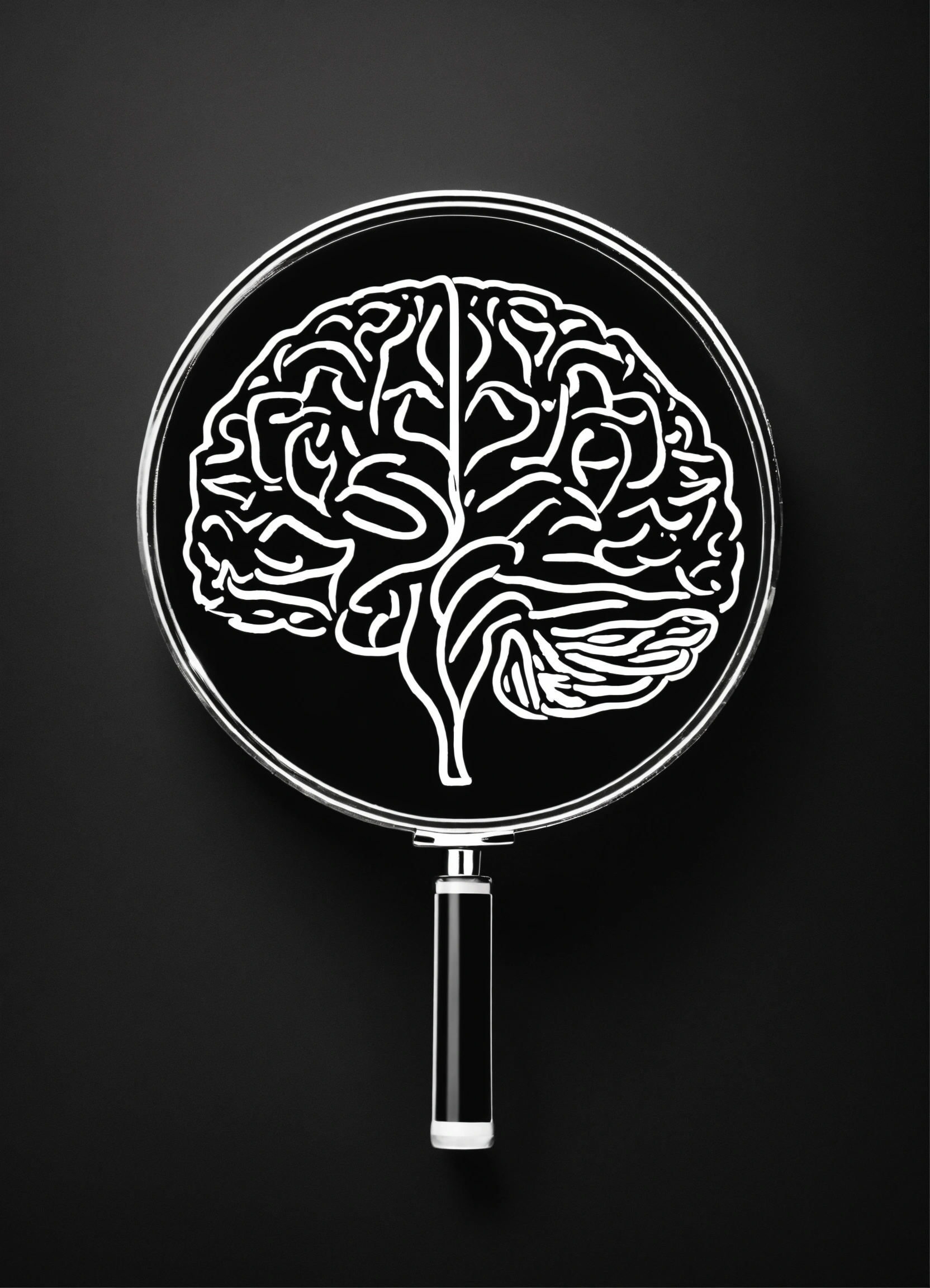 Create a white fund, black and white, simple logo of a brain almost complete, the last piece is being seen by a magnifying glass