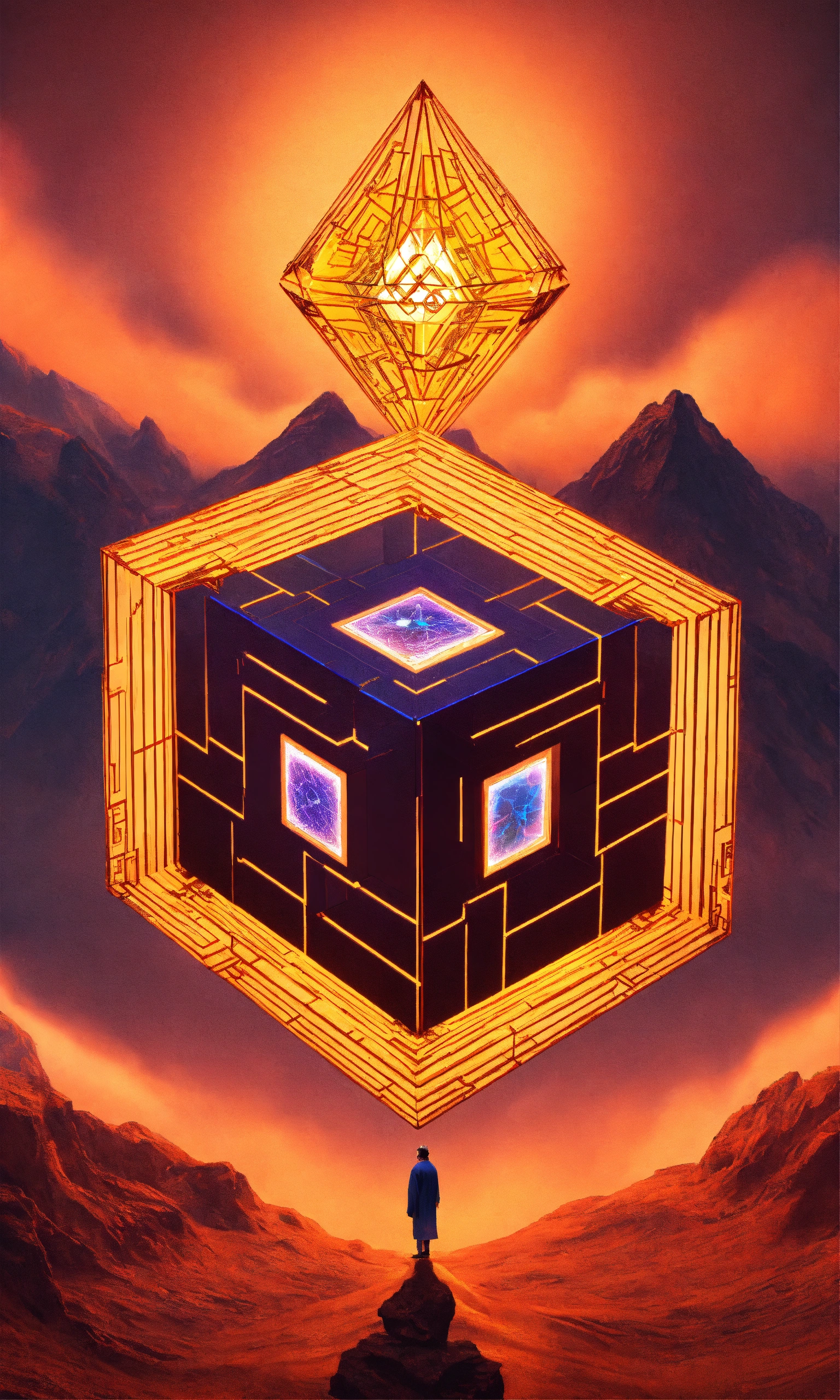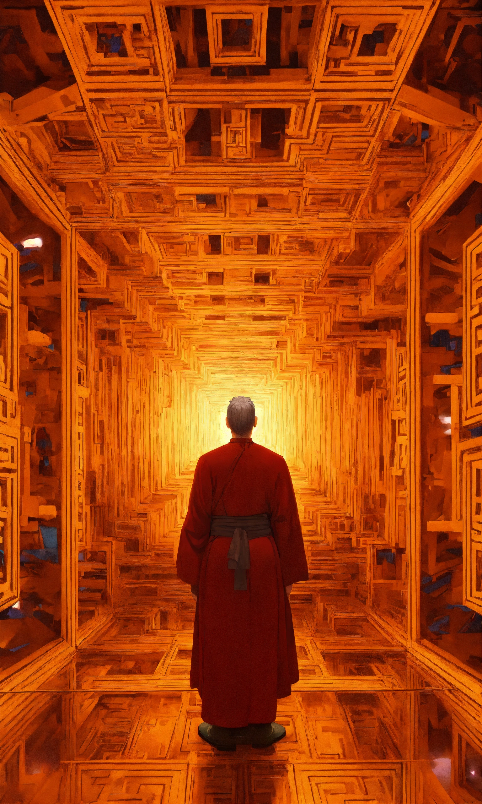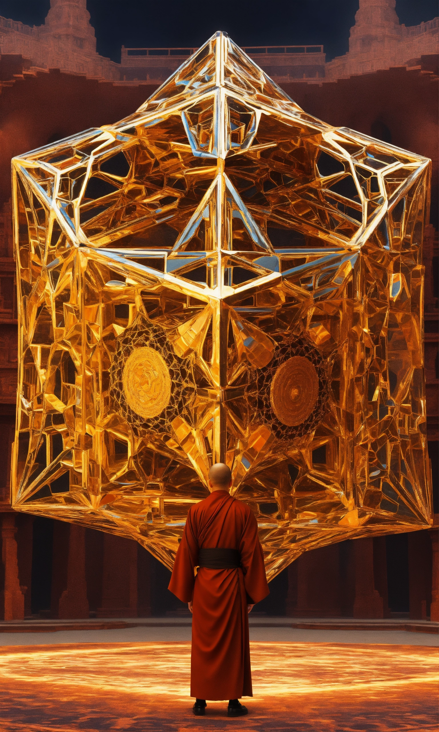 Taoist monk tesseract body fractal three point perspective hypercube melting in each other