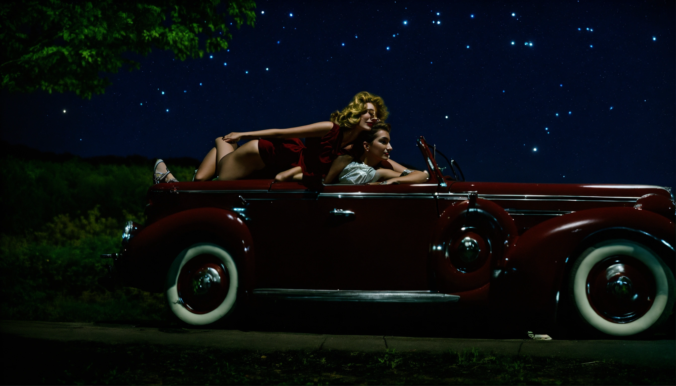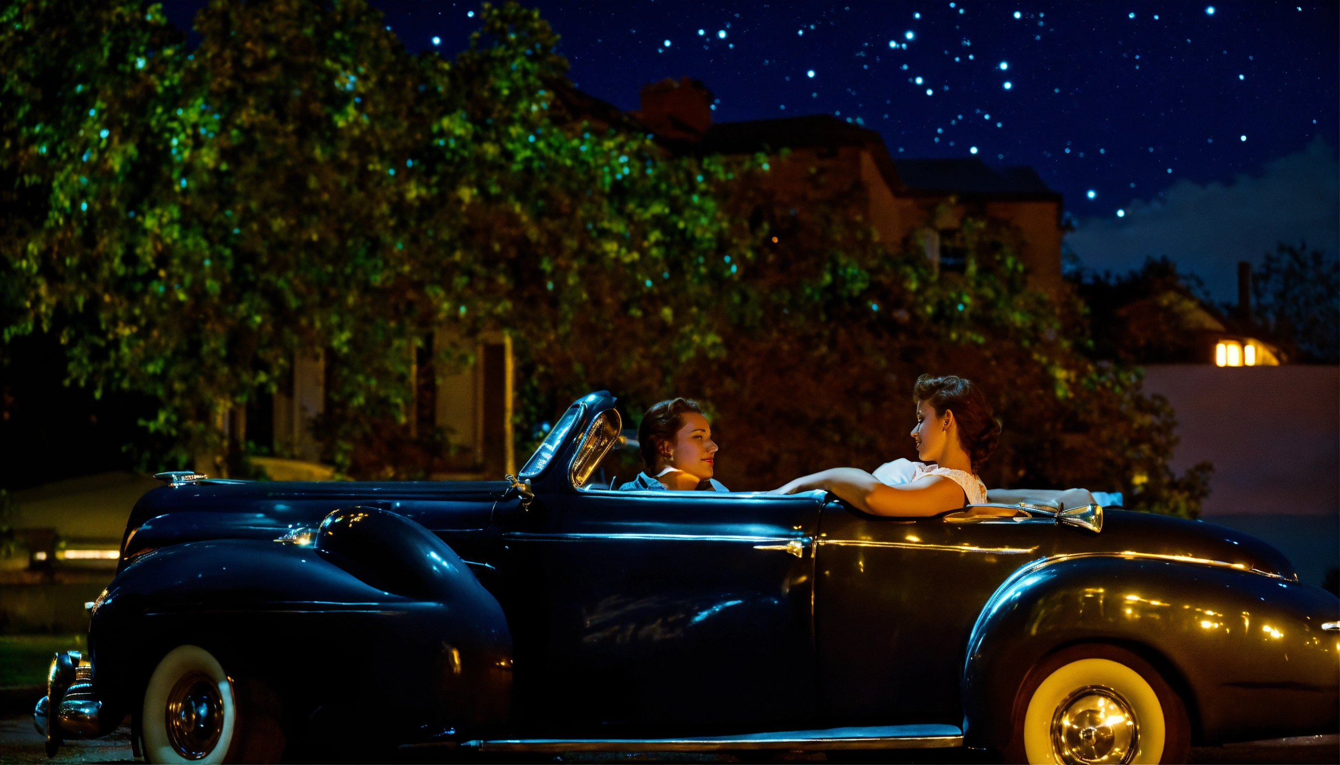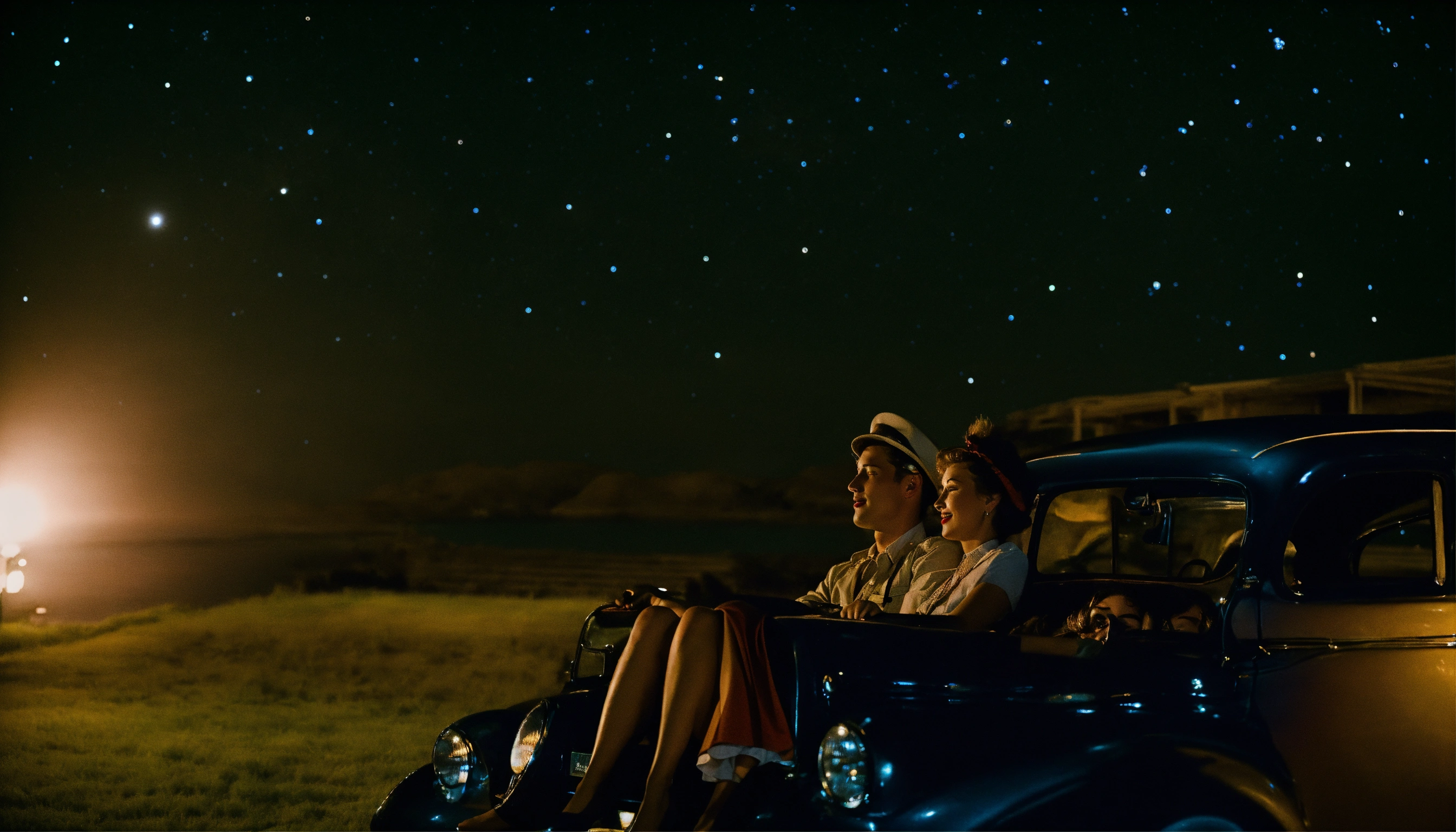 1940's couple laying on a car at night watching the stars