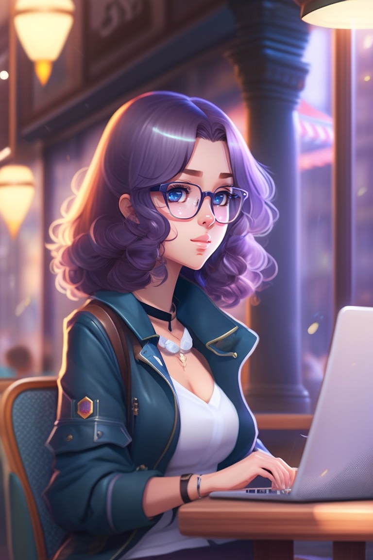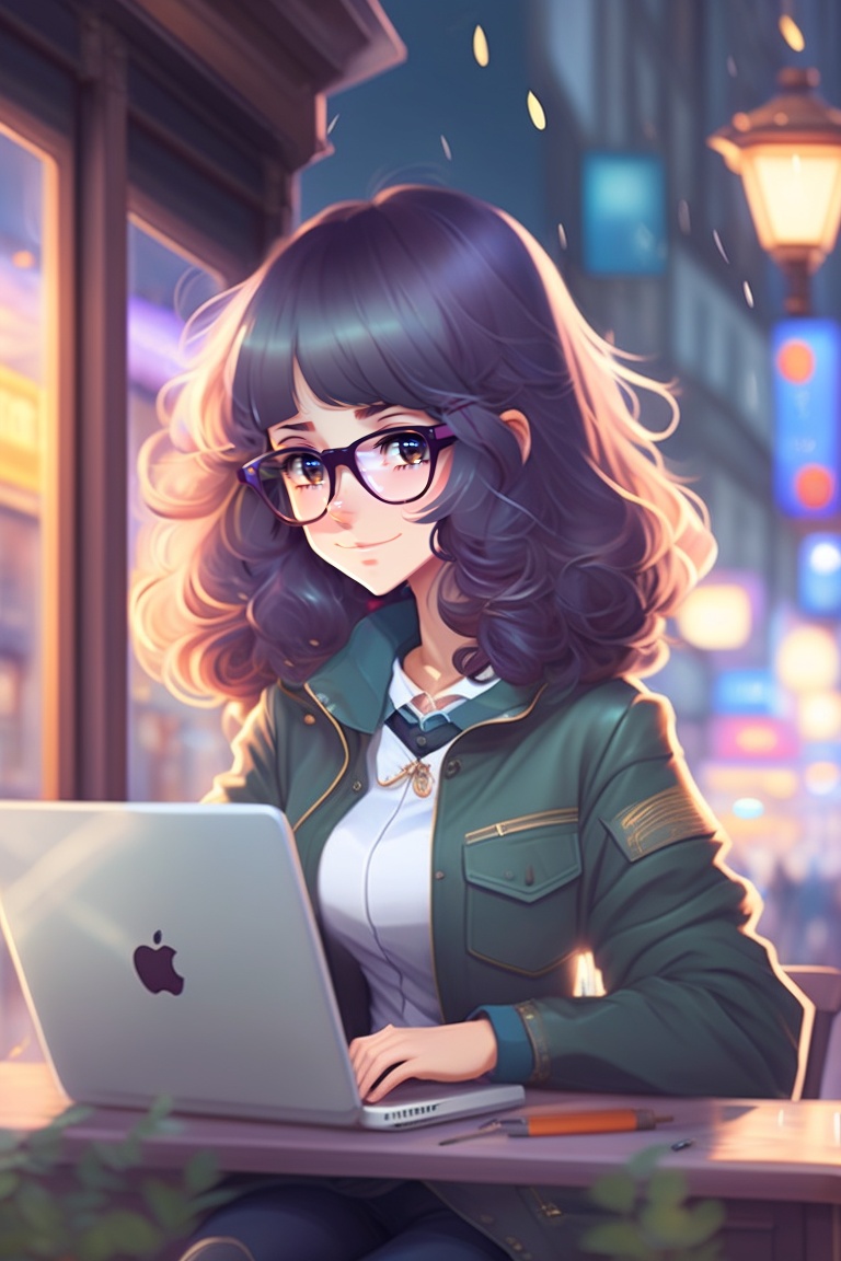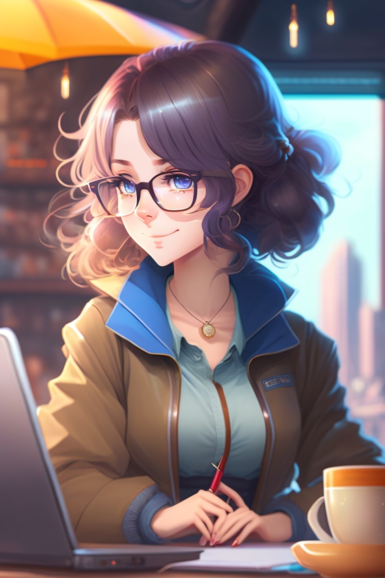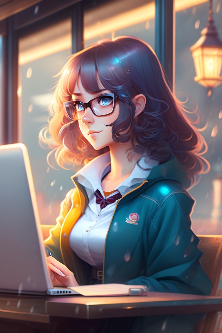 A female anime character, shoulder length curly hair with glasses on, sitting in a cafe, working on a laptop, rainy weather