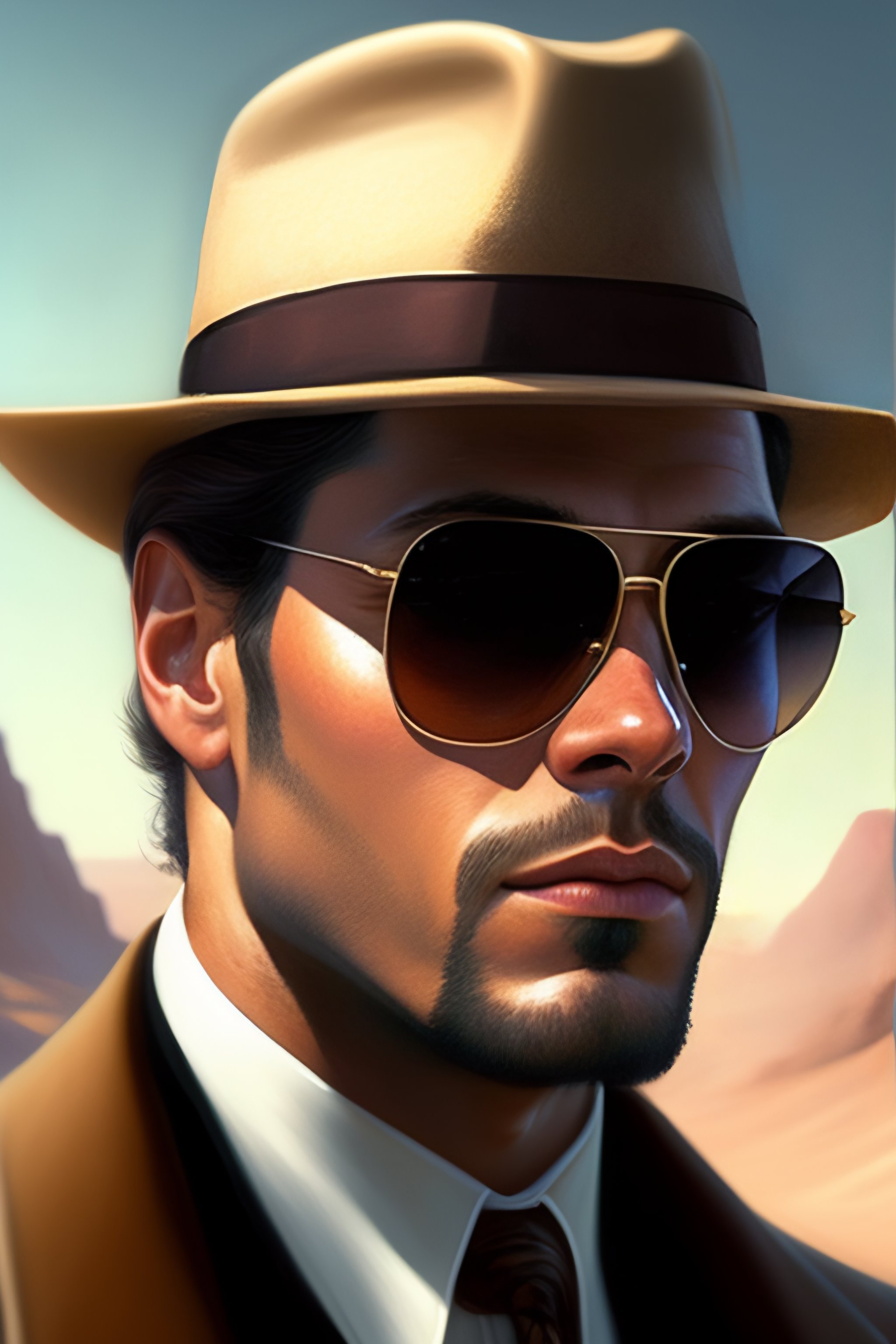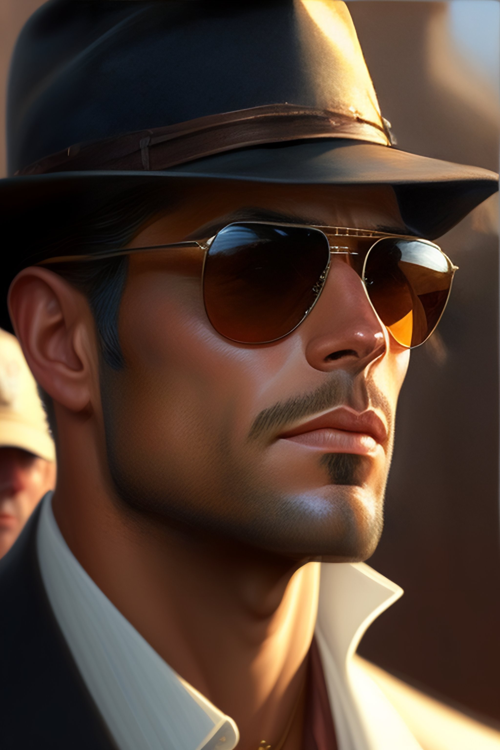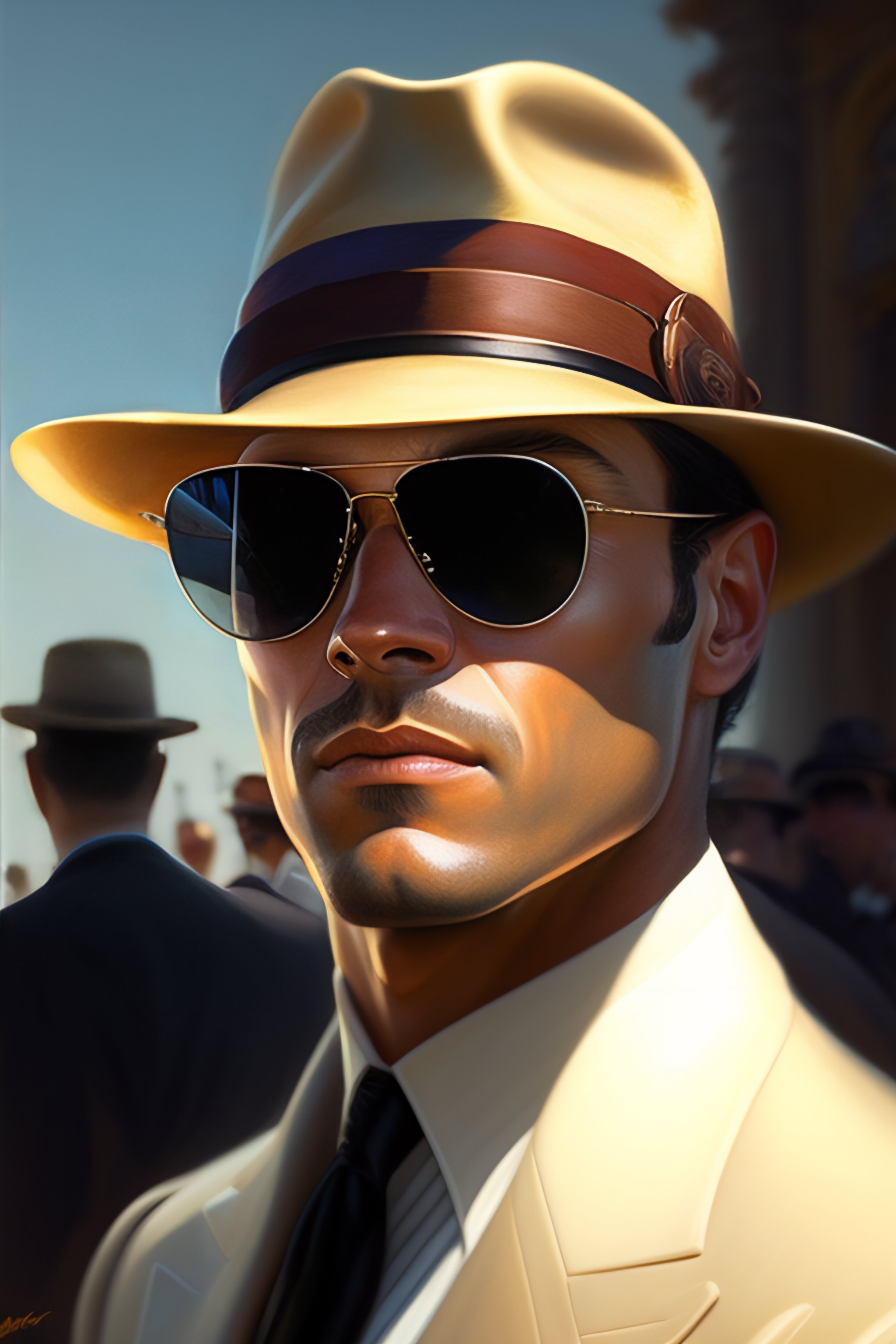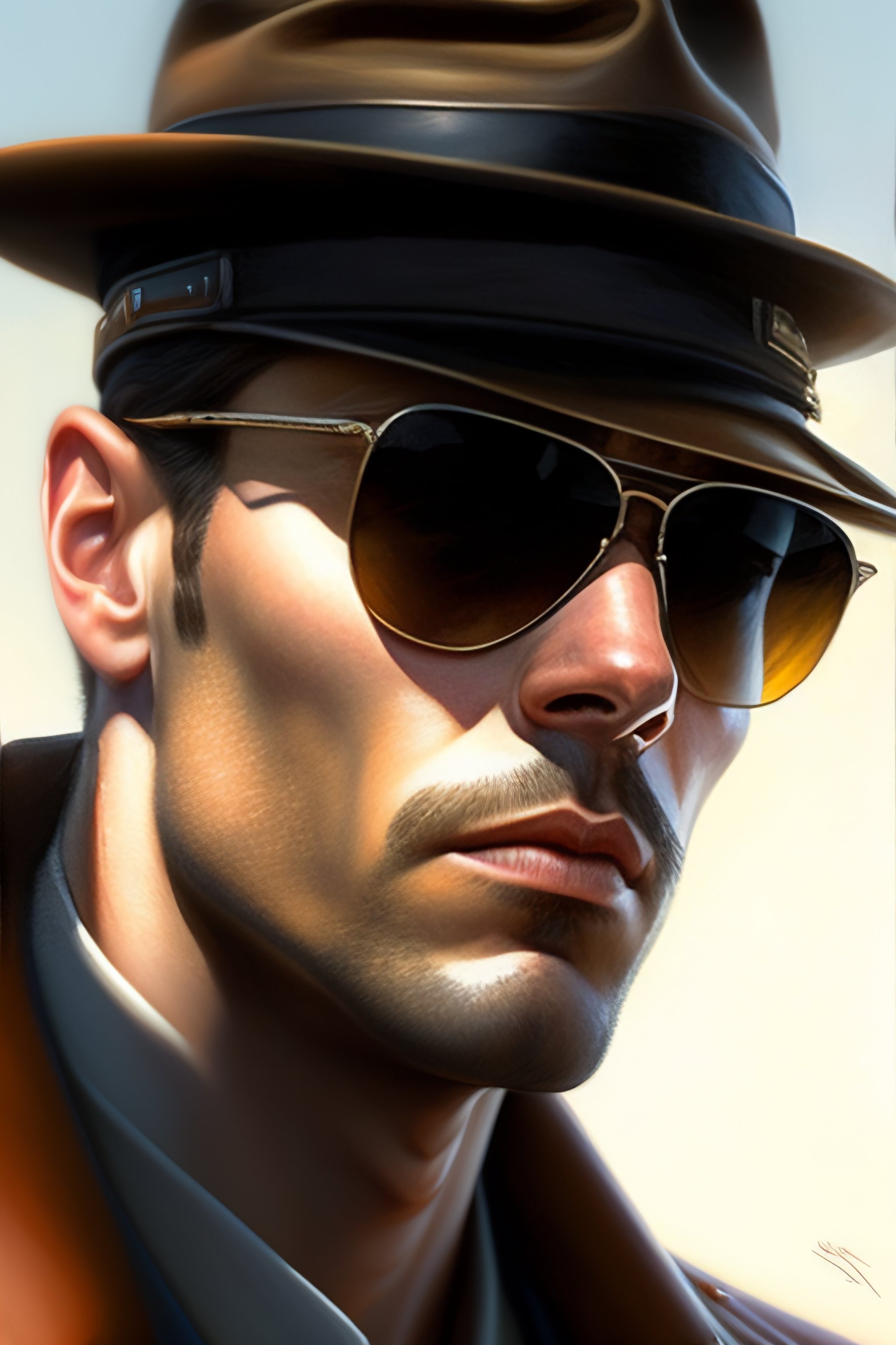 White caucasian man in sunglasses and mafia hat, closeup character art by donato giancola, craig mullins, digital art, trending on artstation