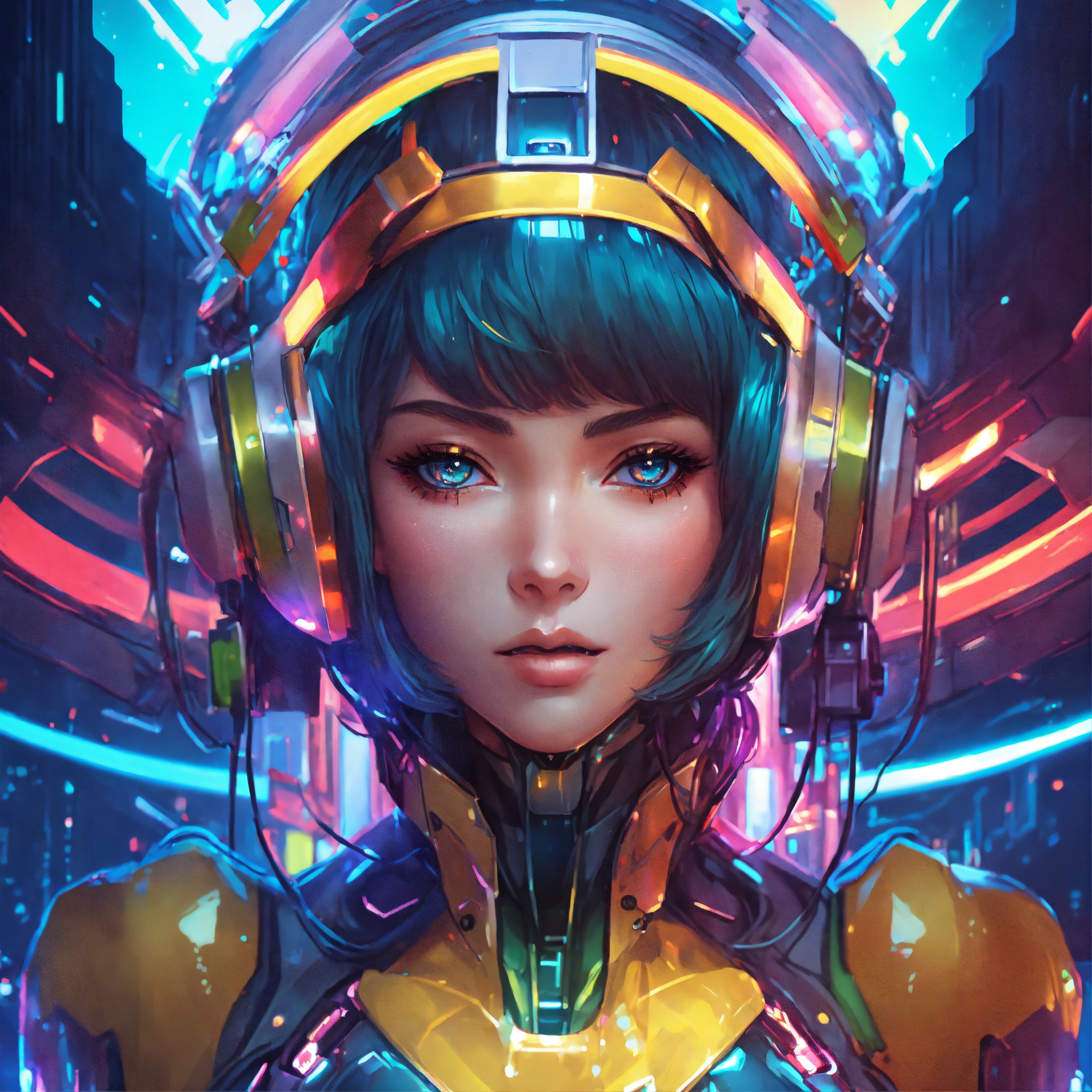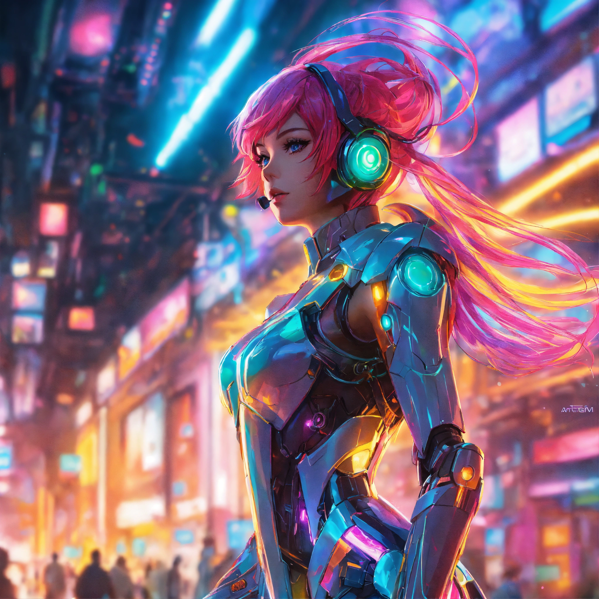 Abstract style anime art of a magical android techno space girl, robotic, primary coloured lights, 8k, stunning intricate details, by artgerm