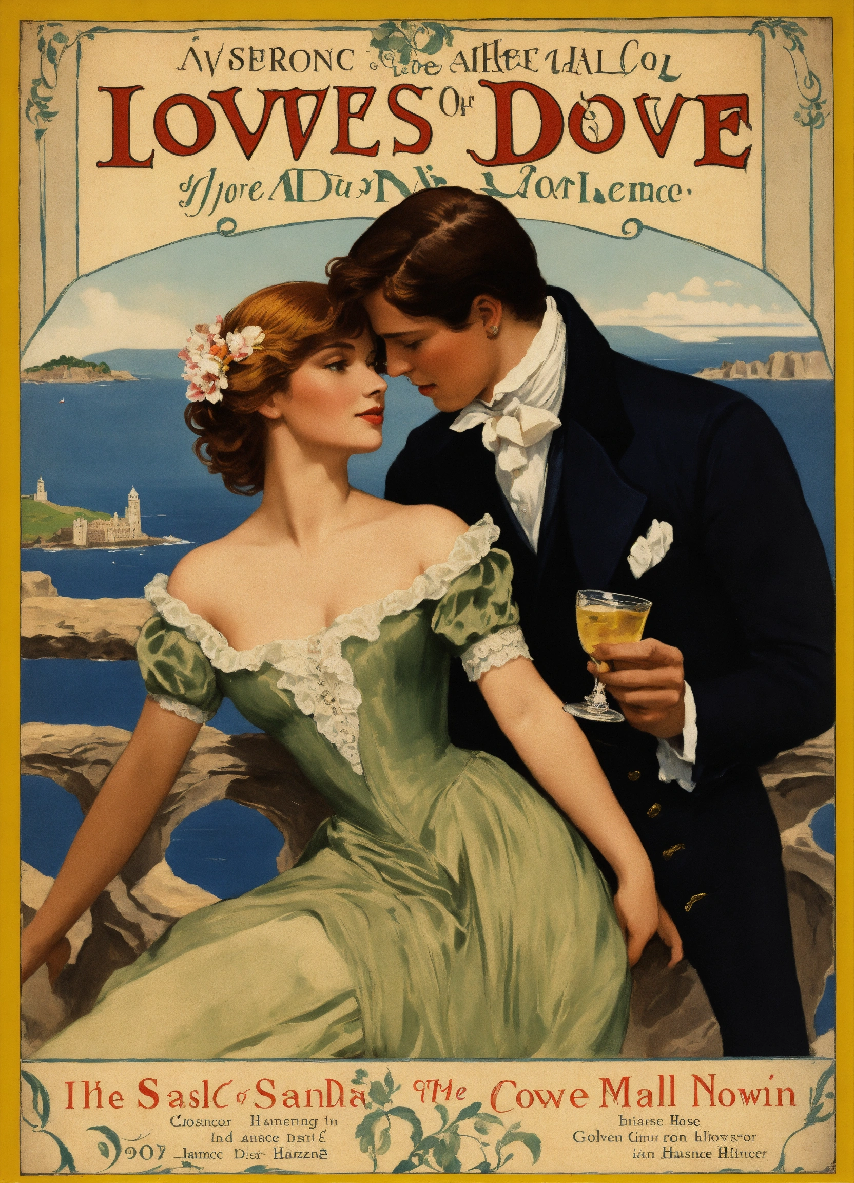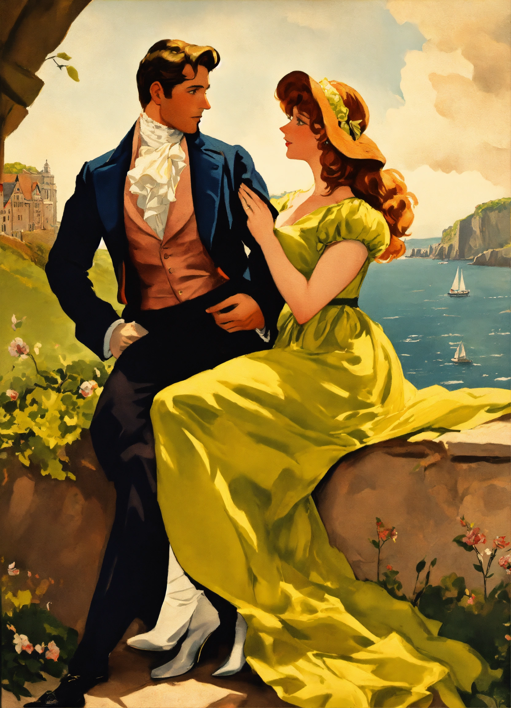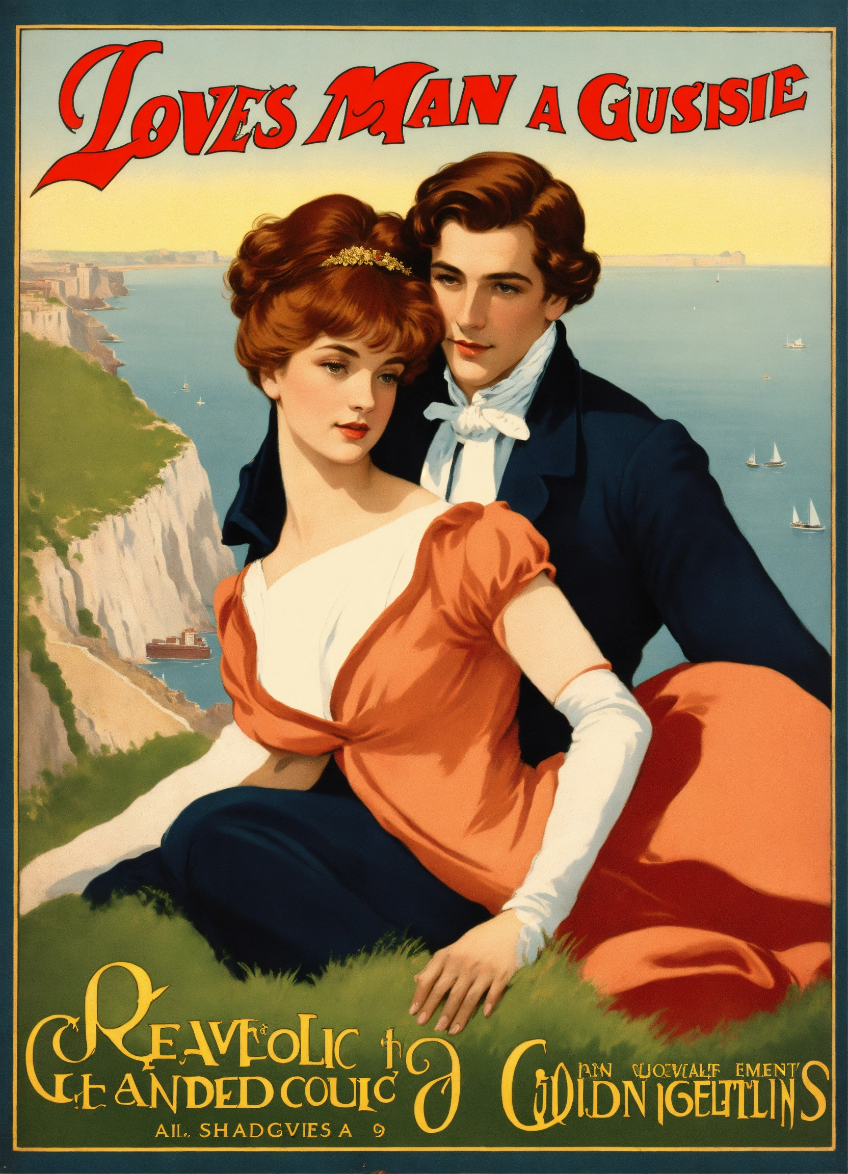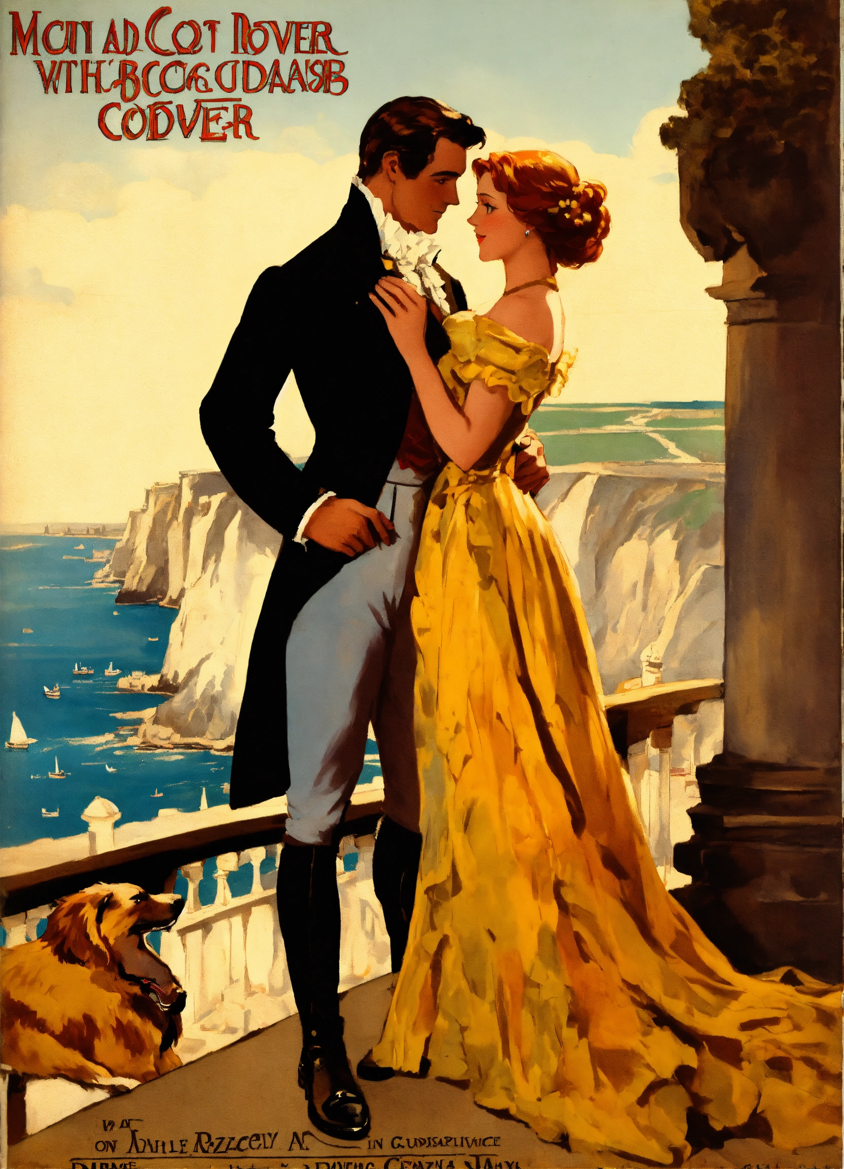 Create a captivating cover design that conveys the theme of romantic comedy, with the title of " loves many guises a comedic dance, featuring a dashing regency gentleman with auburn hair embracing a slender woman with golden hair, a long face, and hazel eyes. again, the cliffs of dover and a sable collie could be in the background near their legs. vintage poster paint book cover style design, with shadows and effect that gives the design captivating, super detailed, extremely detailed, detailed hands, half body focus, with the cliffs of dover in their background