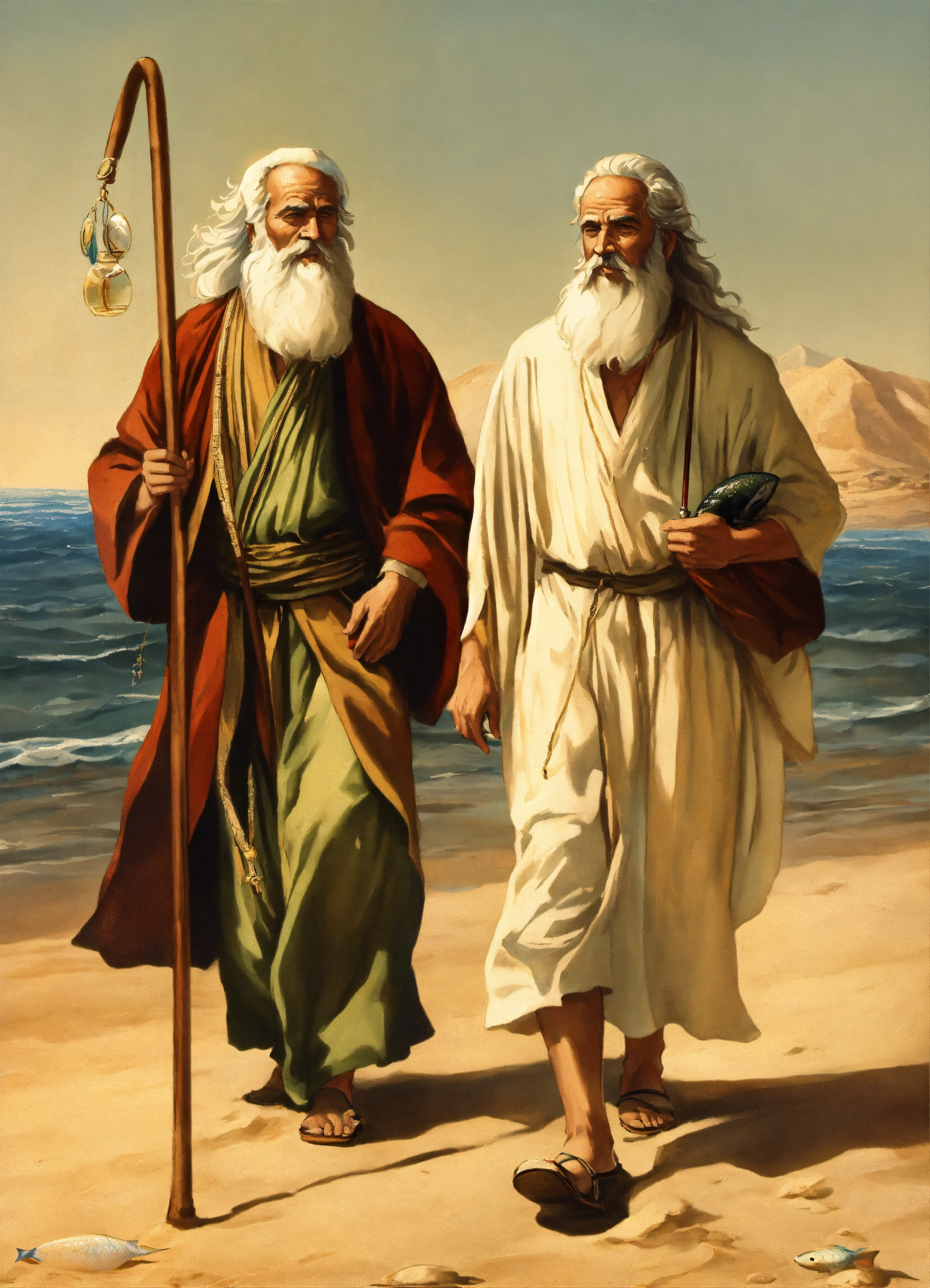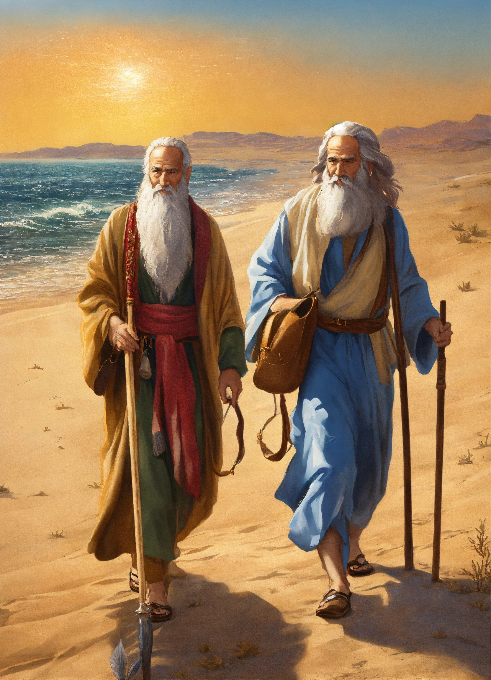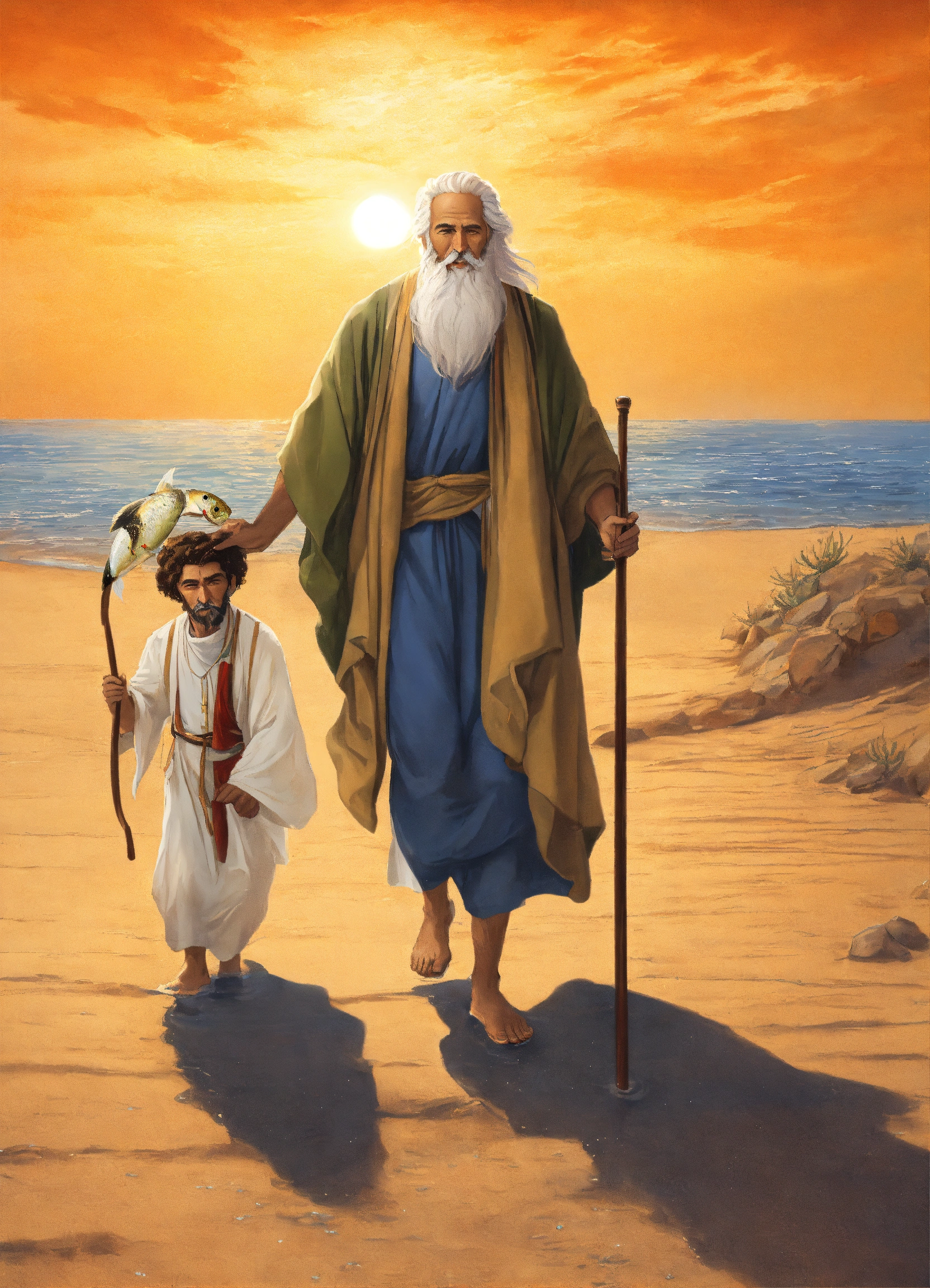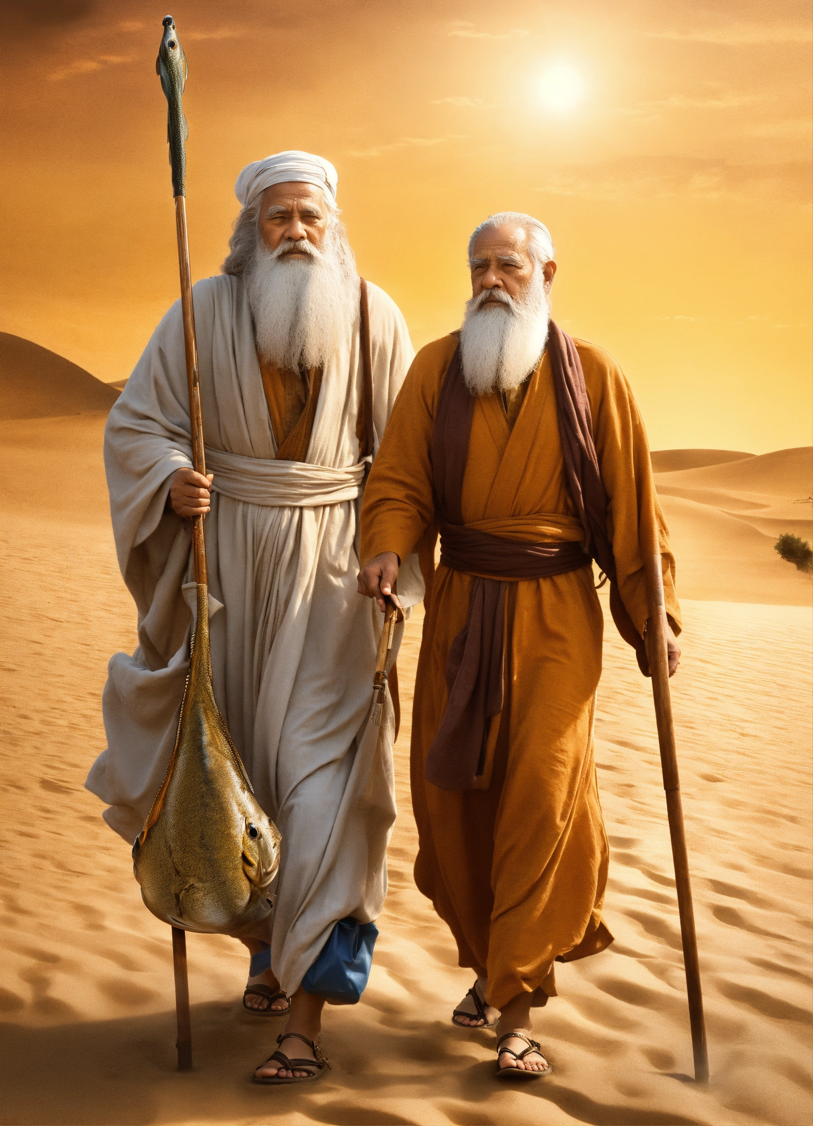 Show both prophet moses and yusha walking on a desert beach, their left side is desert and their right side in the water. moses is carrying his cane with a white beard and younger yusha carrying a bag on his back has large fish. cover both faces with light.