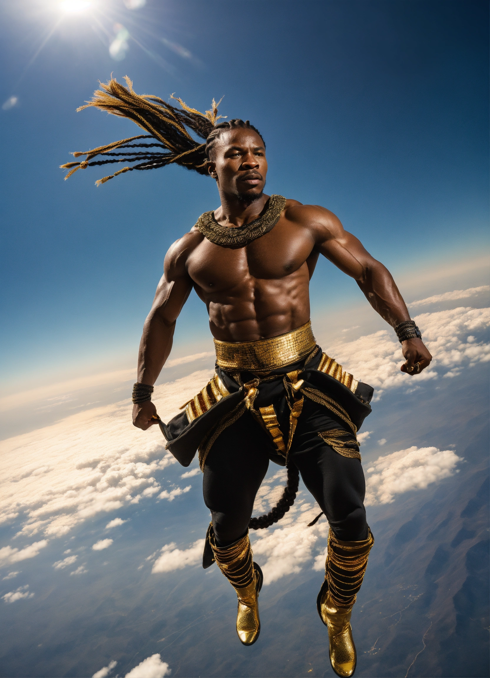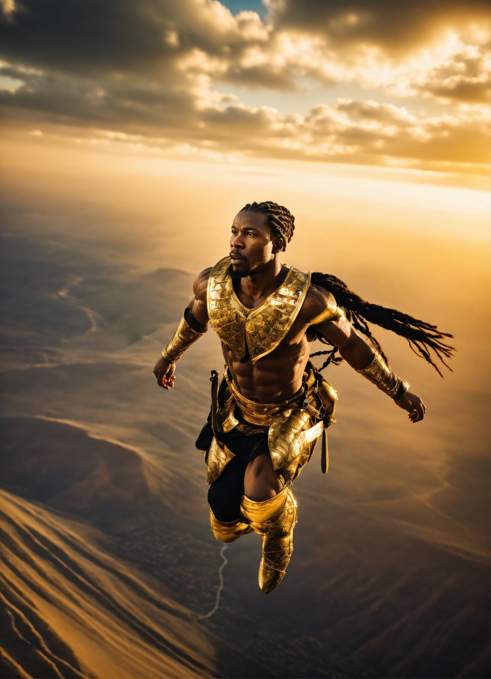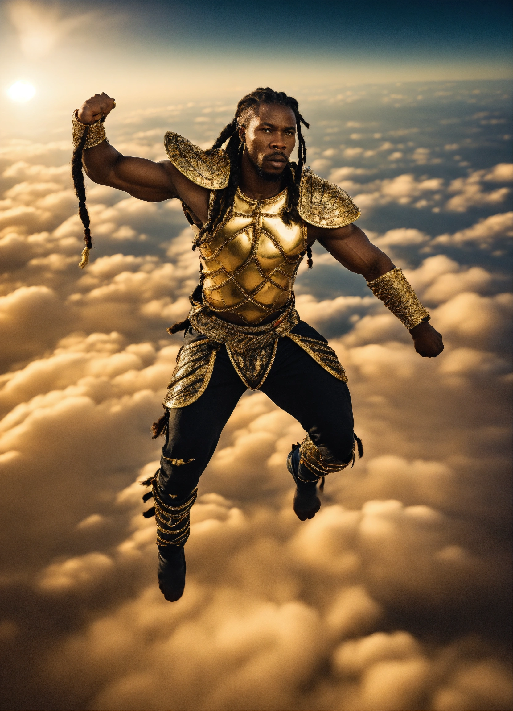 Dramatic aerial photograph of a muscular african warrior with braids, wearing gold and black armor, falling without a parachute at 10. 000 feet in the sky, facing towards the camera. the framing should be a full body shot and include his entire body but no margin around him. please add motion blur to make the shot dynamic