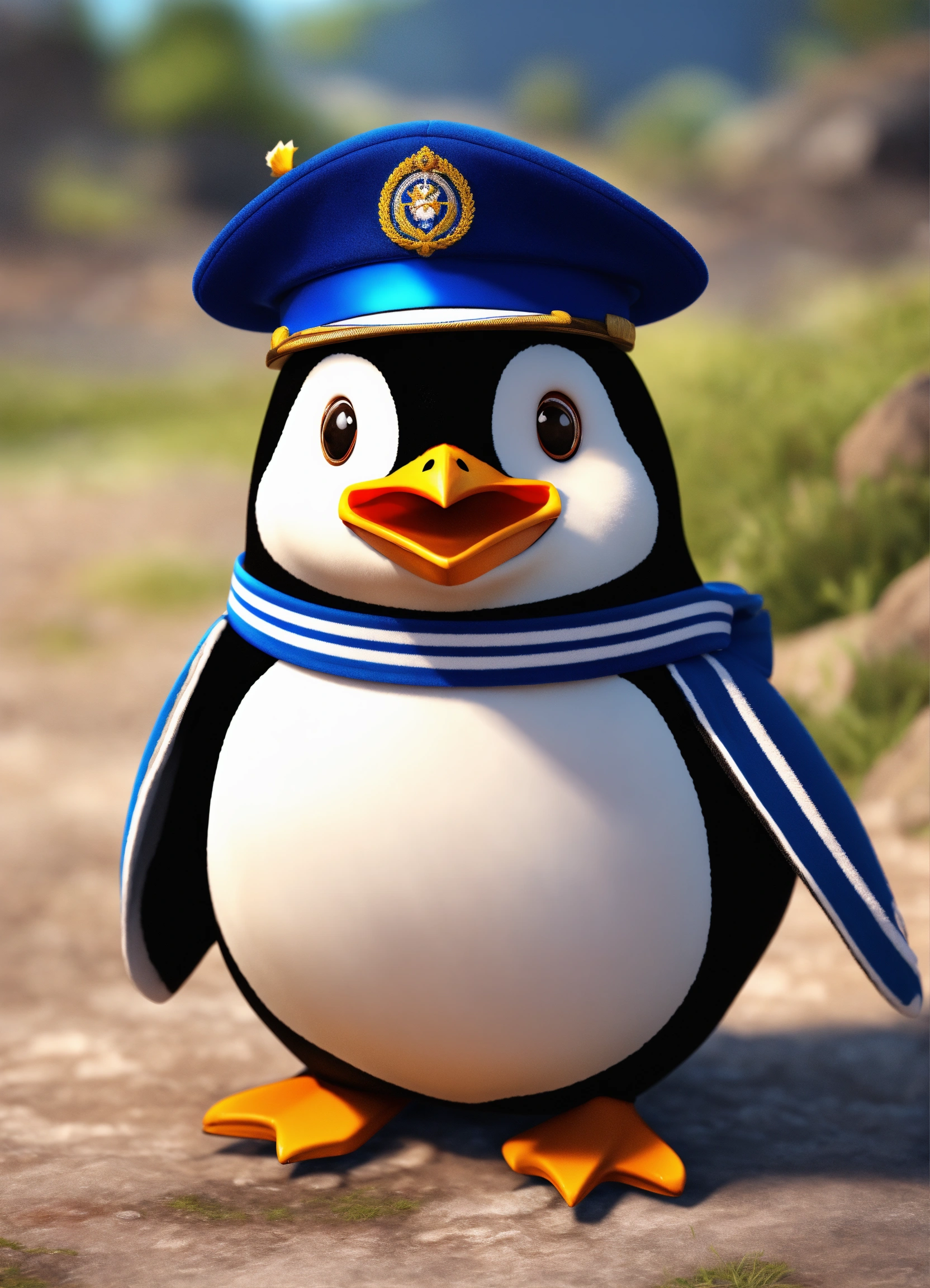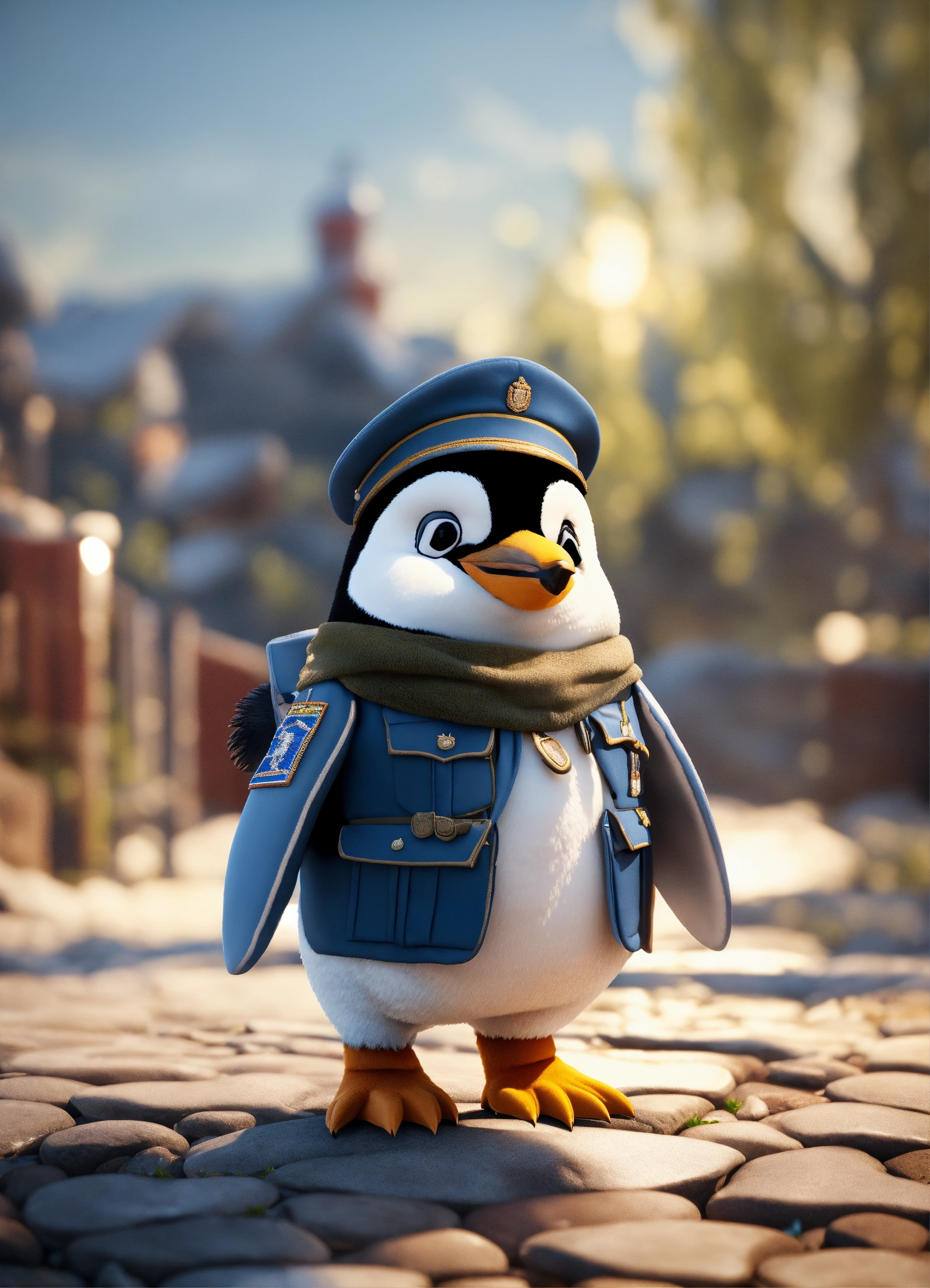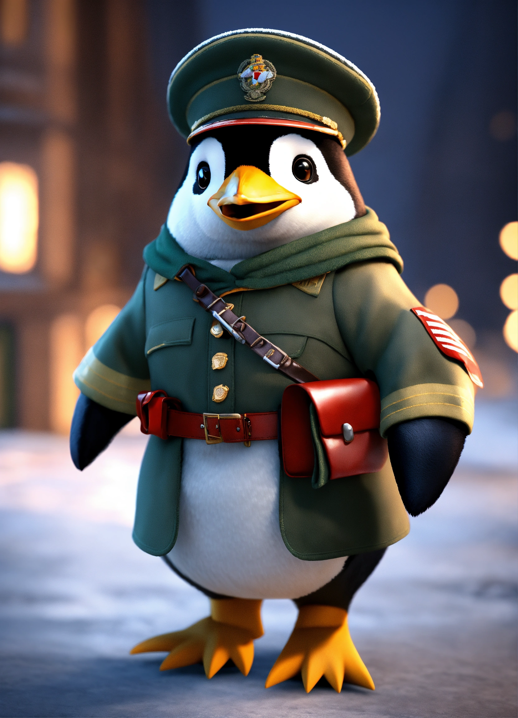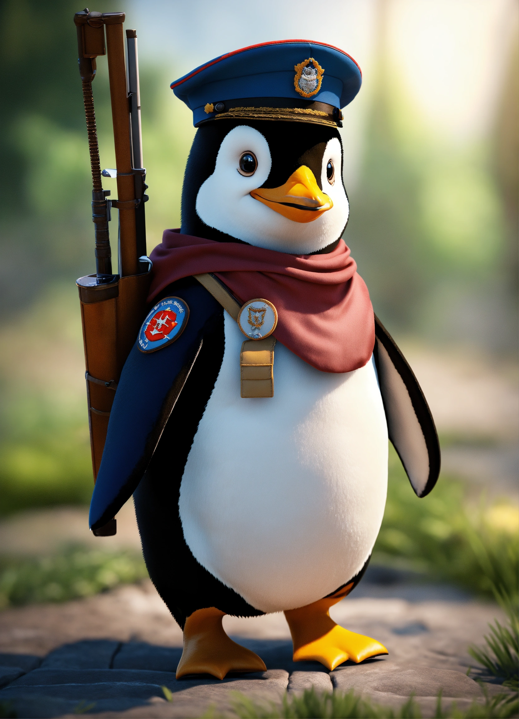 A cute penguin wearing a soldiers uniform