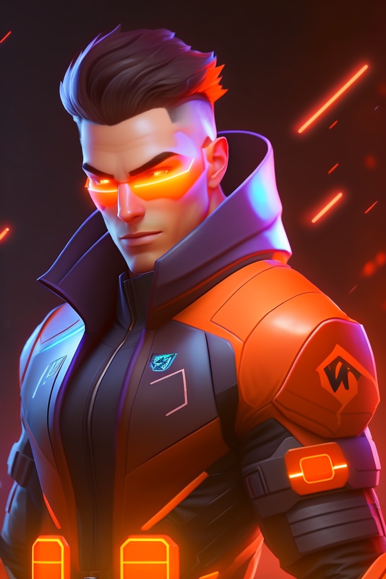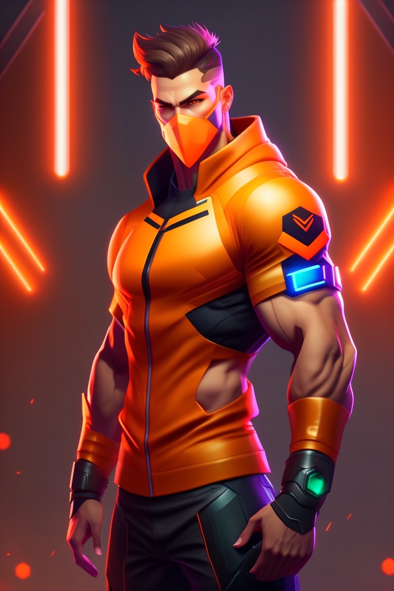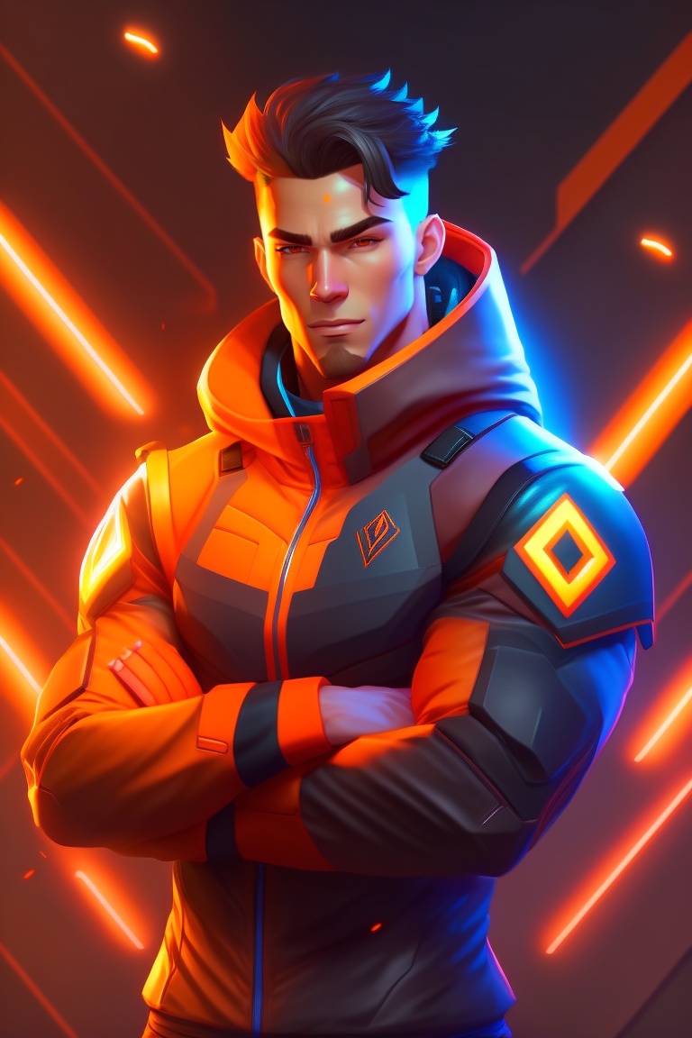 Male character, valorant game style, character similar to valorant's breach, orange neon, arms crossed