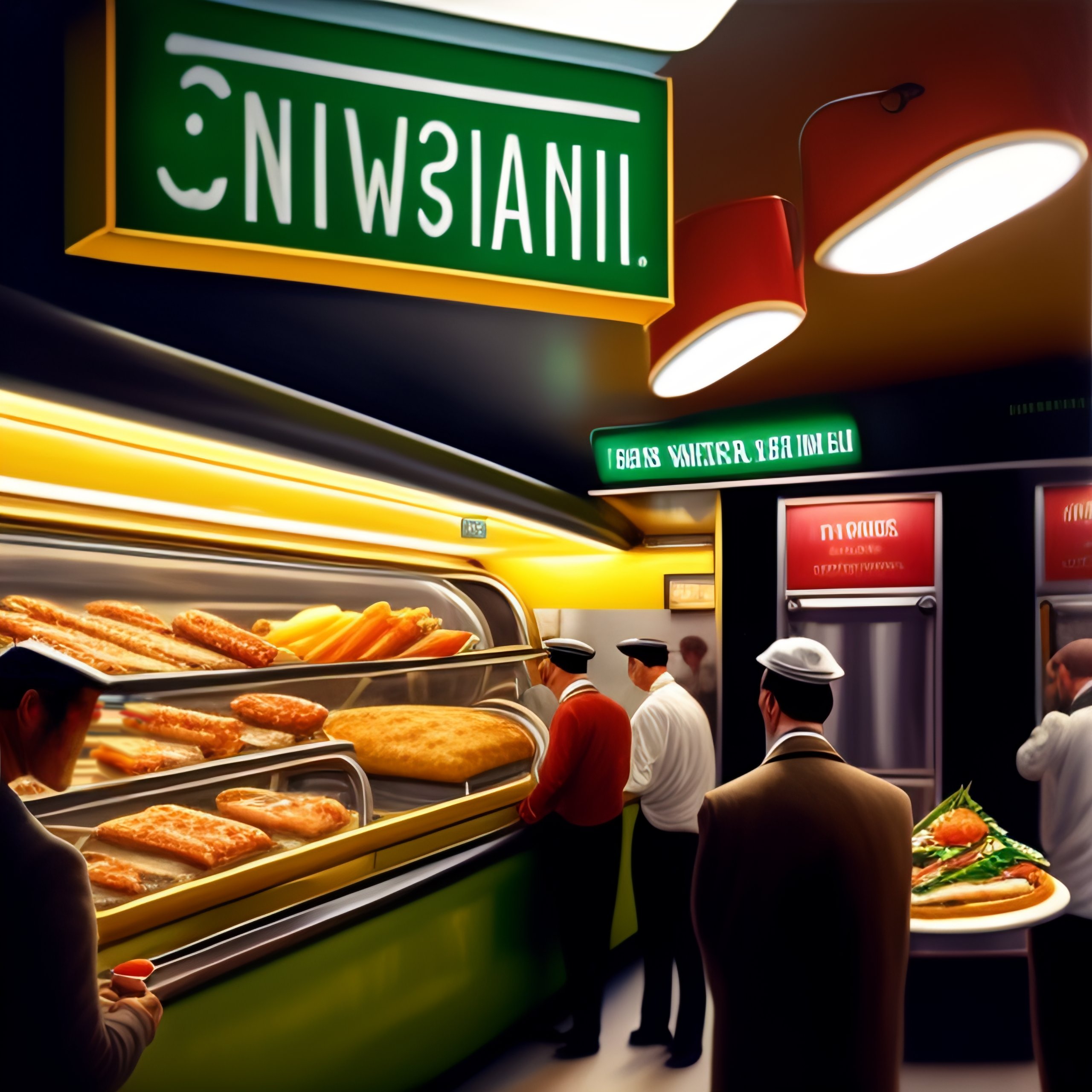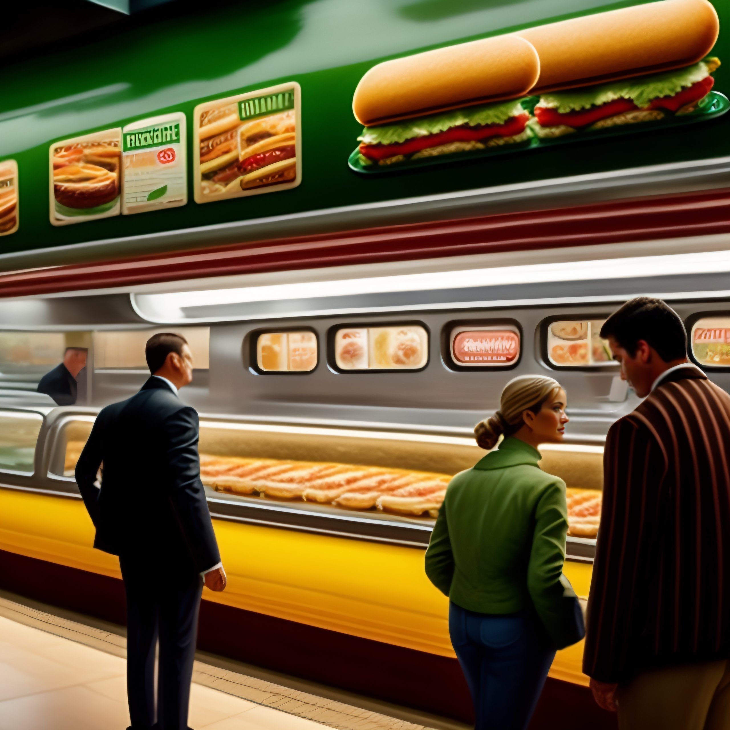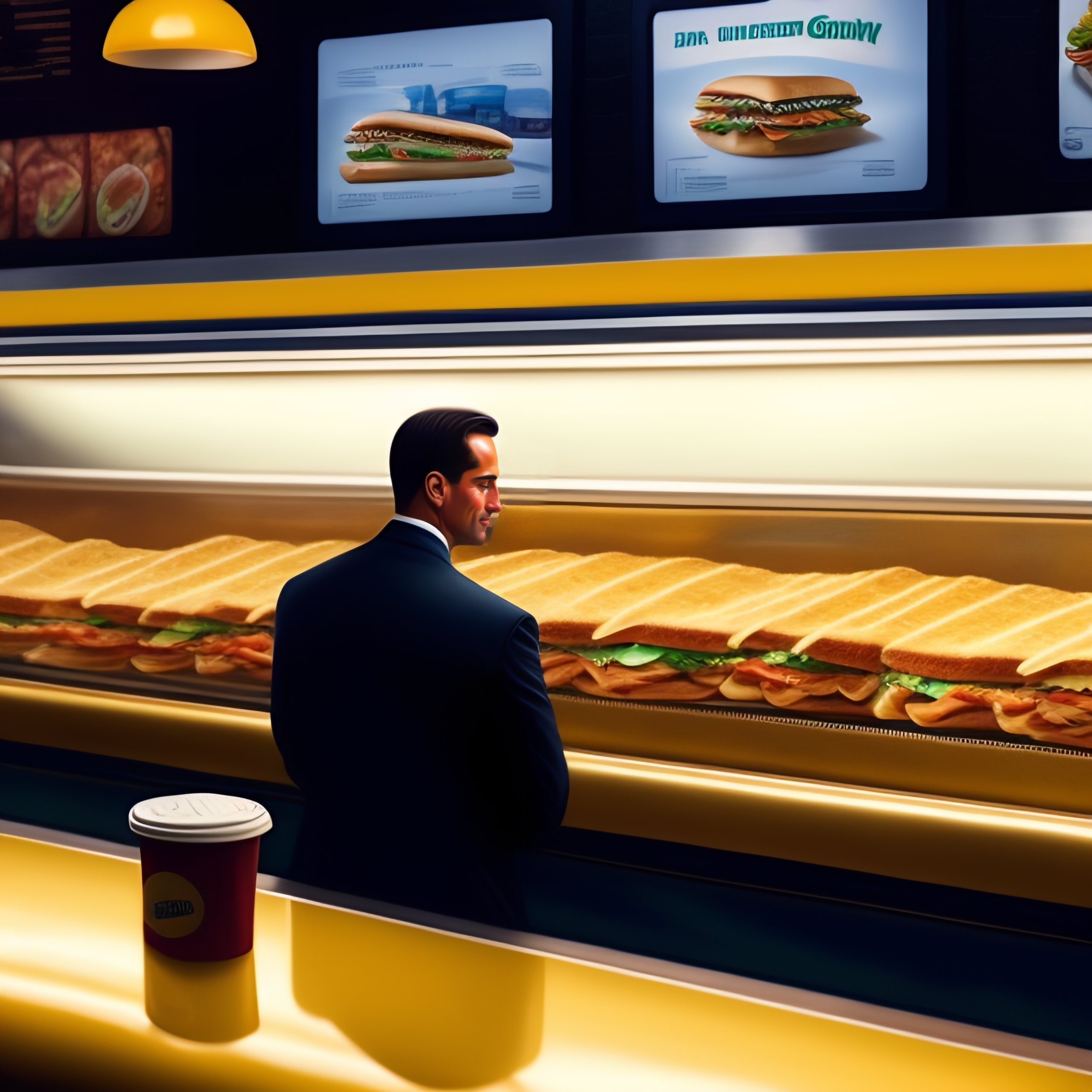 A realistic view inside of a subway sandwich shop where people are telling the server what they want on their sandwiches in style of wayne thiebaud and bosch