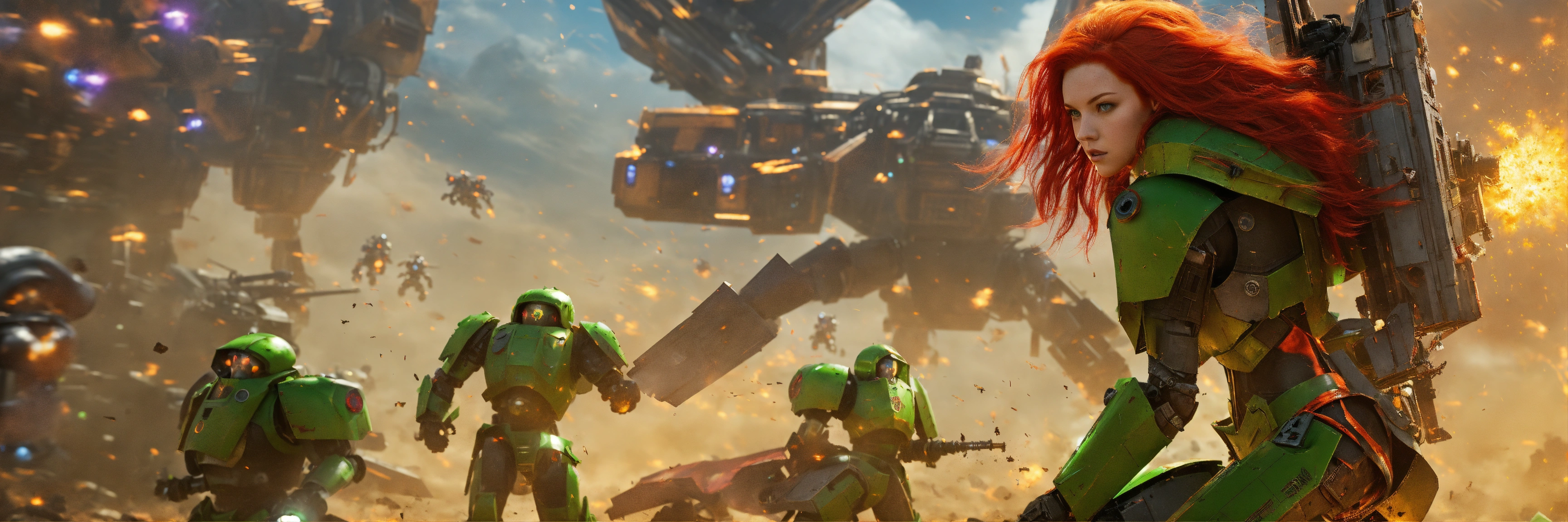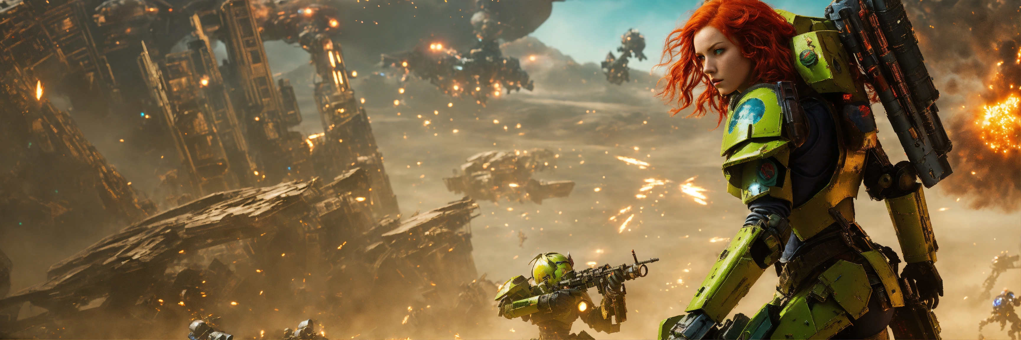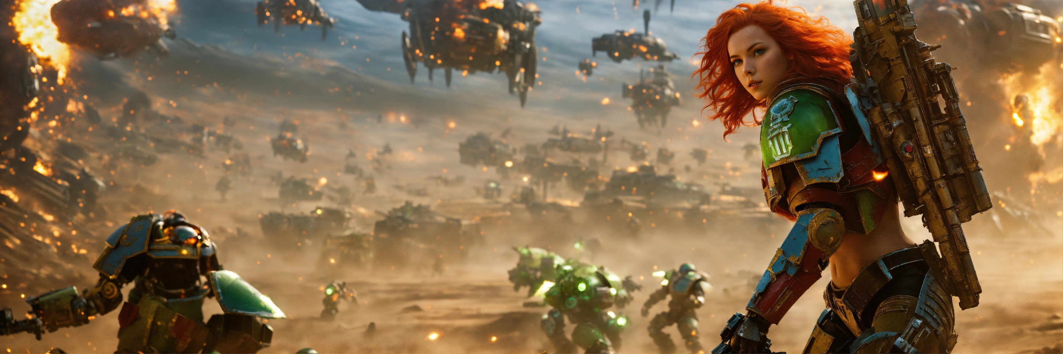 Full body view of woman with red hair and bright green eyes, in full warhammer 40k combat armor on an alien worlds battle zone, covered in broken and blown-up robots, she is fighting her way to a faraway dimensional portal on the horizon. ultra realism. perfect hands.
