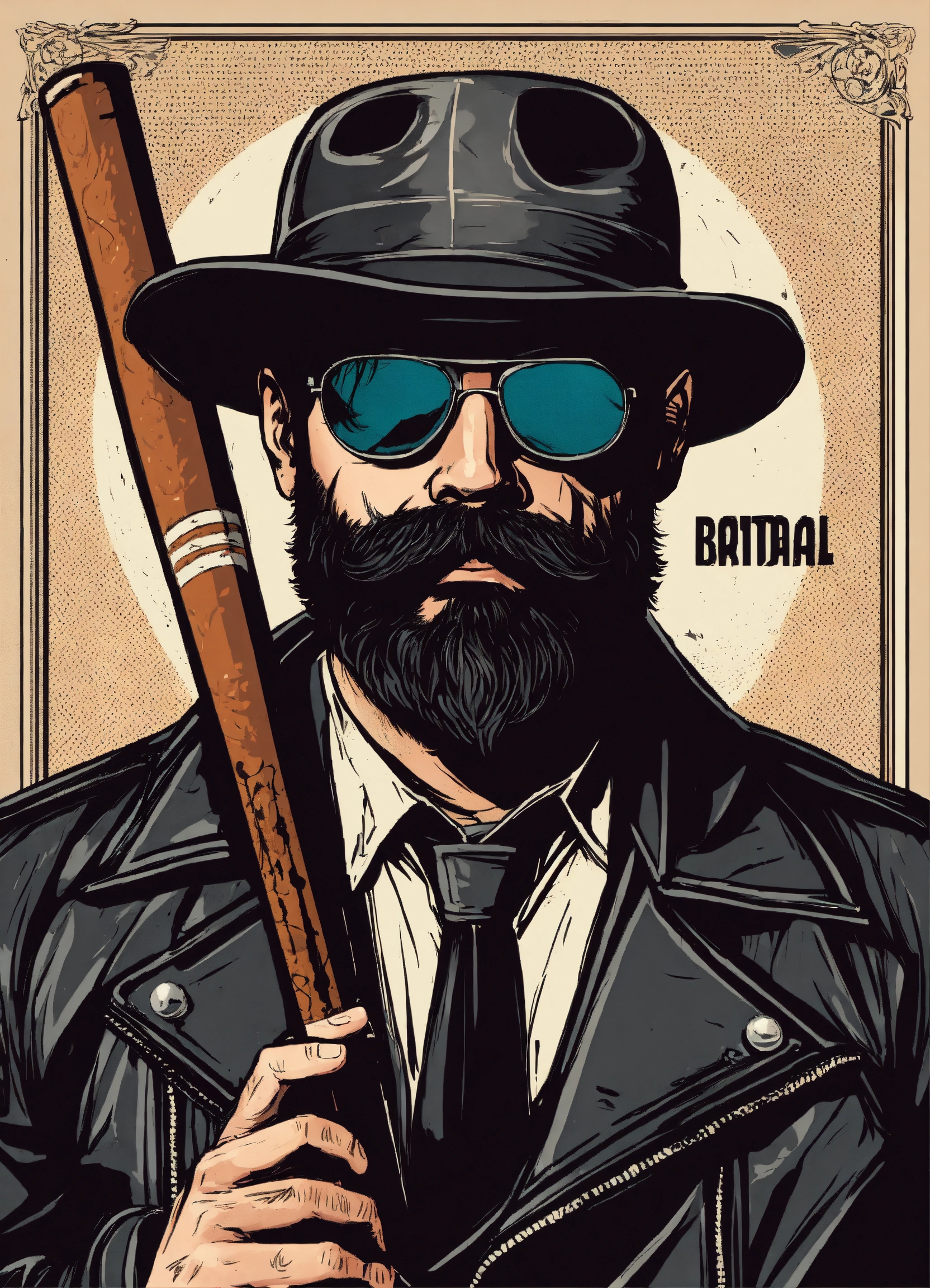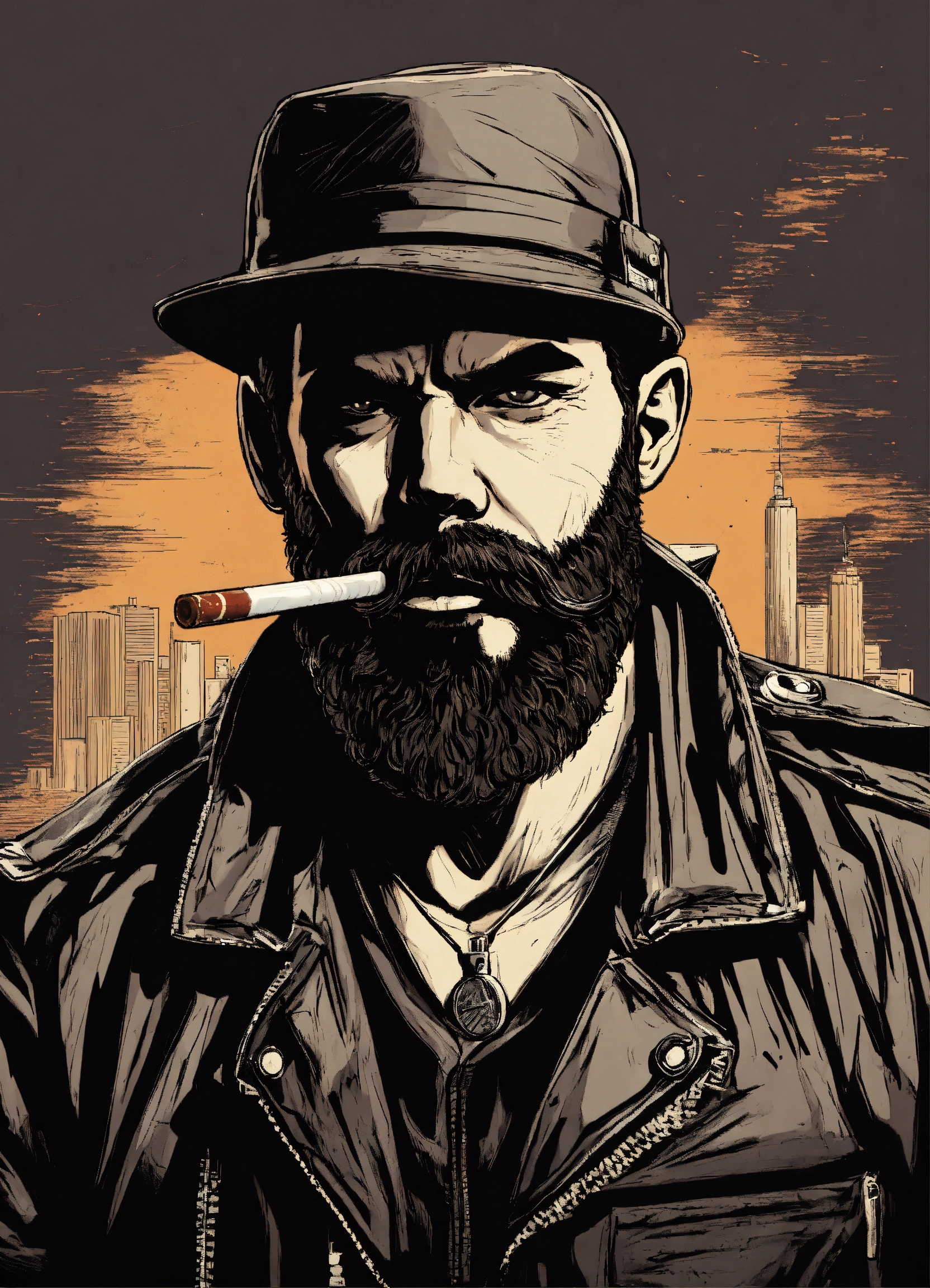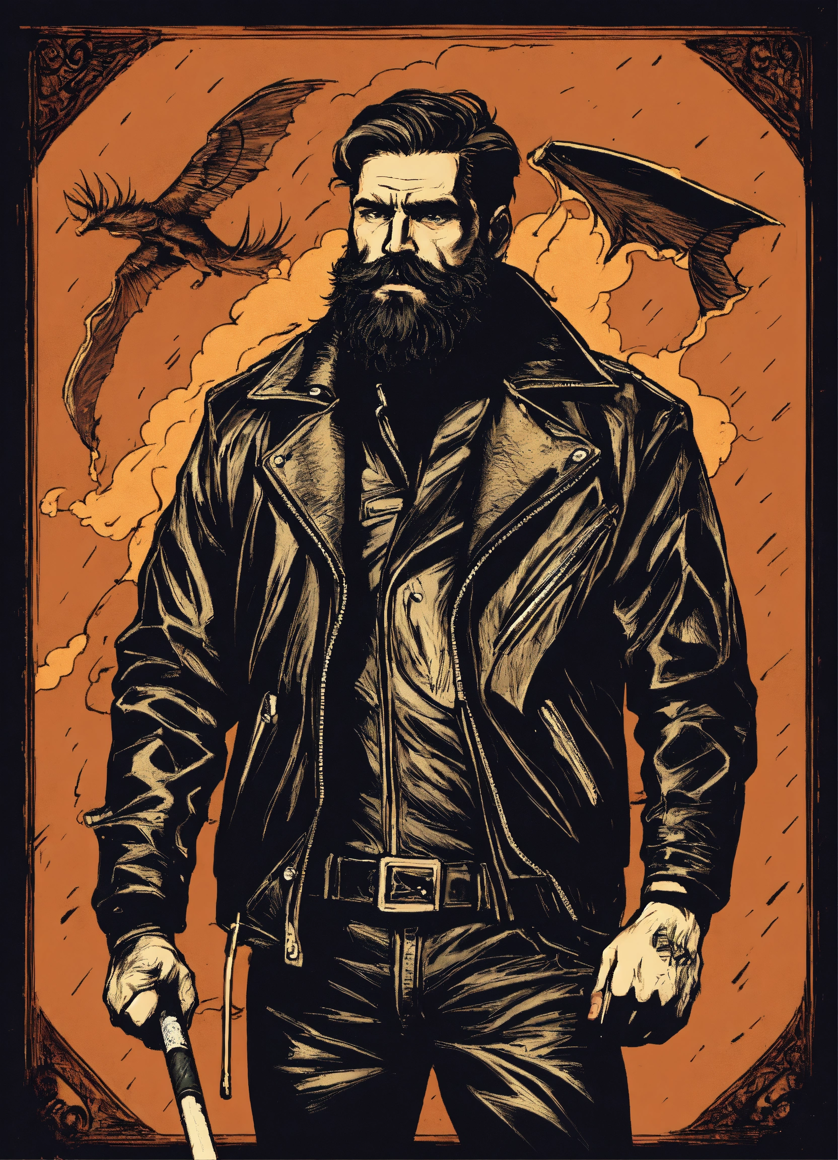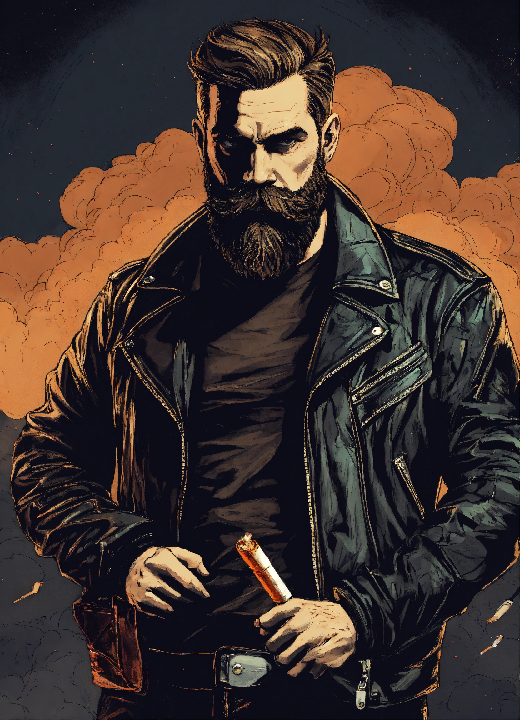 Brutal man in the leather jacket beard mustache with cigarette holding a bat drawn style