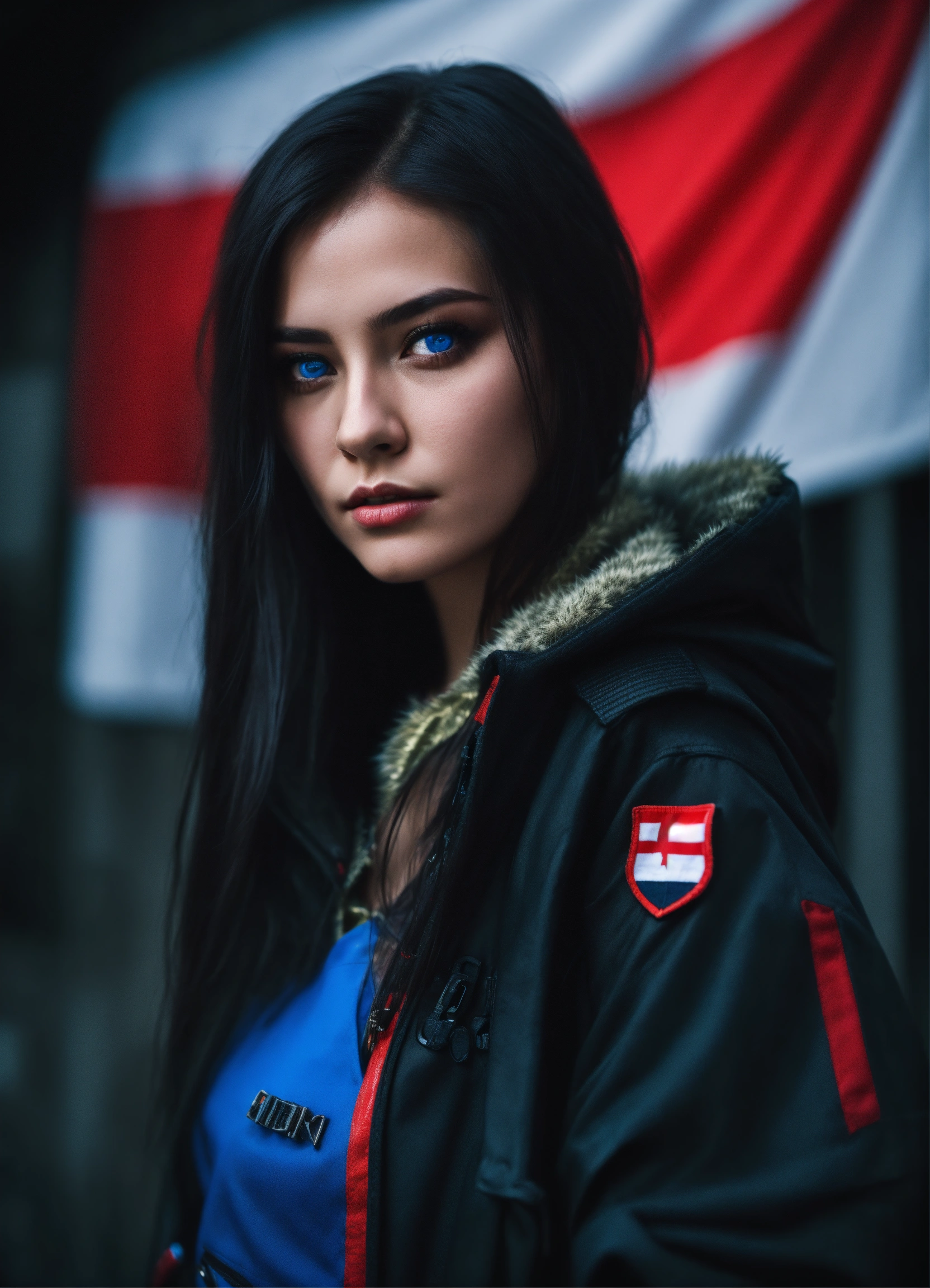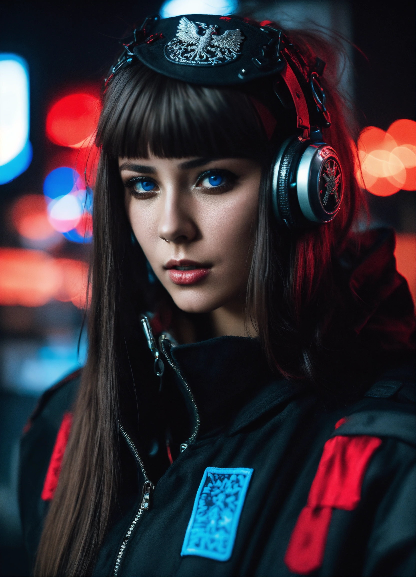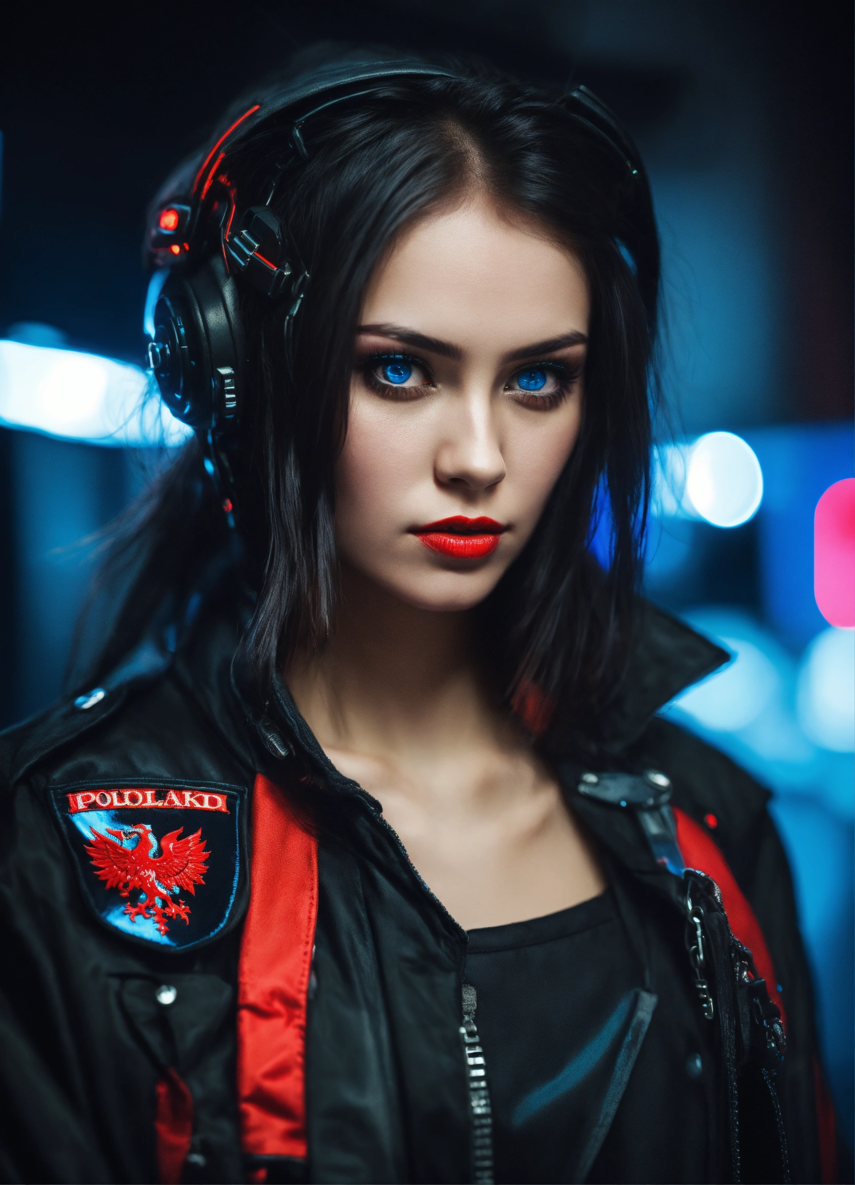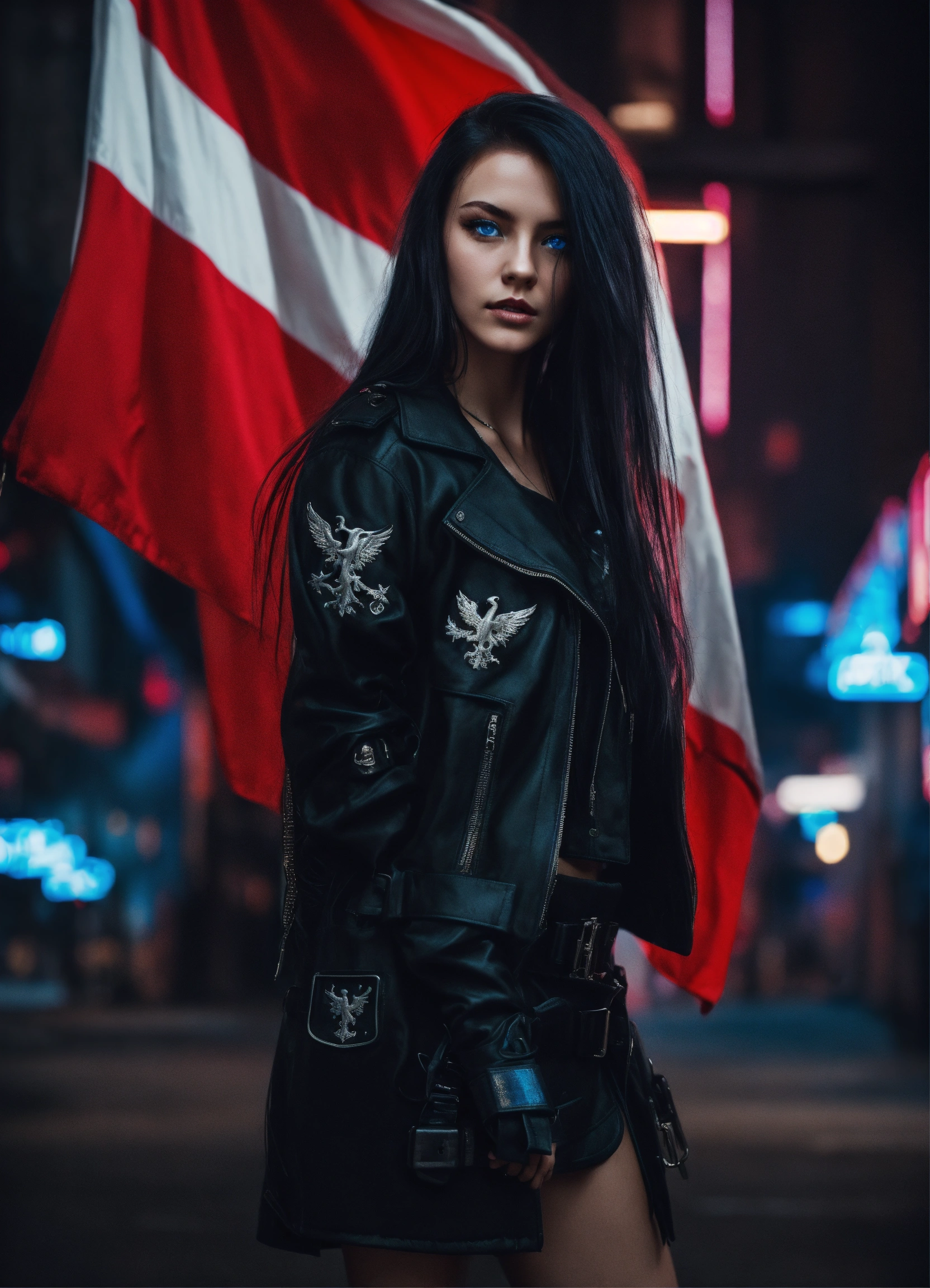 Cyberpunk style, fashion beautiful girl on cyberpunk, cyberpunk style, cyberpank city, add coat of arms poland, black background, blue eyes, with poland flag, black hair, long hair
