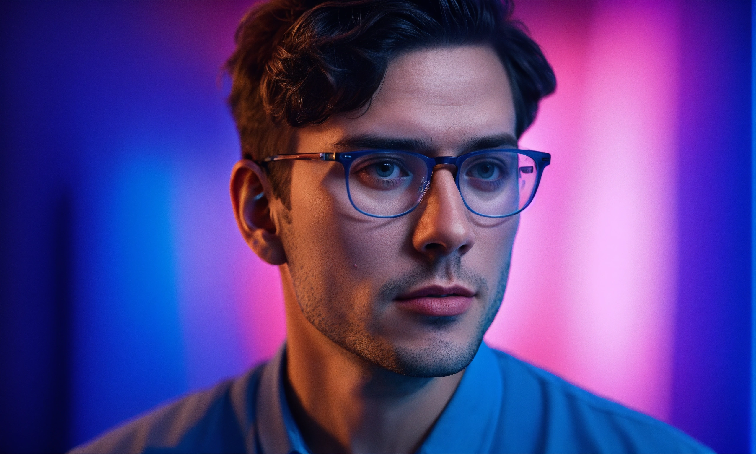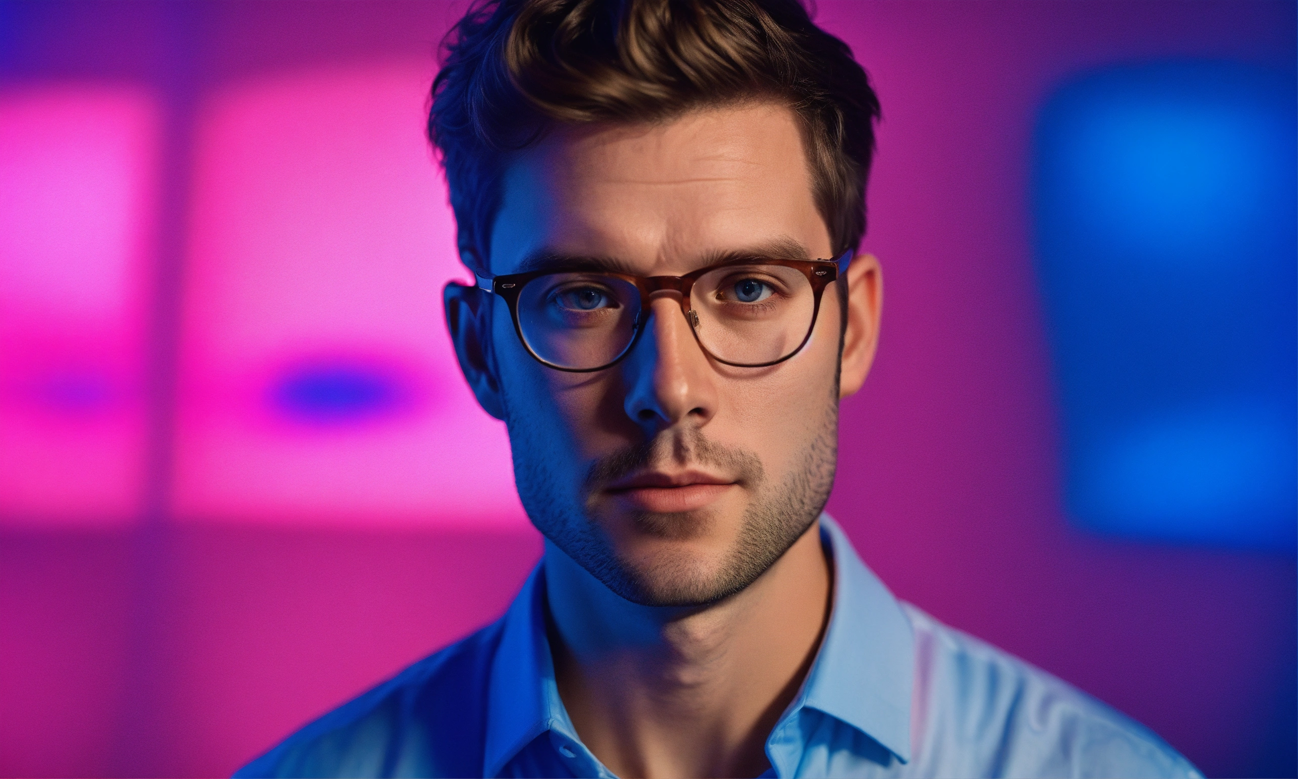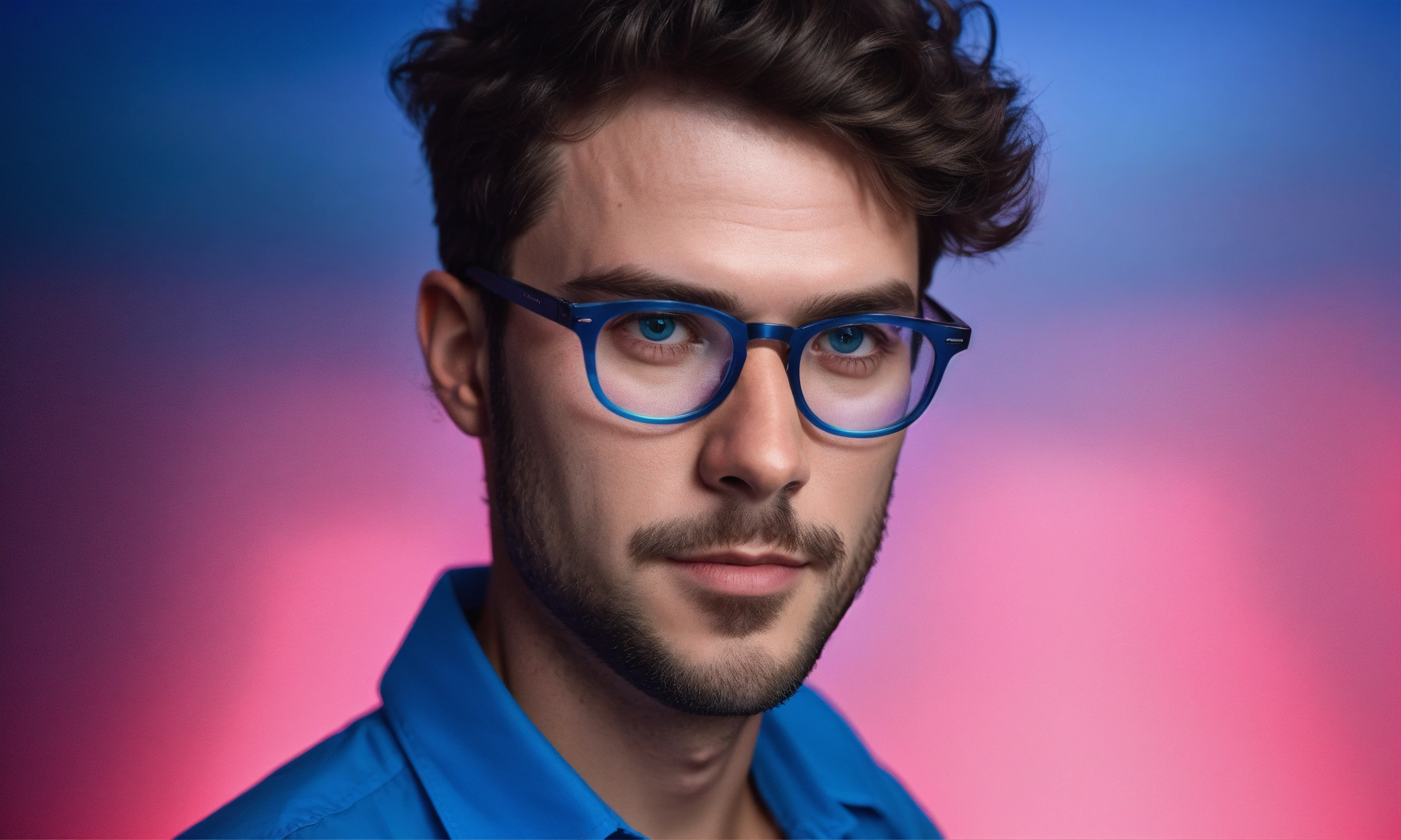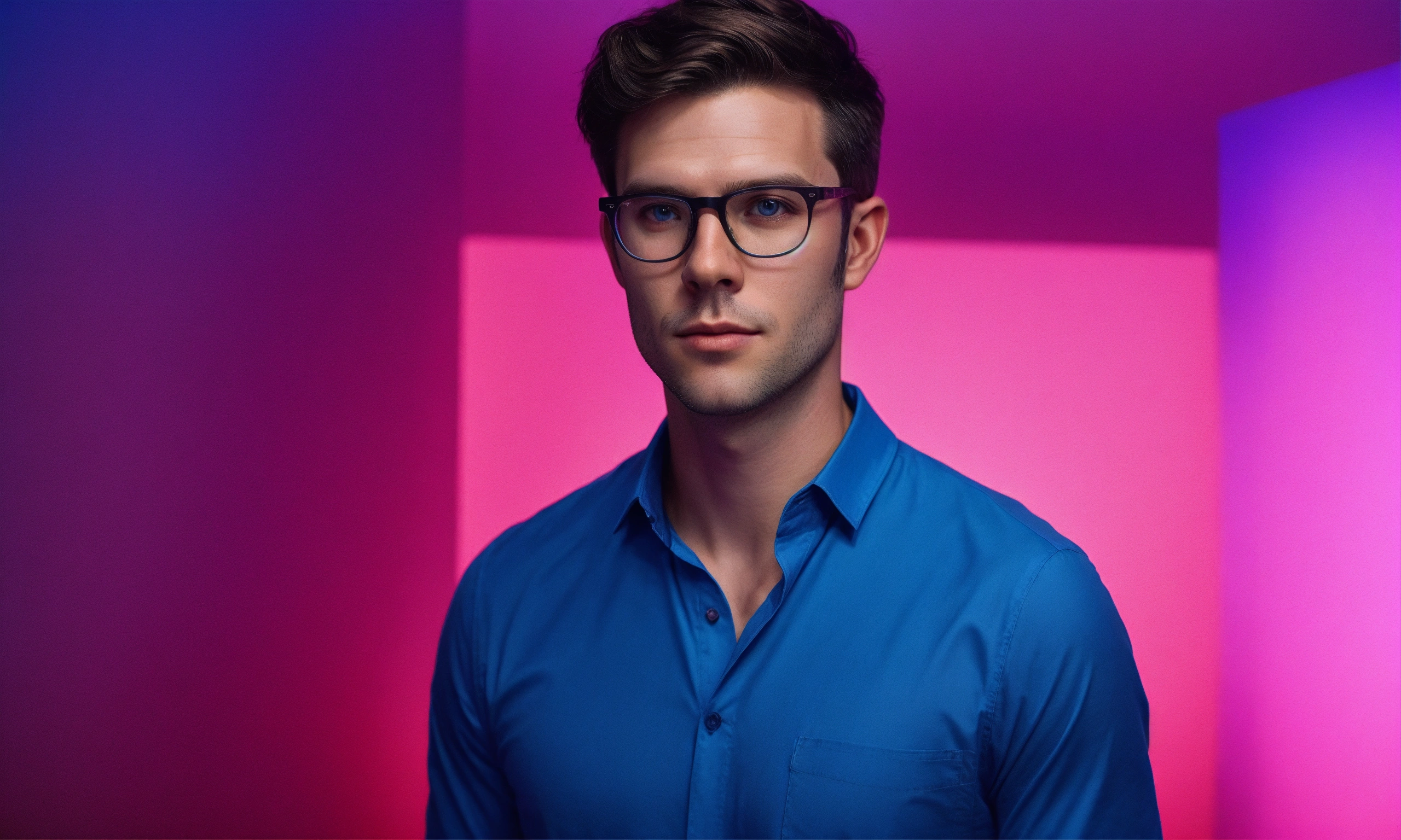 Perfect photo portrait of a white man, with gentle look, dark realistic short hair, glasses, wearing a blue cobalt shirt, contrasted skin texture, hyper detailed, front view, blue lighting, blue and pink gradient background, bust shot, committed to digital science, photo shoot, hyper realistic, leica m10, 85-135mm