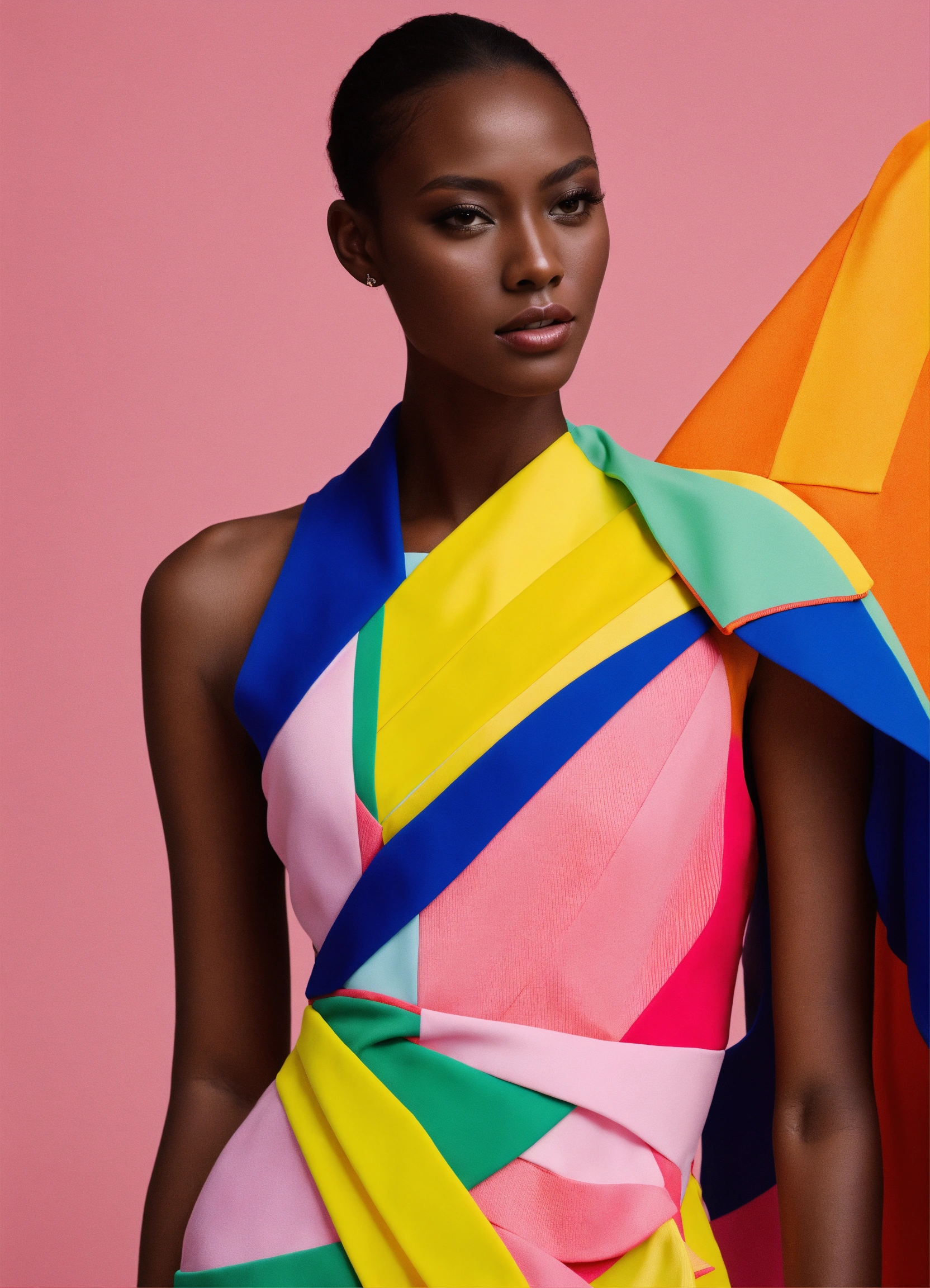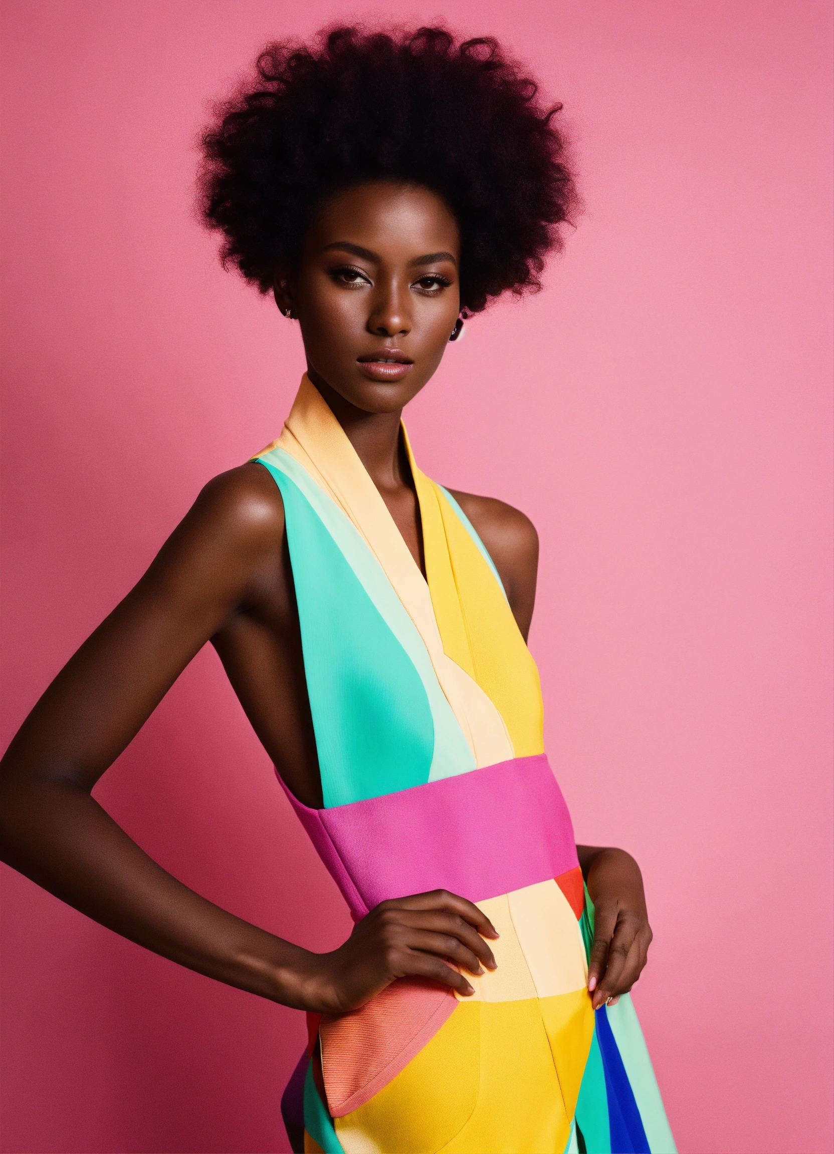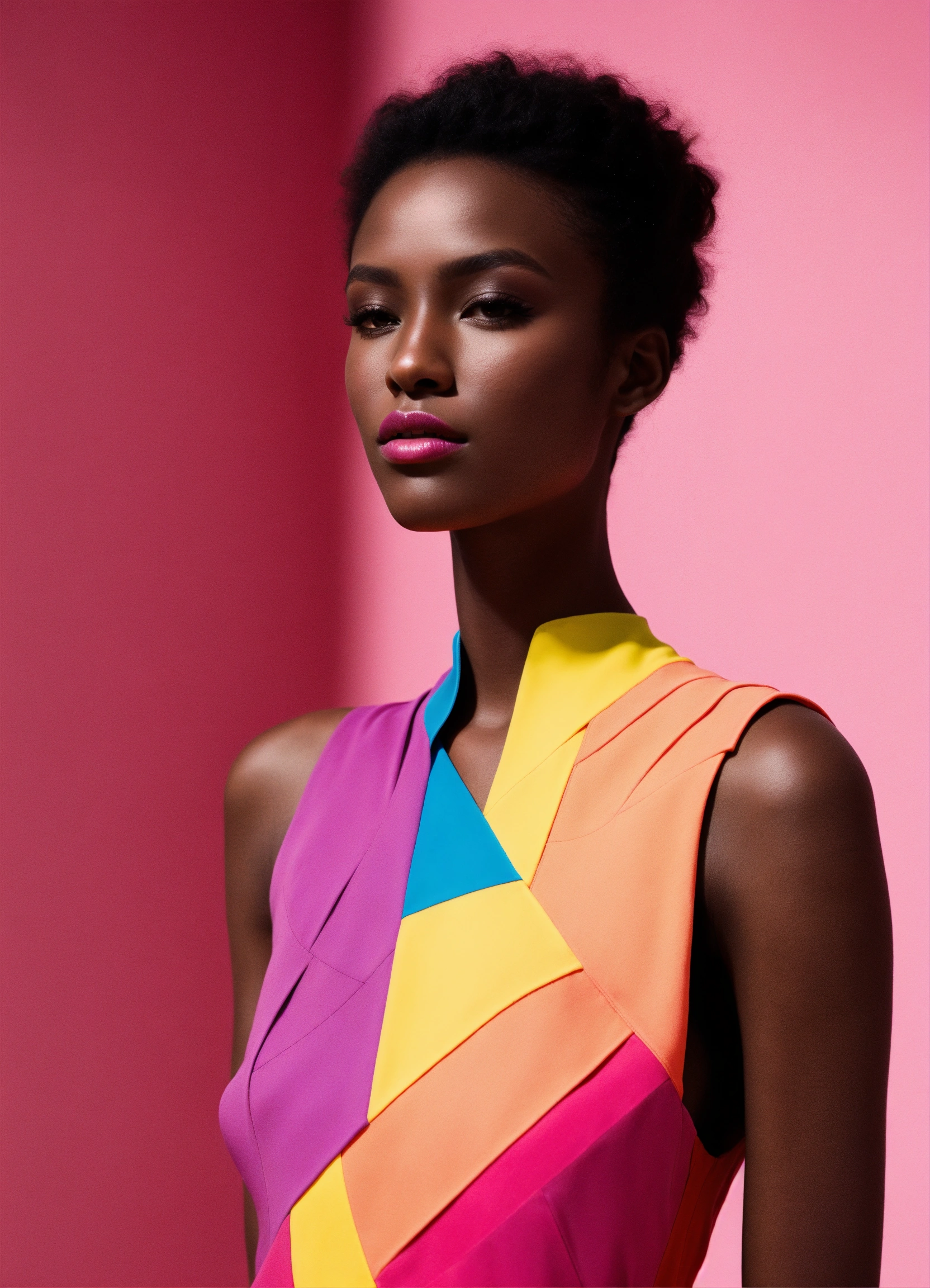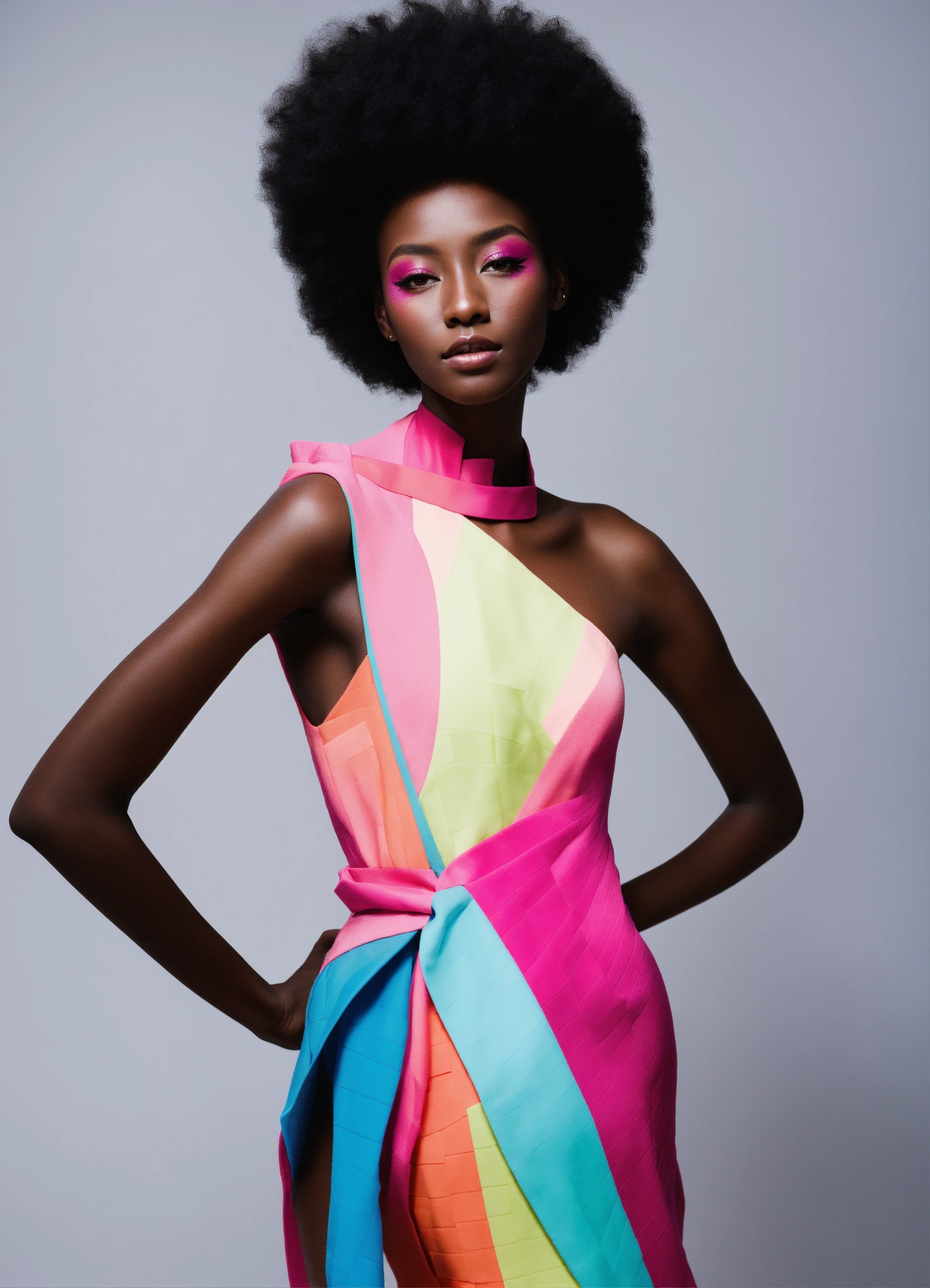 Fashion photoshoot, slim tall dark skinned model, in studio, white background, wearing colorful issey miyake dress, close up, pink make up, studio lighting, high fashion photography
