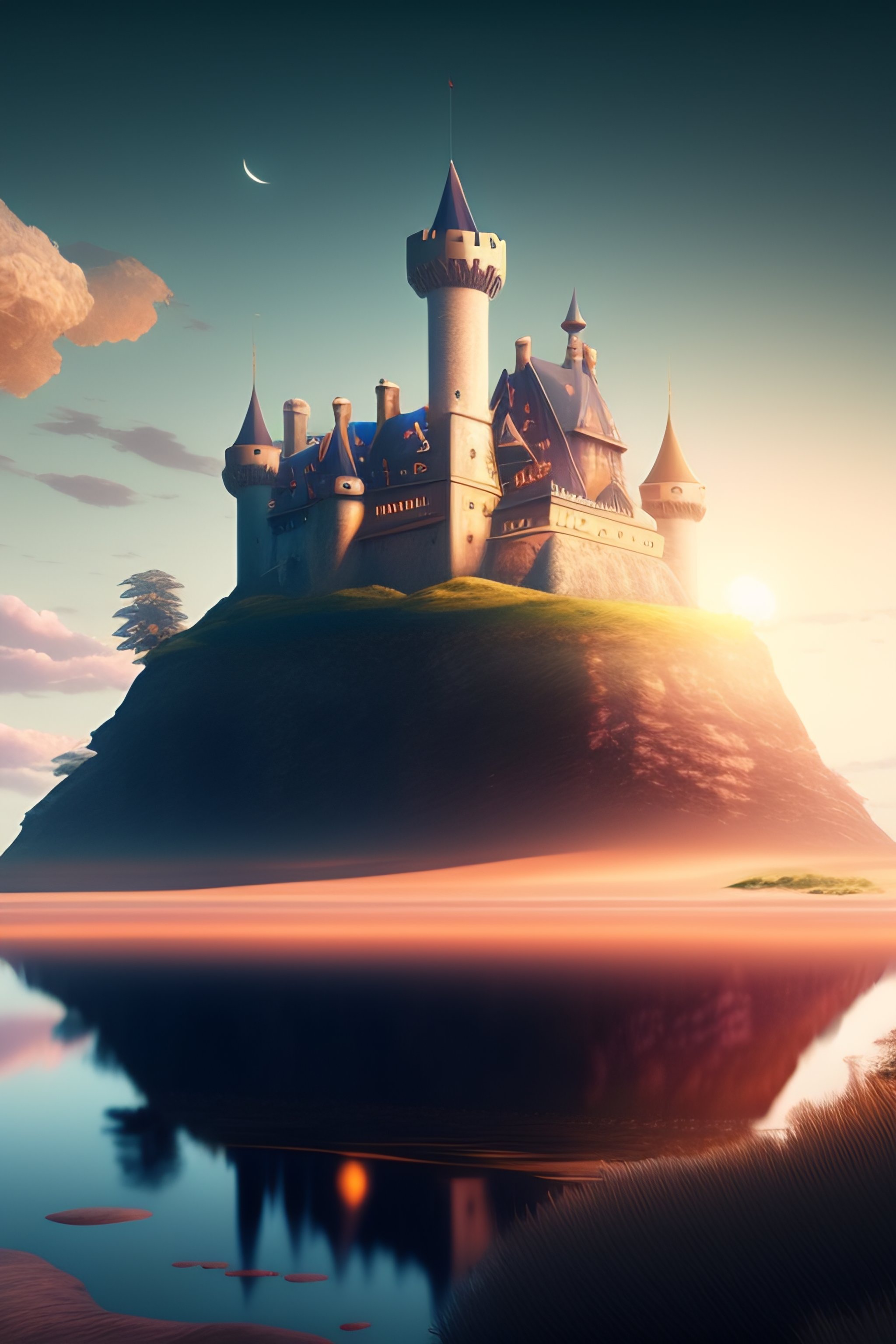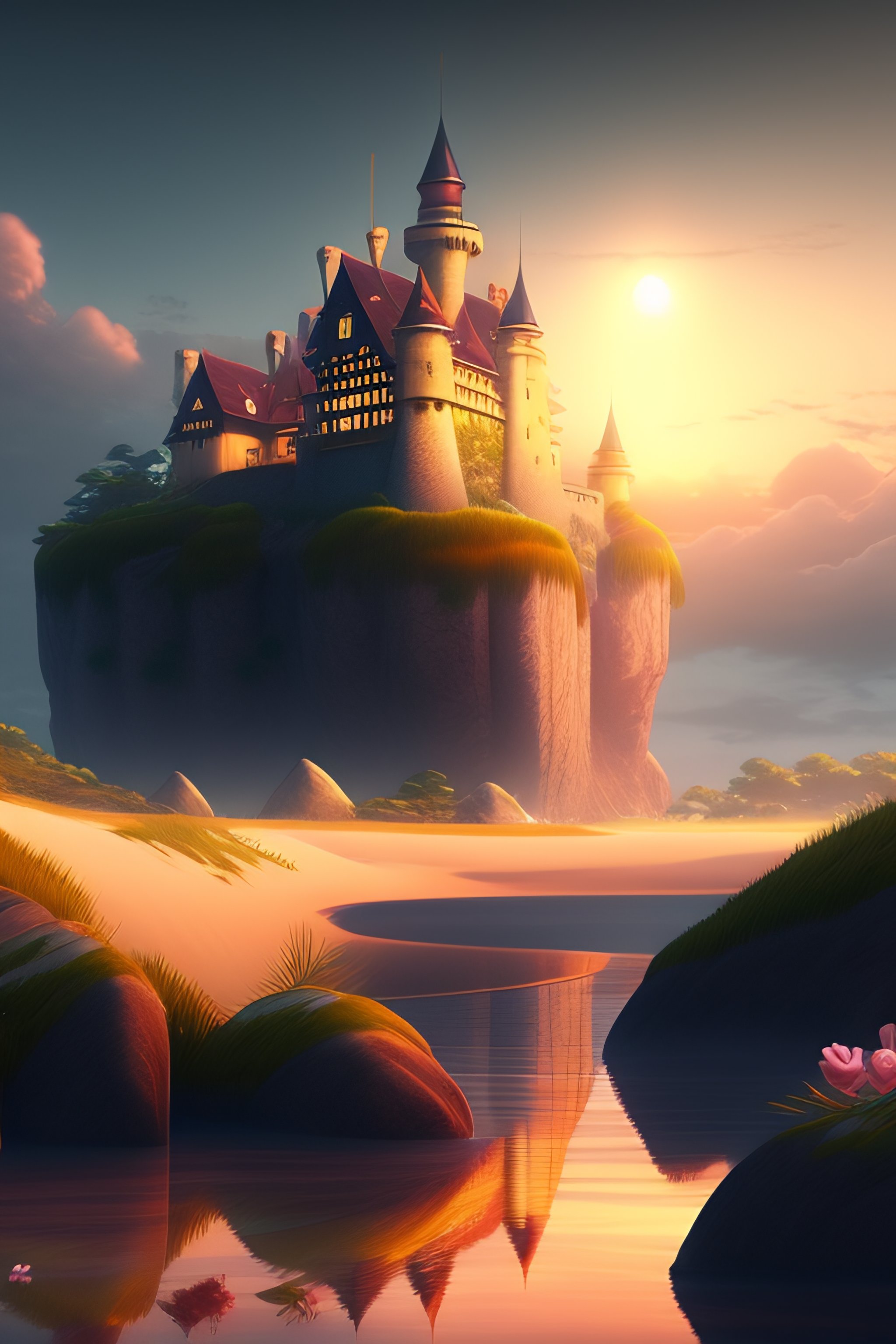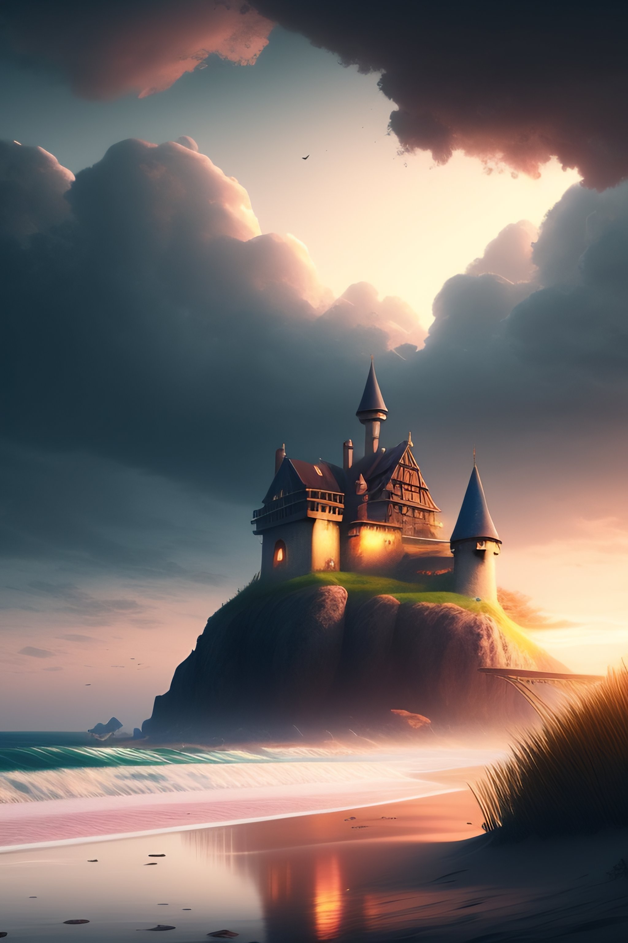 A beautiful drawing of a realistic medieval castle at sunset the clouds, on the edge of the beach. rose quartz by andrea kowch by charles-francois daubigny daring. beautiful digital painting of castle in a serene, romantic landscape, by makoto shinkai, beeble, ohara koson and james gilleard, beautiful matte painting, cg, retrowave, 4k hd wallpaper, trending on artstation, highly detailed