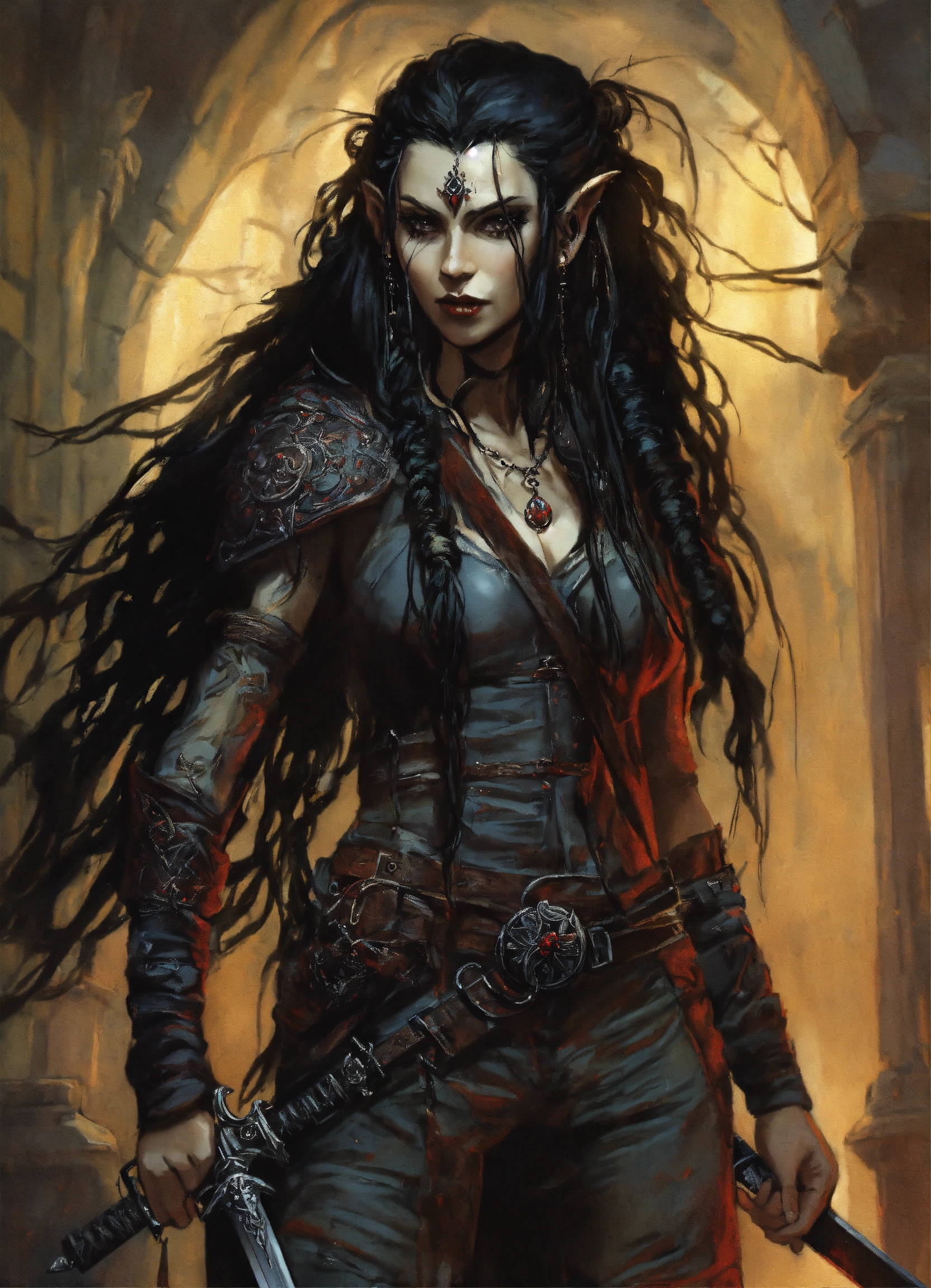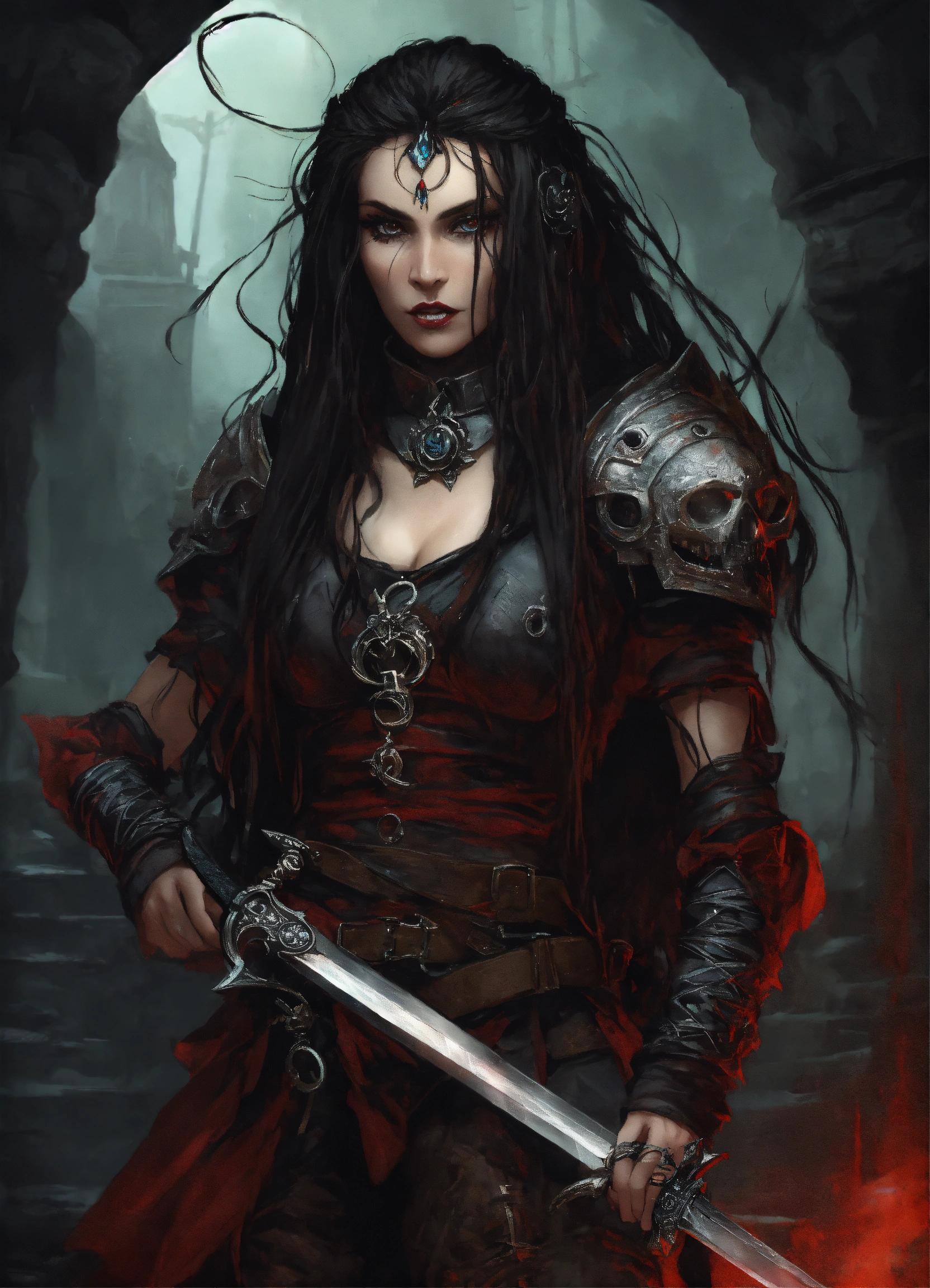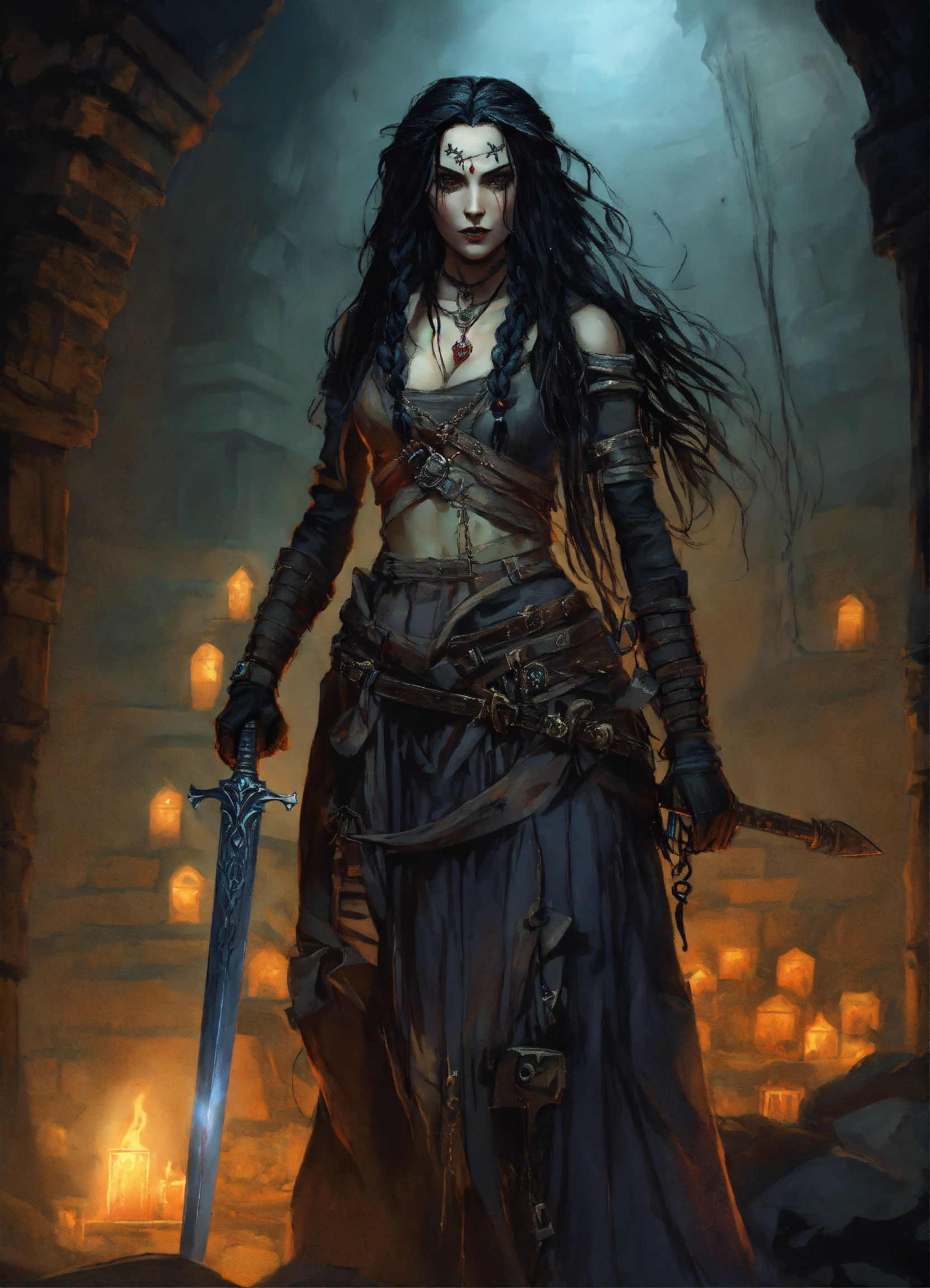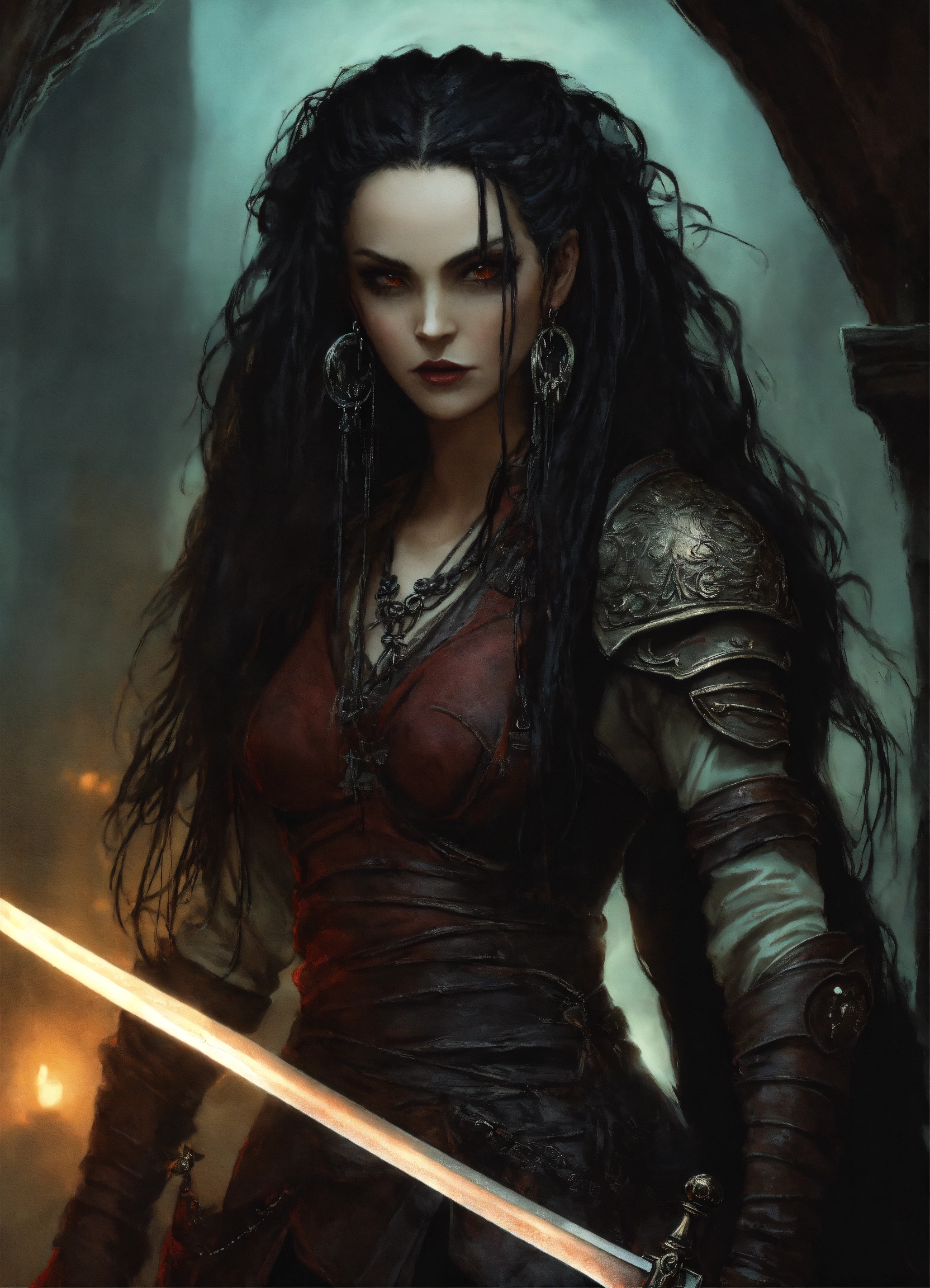 Older female warrior alien vampire with long black braided locks, with sword, gothic underground catacombs, rackham