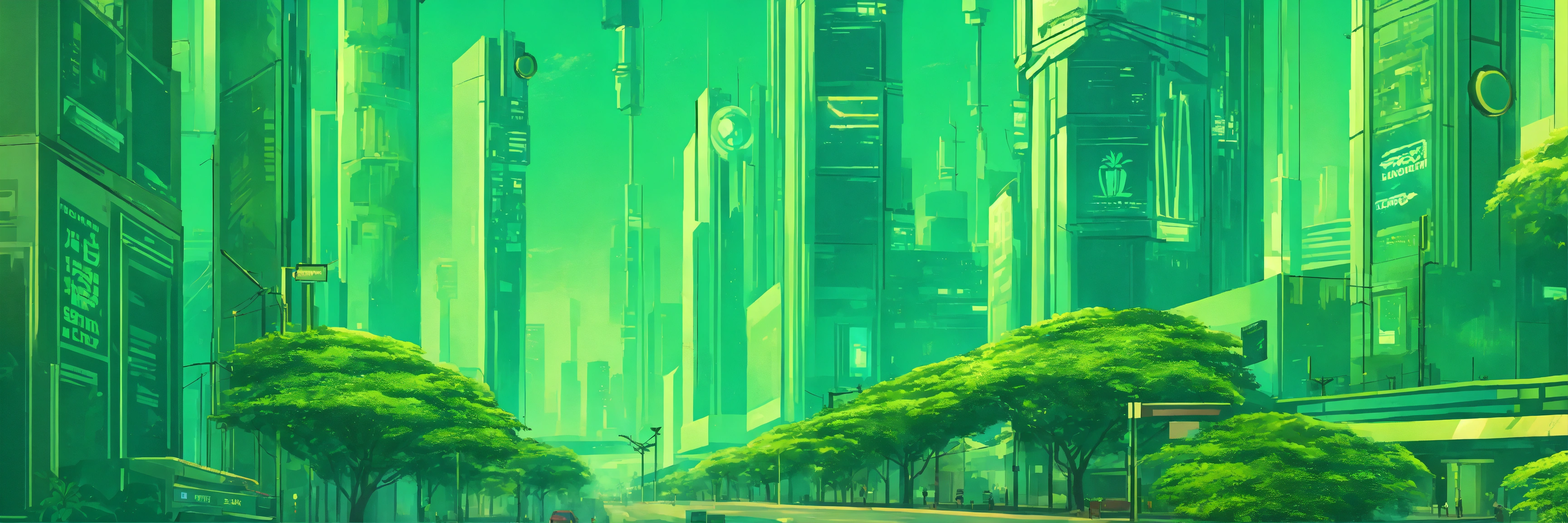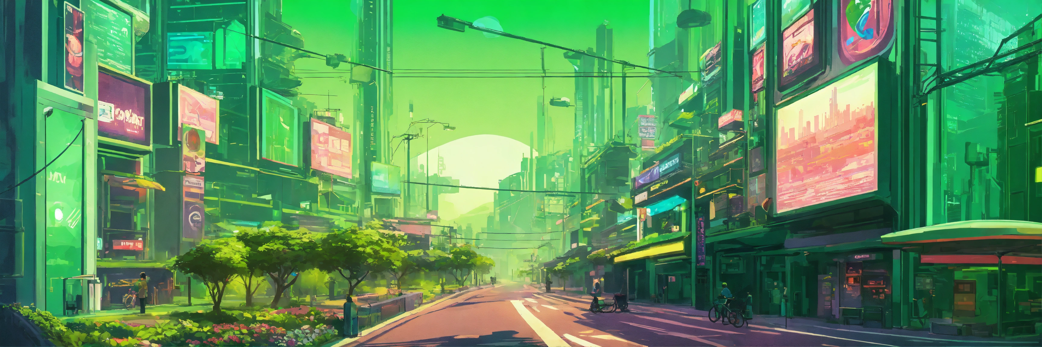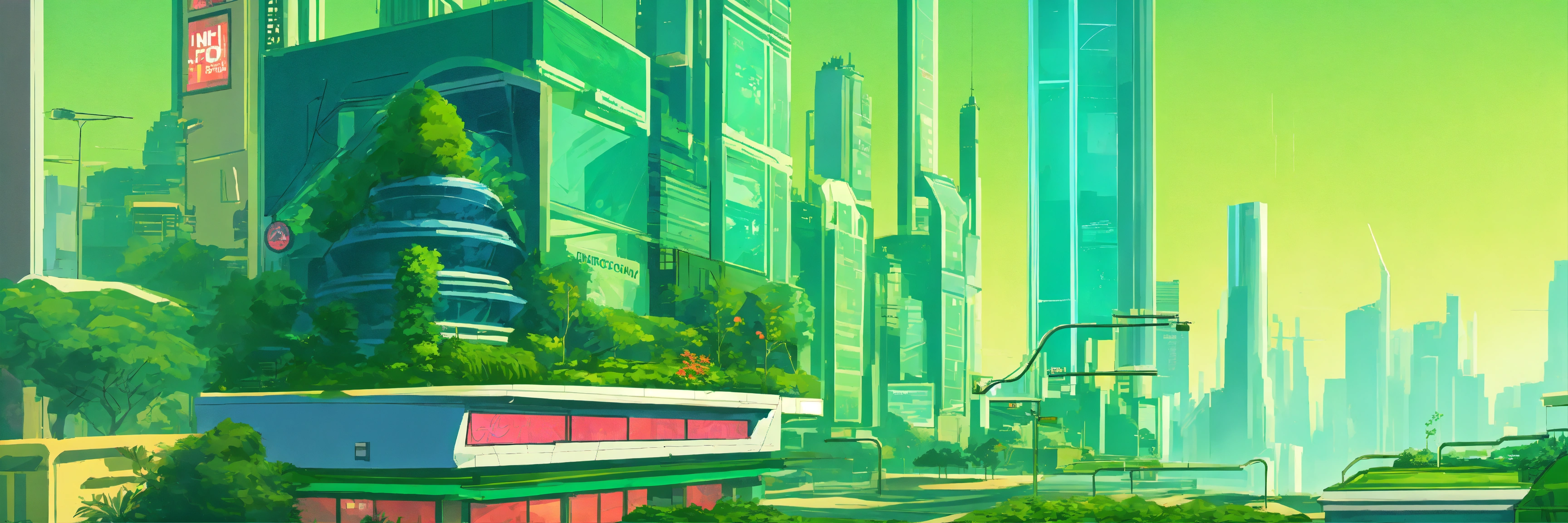 Futuristic city with a lot of plants and a lot of advertisements, like billboards, etc., illustration green color palette