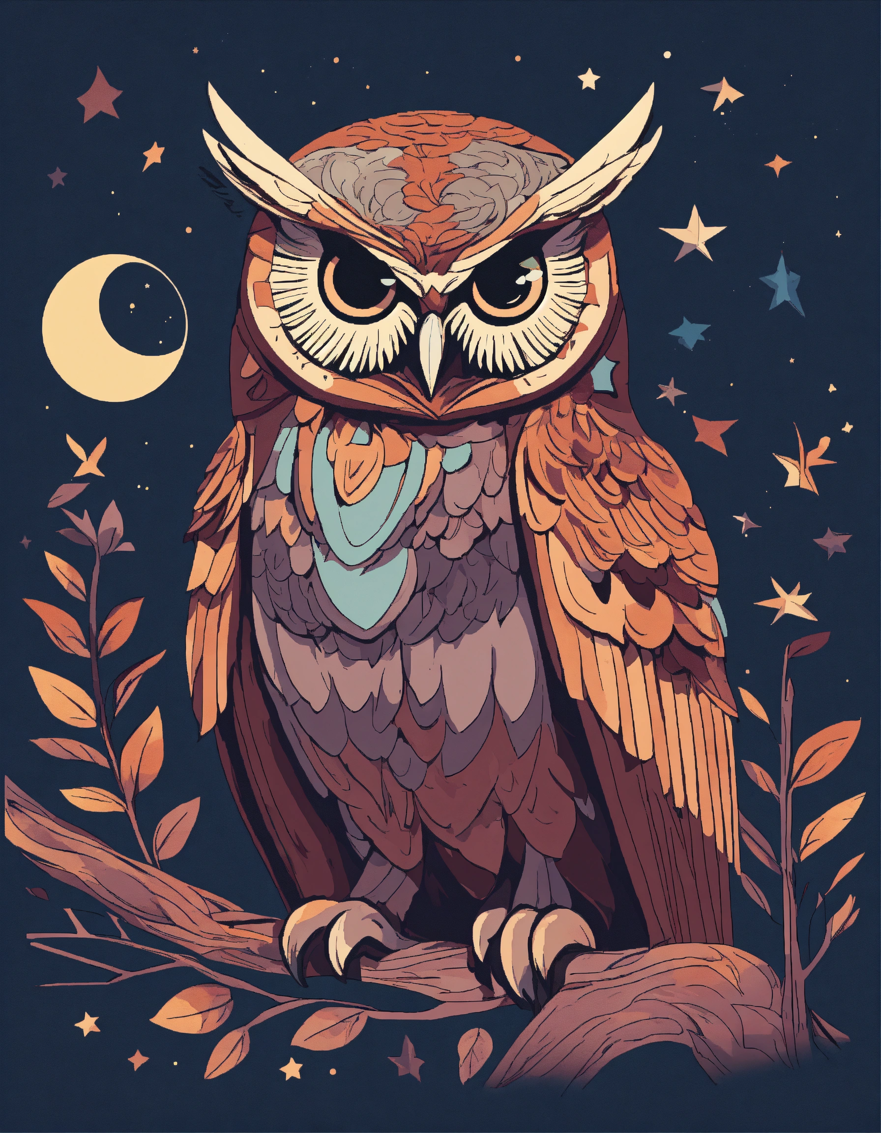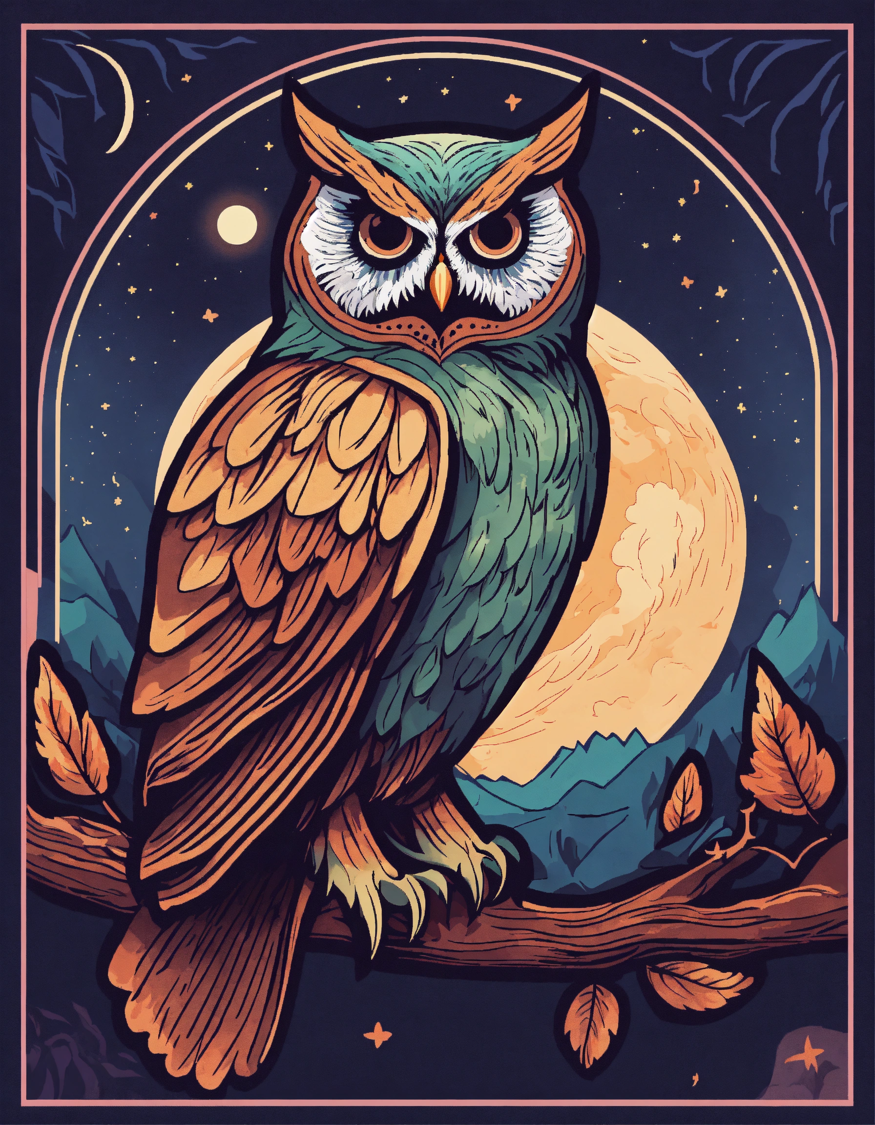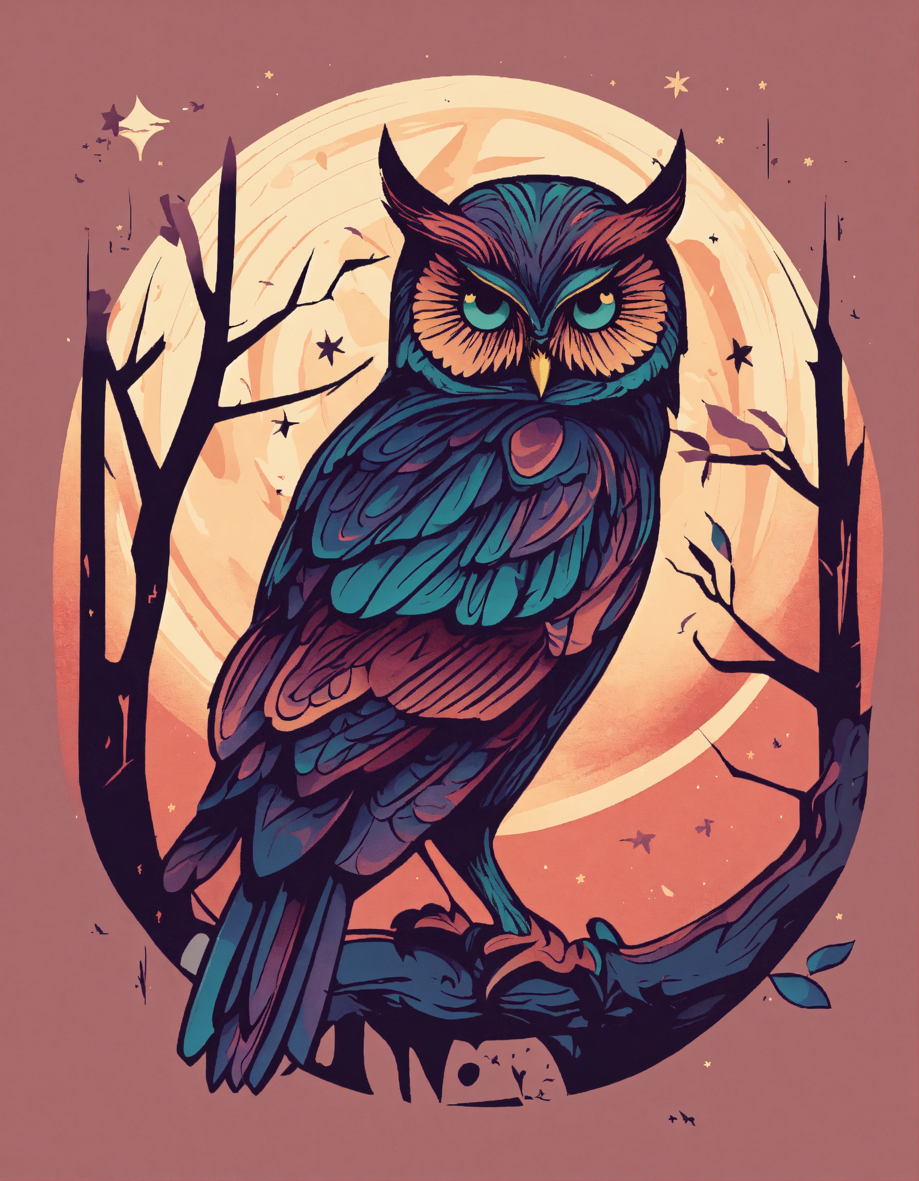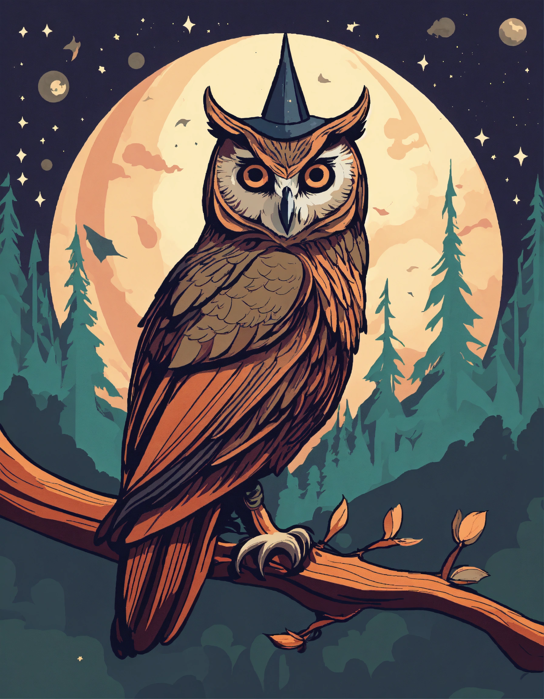Owl witch club illustration art, die-cut sticker, paper cut, muted colorful, magazine illustration, highly detailed, simple, smooth and clean vector curve, no jagged lines, vector art, moon behind owl, no backround