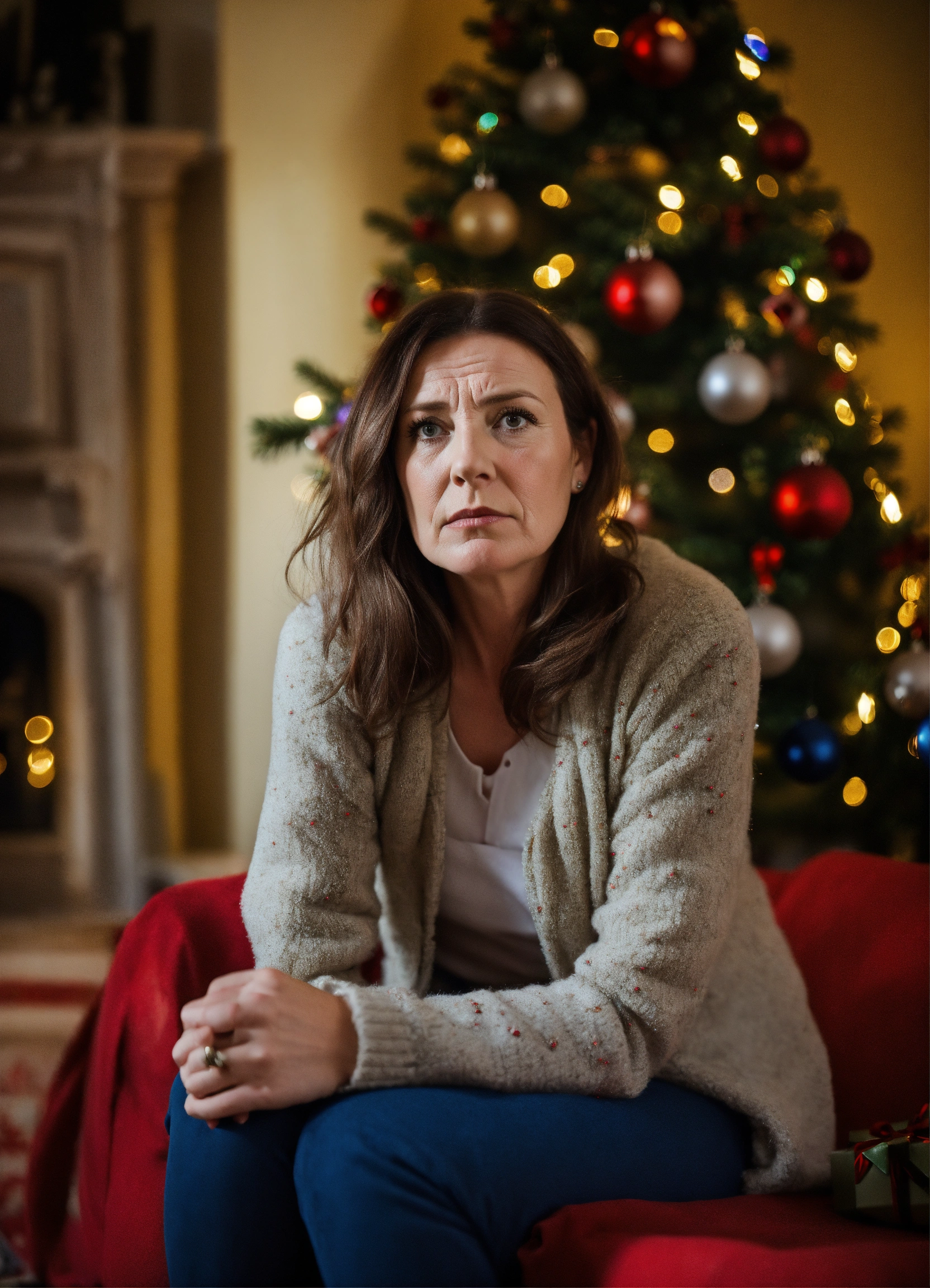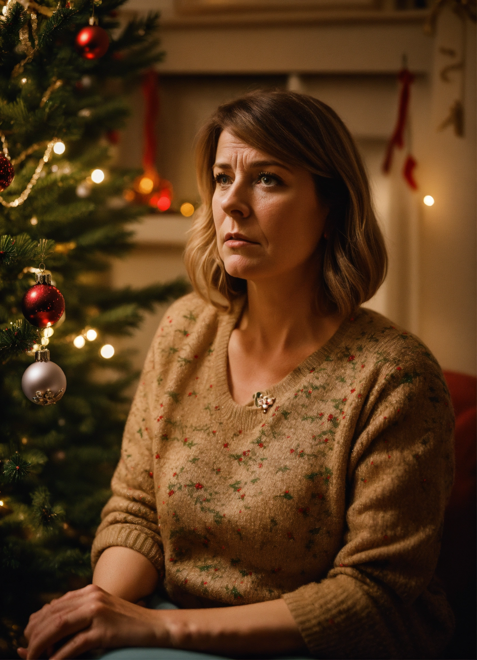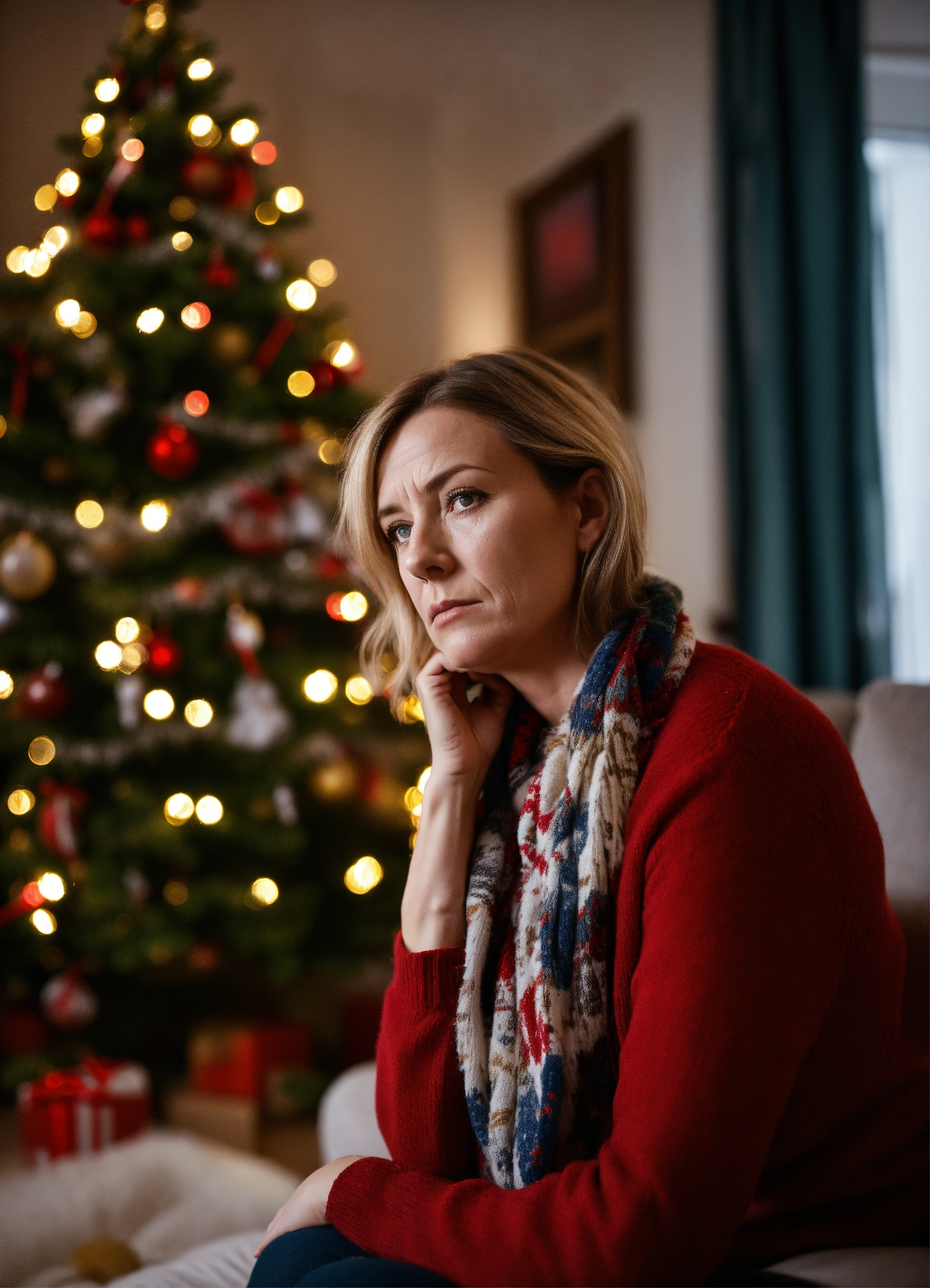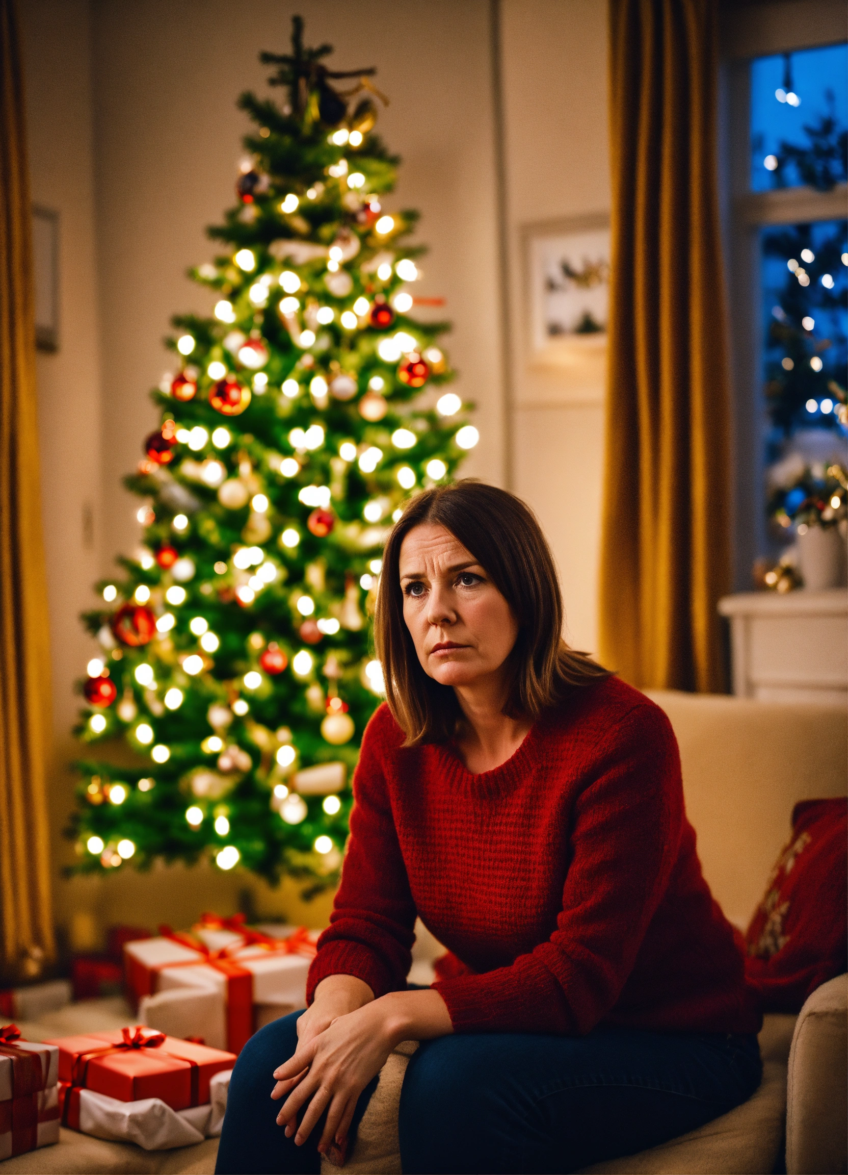 British woman, aged 40, looking sad in front of a christmas tree in a living room that has no presents under it